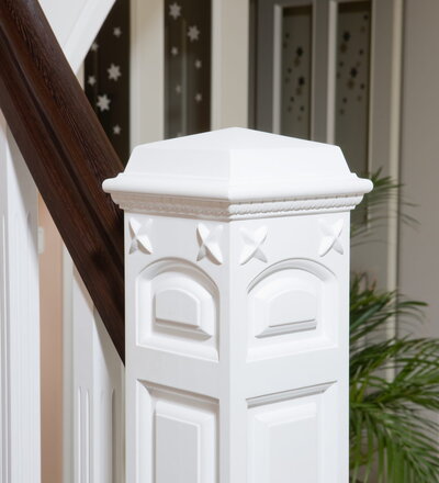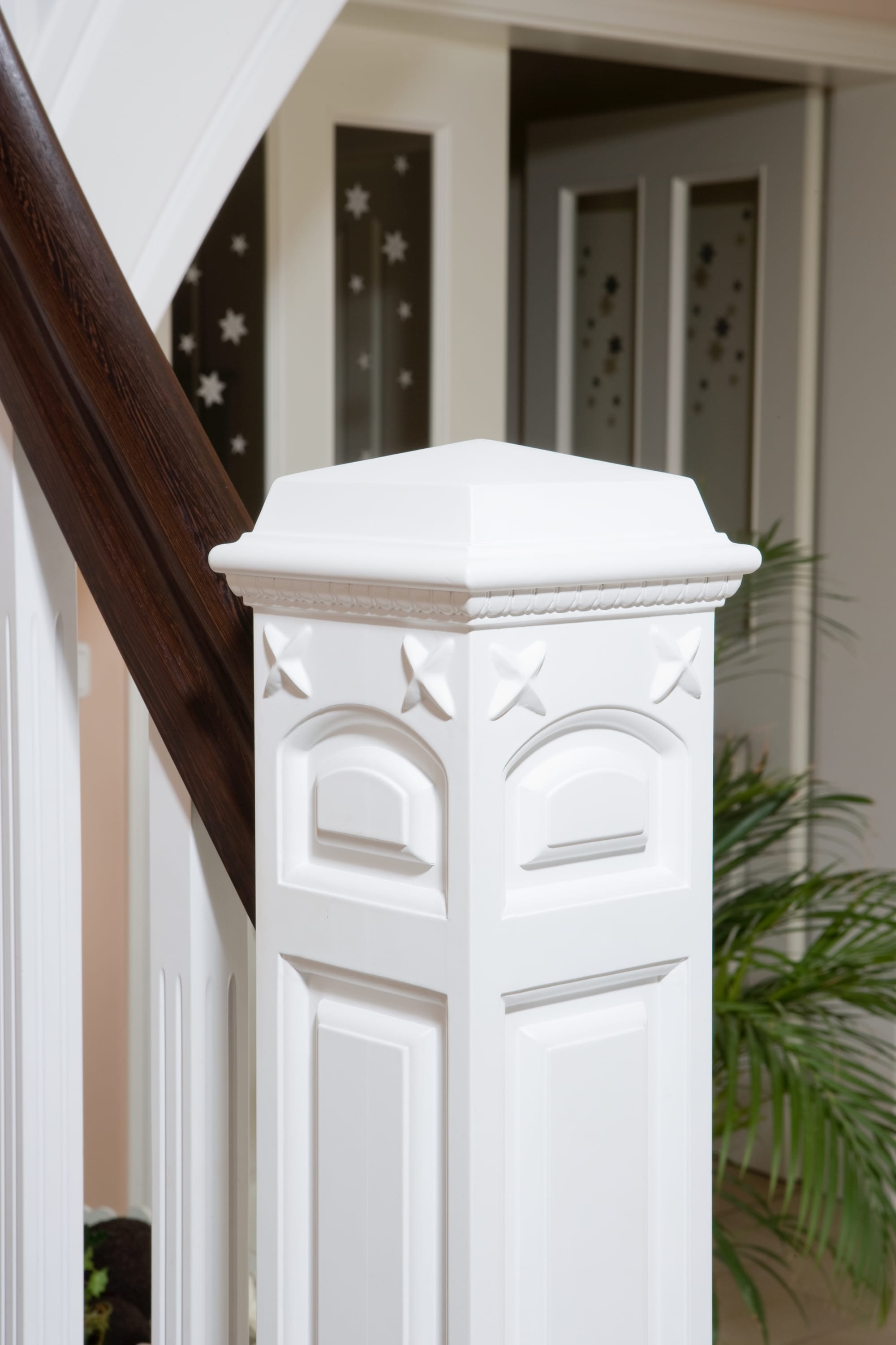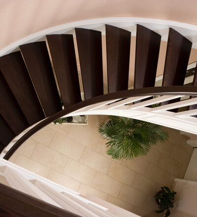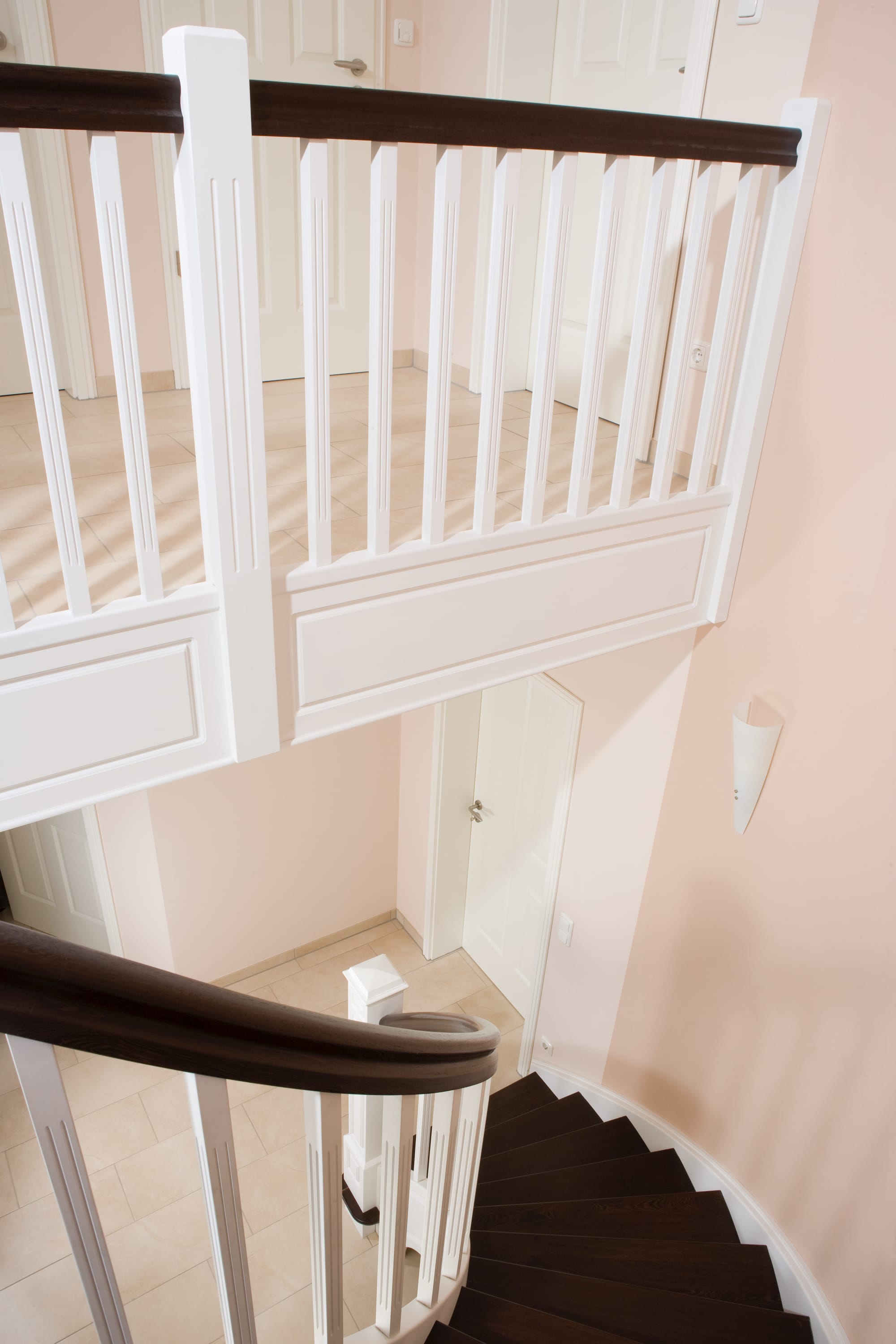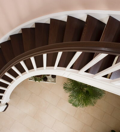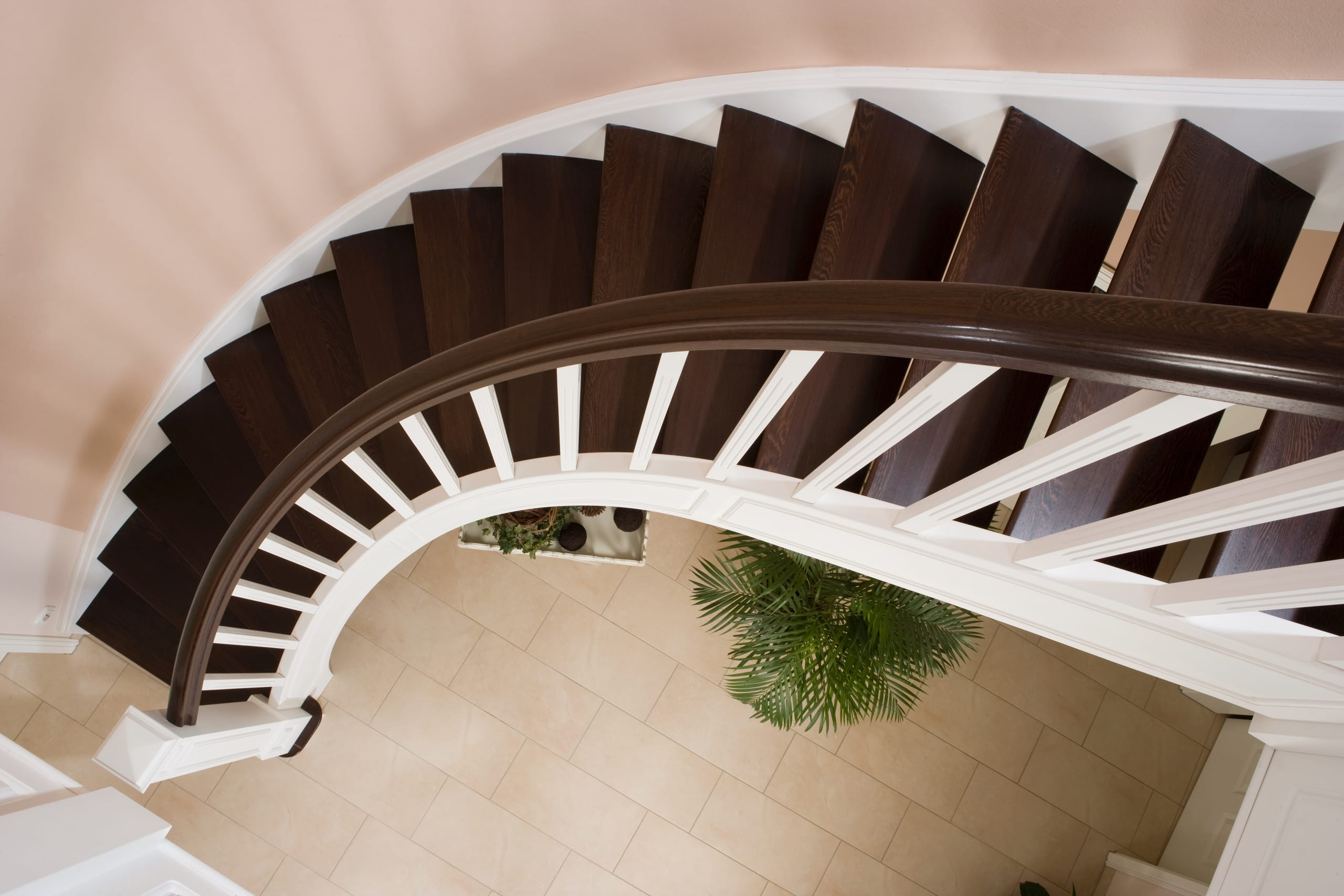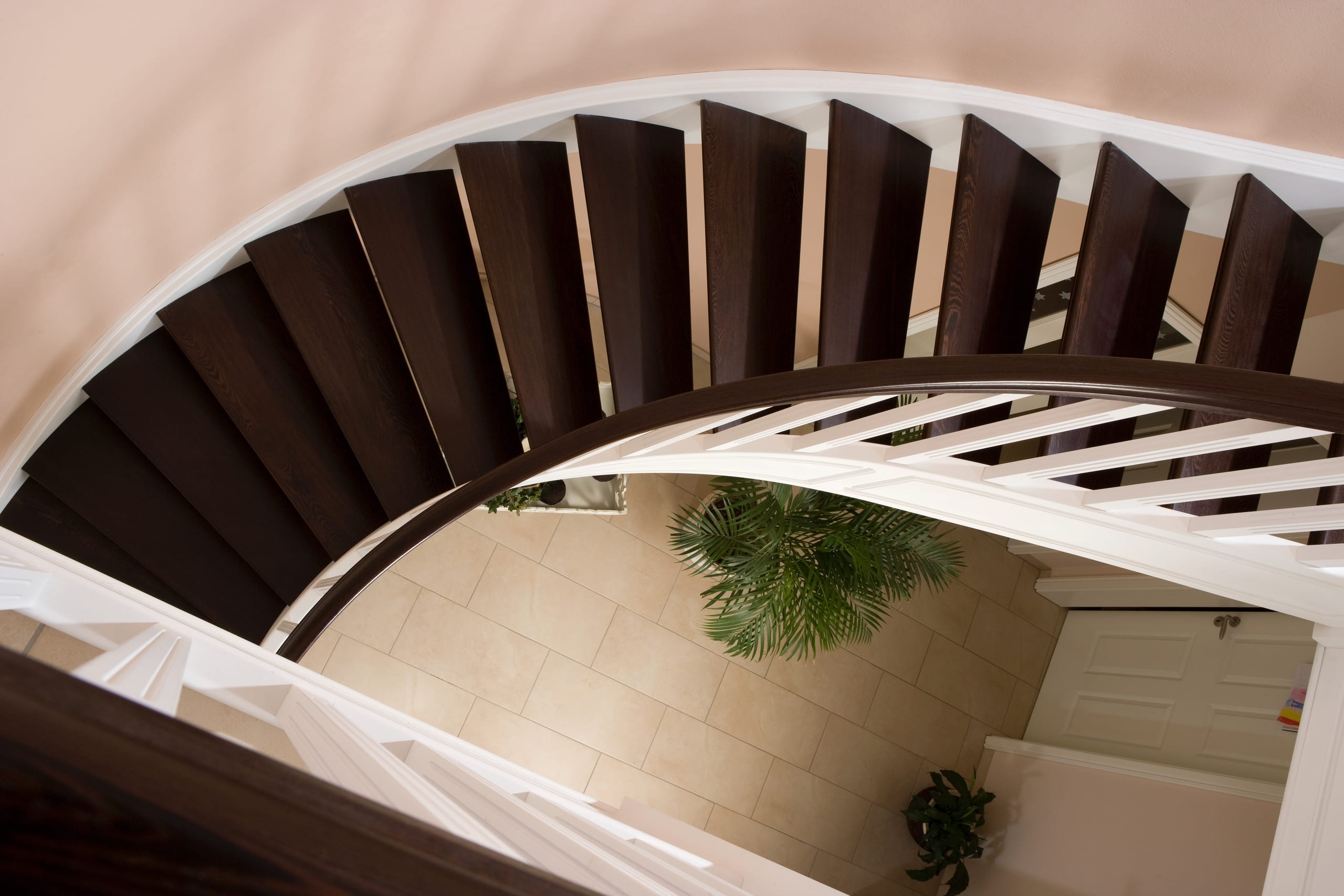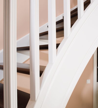 Bogentreppe mit Stufen und Handlauf in der Holzart Wenge, weiß endbehandelte Wangen und Stäbe, profilierter Antrittspfosten