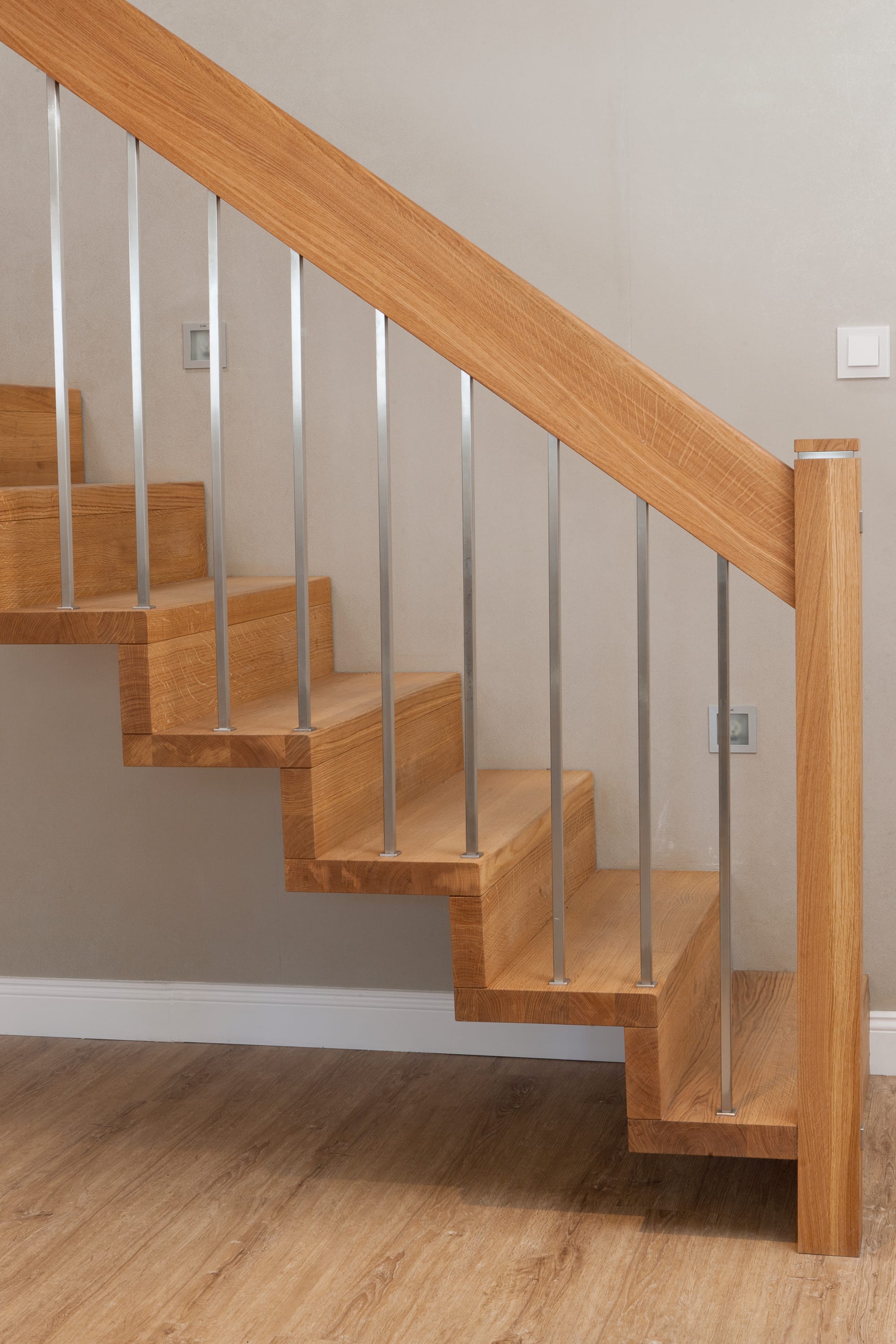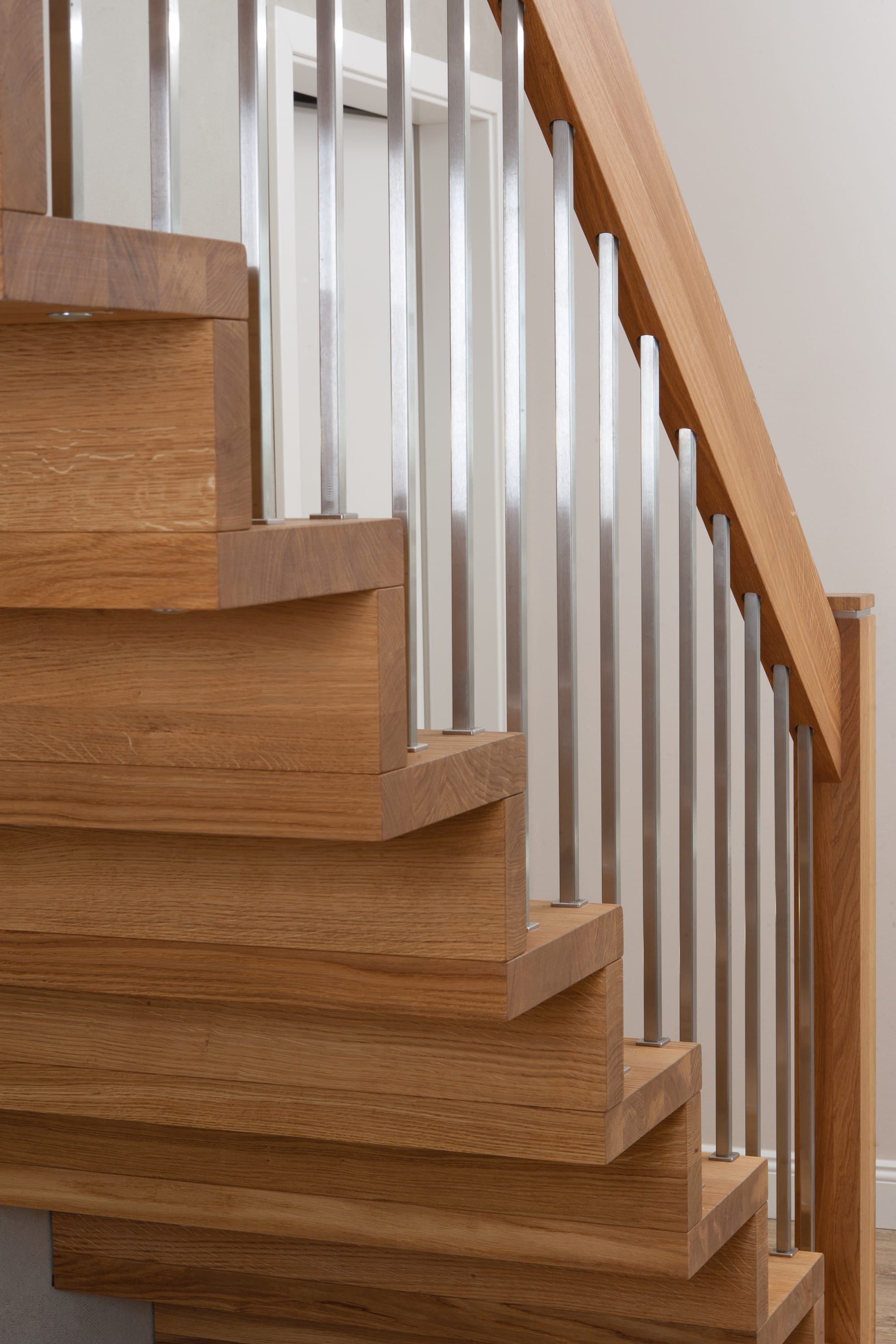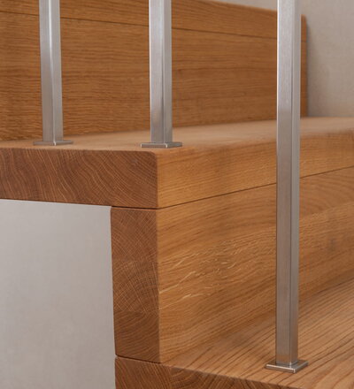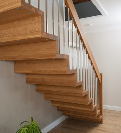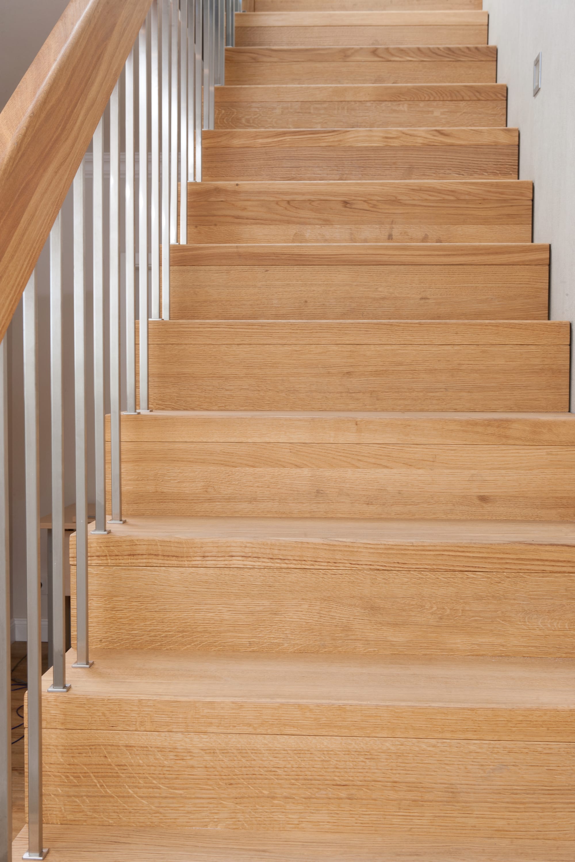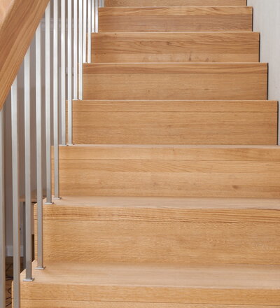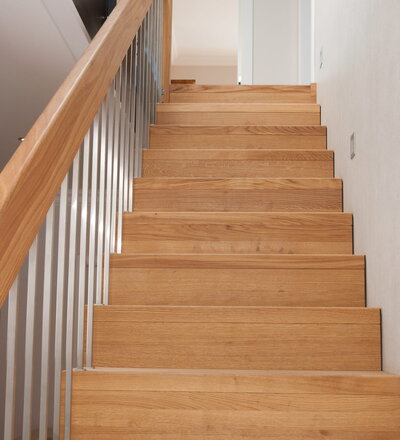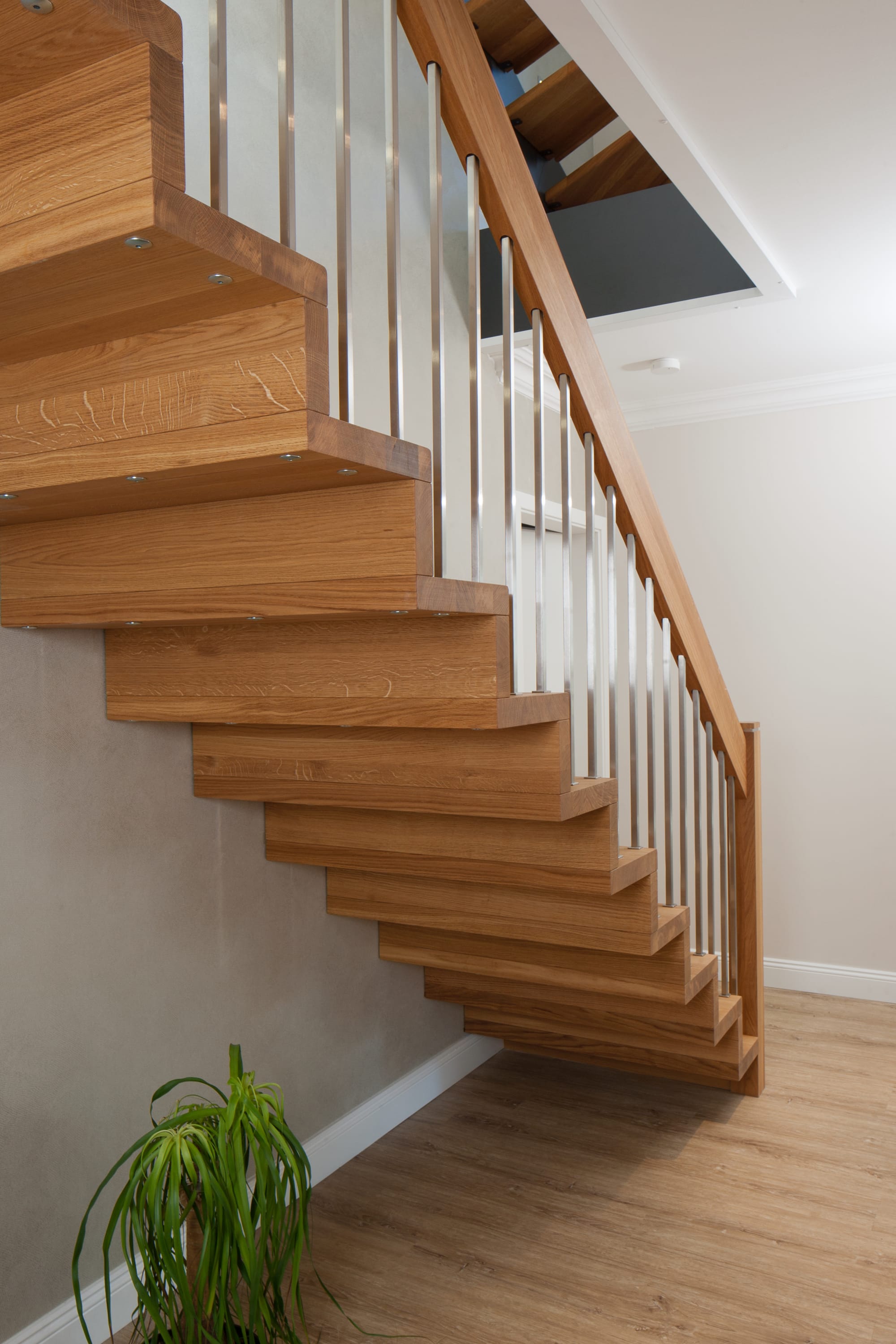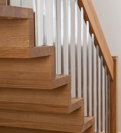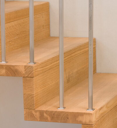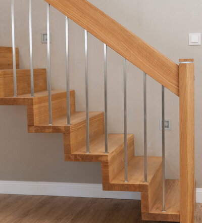 1/4 gewendelte Faltwerktreppe in der Holzart Eiche geölt, Relingeländer mit Drahtseilfüllung
