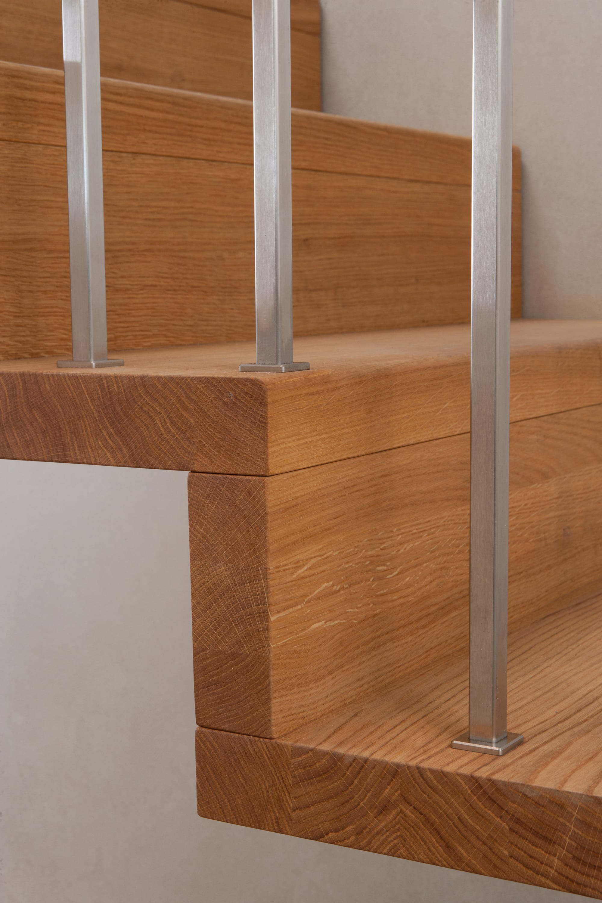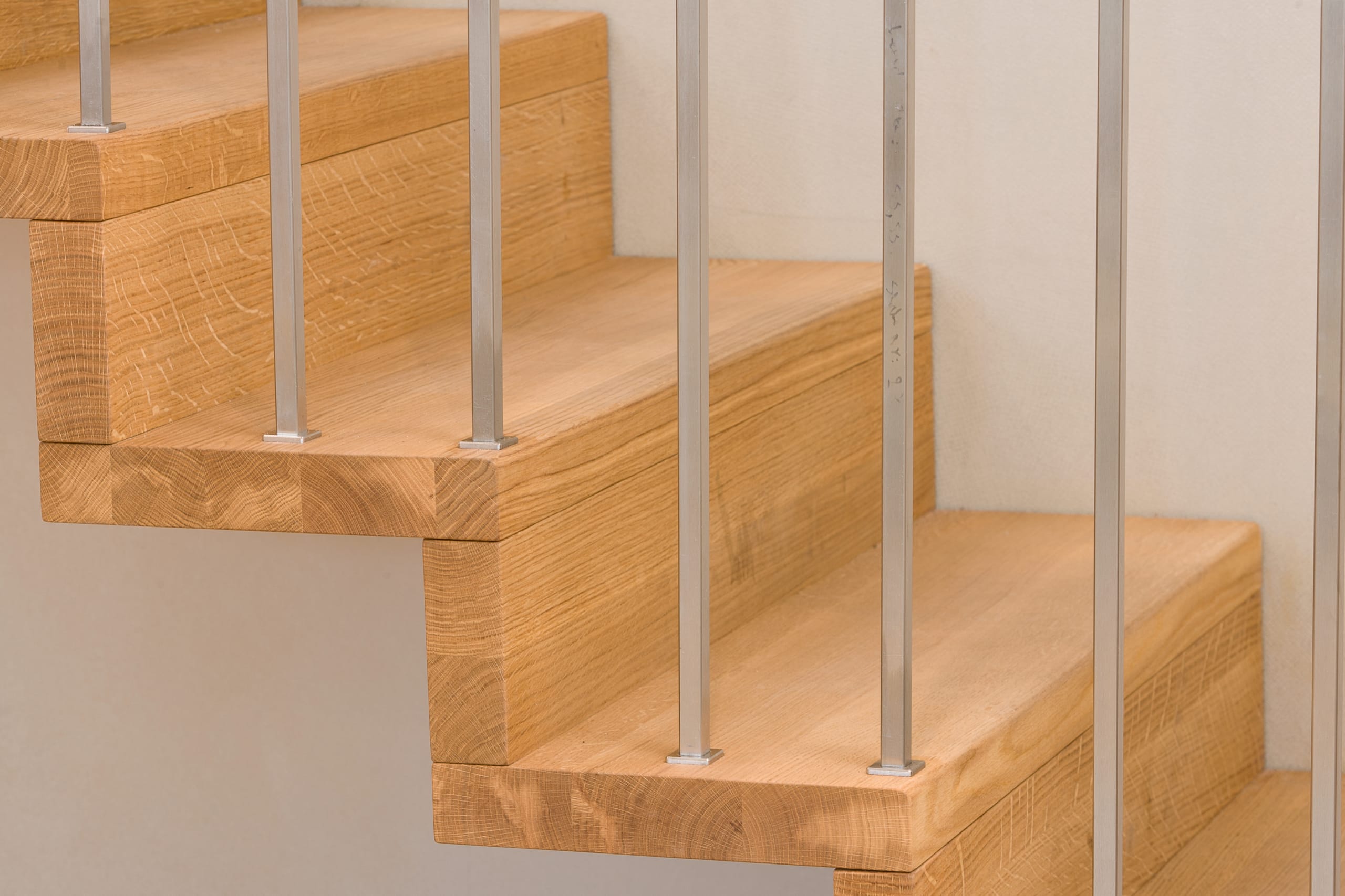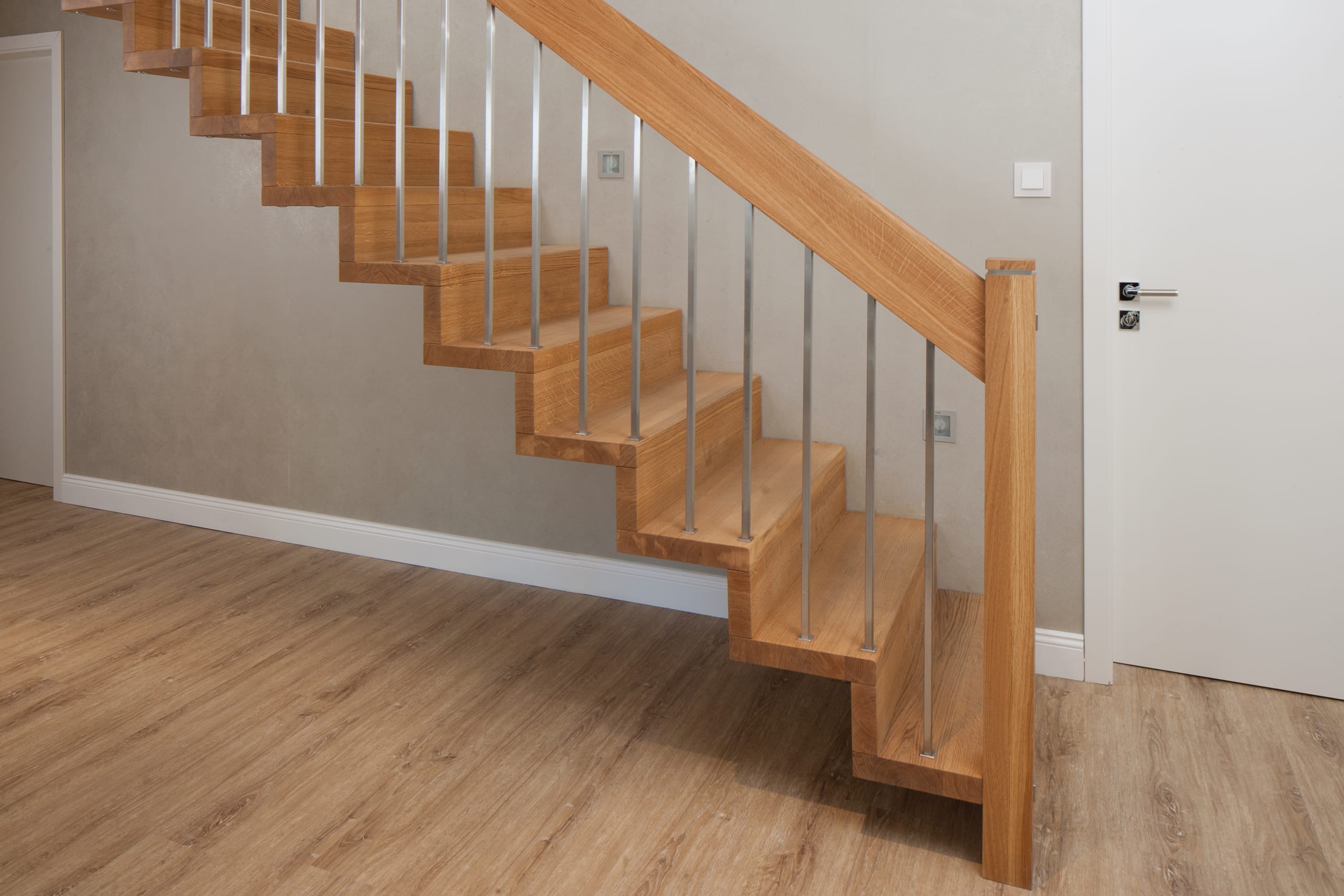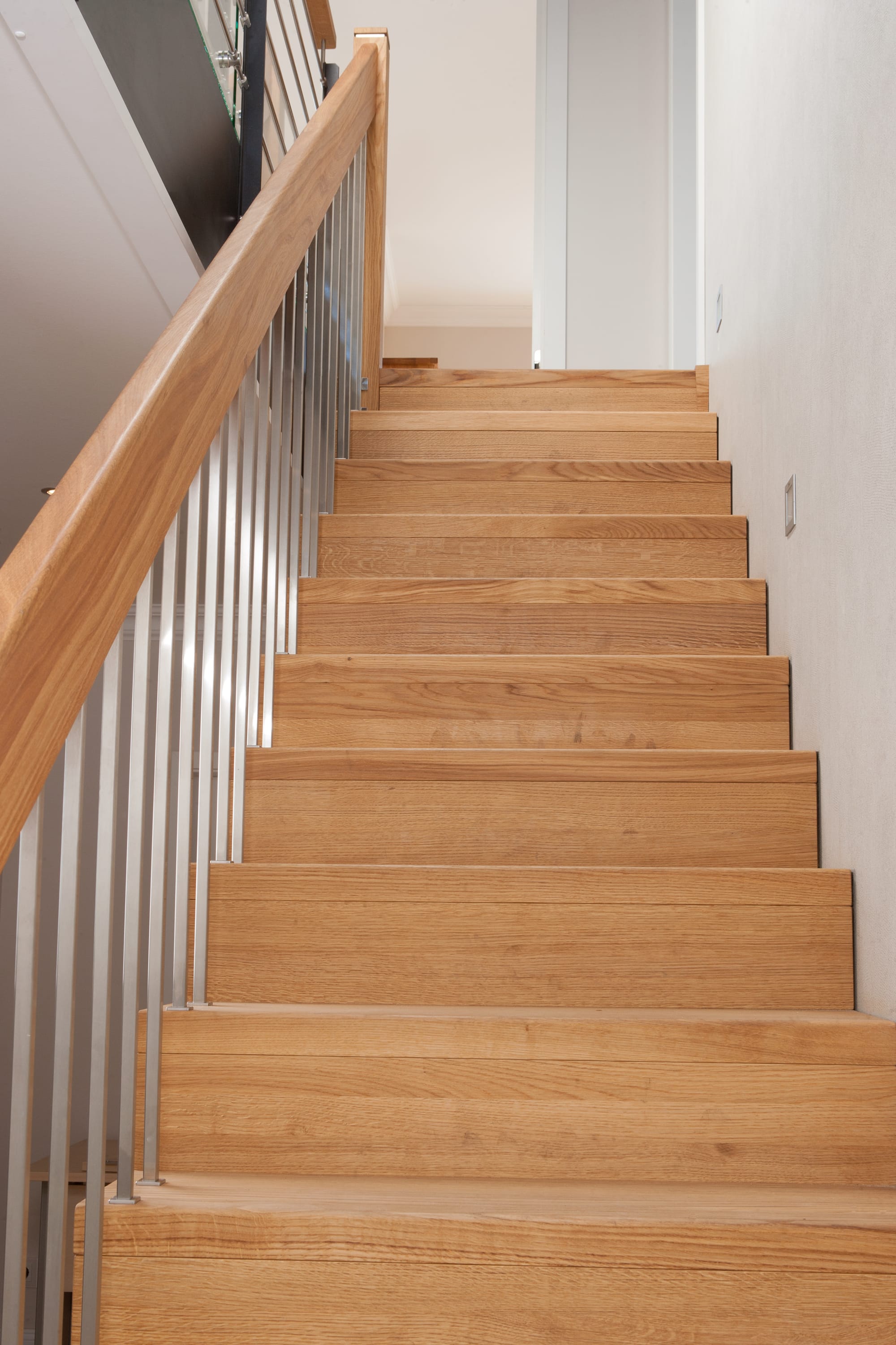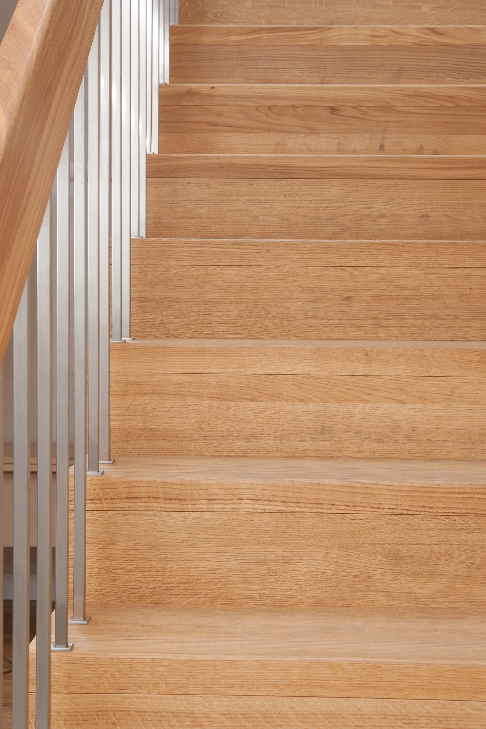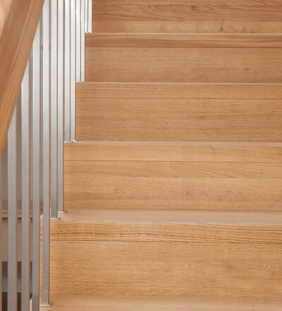 1/4 gewendelte Faltwerktreppe in der Holzart Eiche geölt, Relingeländer mit Drahtseilfüllung
