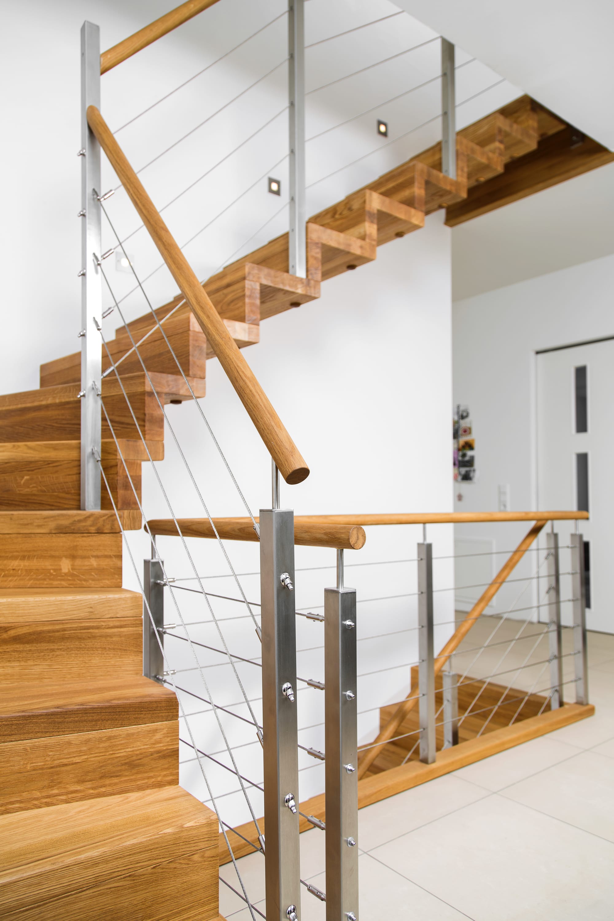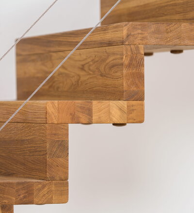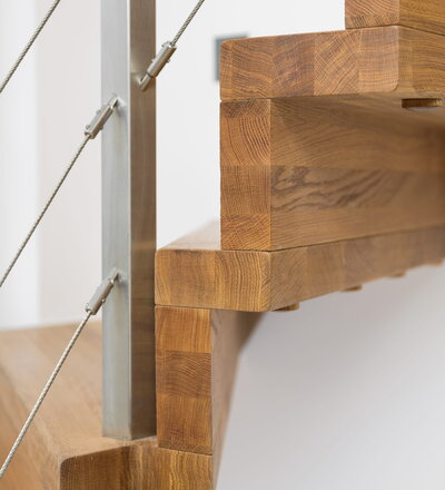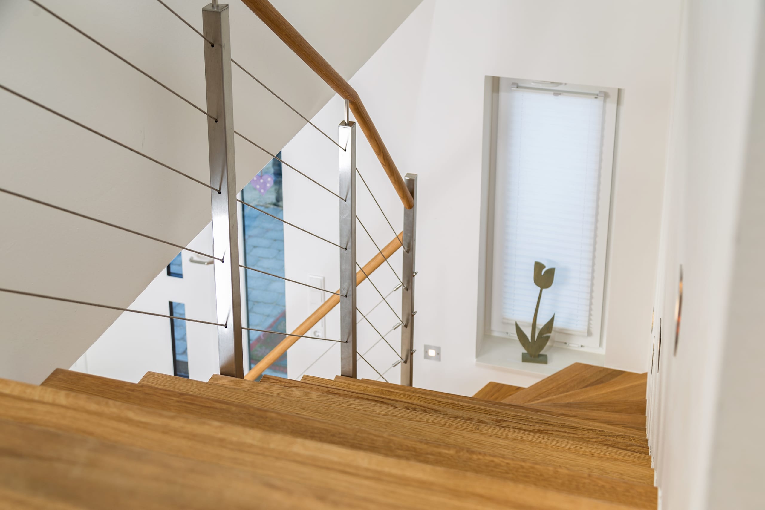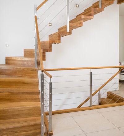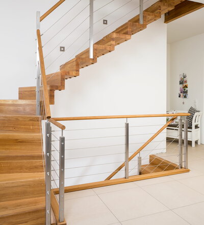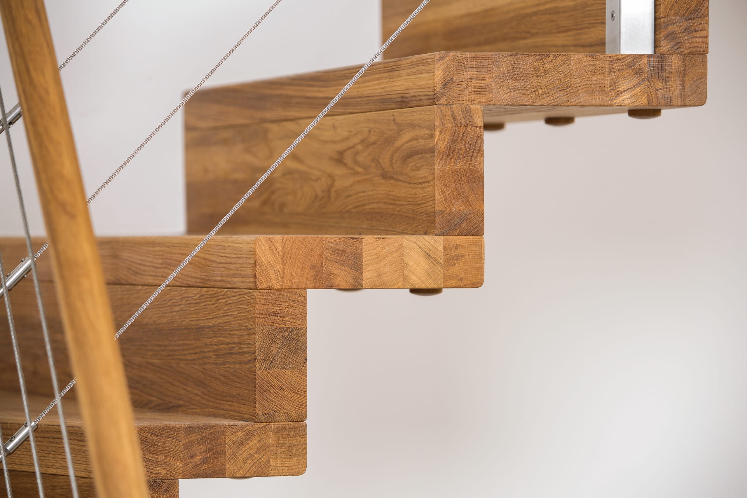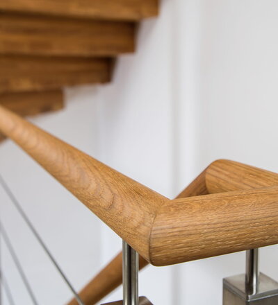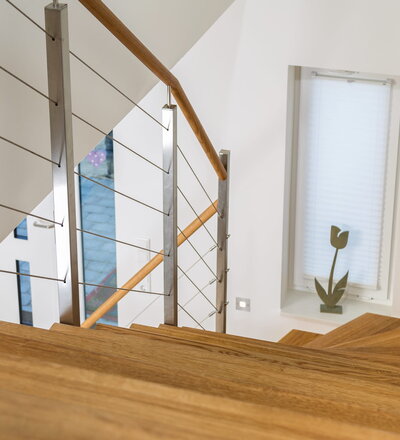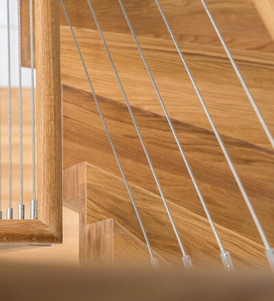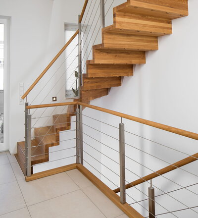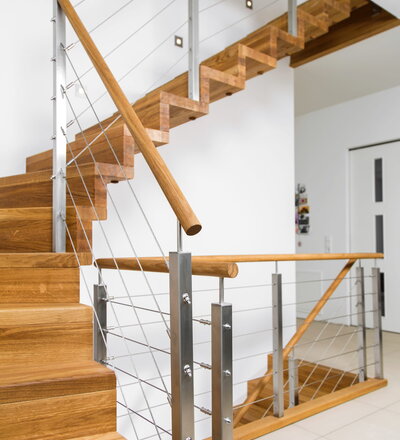 1/4 gewendelte Faltwerktreppe in der Holzart Eiche geölt, Relingeländer mit Drahtseilfüllung