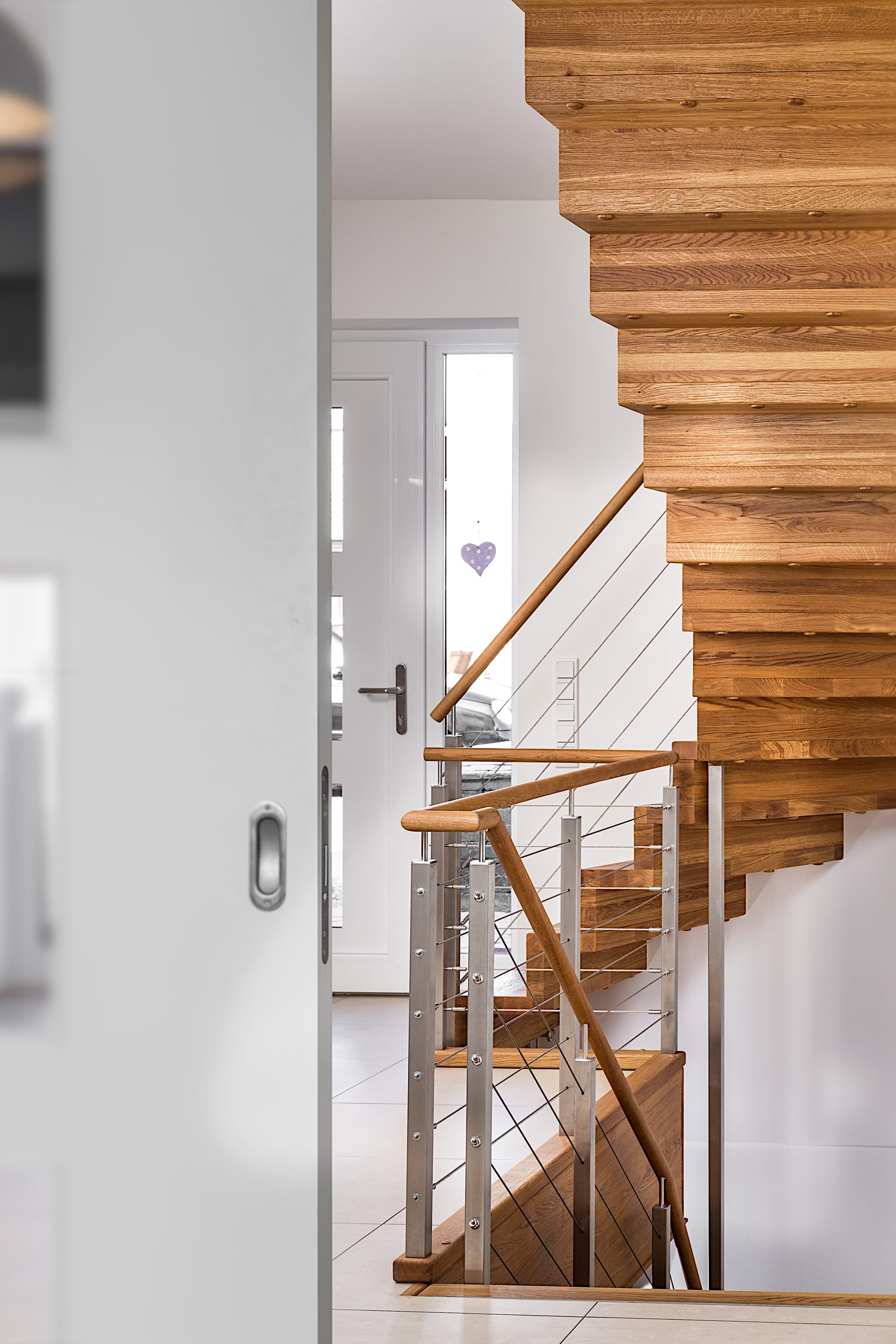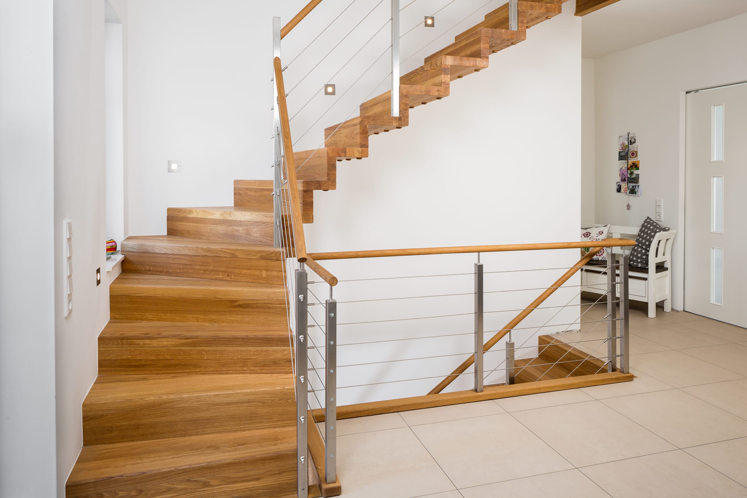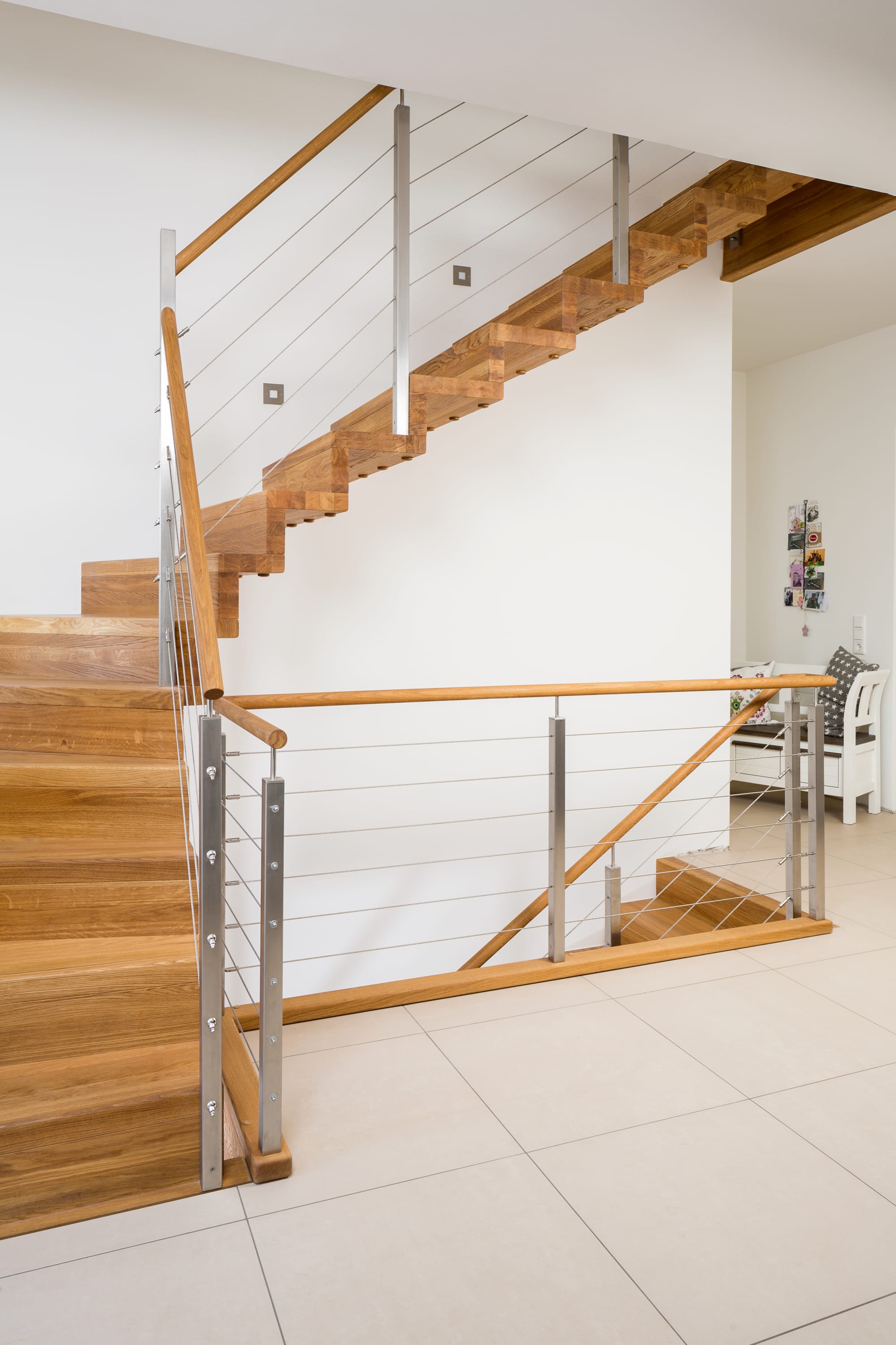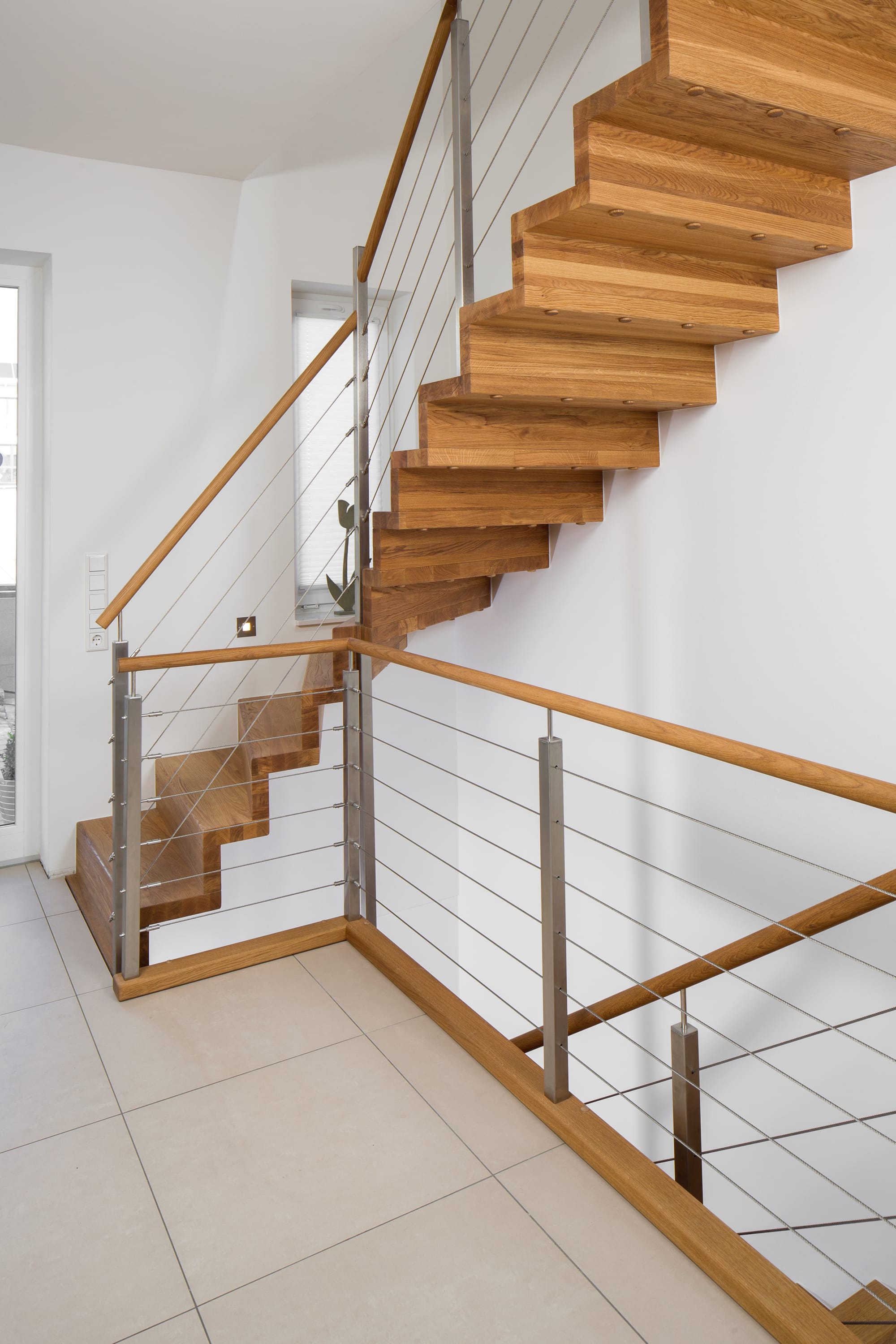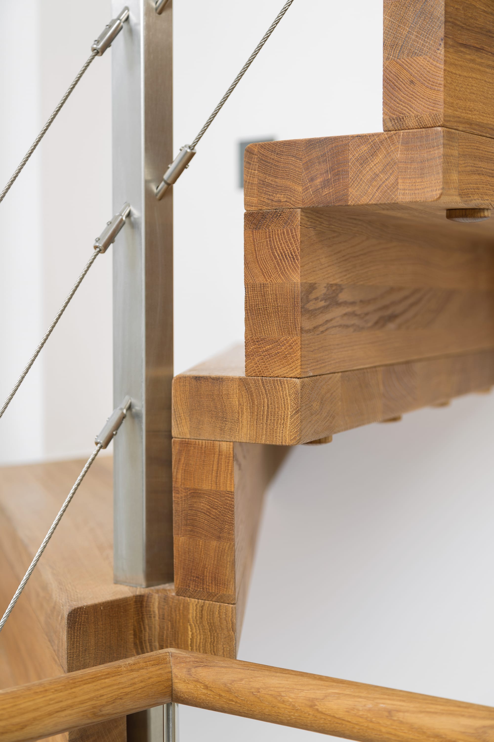 1/4 gewendelte Faltwerktreppe in der Holzart Eiche geölt, Relingeländer mit Drahtseilfüllung