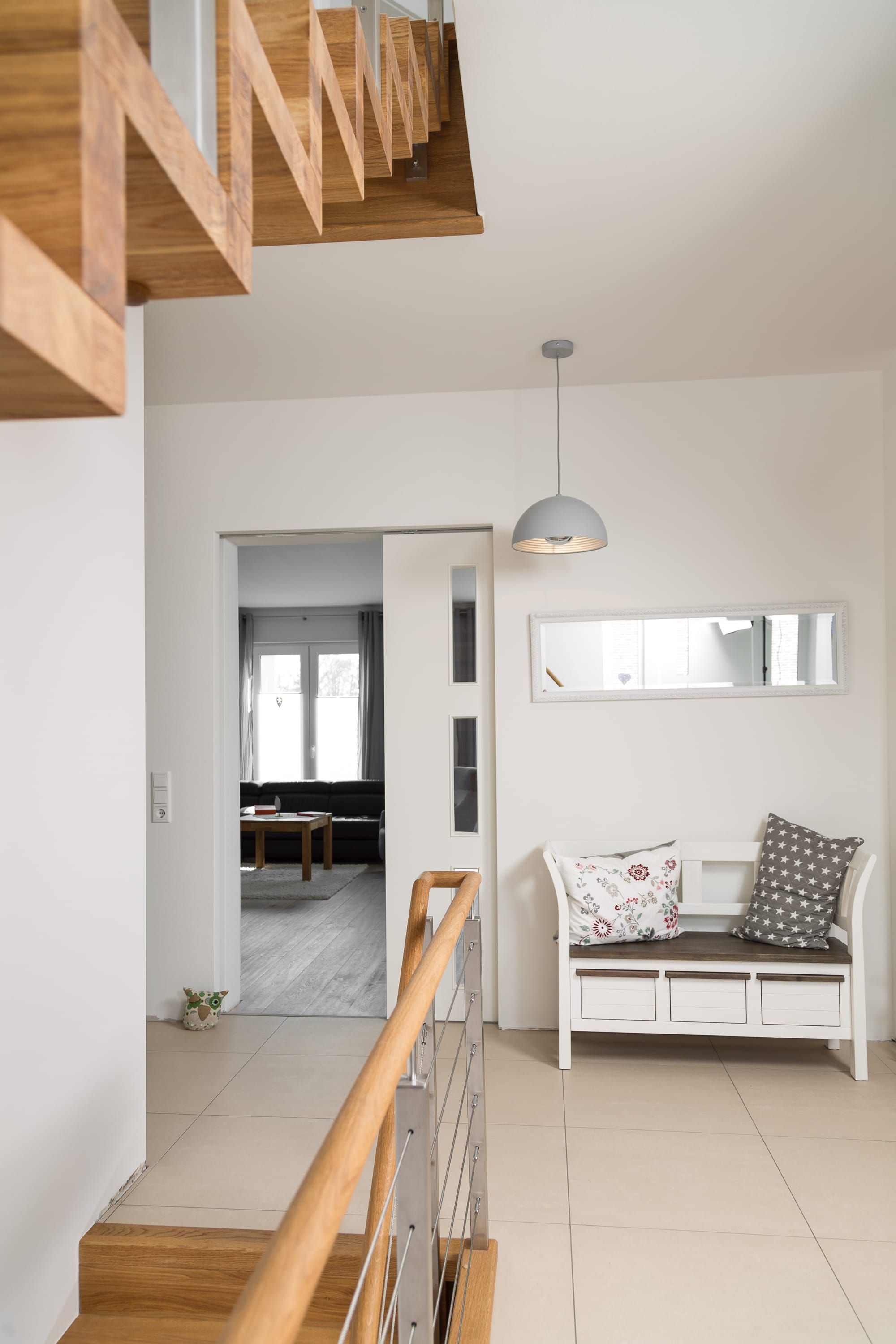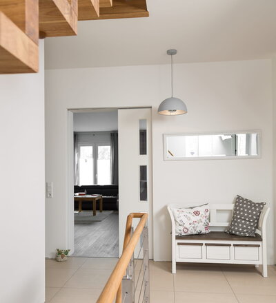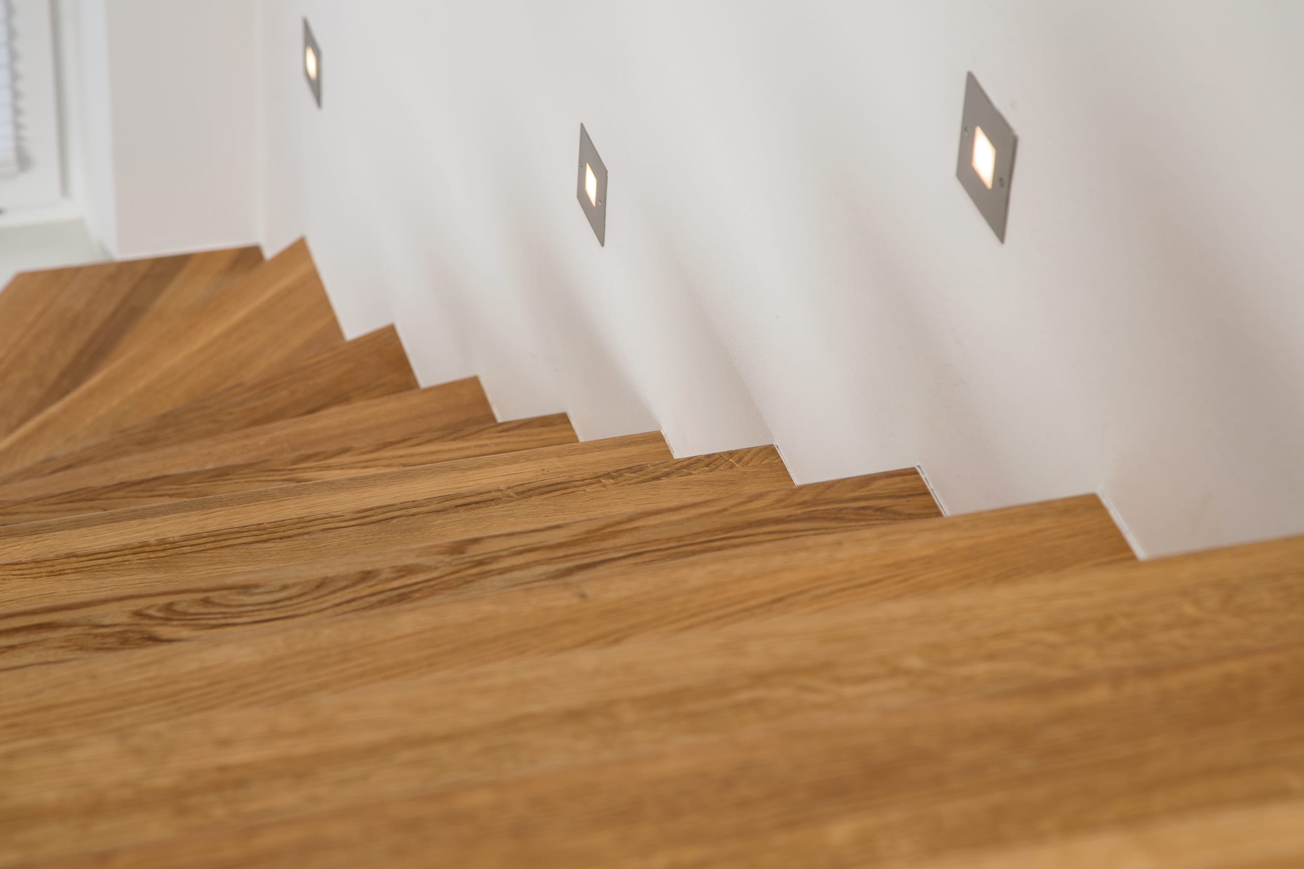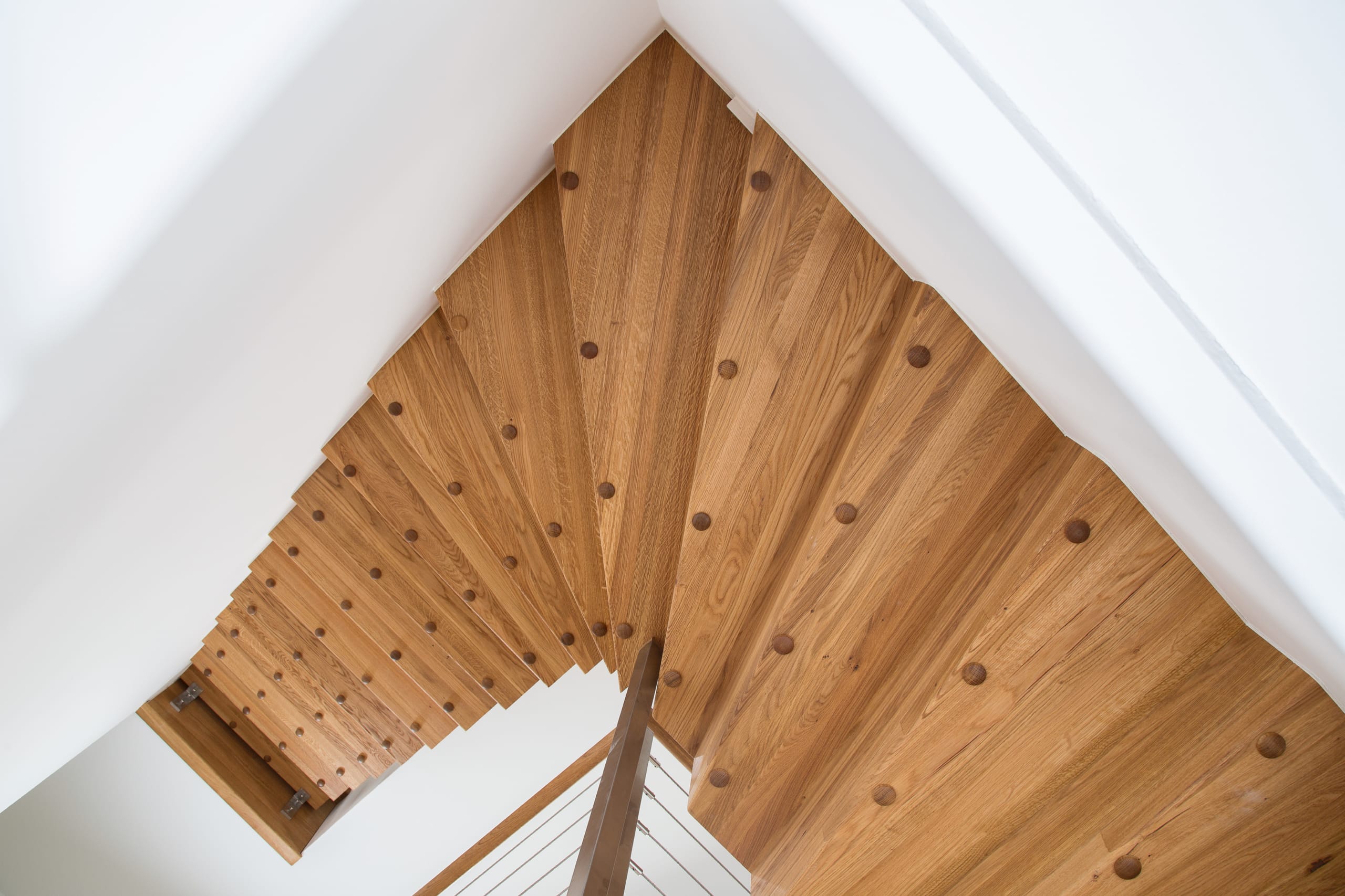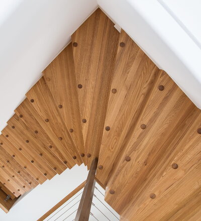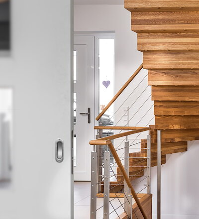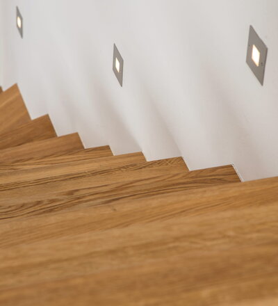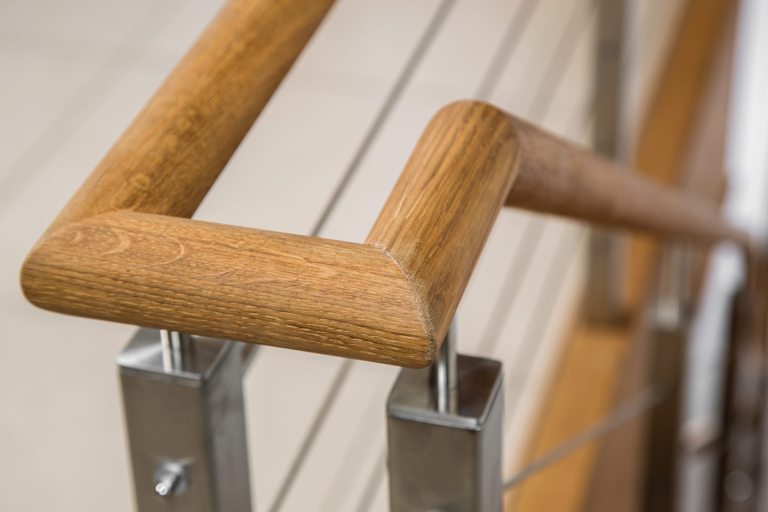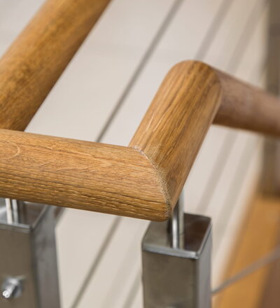 1/4 gewendelte Faltwerktreppe in der Holzart Eiche geölt, Relingeländer mit Drahtseilfüllung