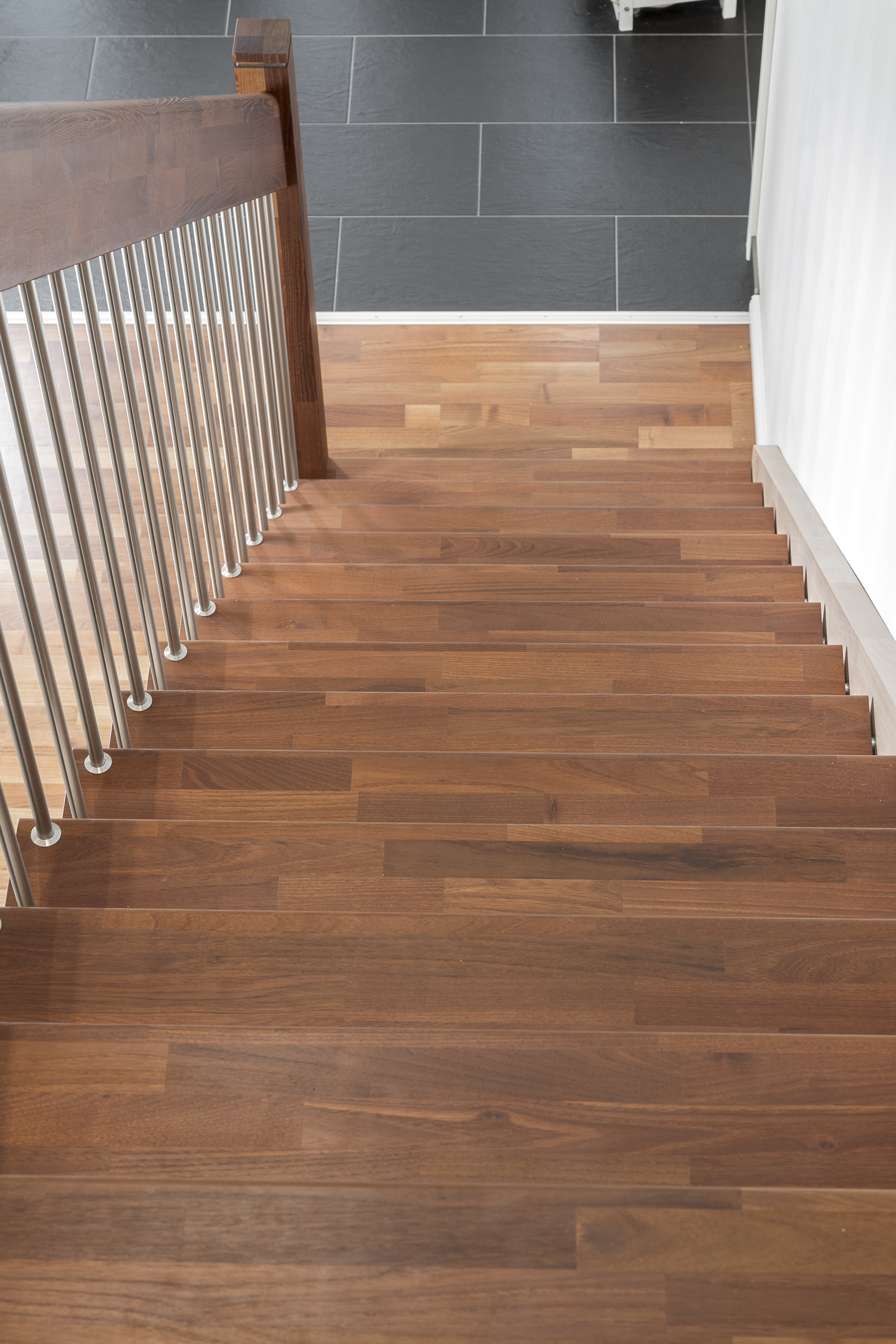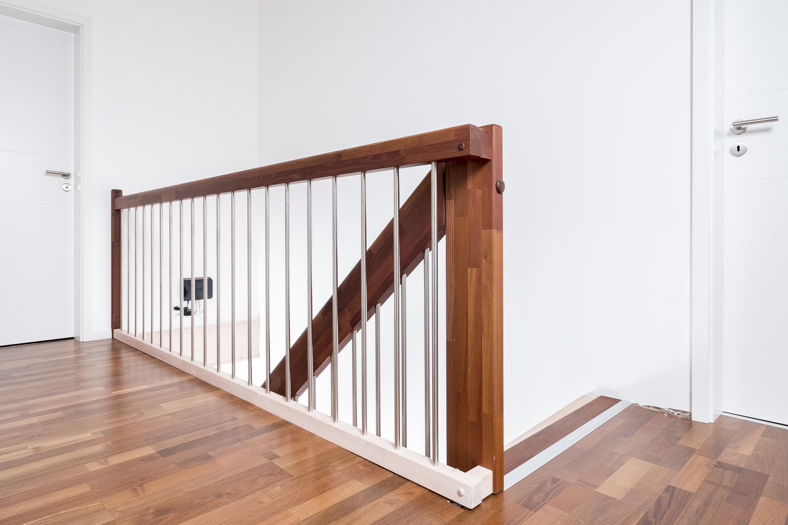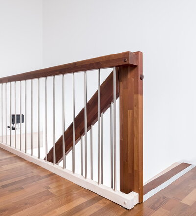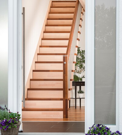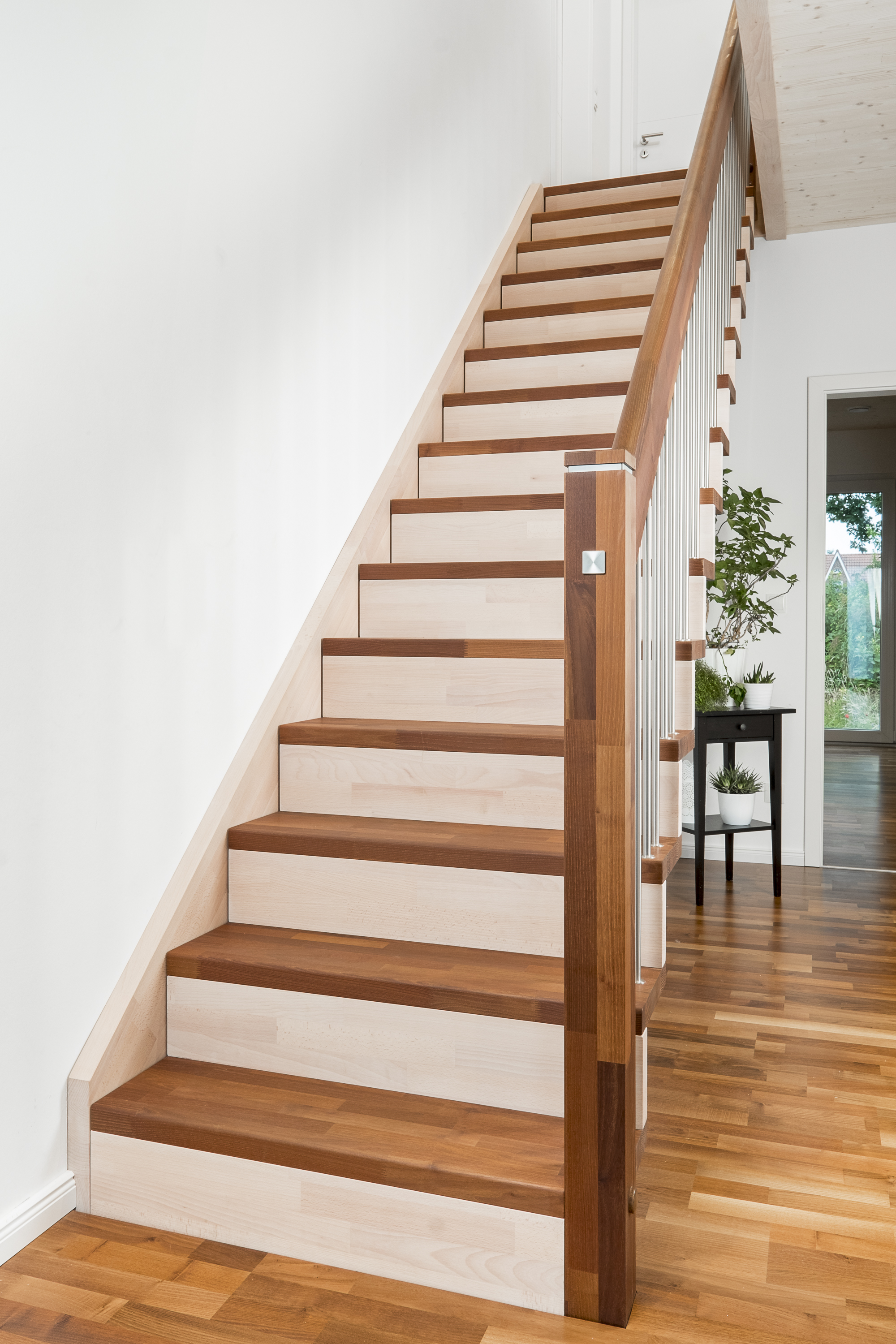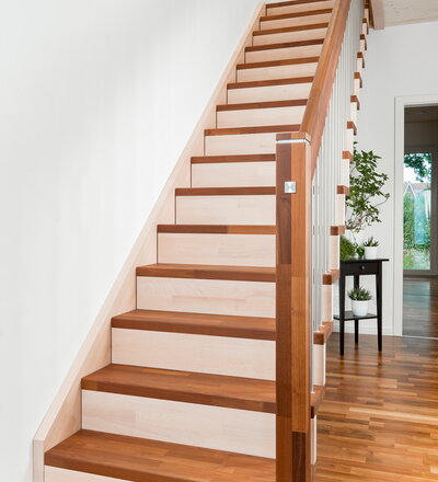 Gerade Faltwerktreppe, Stufen, Pfosten und Handlauf in der Holzart Akazie mosaik Pure (farblos) geölt mit TBV Echtholz-Öl, Setzstufen und Wandwange in der Holzart Buche mosaik weiß geölt mit TBV Echtholz-Öl V-White