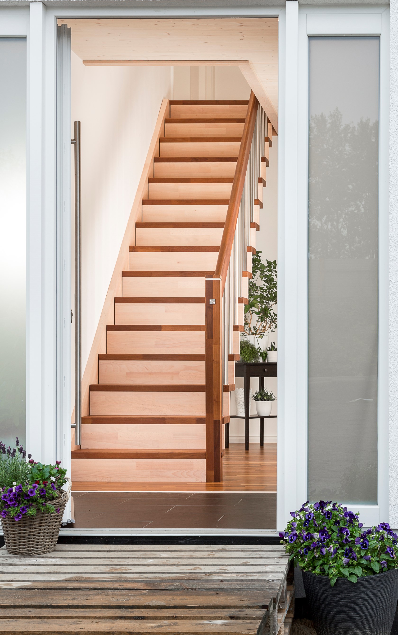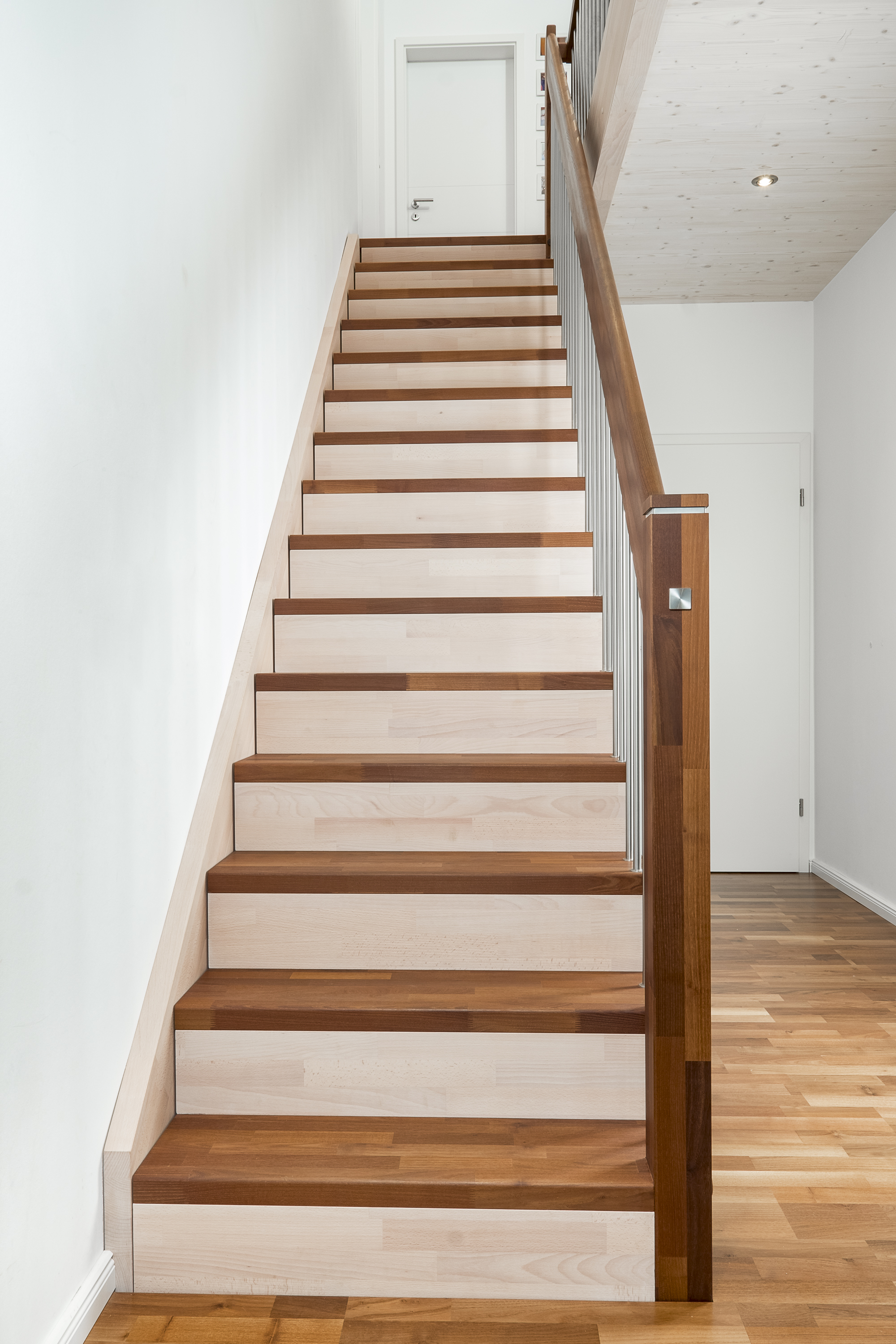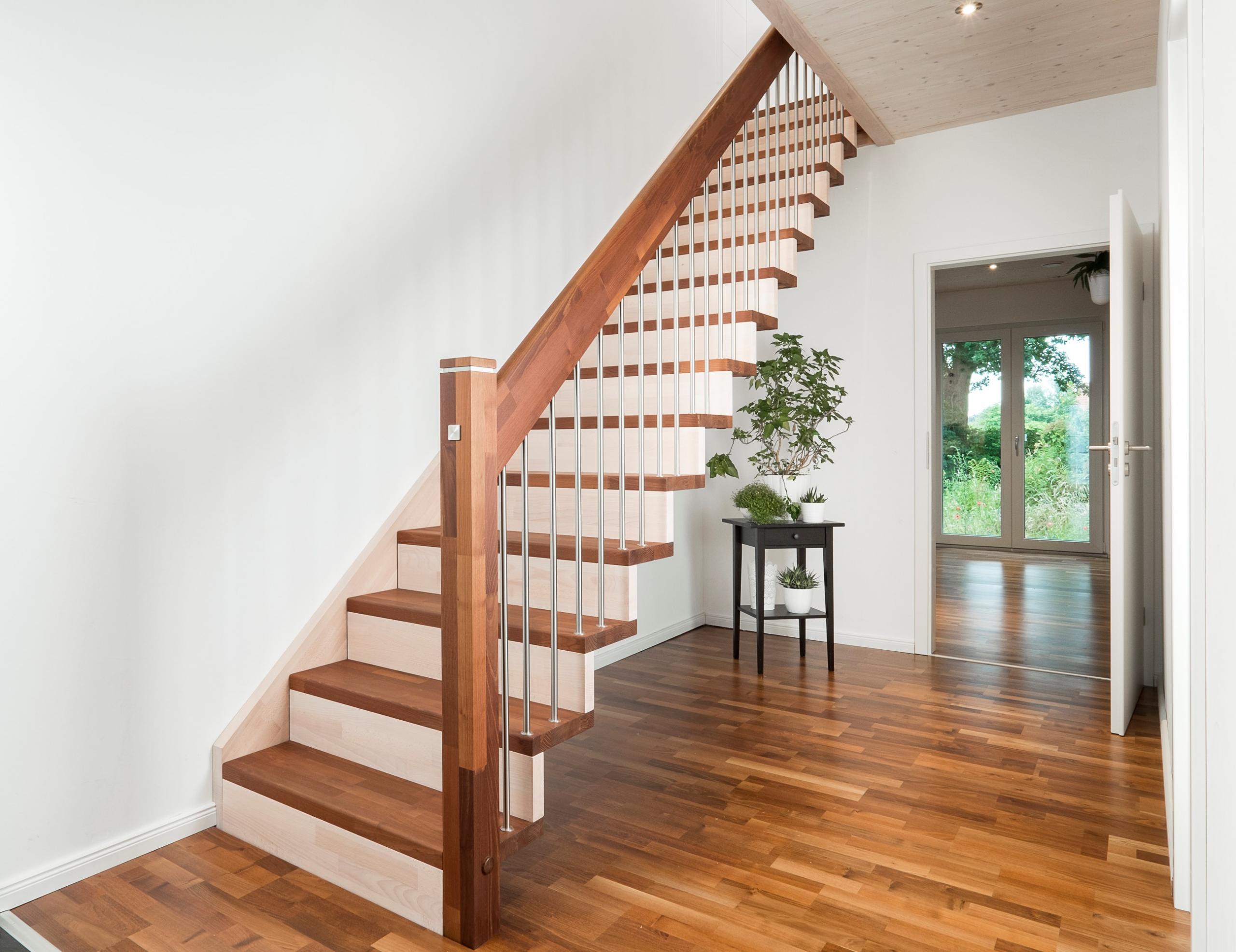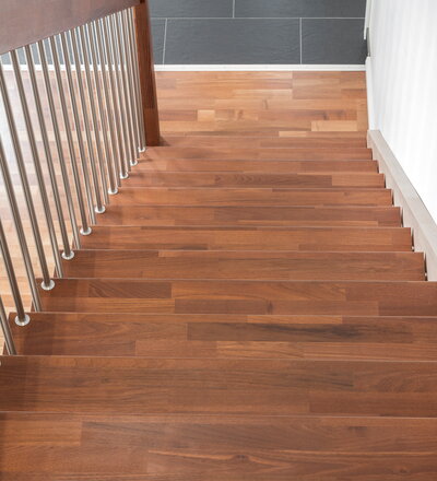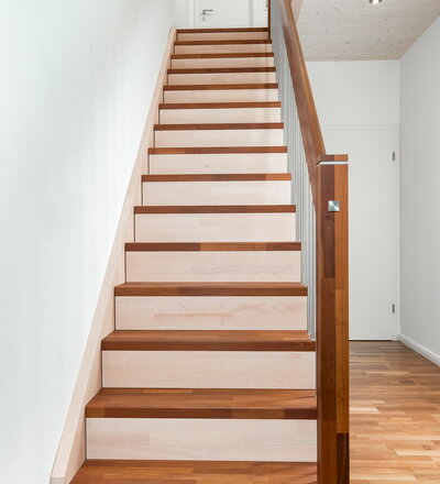 Gerade Faltwerktreppe, Stufen, Pfosten und Handlauf in der Holzart Akazie mosaik Pure (farblos) geölt mit TBV Echtholz-Öl, Setzstufen und Wandwange in der Holzart Buche mosaik weiß geölt mit TBV Echtholz-Öl V-White