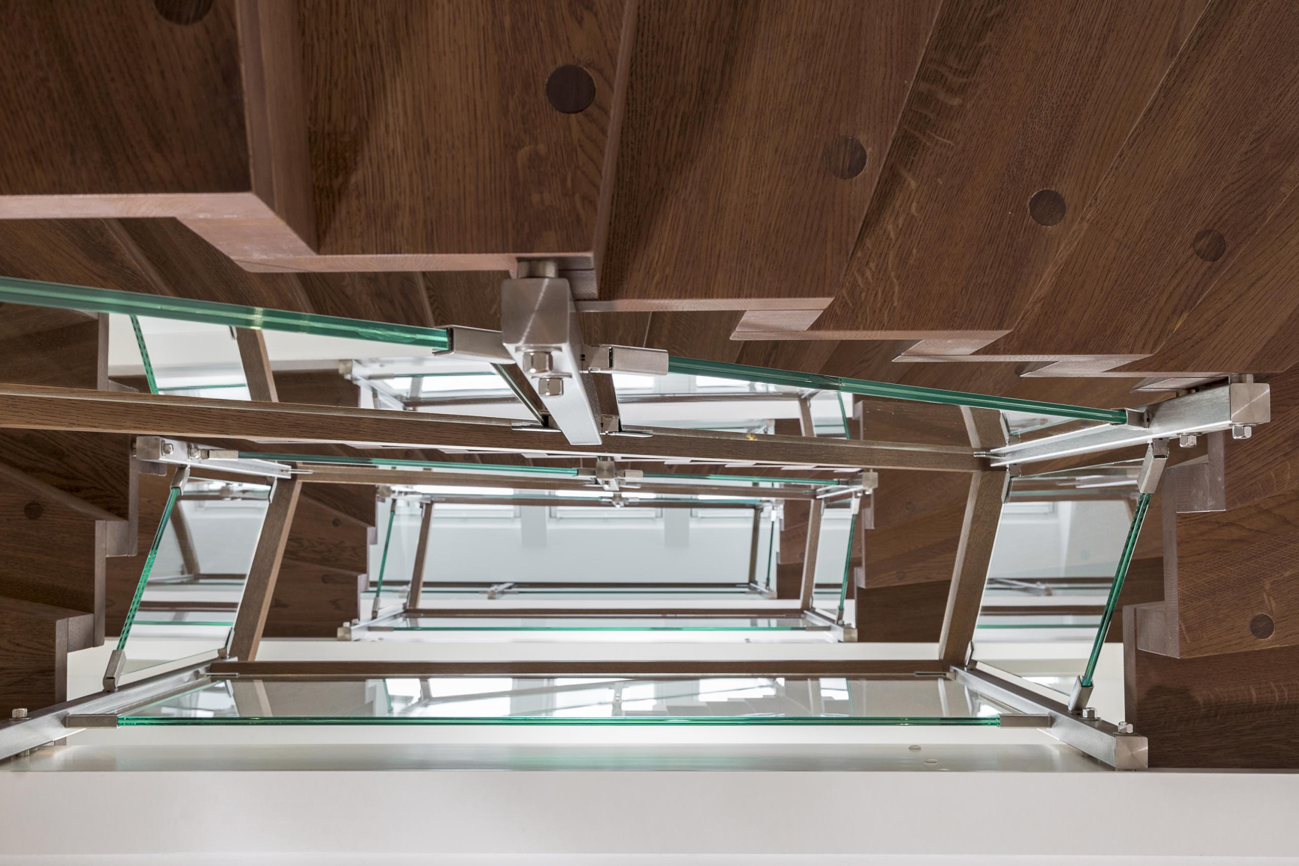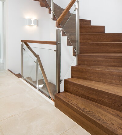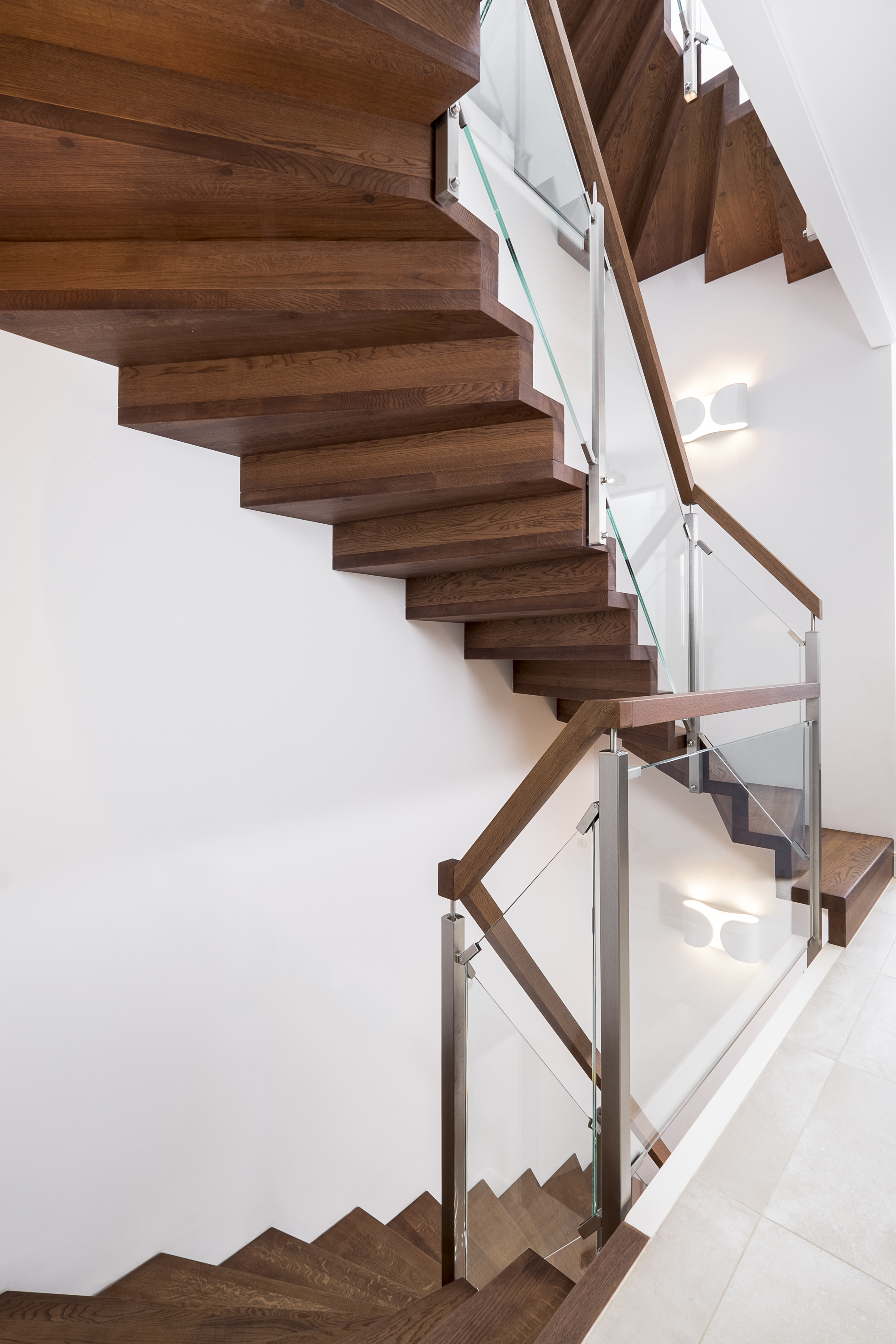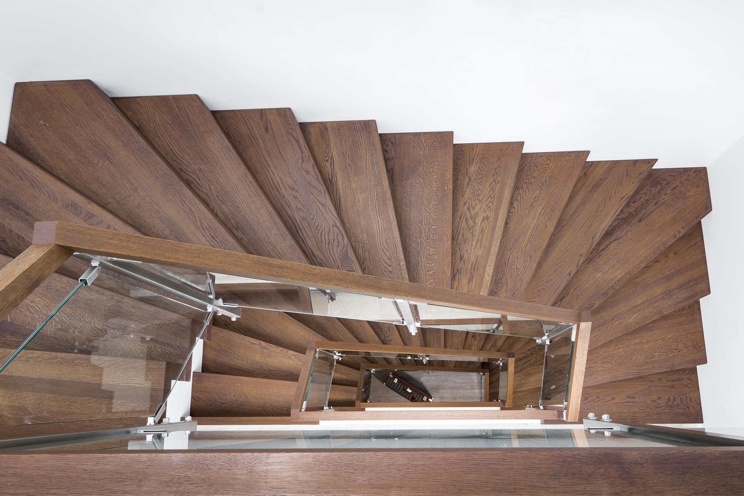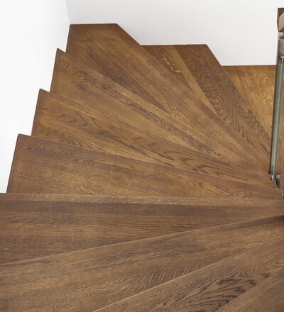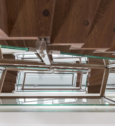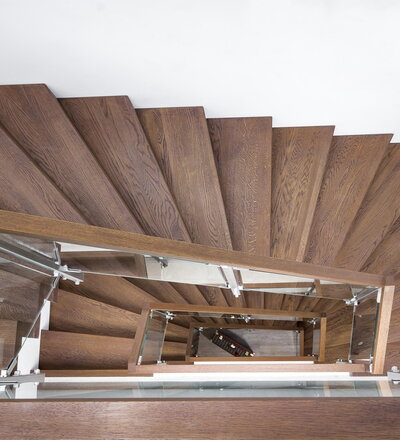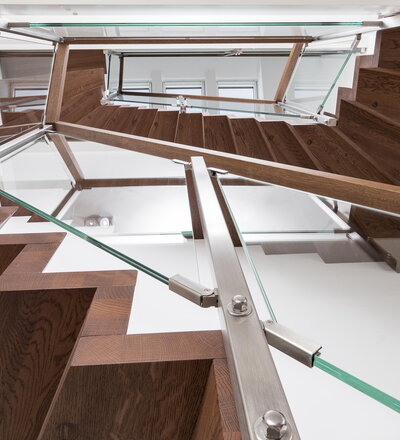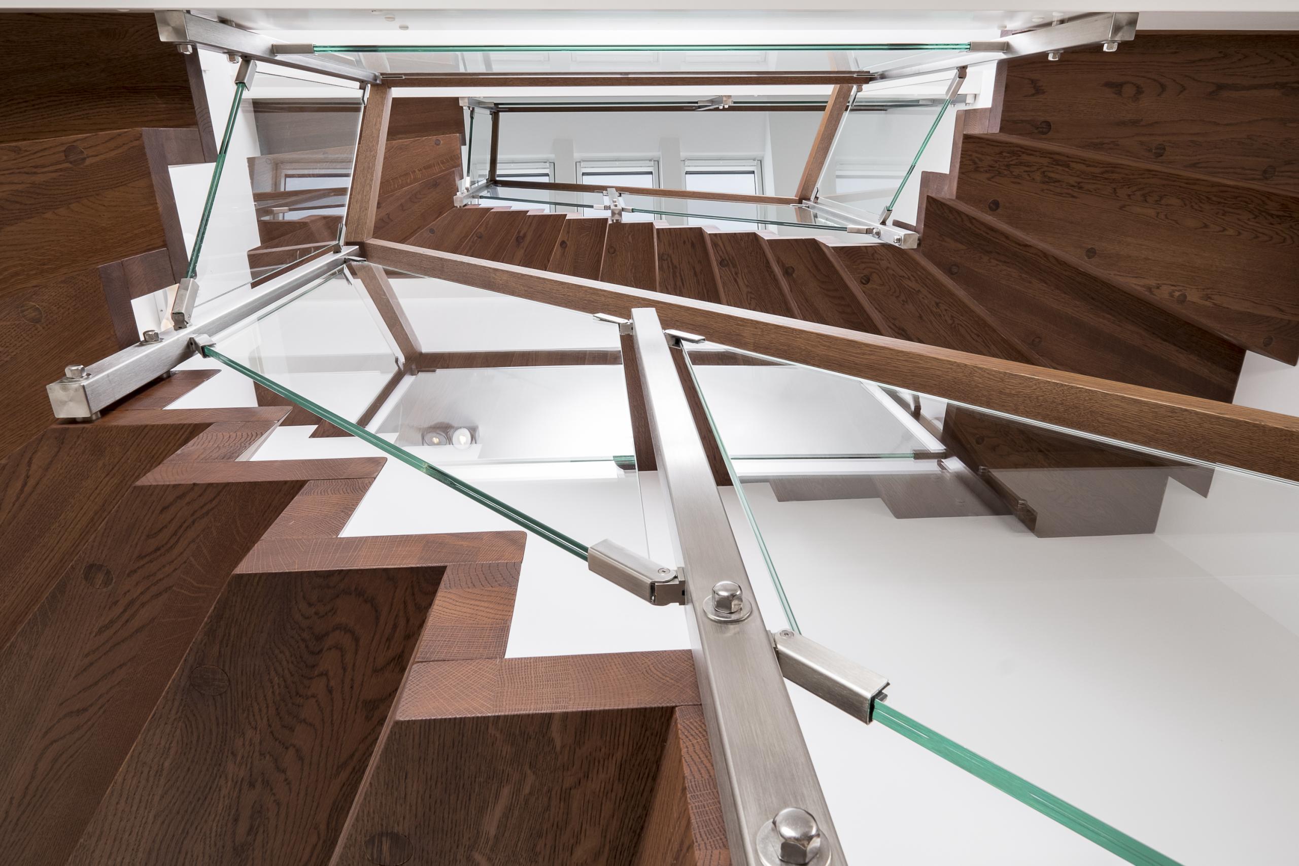 Faltwerktreppe über 3 Etagen in der Holzart Eiche braun geölt mit TBV Echtholz-Öl Chocolat, Glasgeländer mit Sicherheitsglas