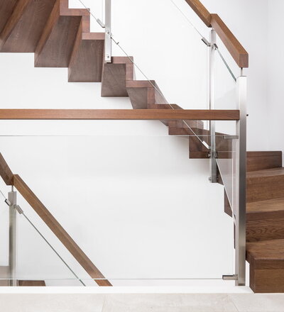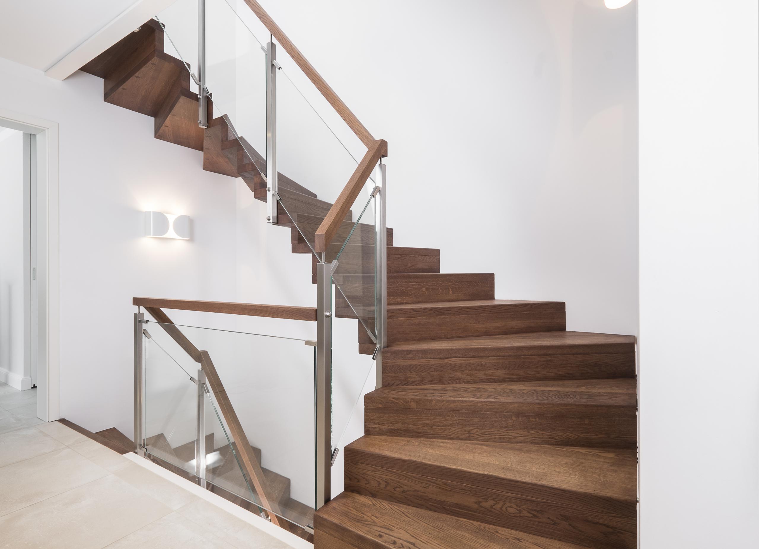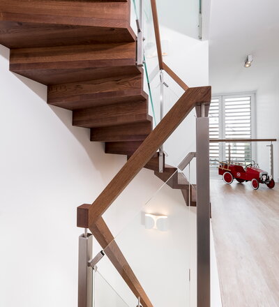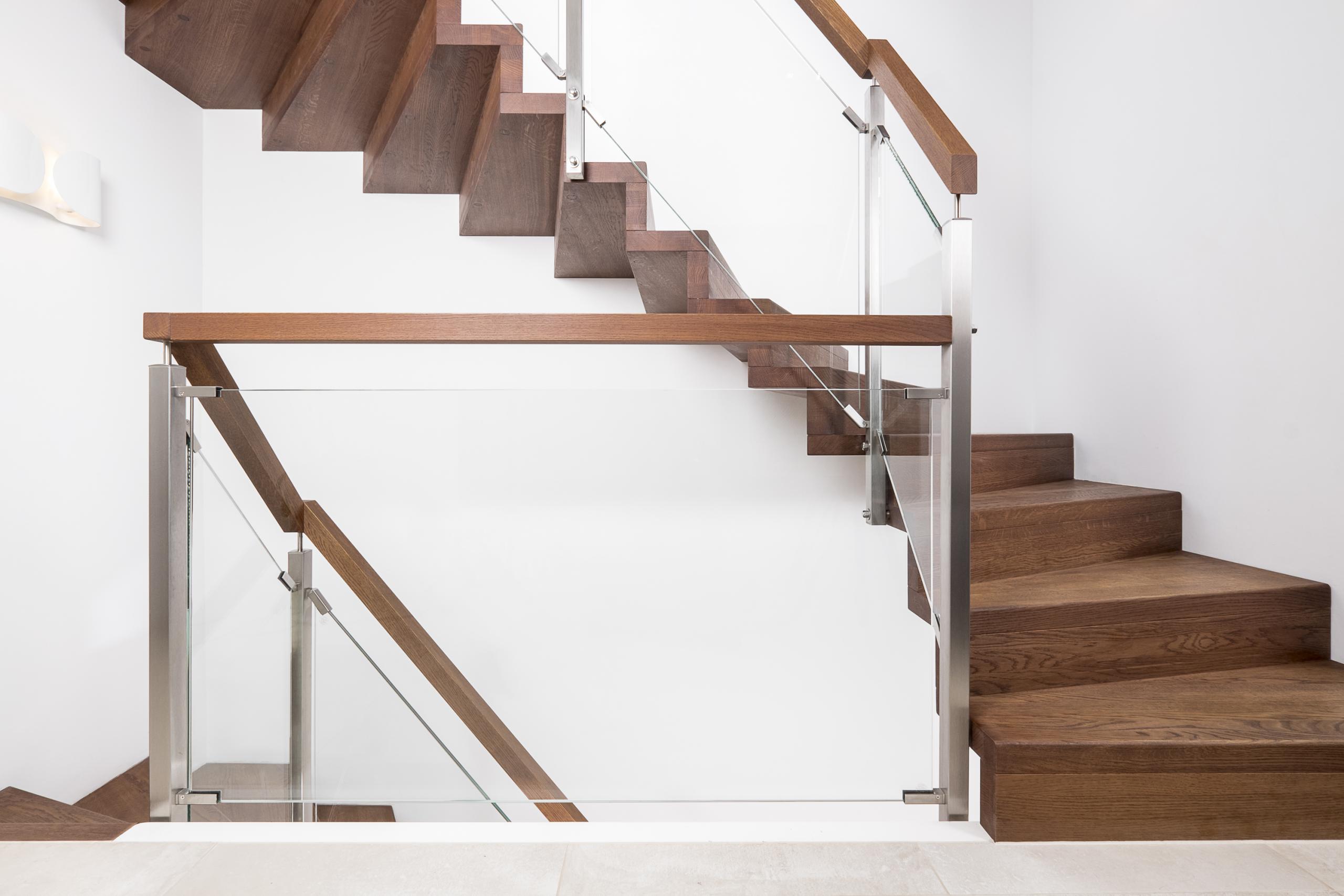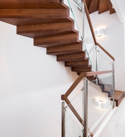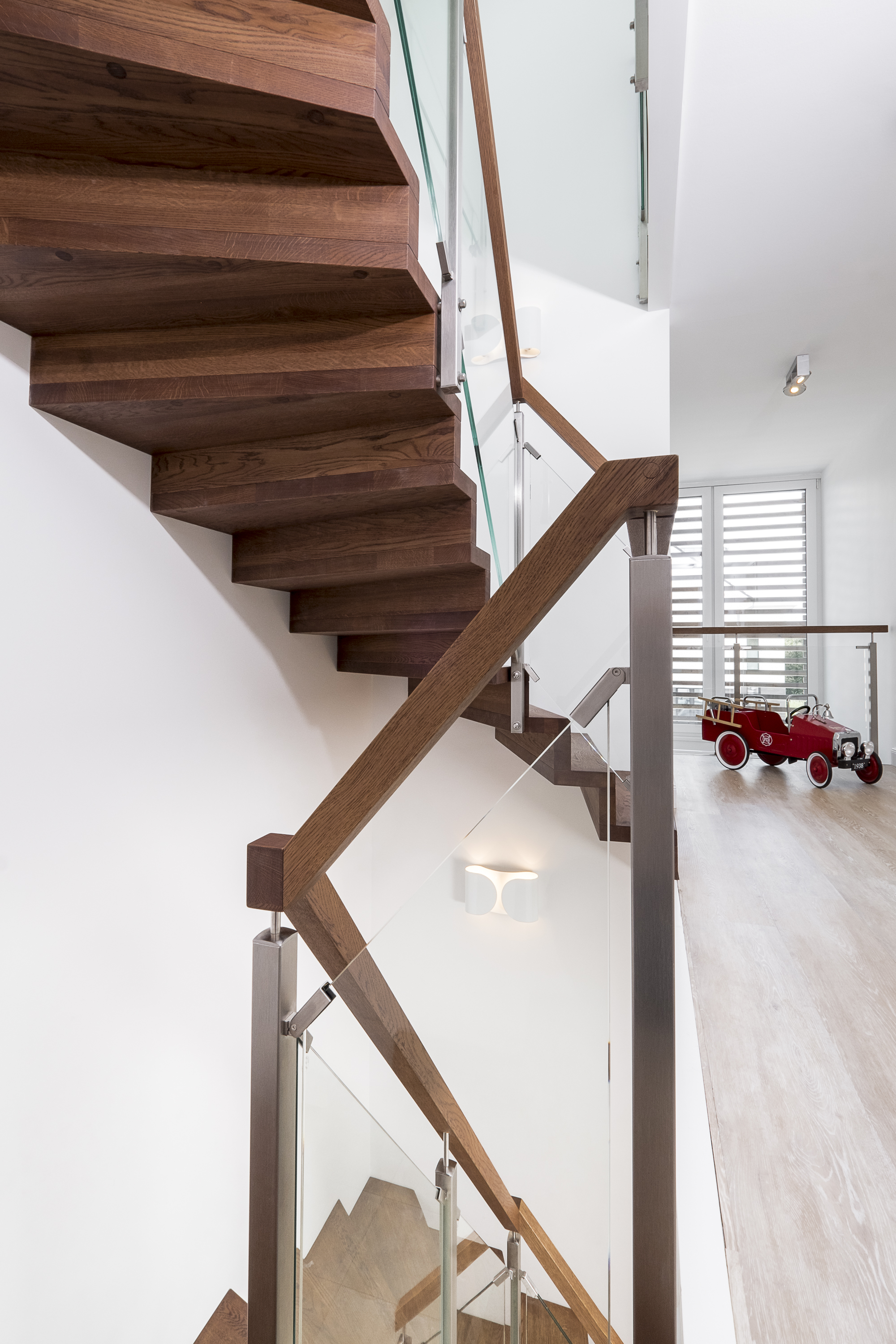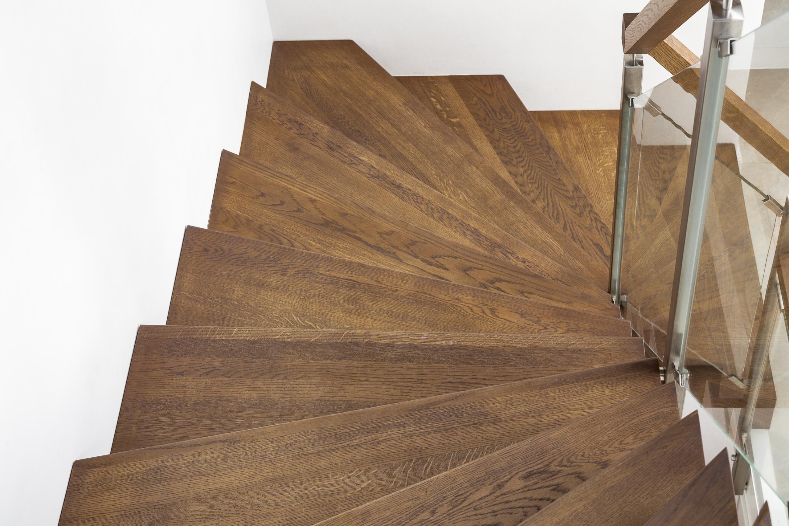 Faltwerktreppe über 3 Etagen in der Holzart Eiche braun geölt mit TBV Echtholz-Öl Chocolat, Glasgeländer mit Sicherheitsglas