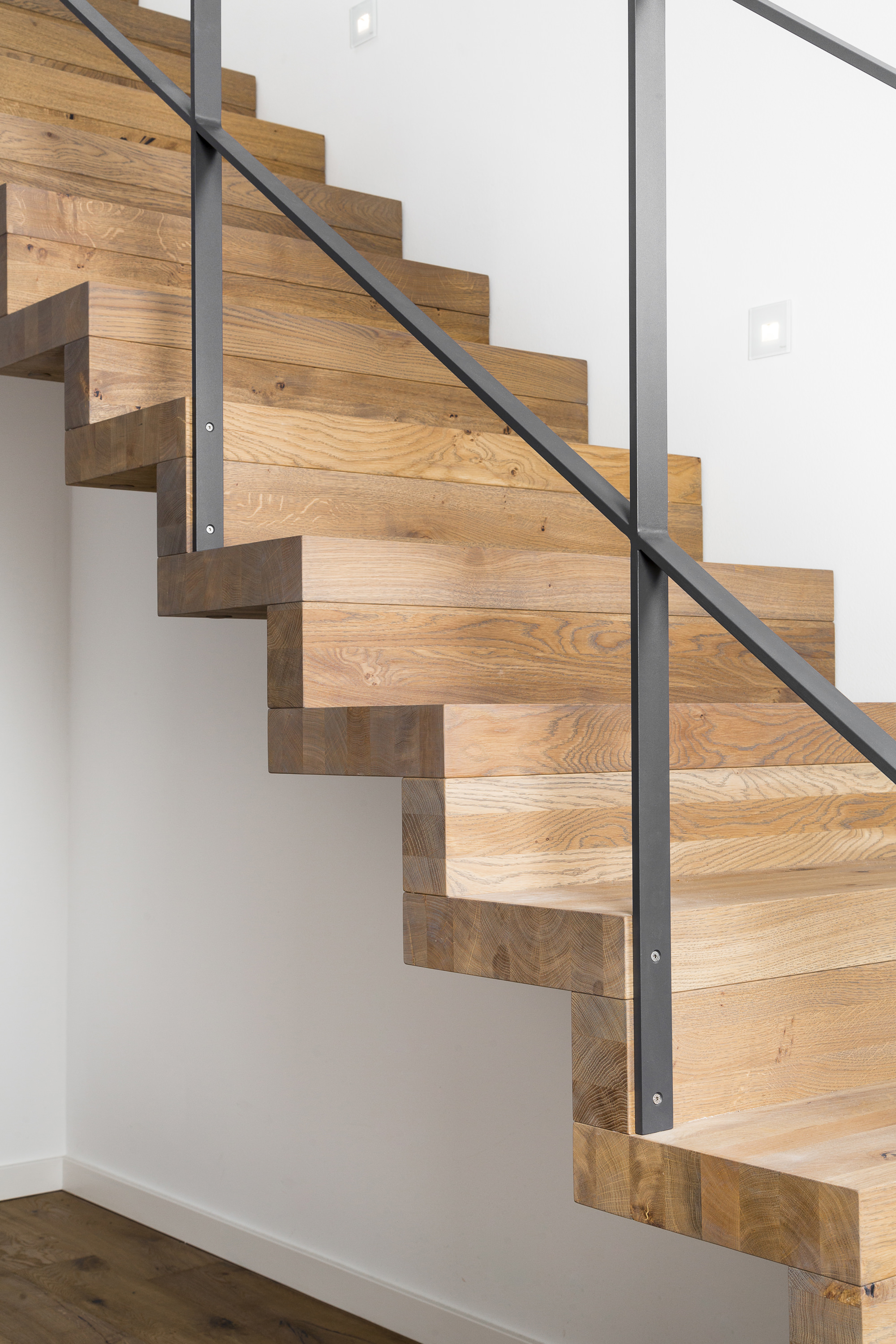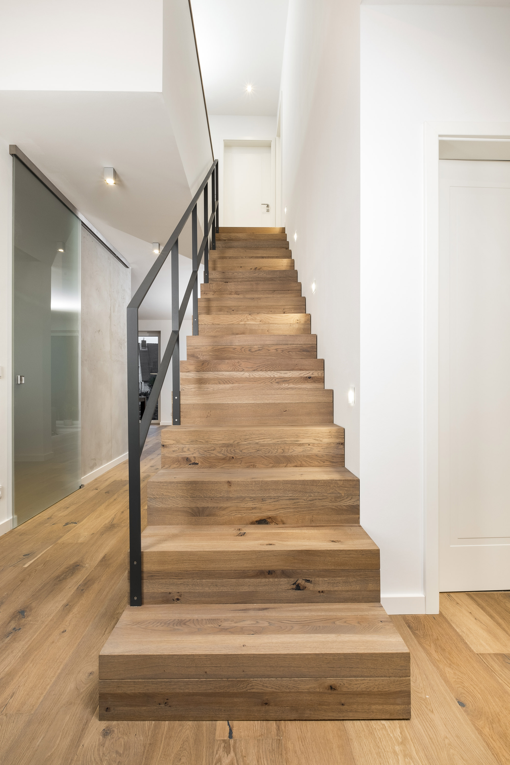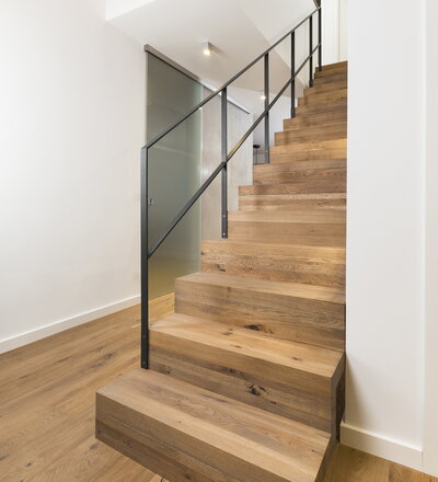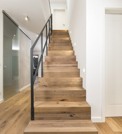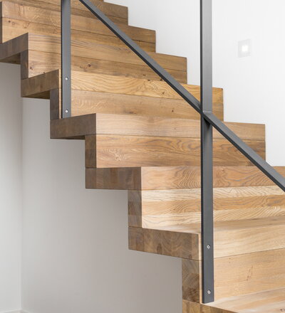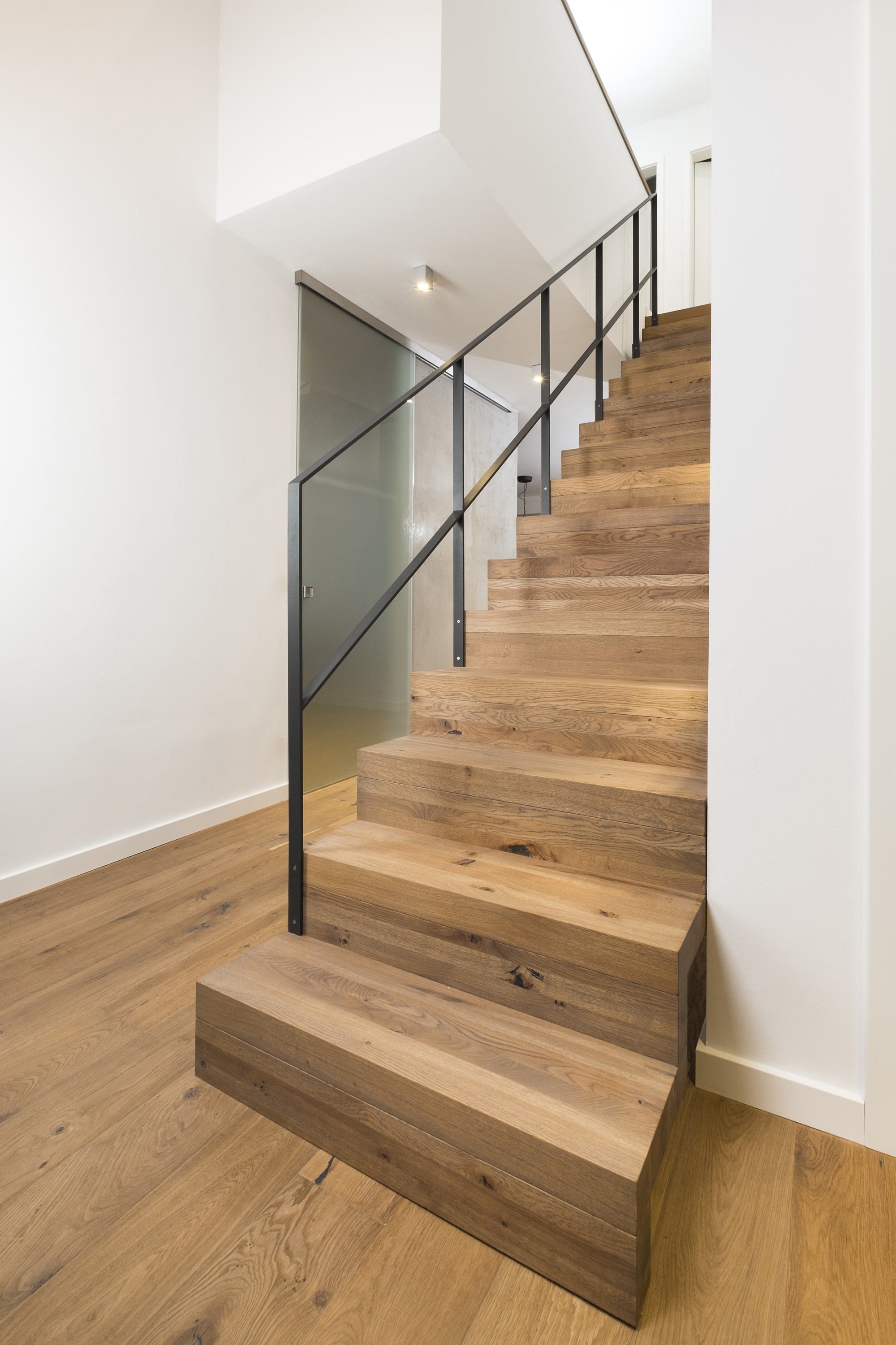 Faltwerktreppe in der Holzart Eiche astig - farblos geölt. Bei der Anordnung des Zwischengurtes wurde der „Goldene Schnitt“ angewendet.