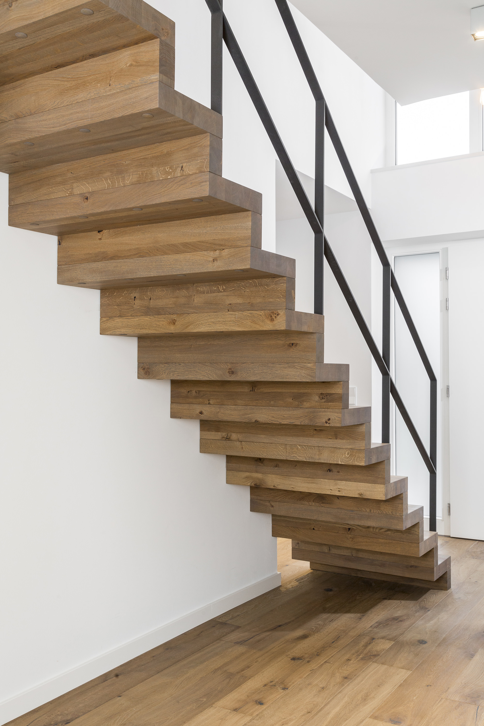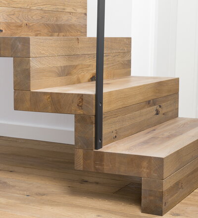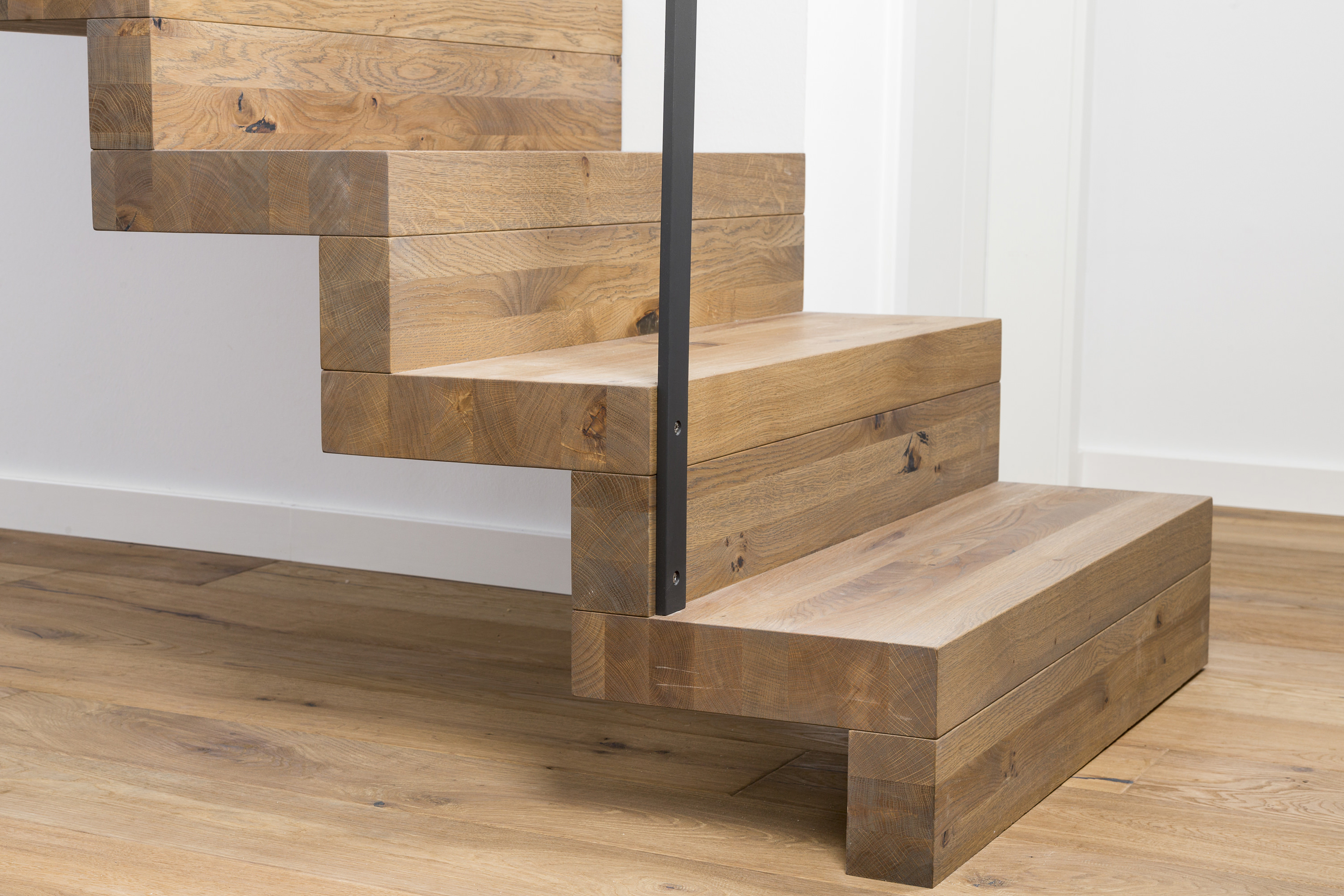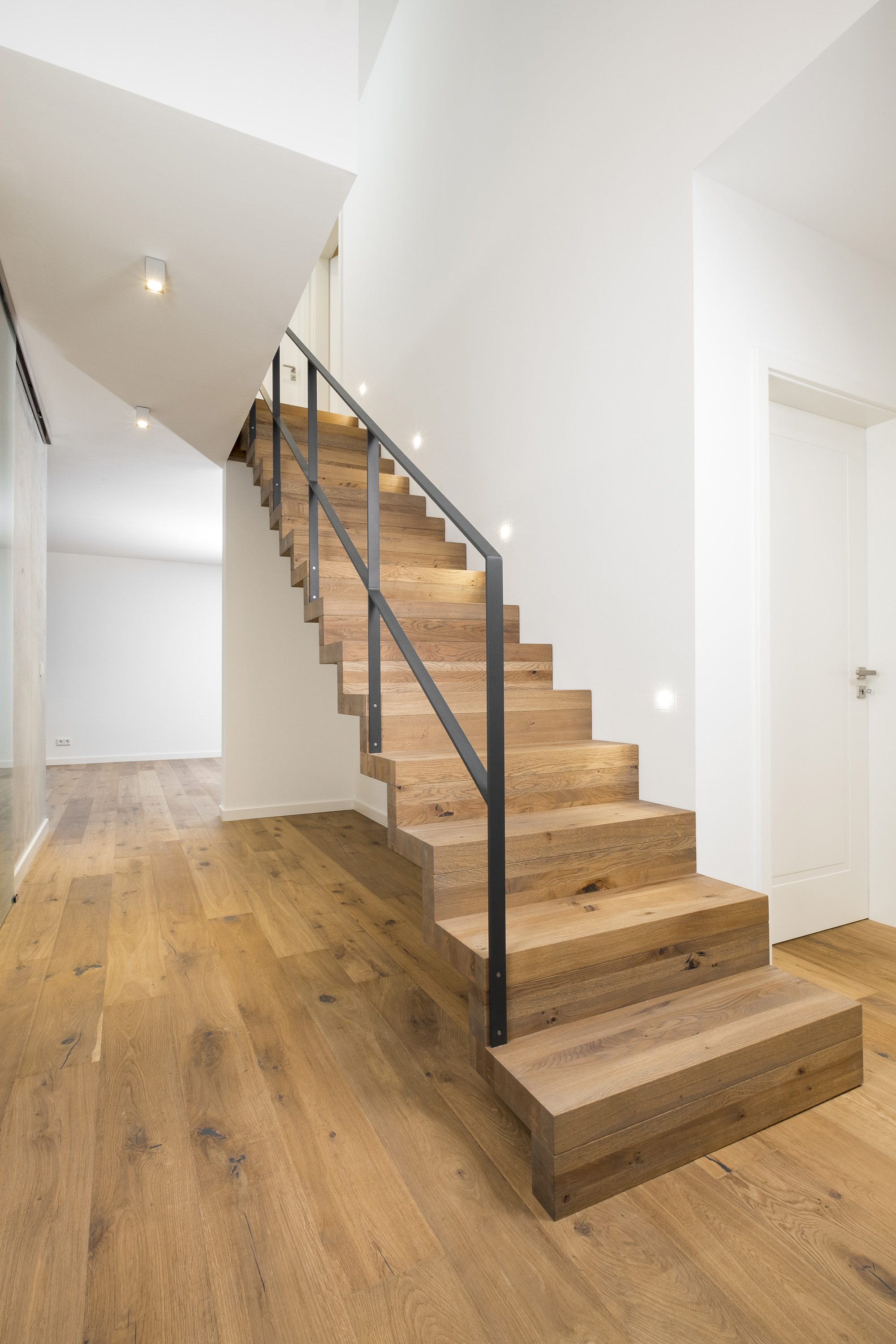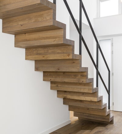 Faltwerktreppe in der Holzart Eiche astig - farblos geölt. Bei der Anordnung des Zwischengurtes wurde der „Goldene Schnitt“ angewendet.
