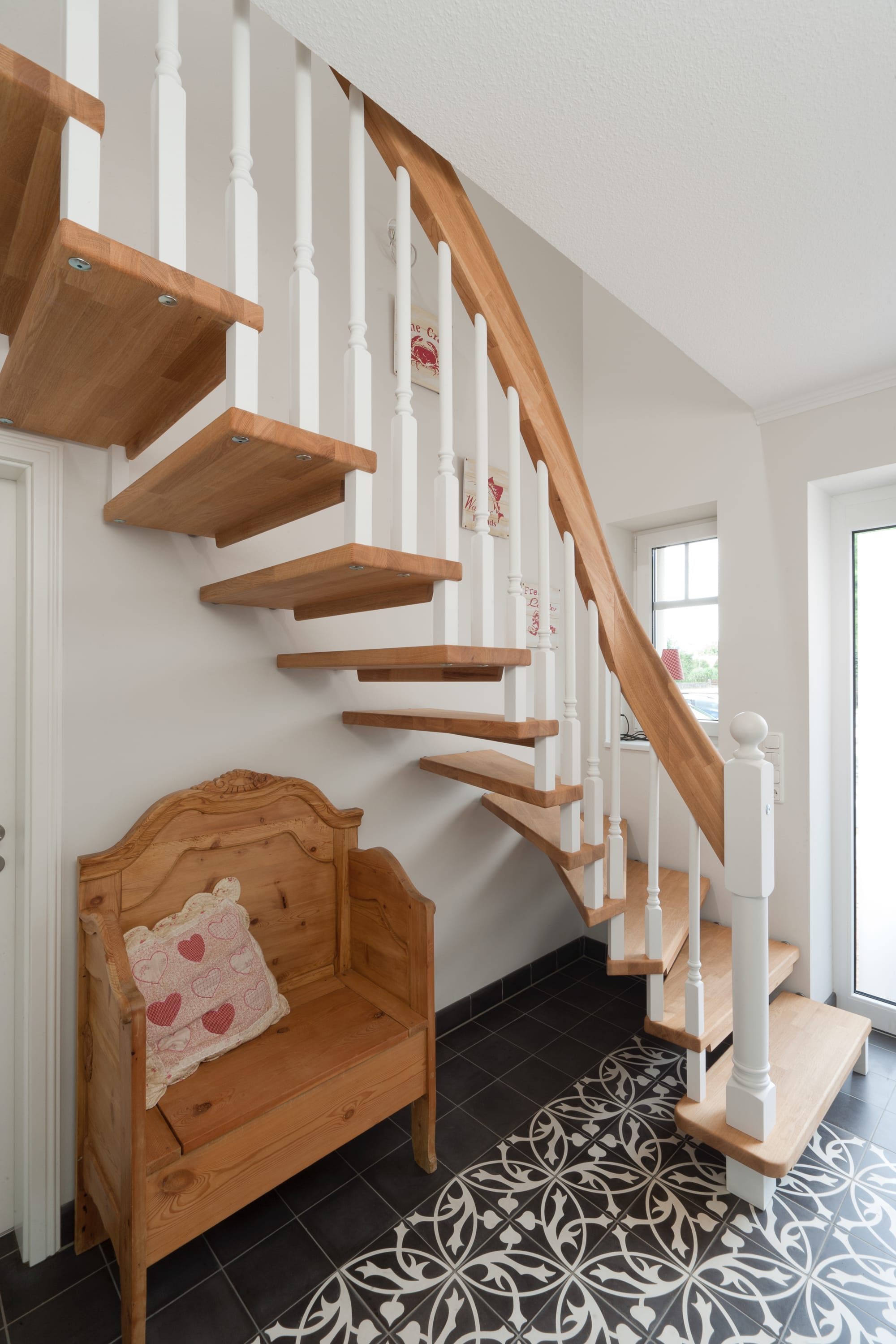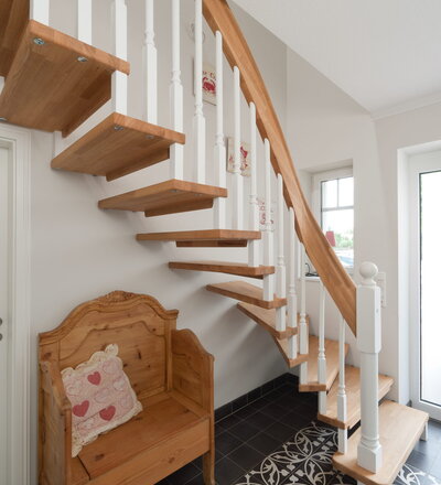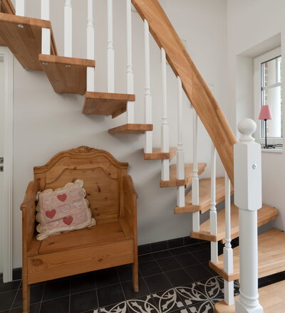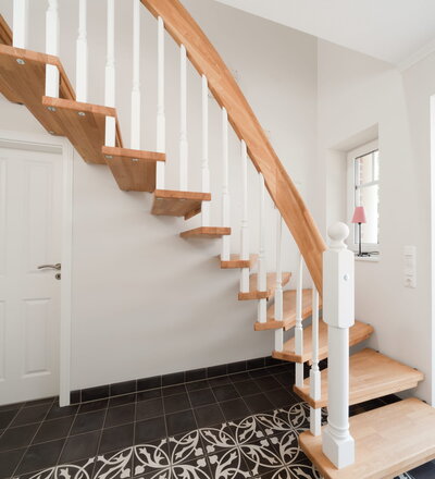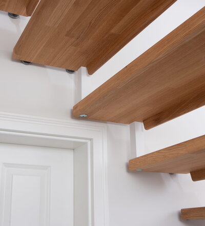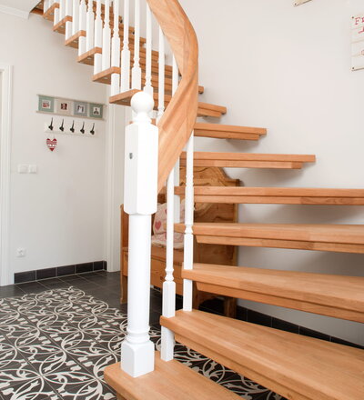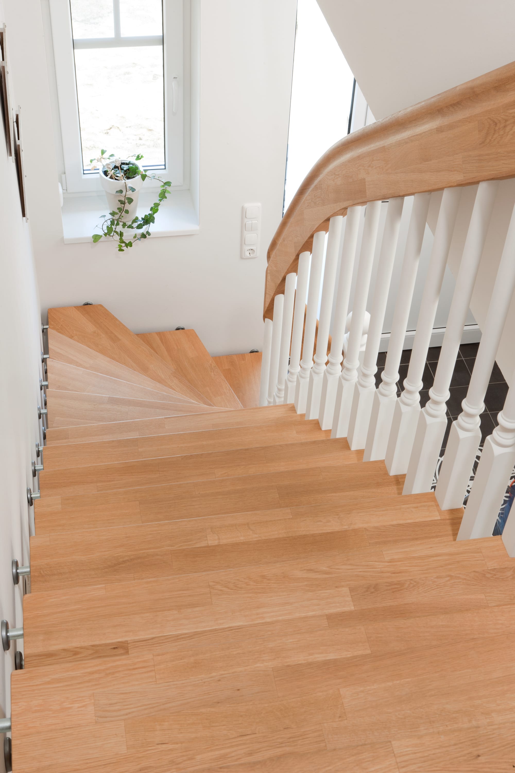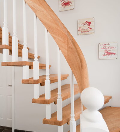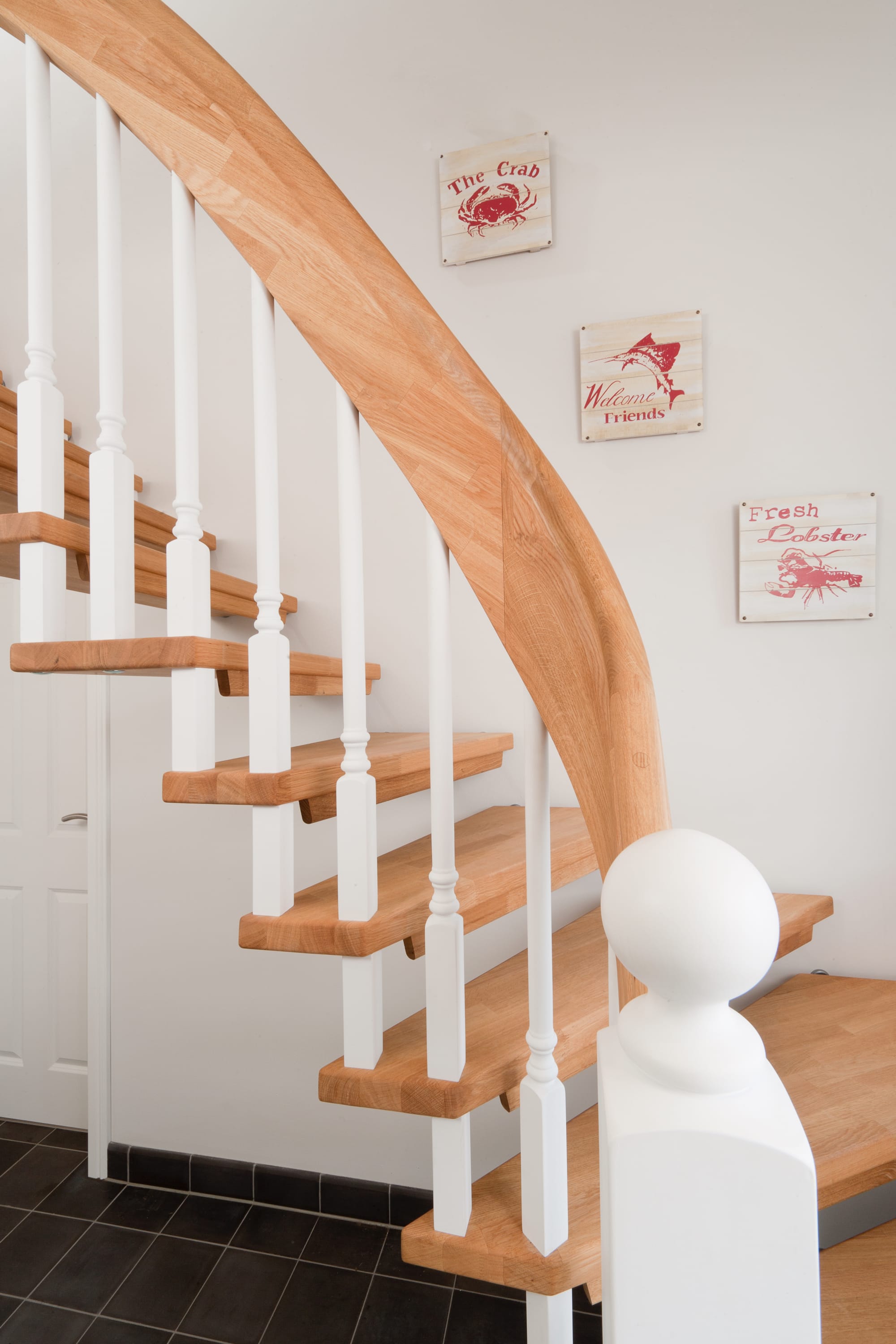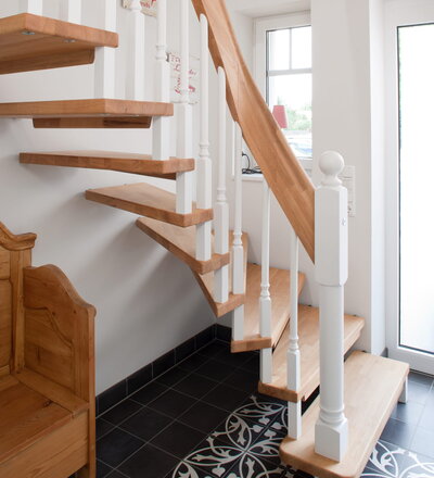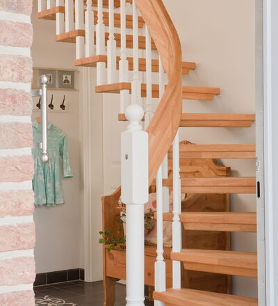 1/4 gewendelte freitragende Treppe mit profiliertem Handlauf; Holzart Kernbuche mosaik