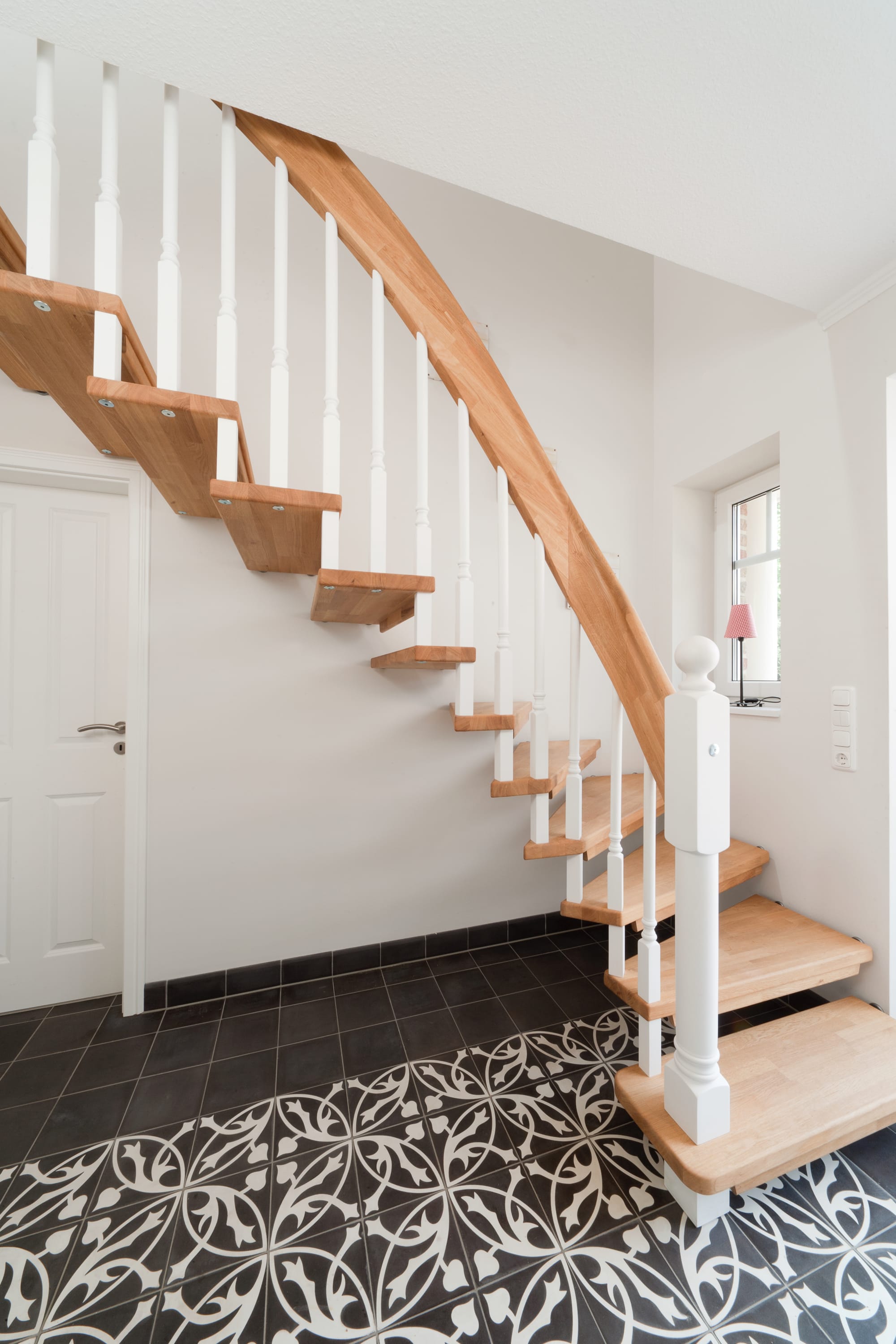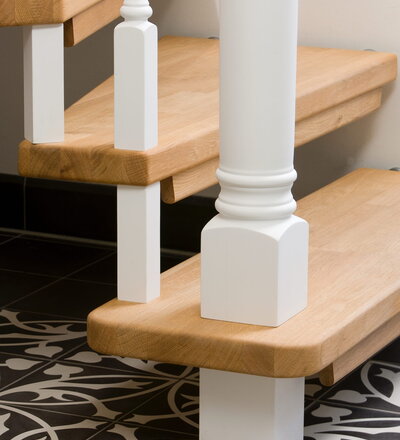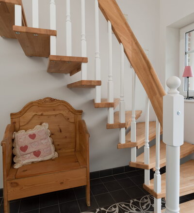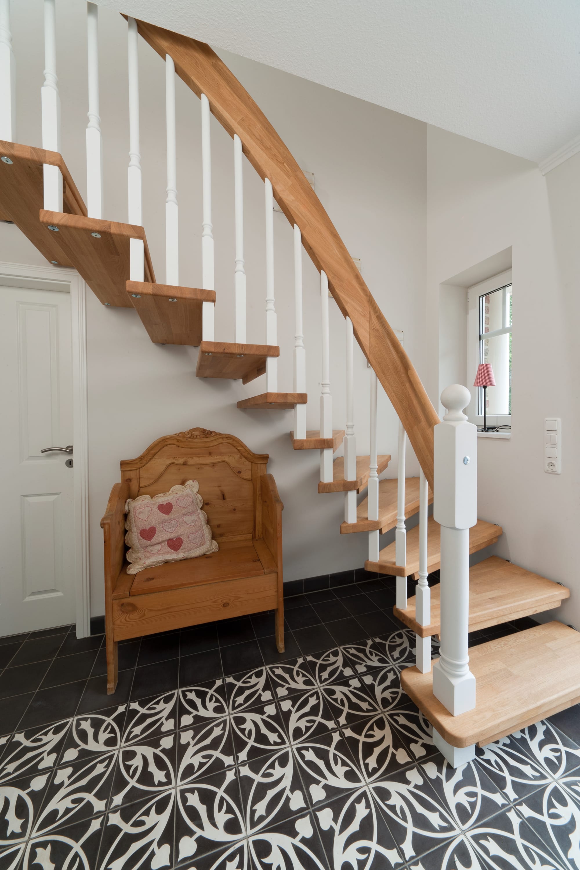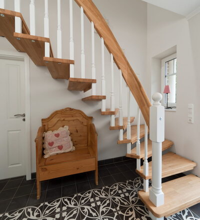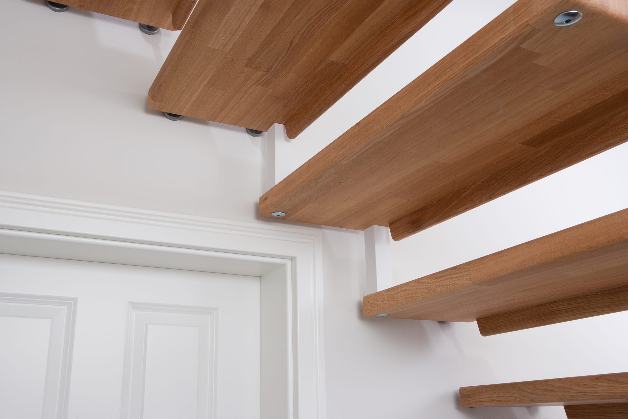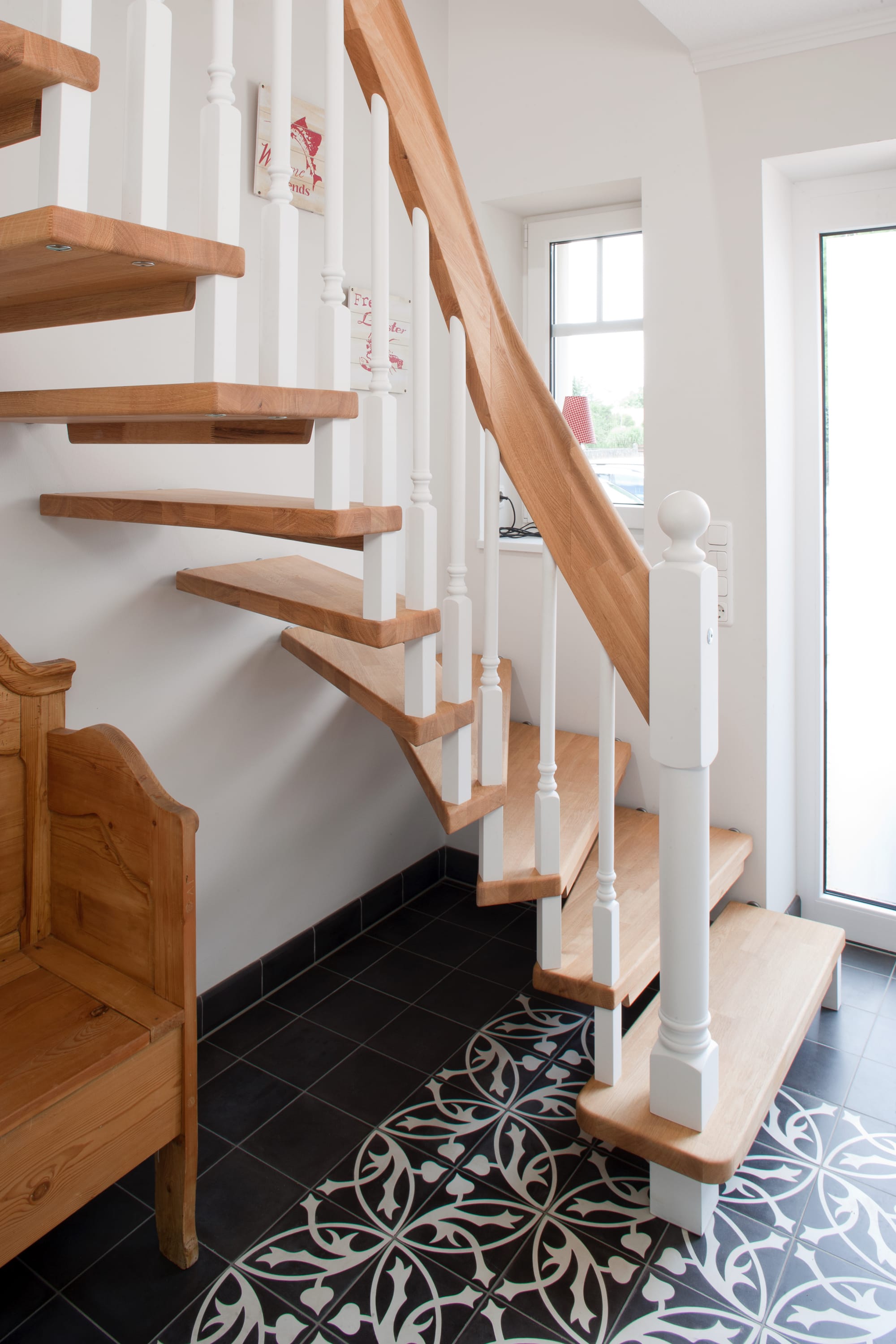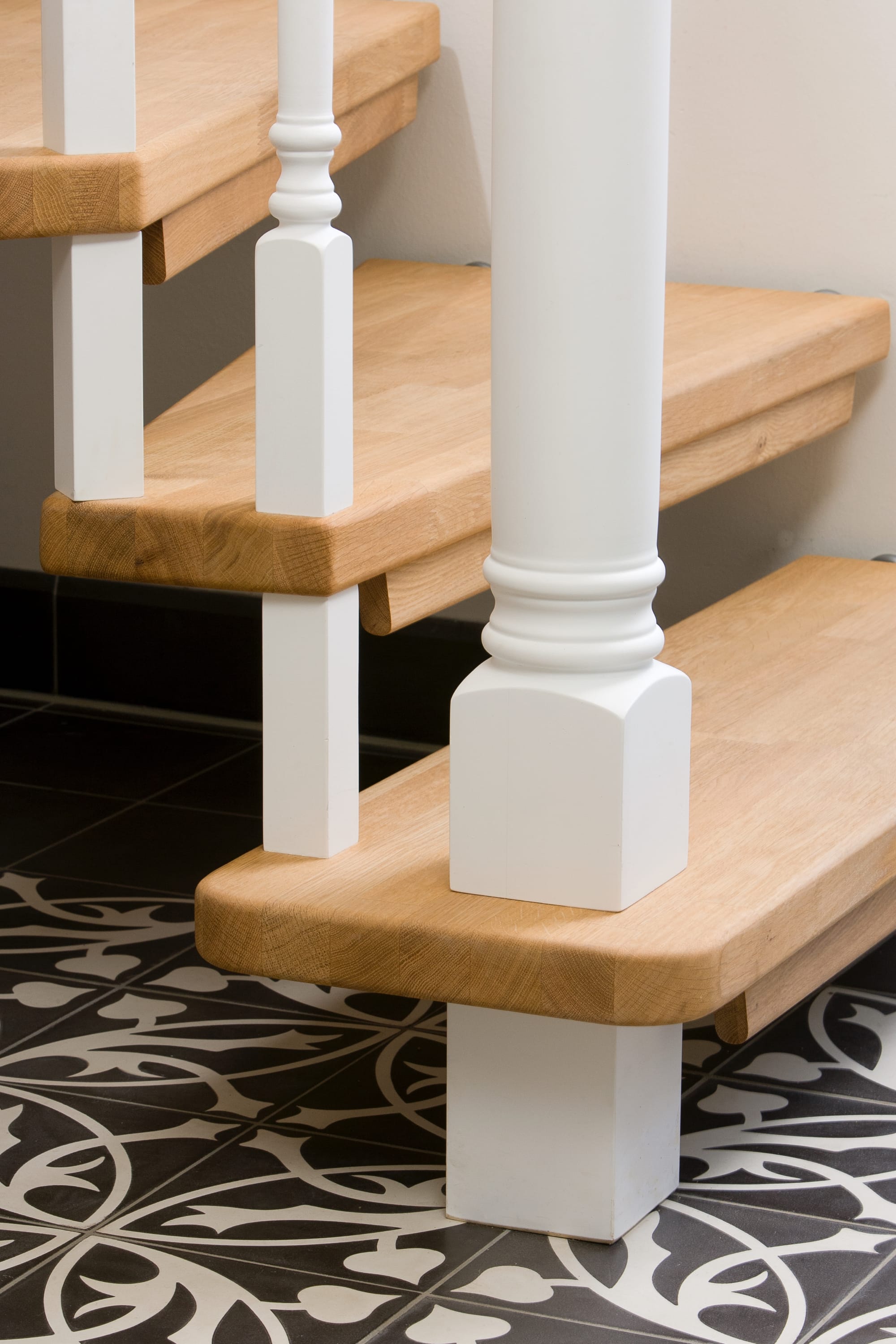 1/4 gewendelte freitragende Treppe mit profiliertem Handlauf; Holzart Kernbuche mosaik