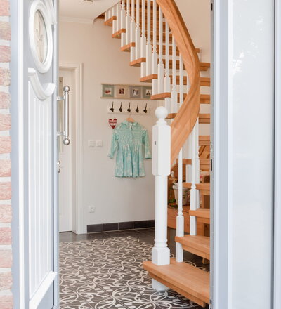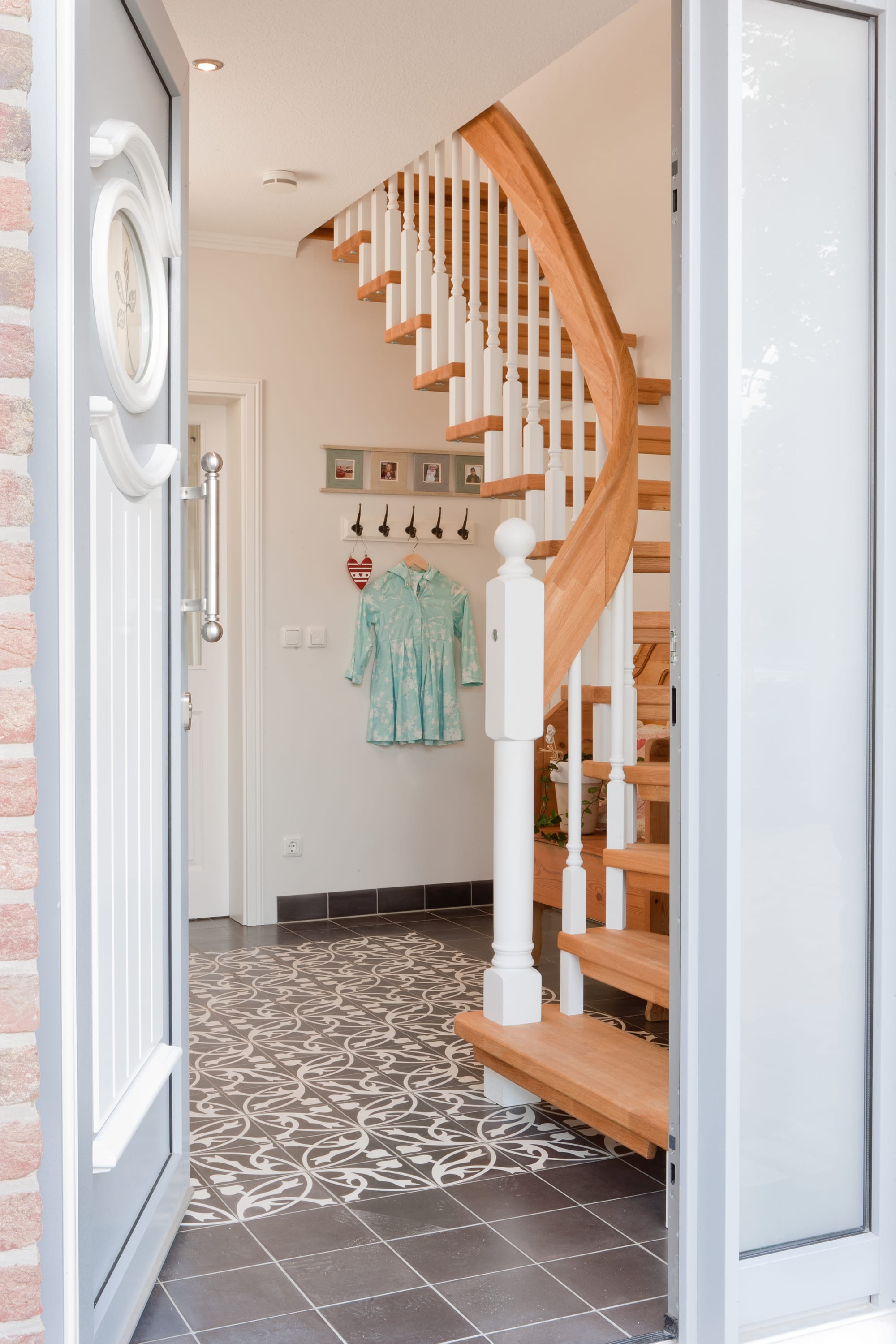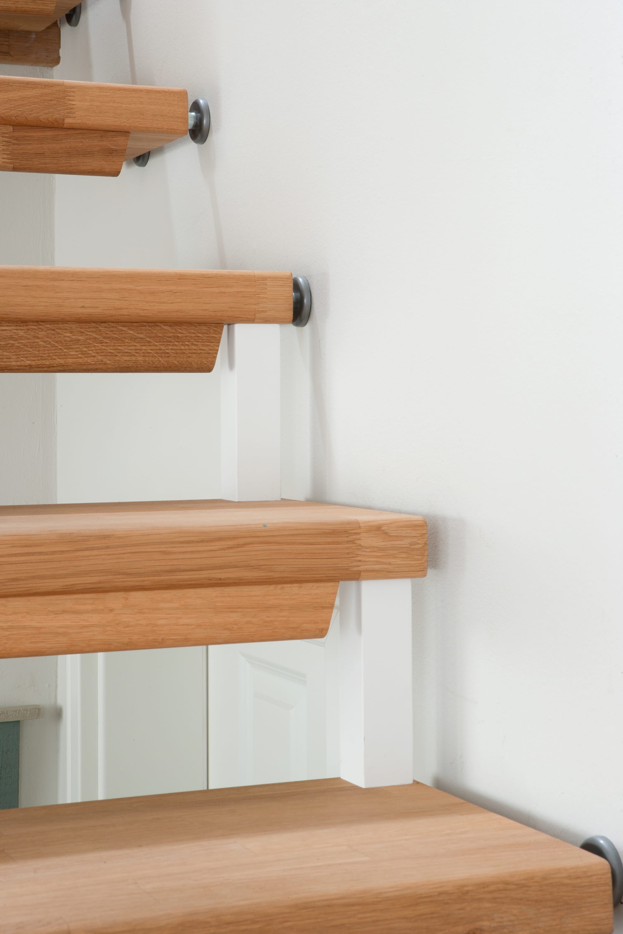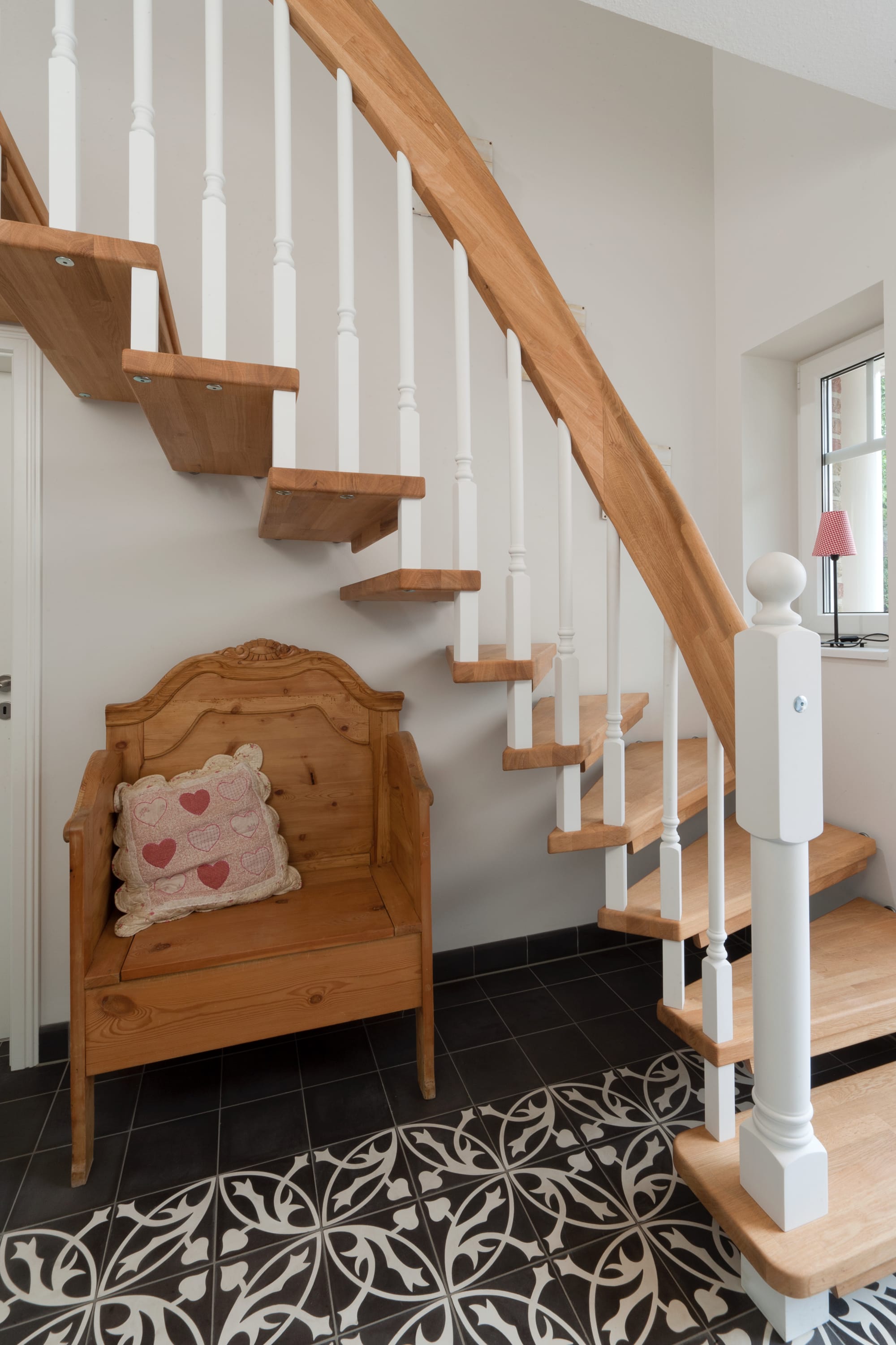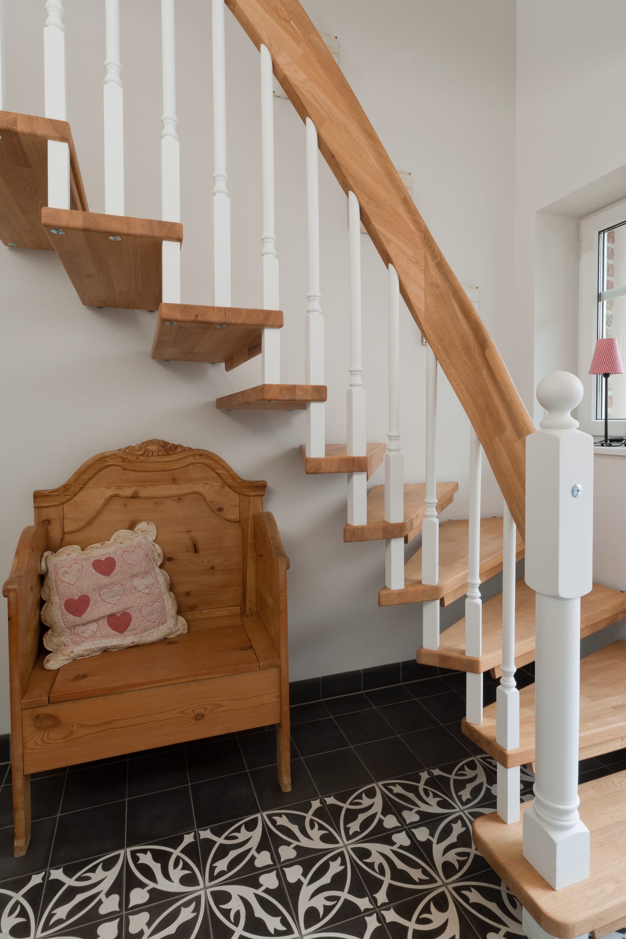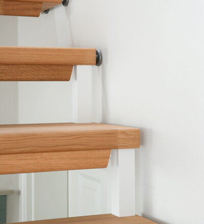 1/4 gewendelte freitragende Treppe mit profiliertem Handlauf; Holzart Kernbuche mosaik