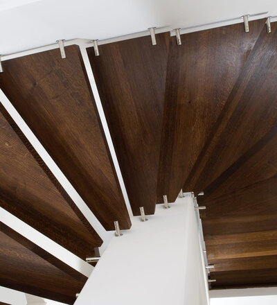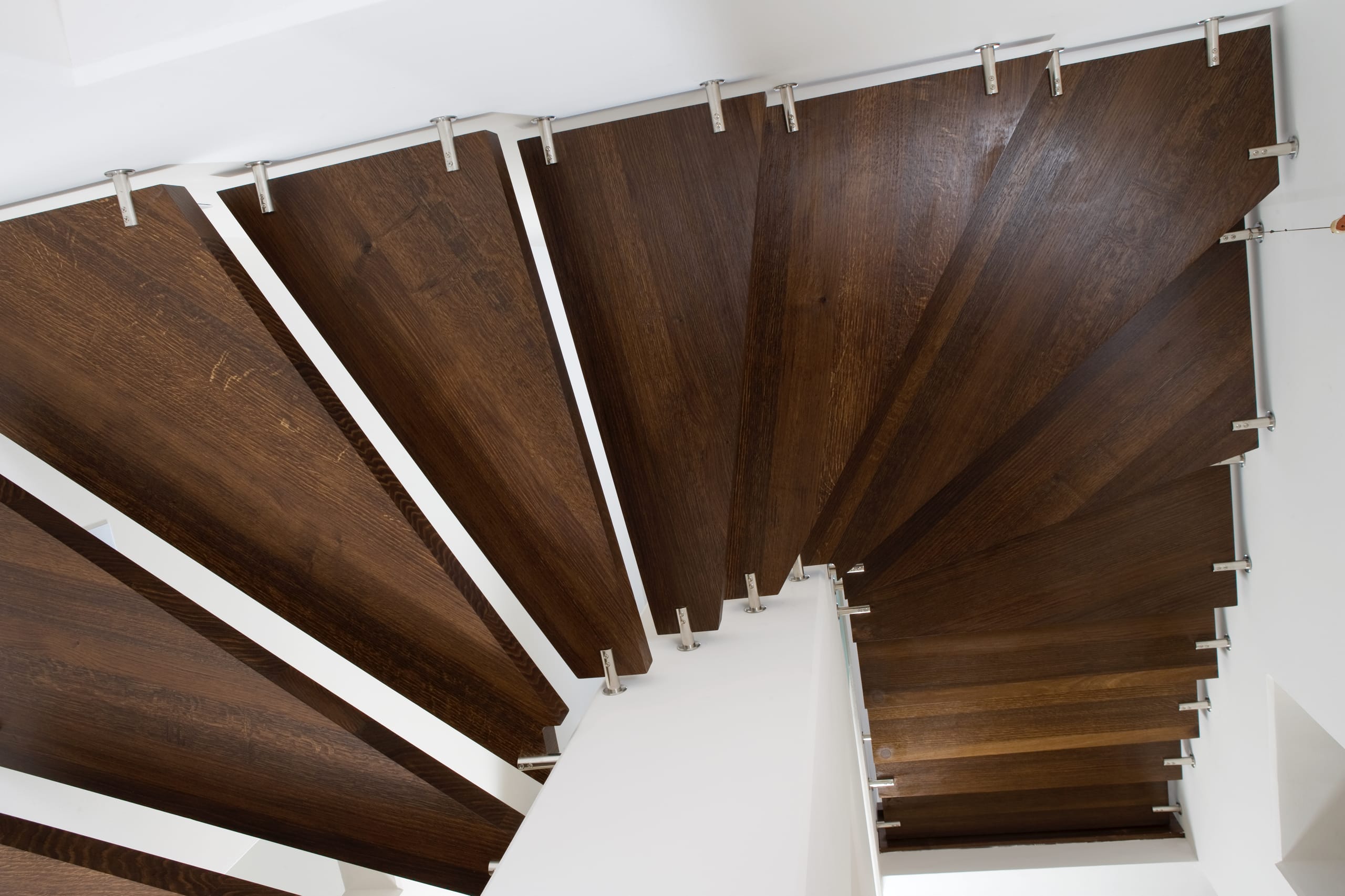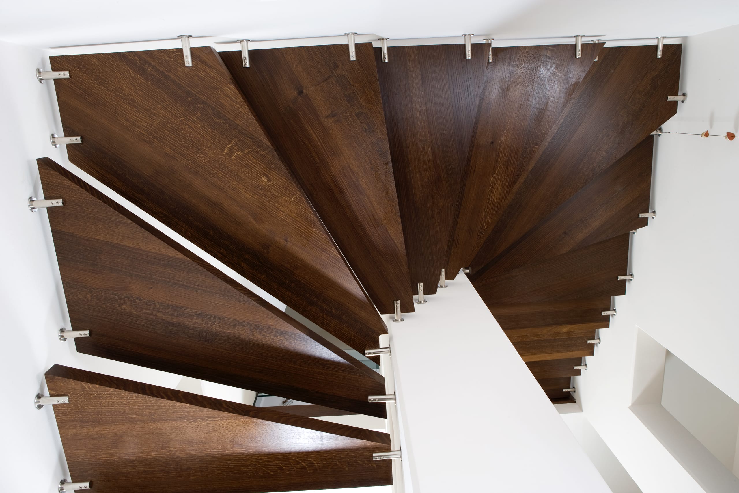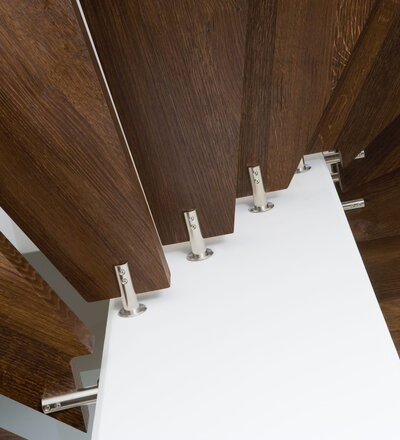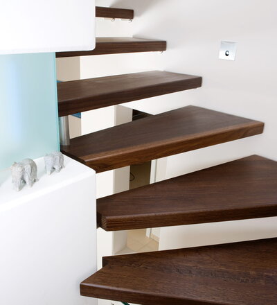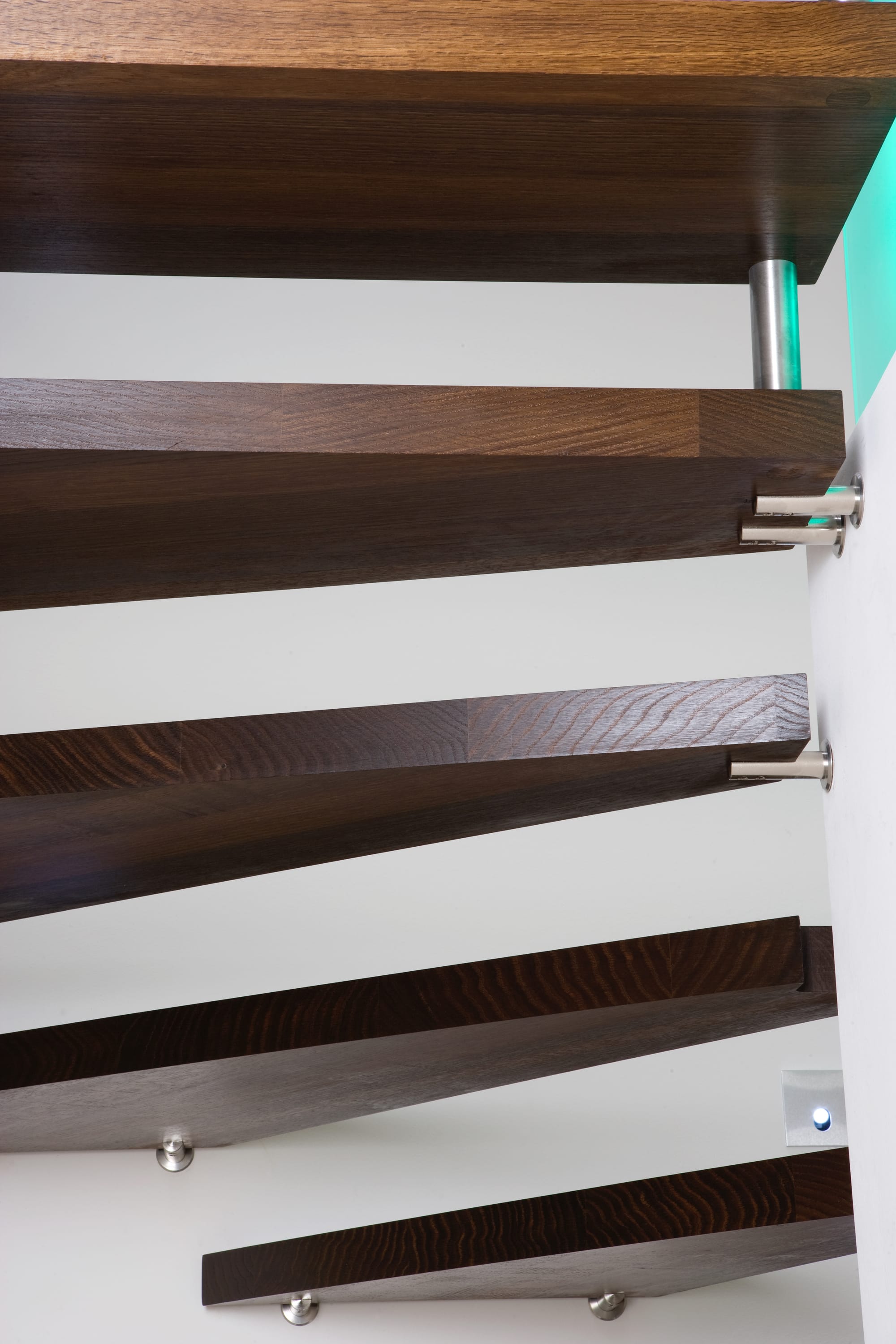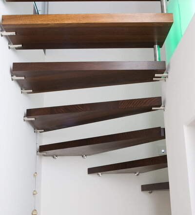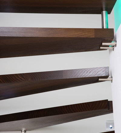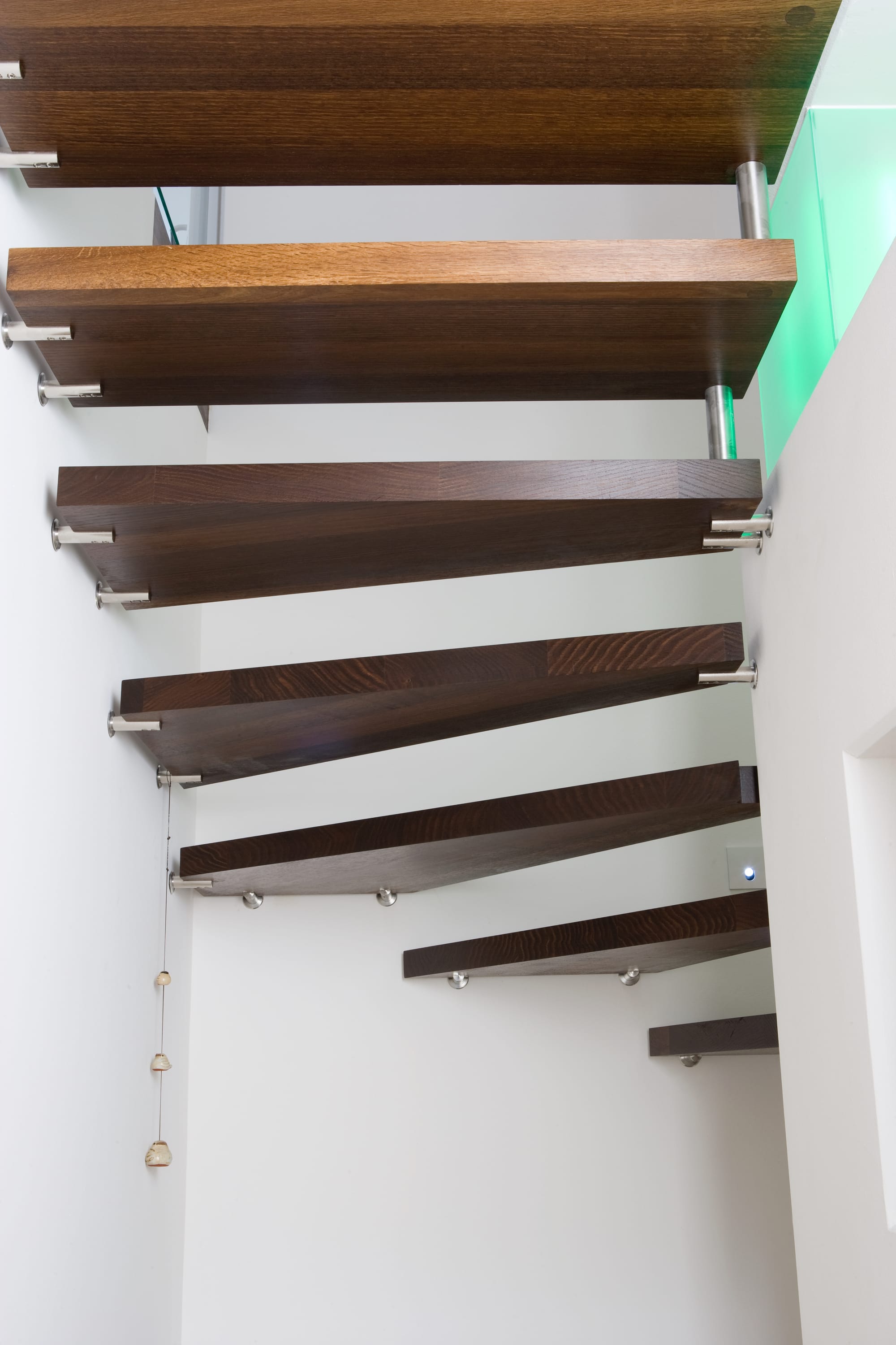 Trittstufen auf speziellen gummigelagerten Edelstahlbeschlägen, beidseitig in Massivwänden befestigt; Holzart Eiche geräuchert