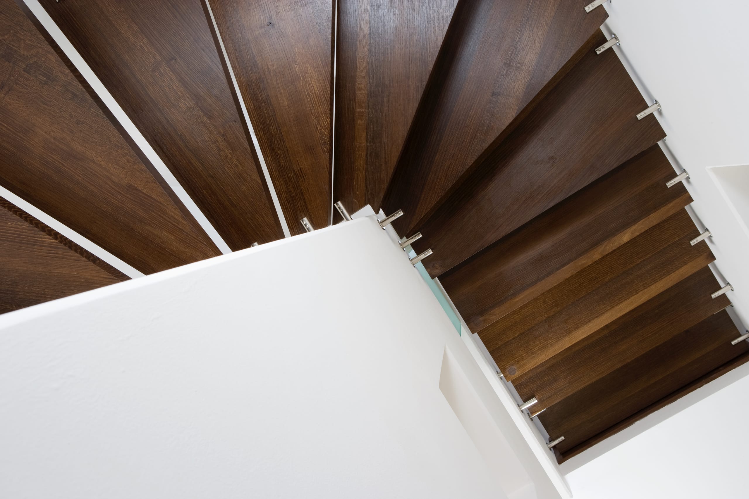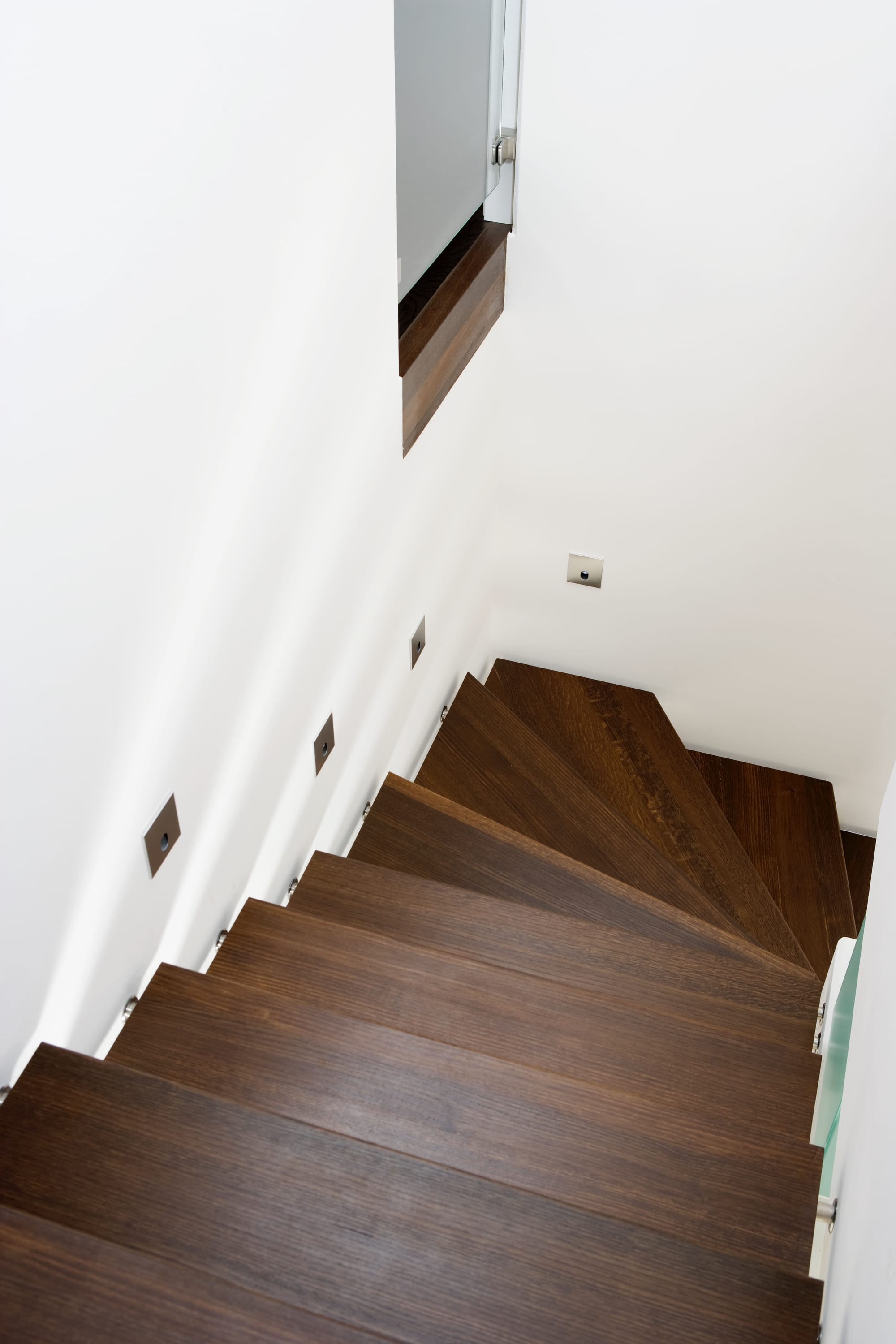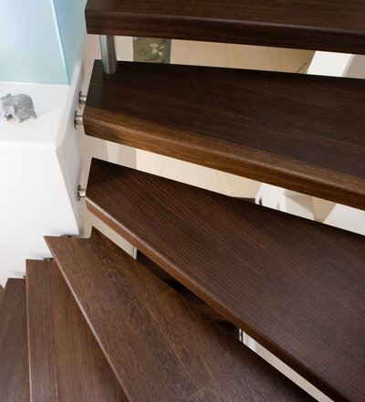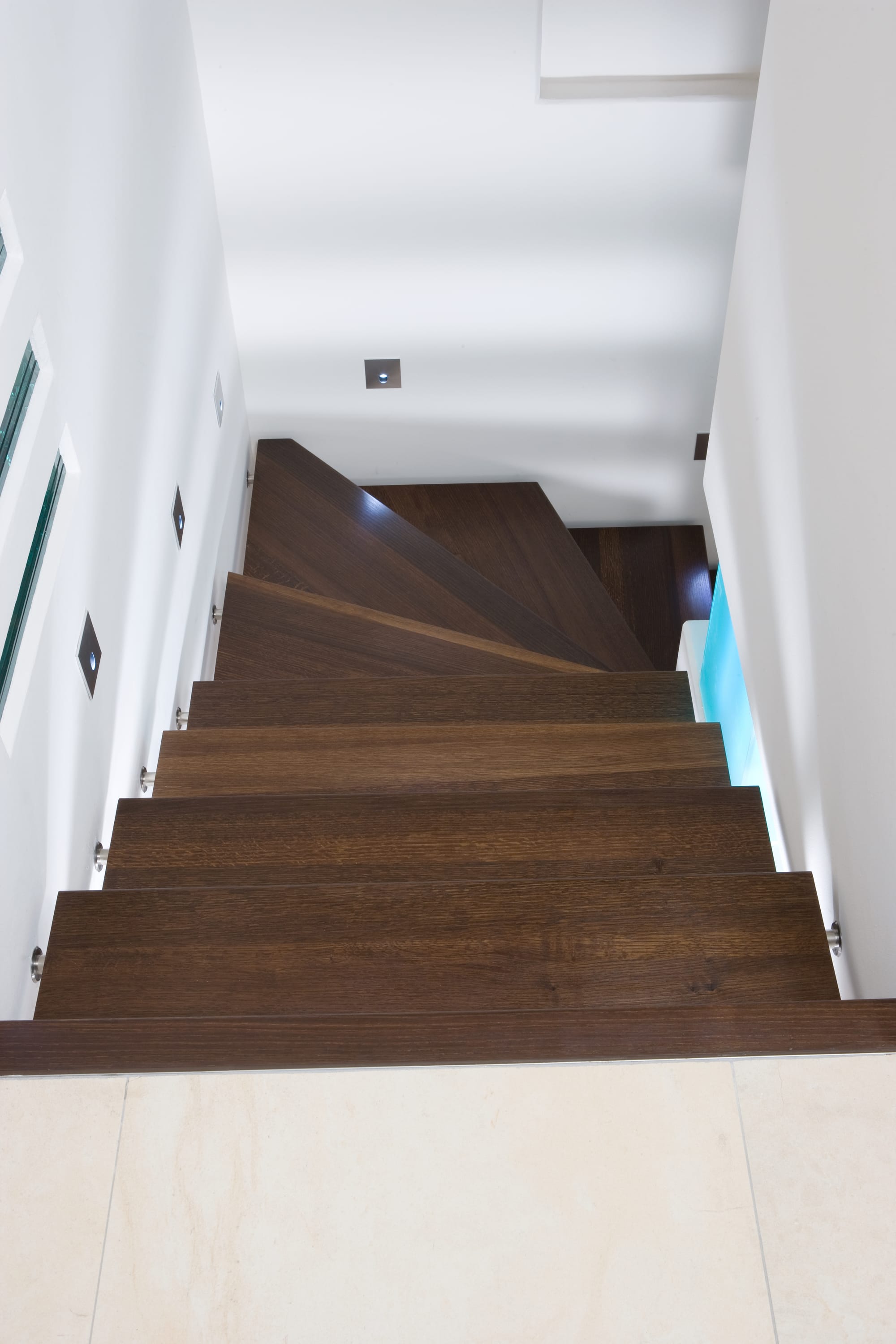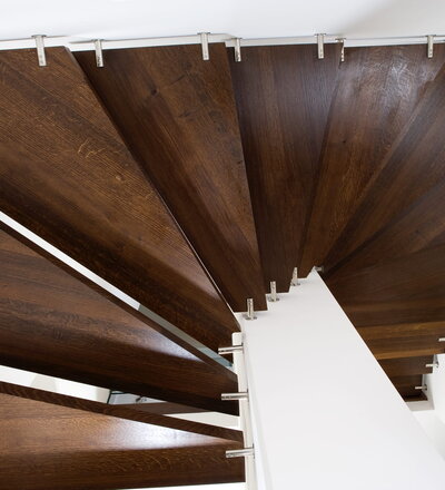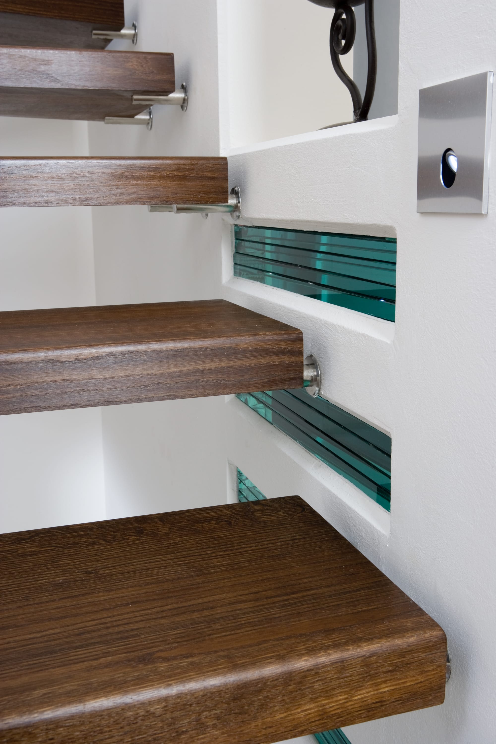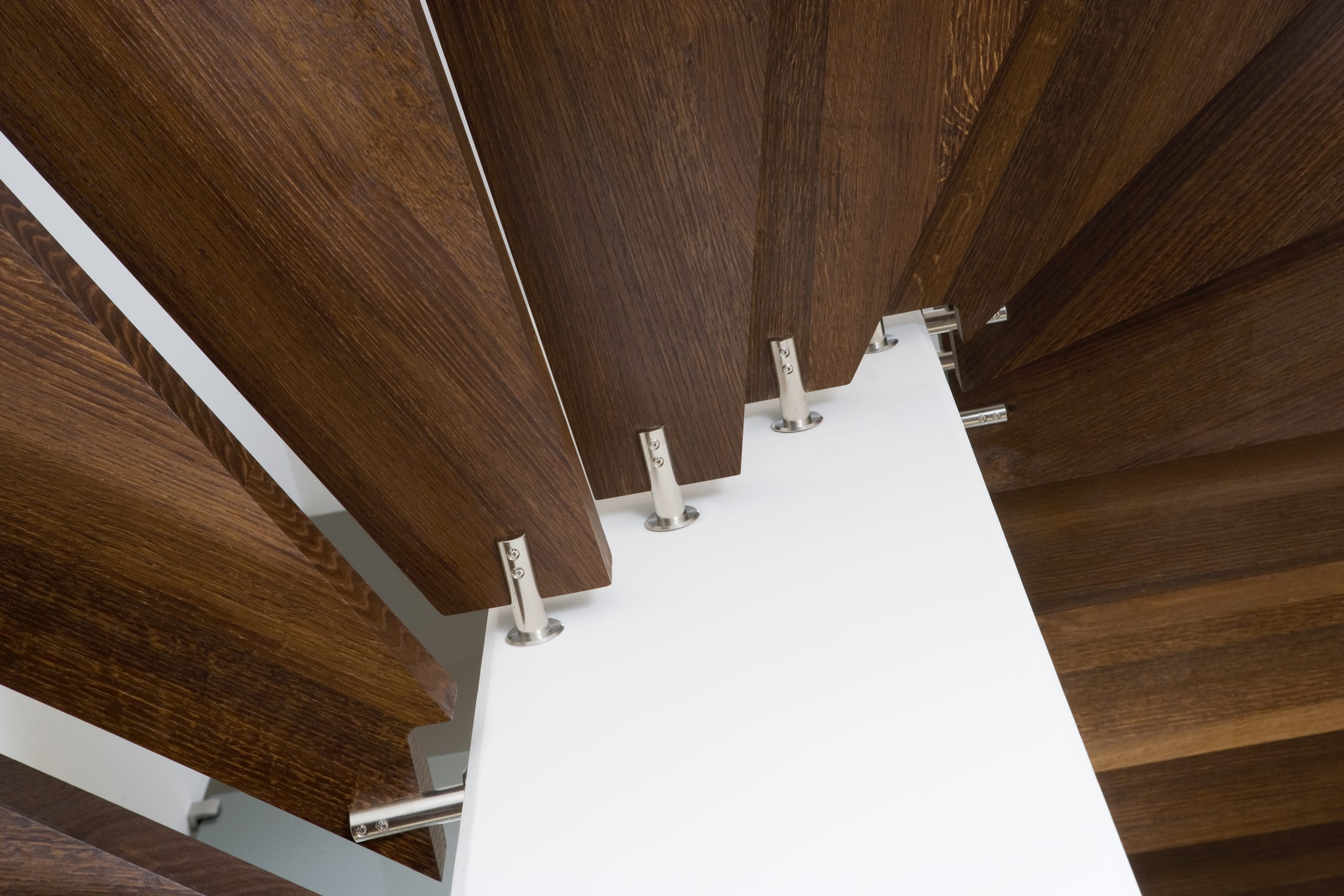 Trittstufen auf speziellen gummigelagerten Edelstahlbeschlägen, beidseitig in Massivwänden befestigt; Holzart Eiche geräuchert
