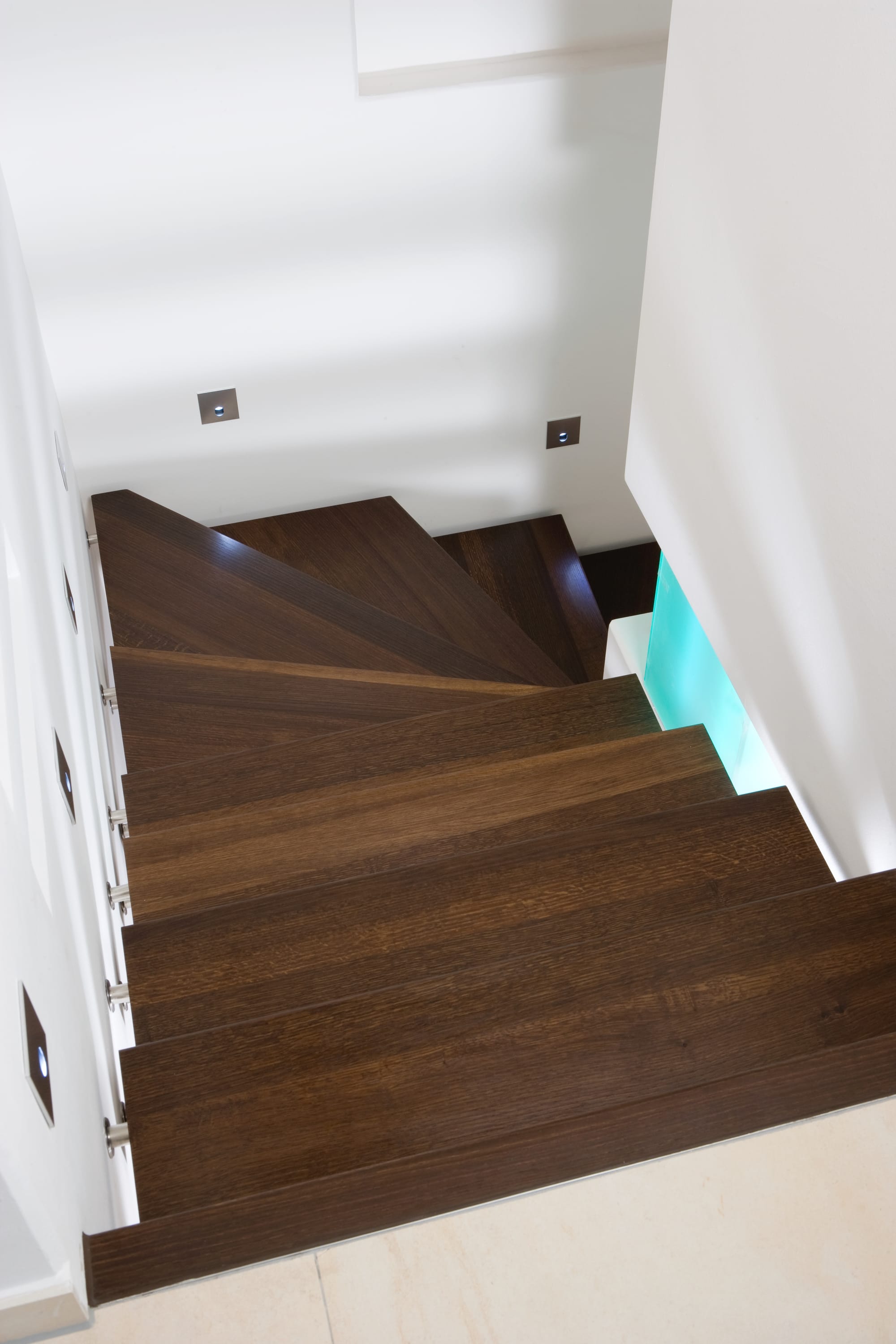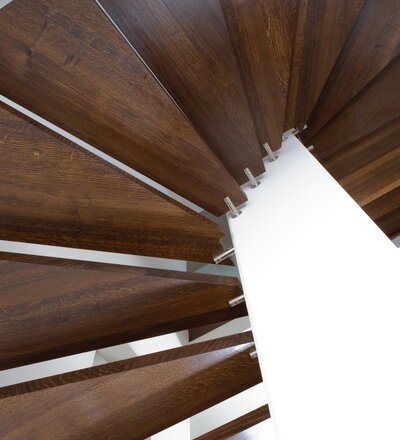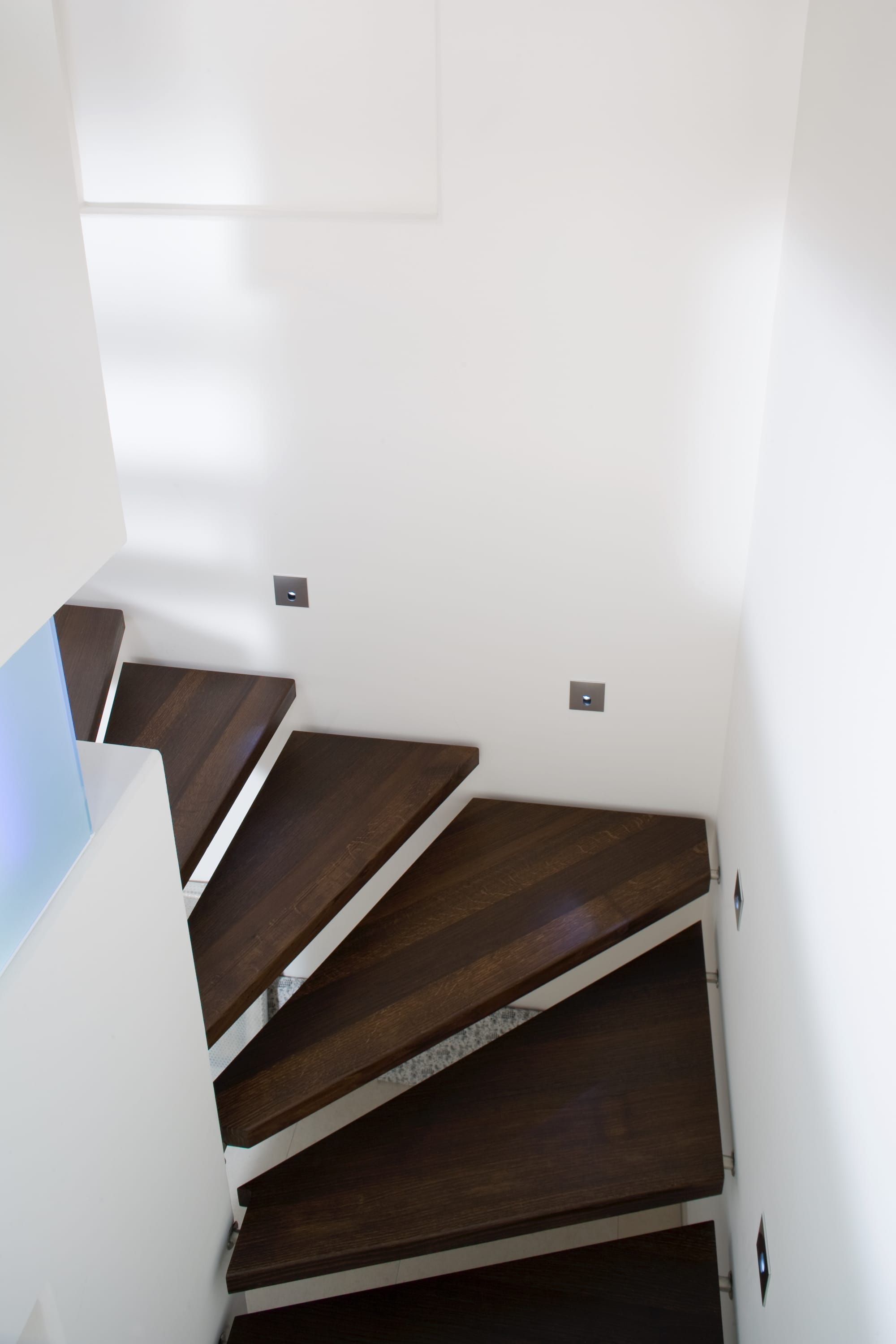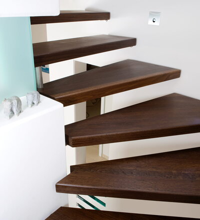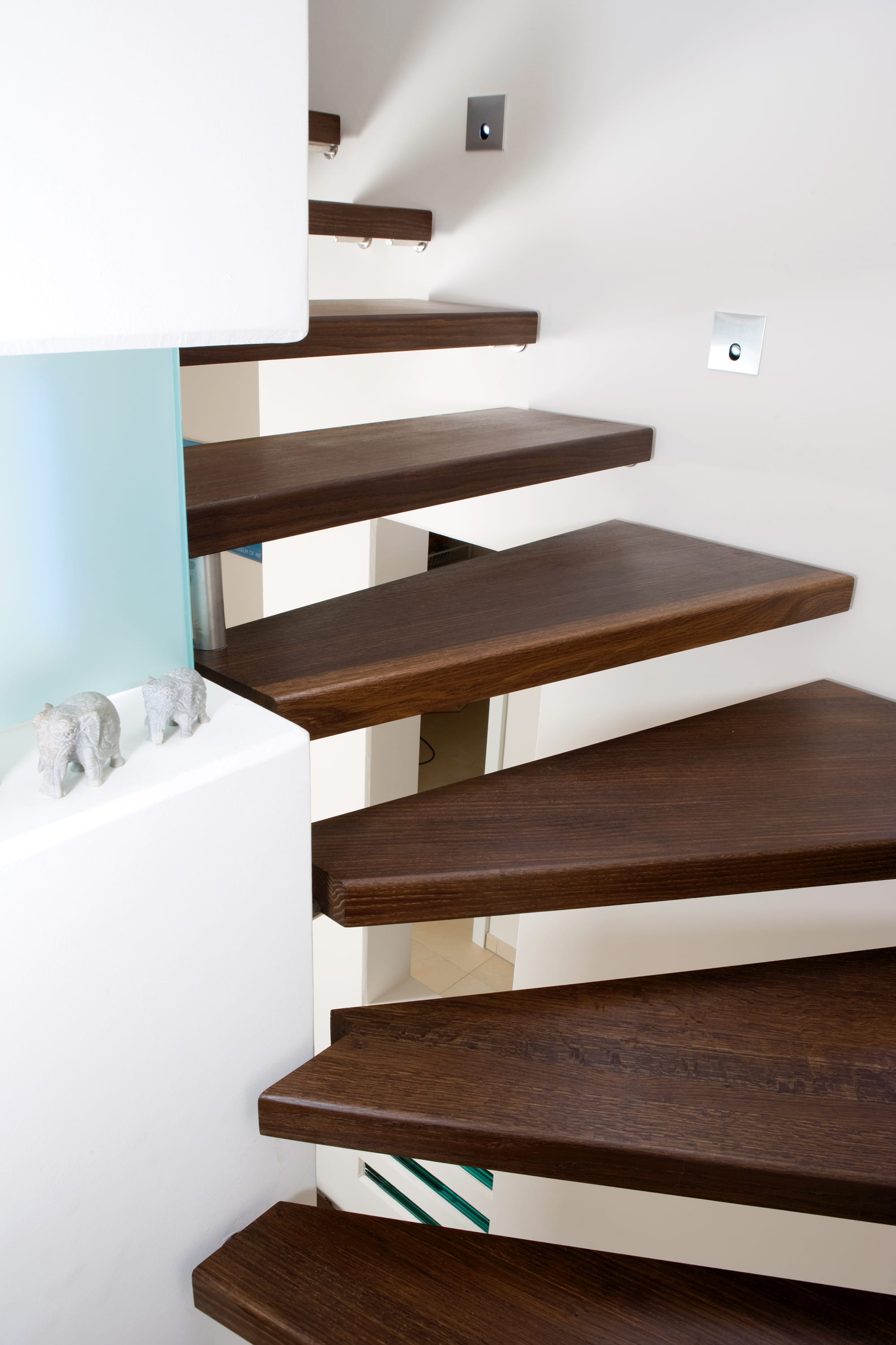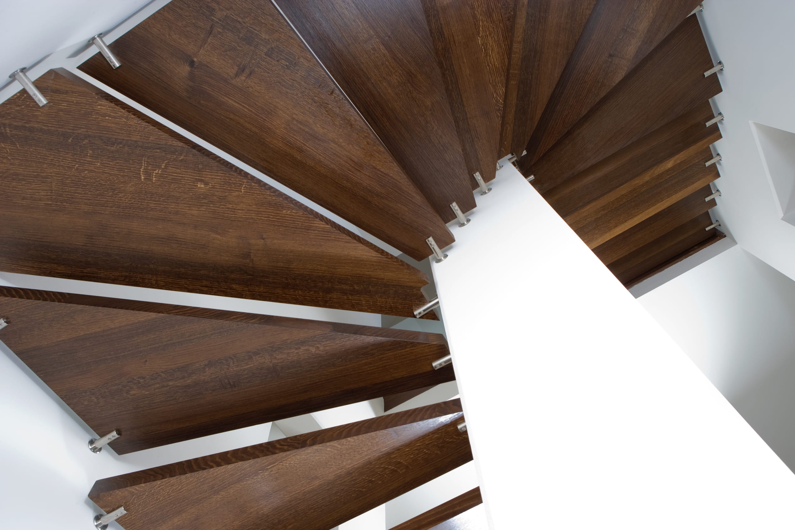 Trittstufen auf speziellen gummigelagerten Edelstahlbeschlägen, beidseitig in Massivwänden befestigt; Holzart Eiche geräuchert
