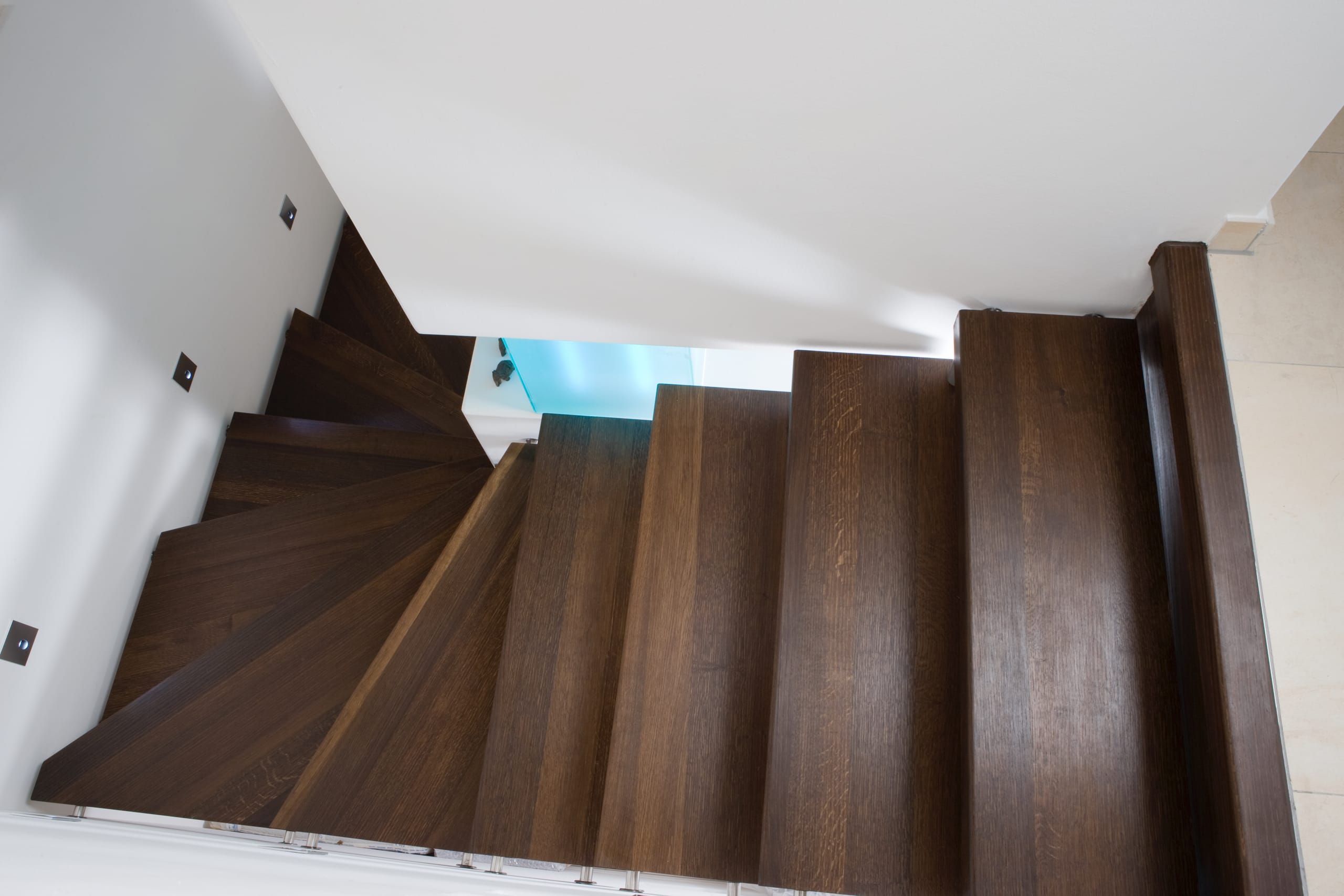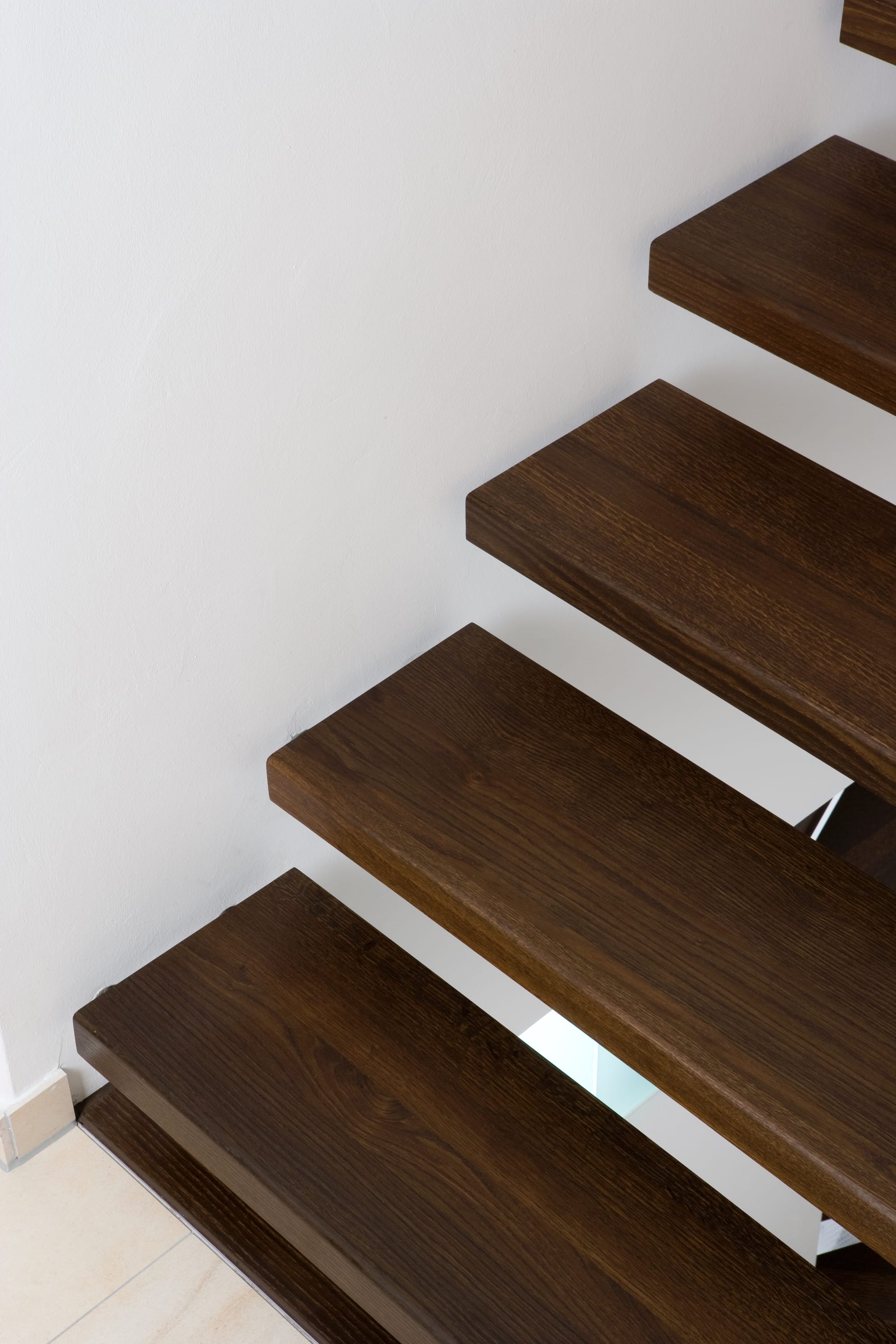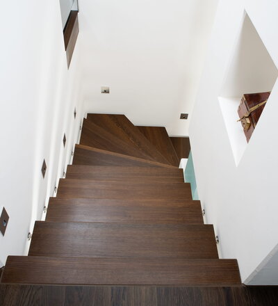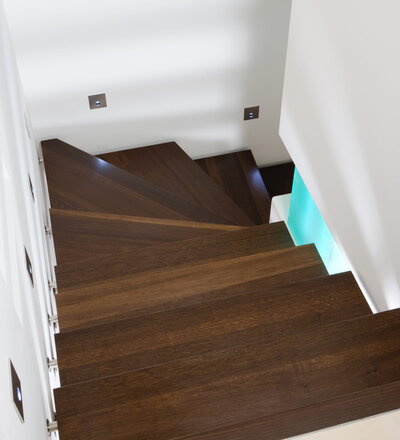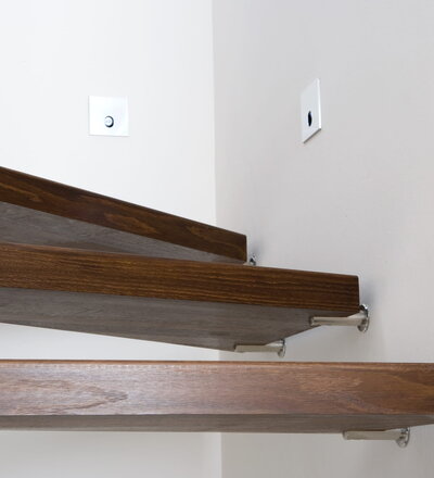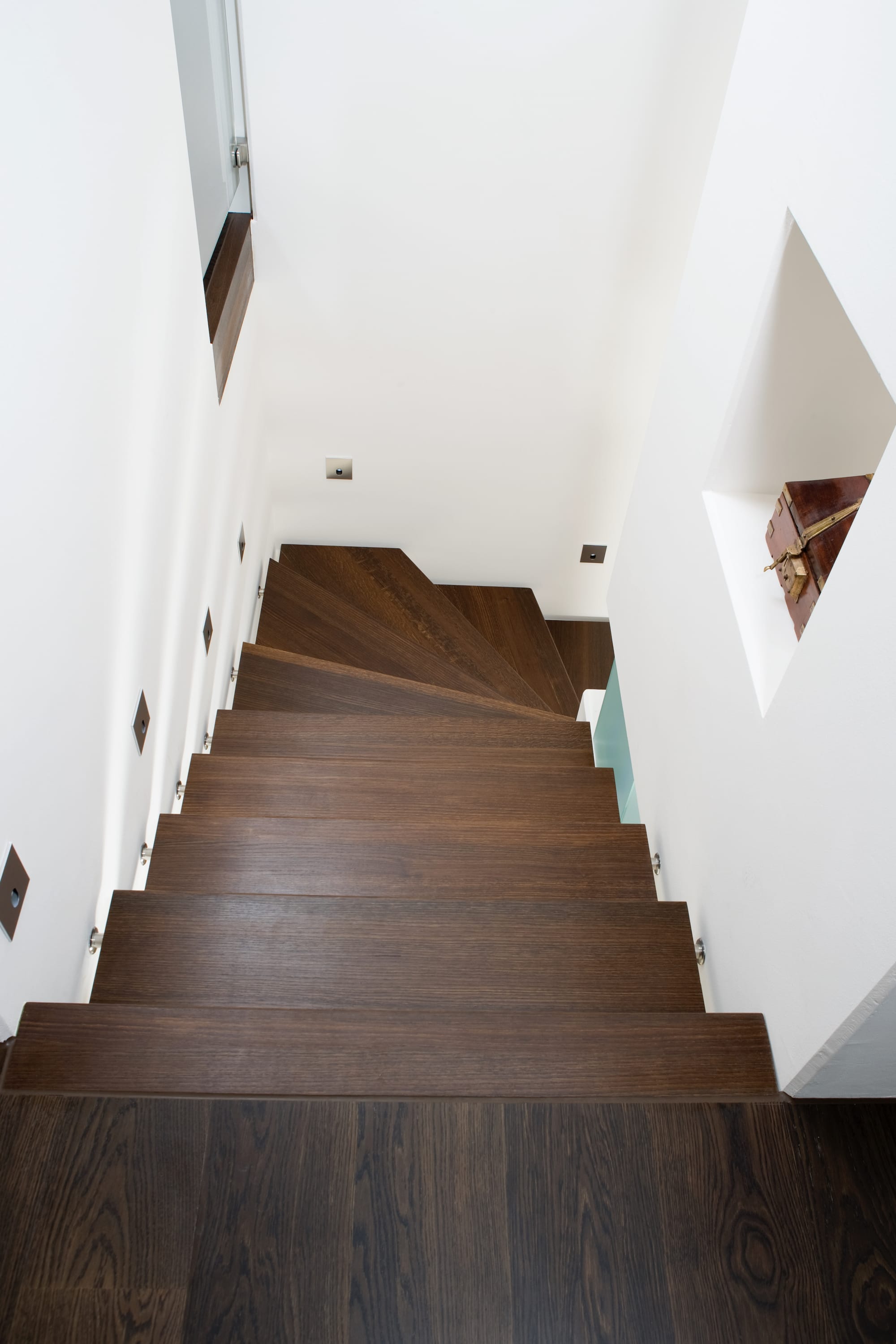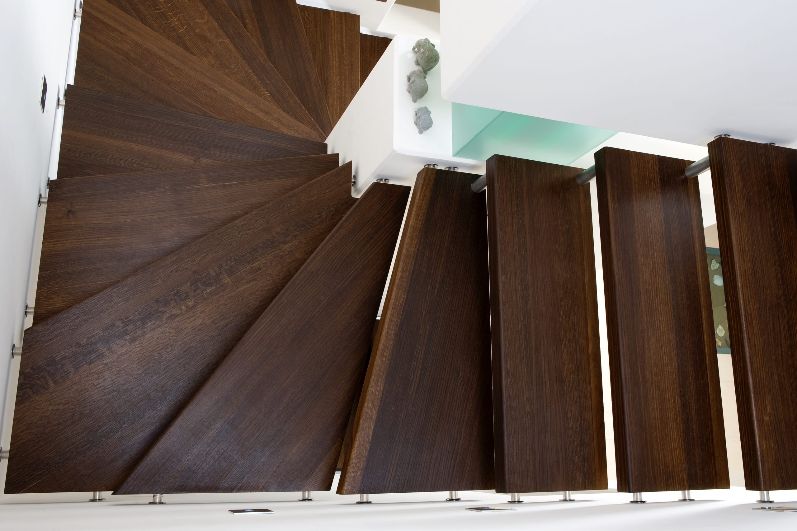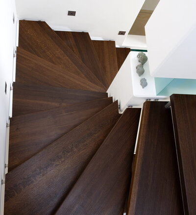 Trittstufen auf speziellen gummigelagerten Edelstahlbeschlägen, beidseitig in Massivwänden befestigt; Holzart Eiche geräuchert