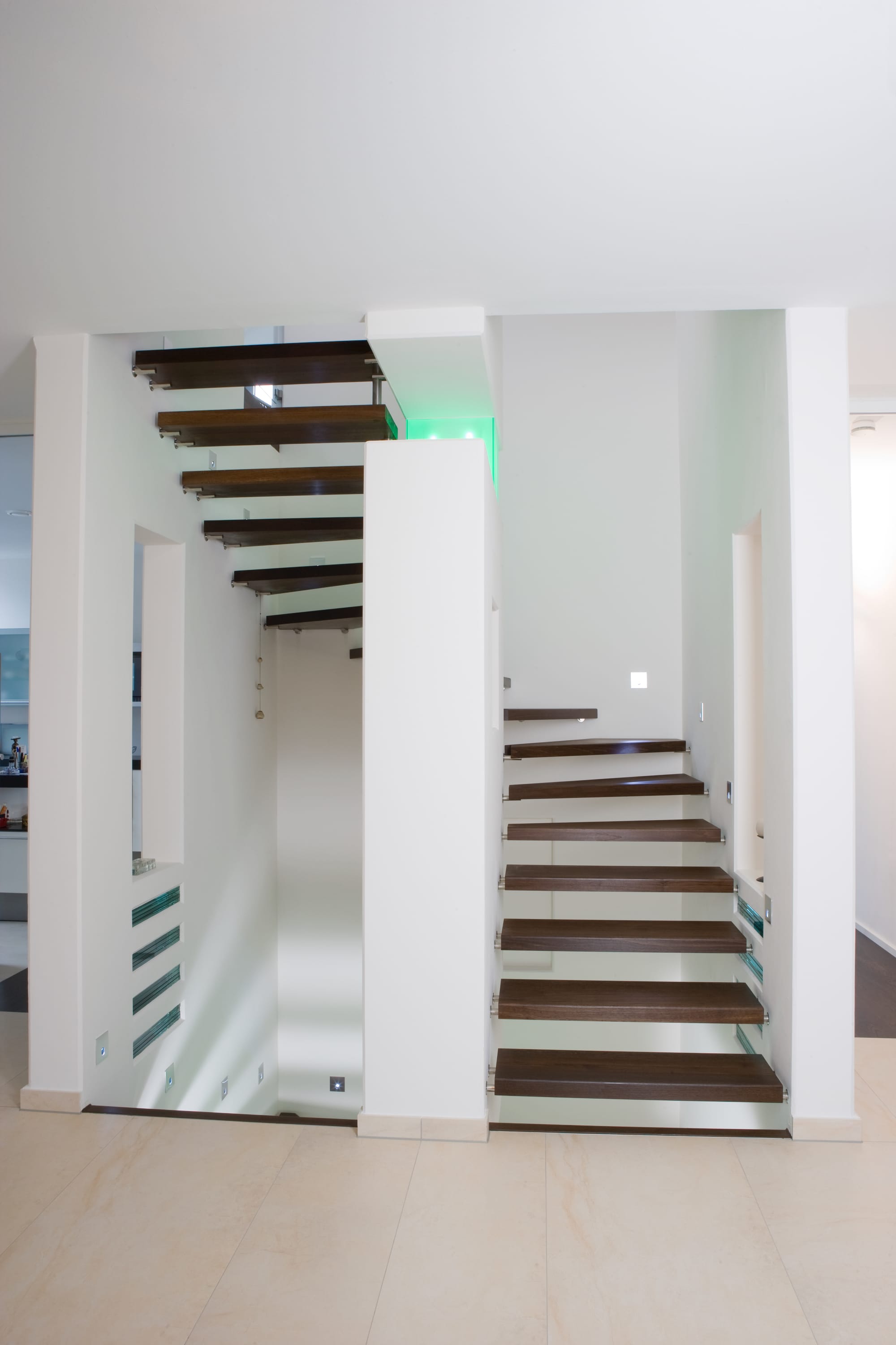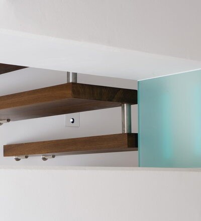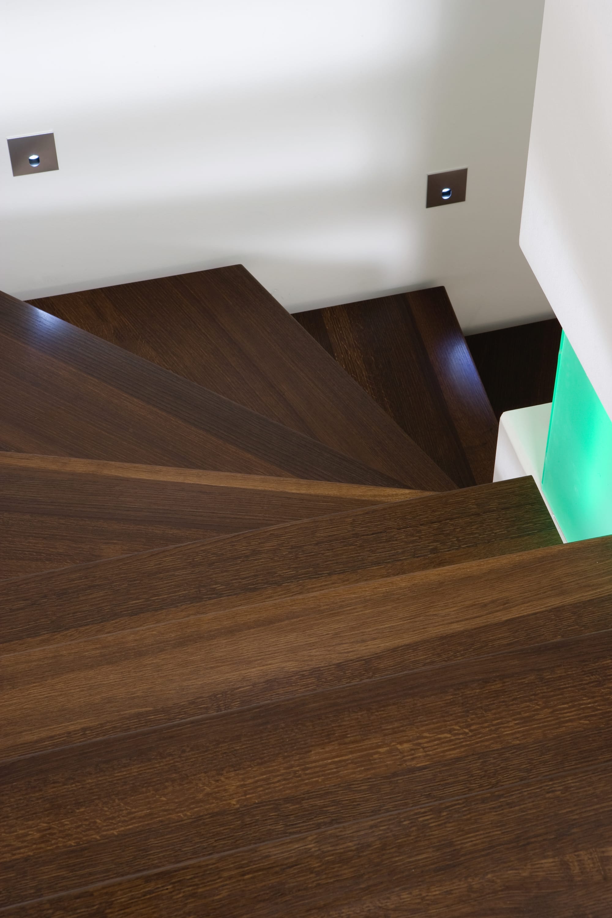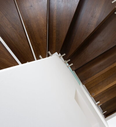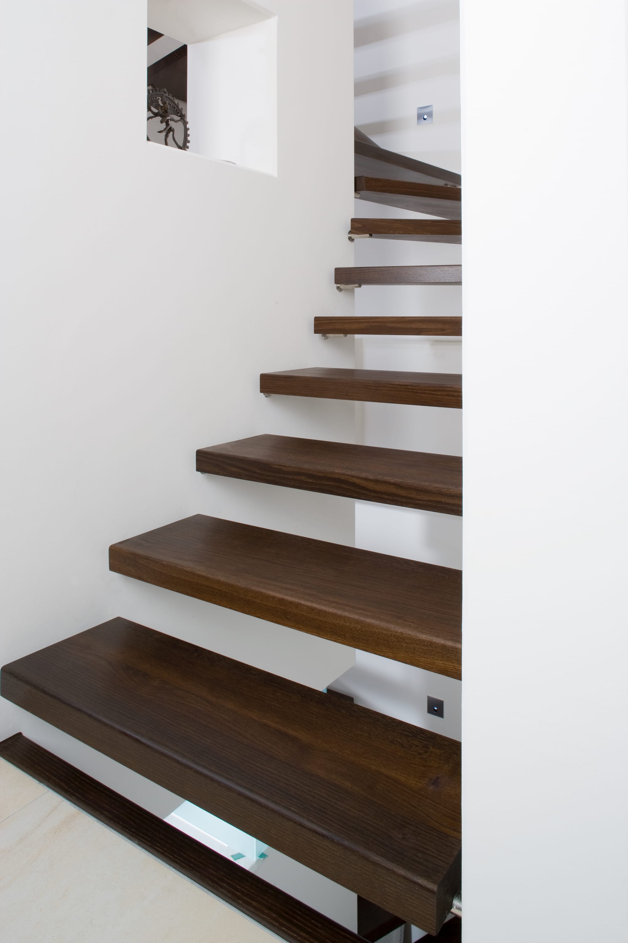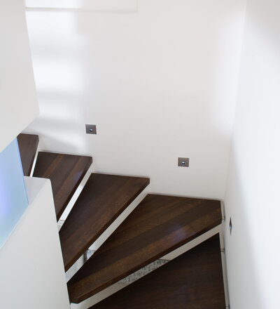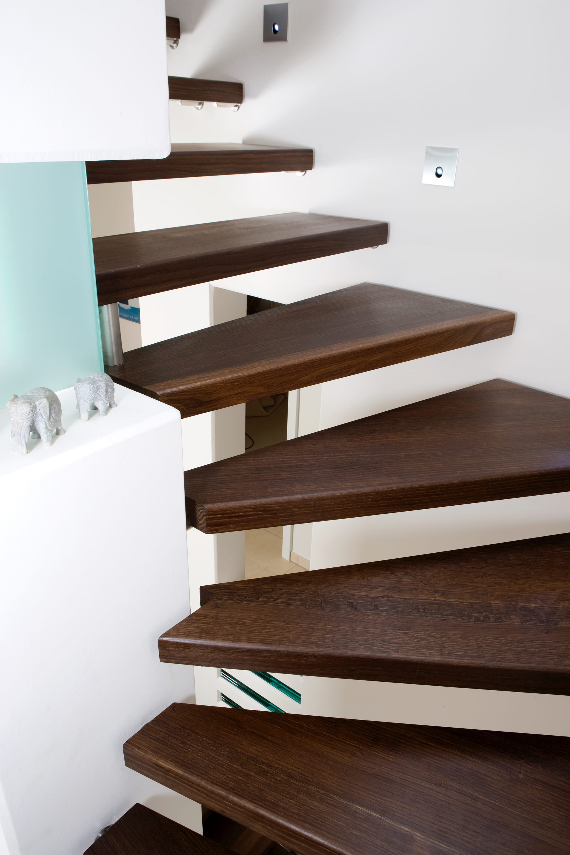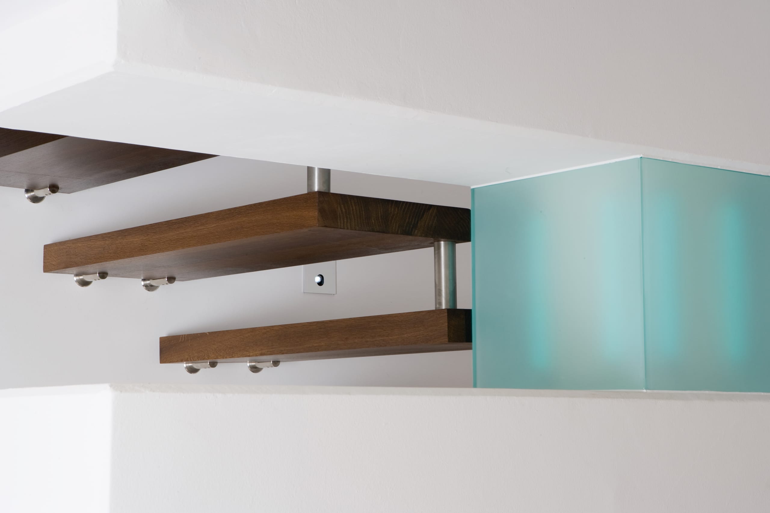 Trittstufen auf speziellen gummigelagerten Edelstahlbeschlägen, beidseitig in Massivwänden befestigt; Holzart Eiche geräuchert