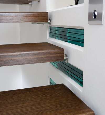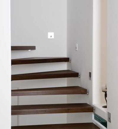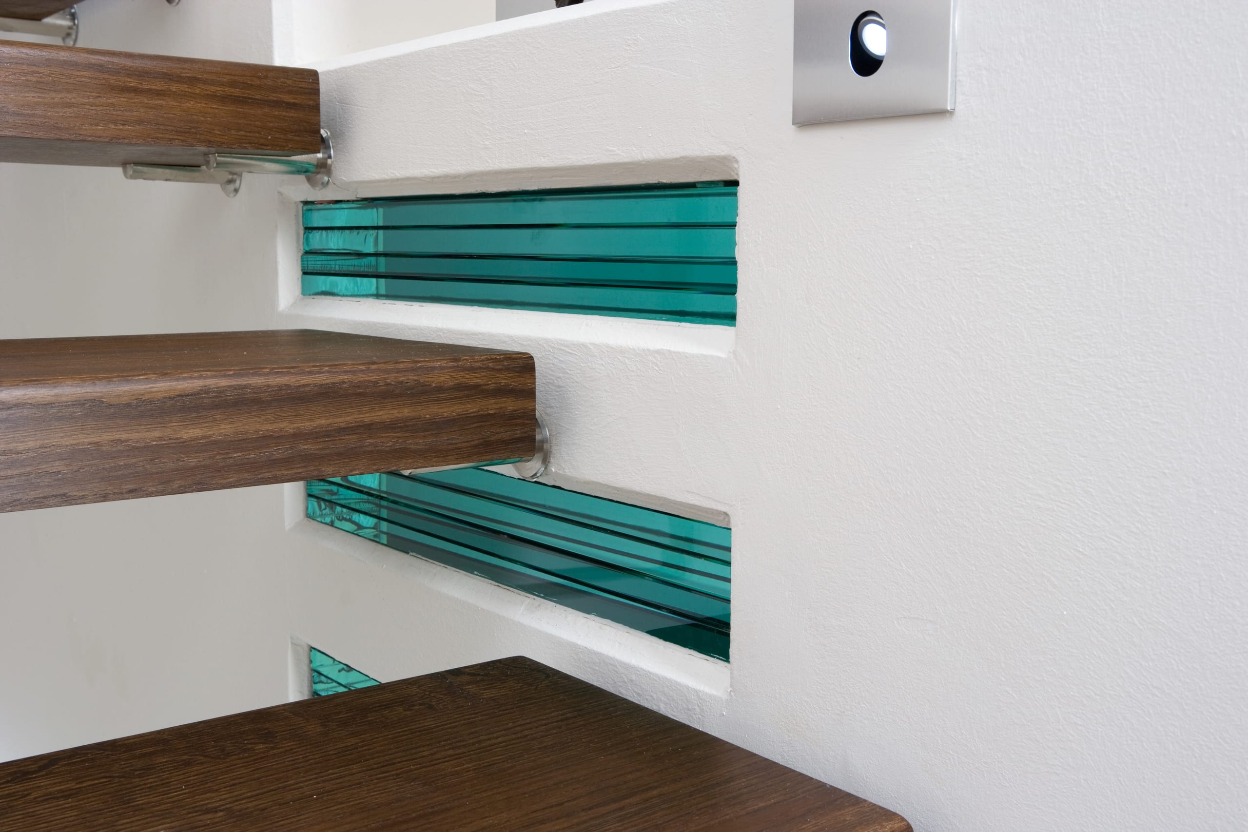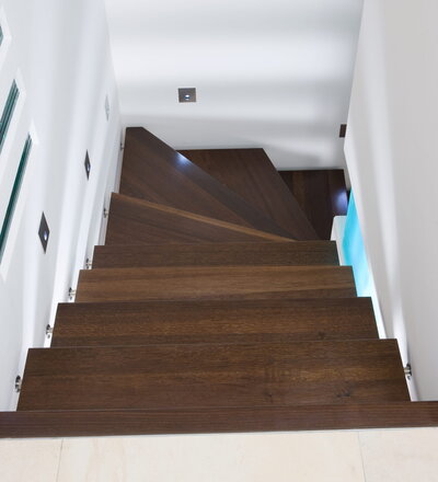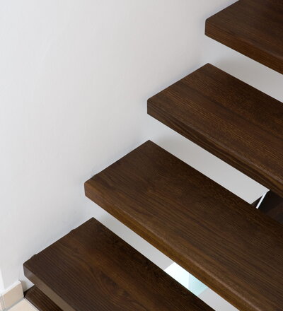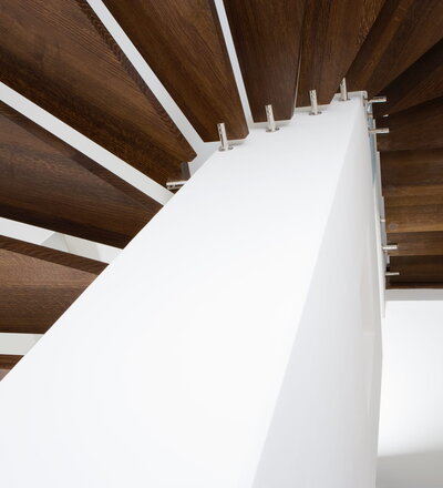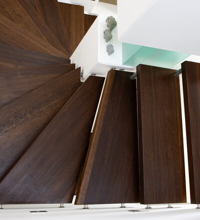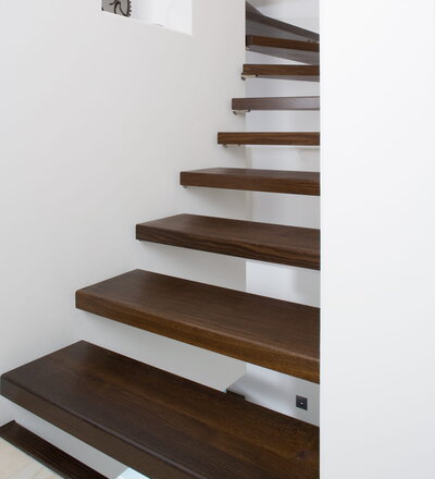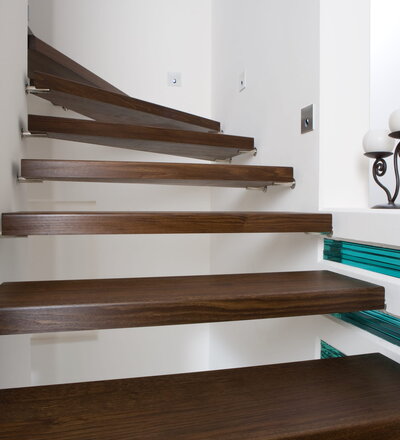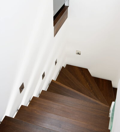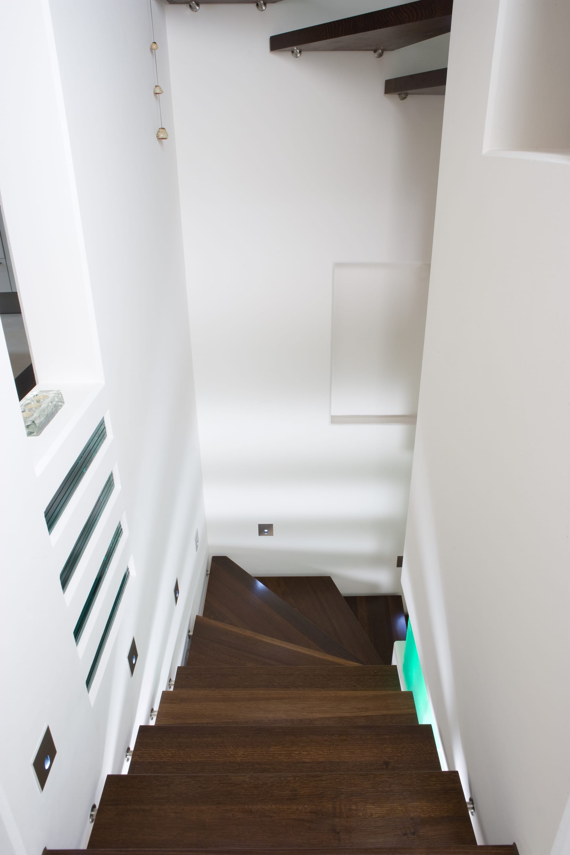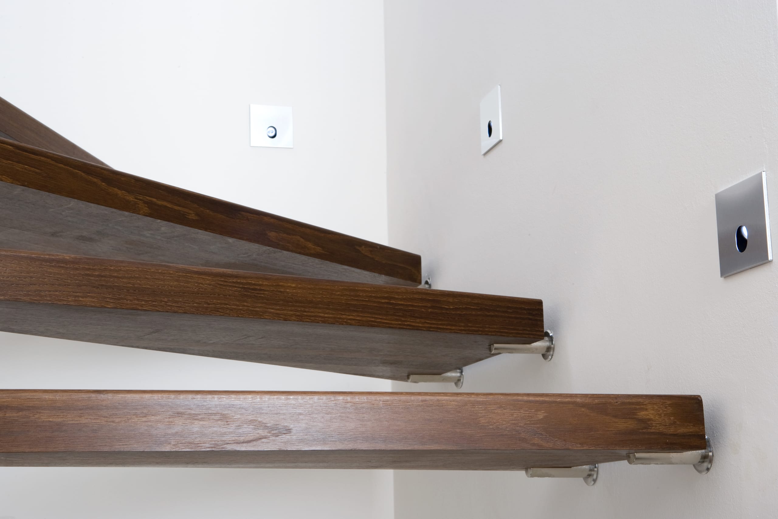 Trittstufen auf speziellen gummigelagerten Edelstahlbeschlägen, beidseitig in Massivwänden befestigt; Holzart Eiche geräuchert