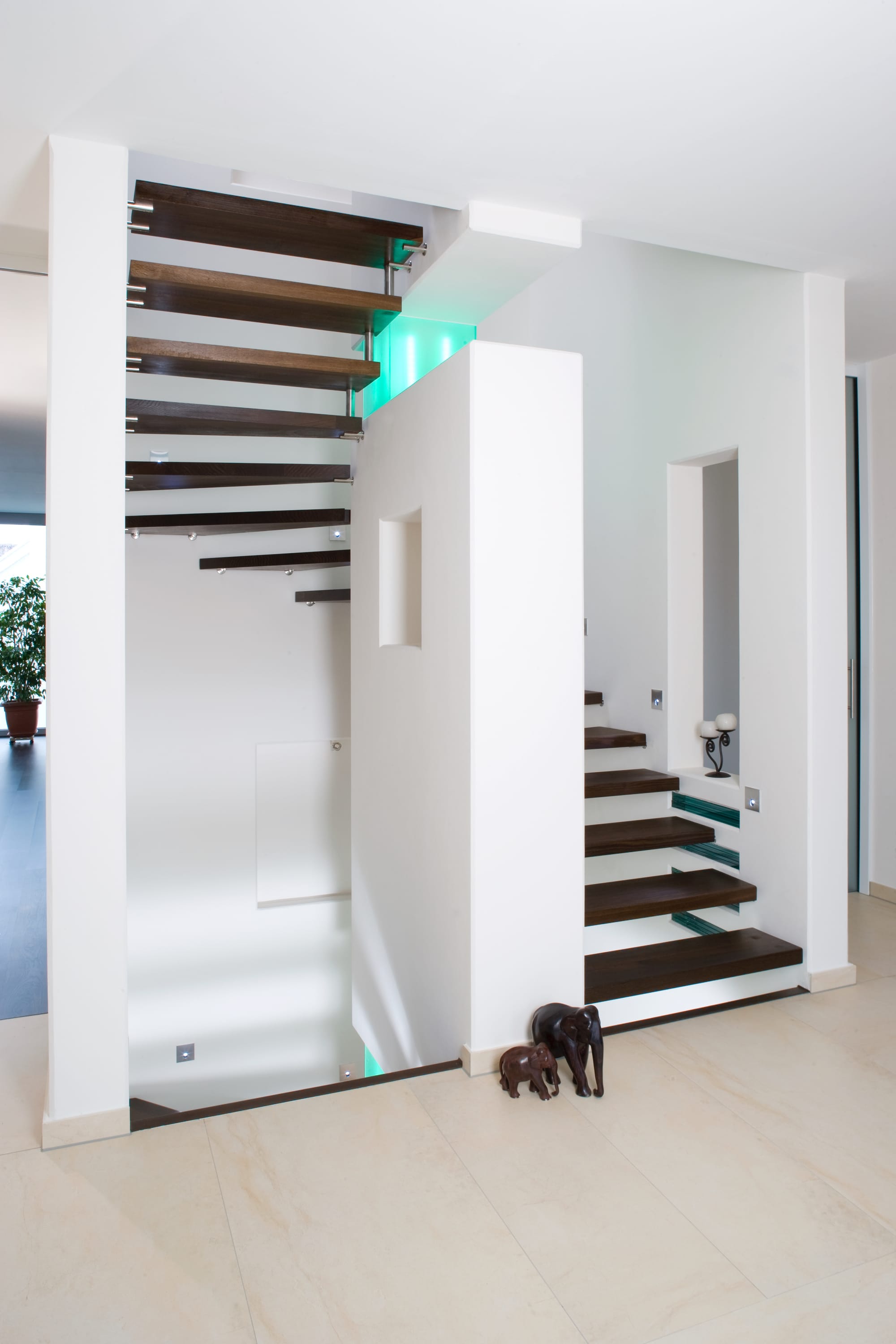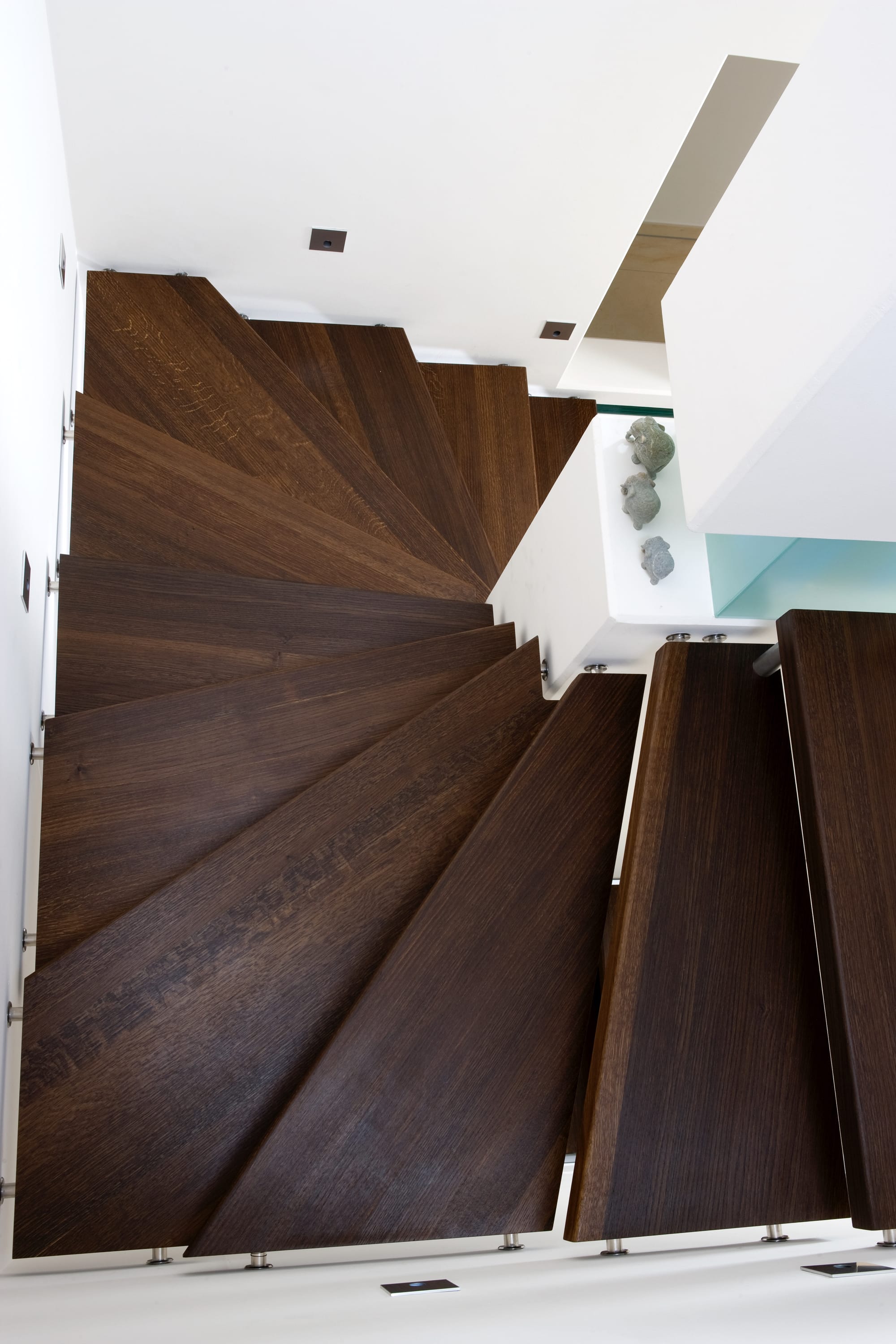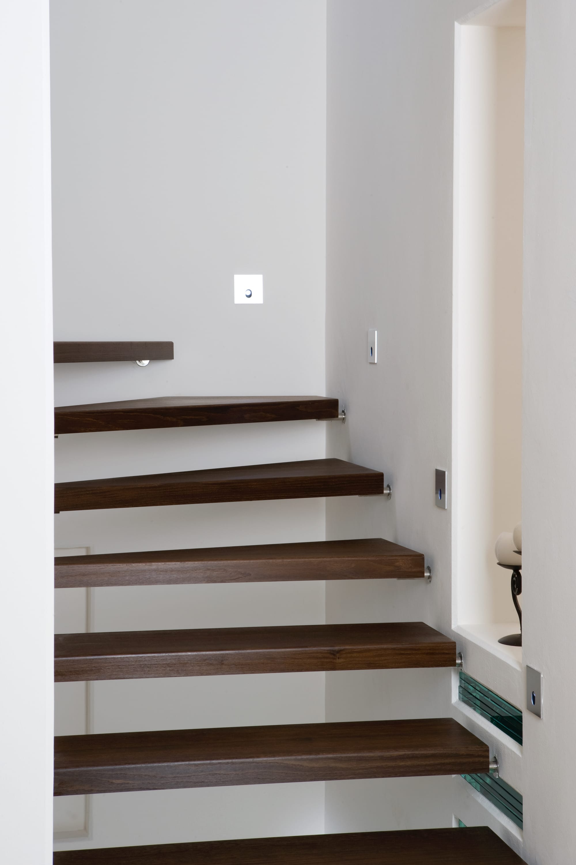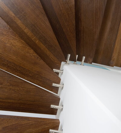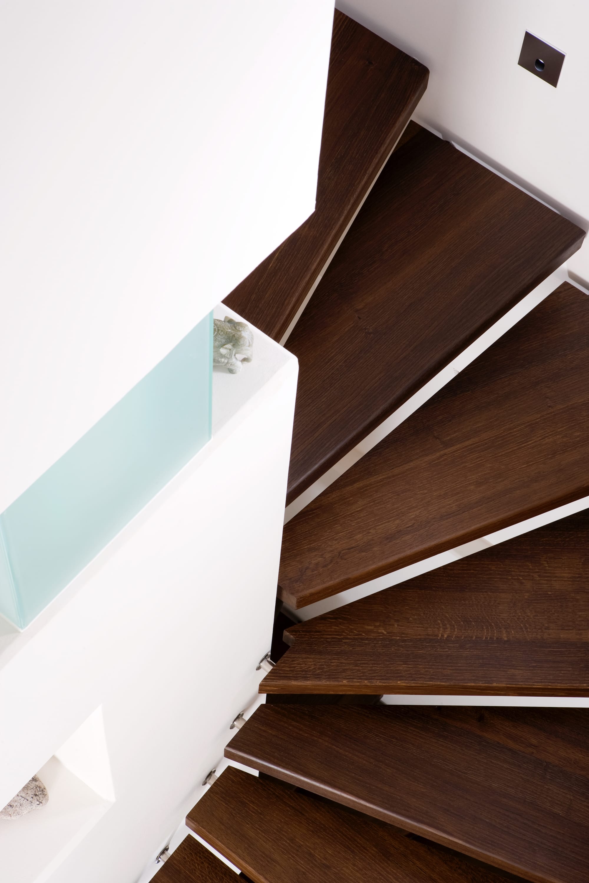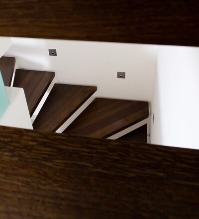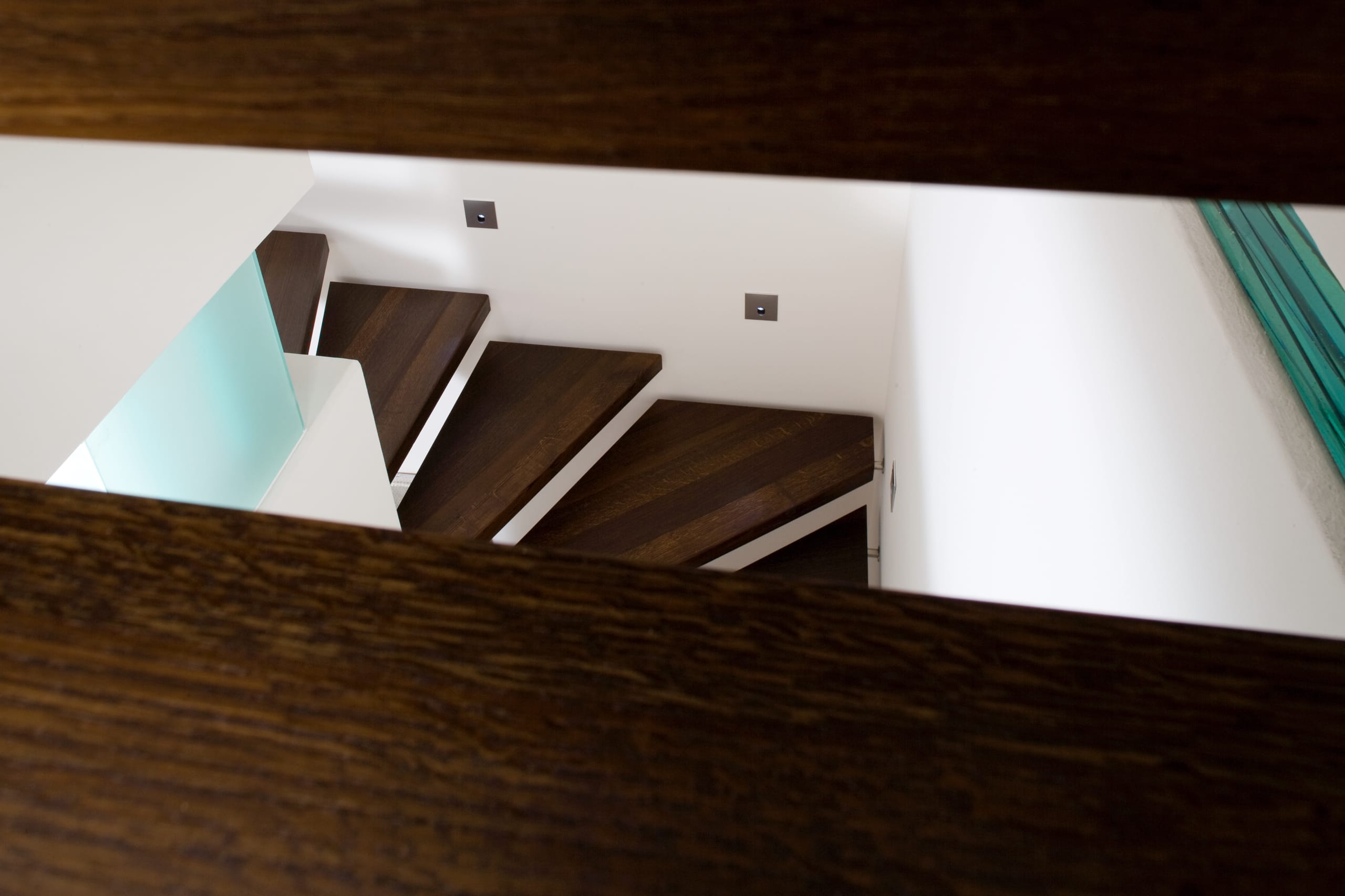 Trittstufen auf speziellen gummigelagerten Edelstahlbeschlägen, beidseitig in Massivwänden befestigt; Holzart Eiche geräuchert