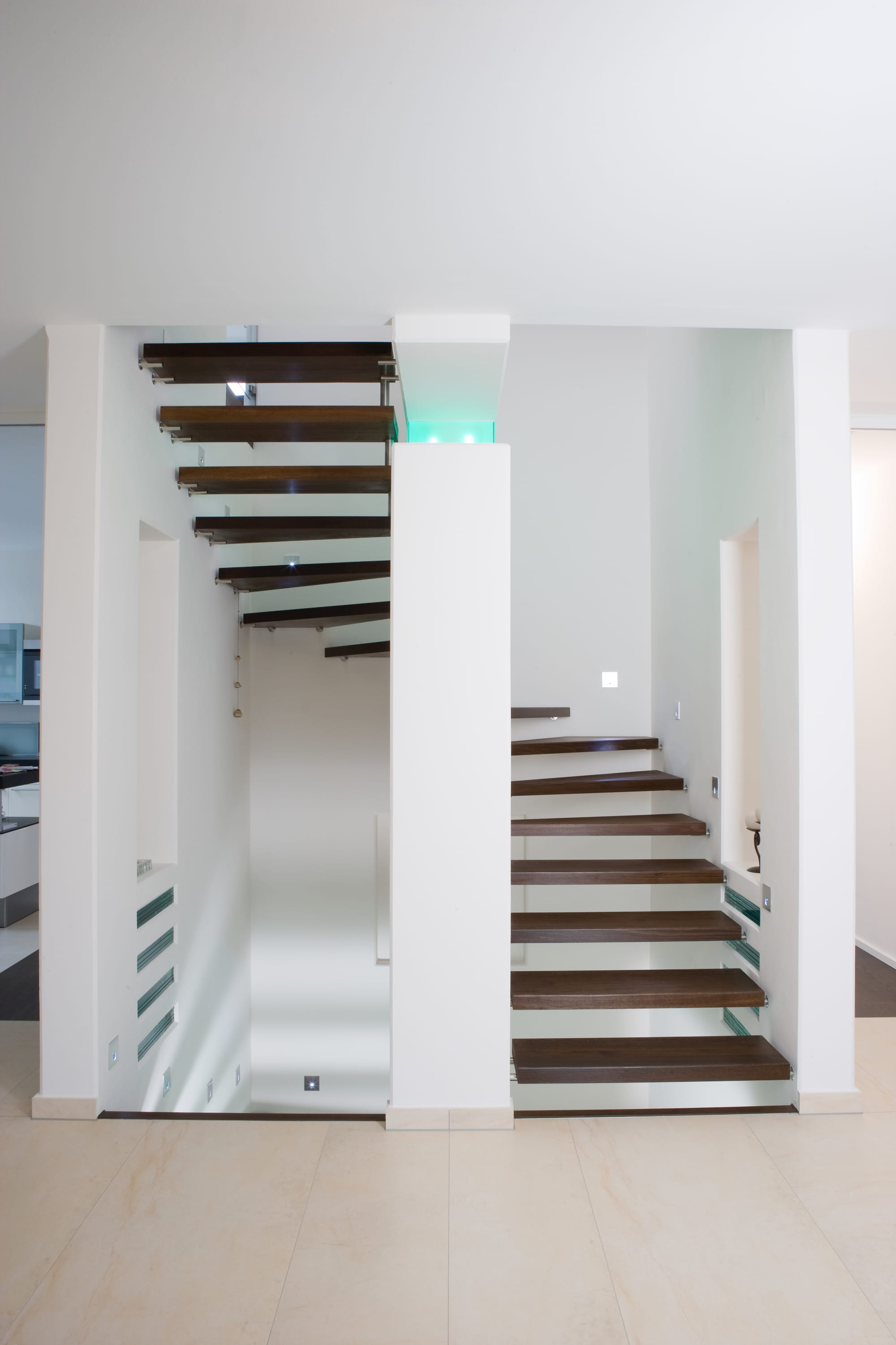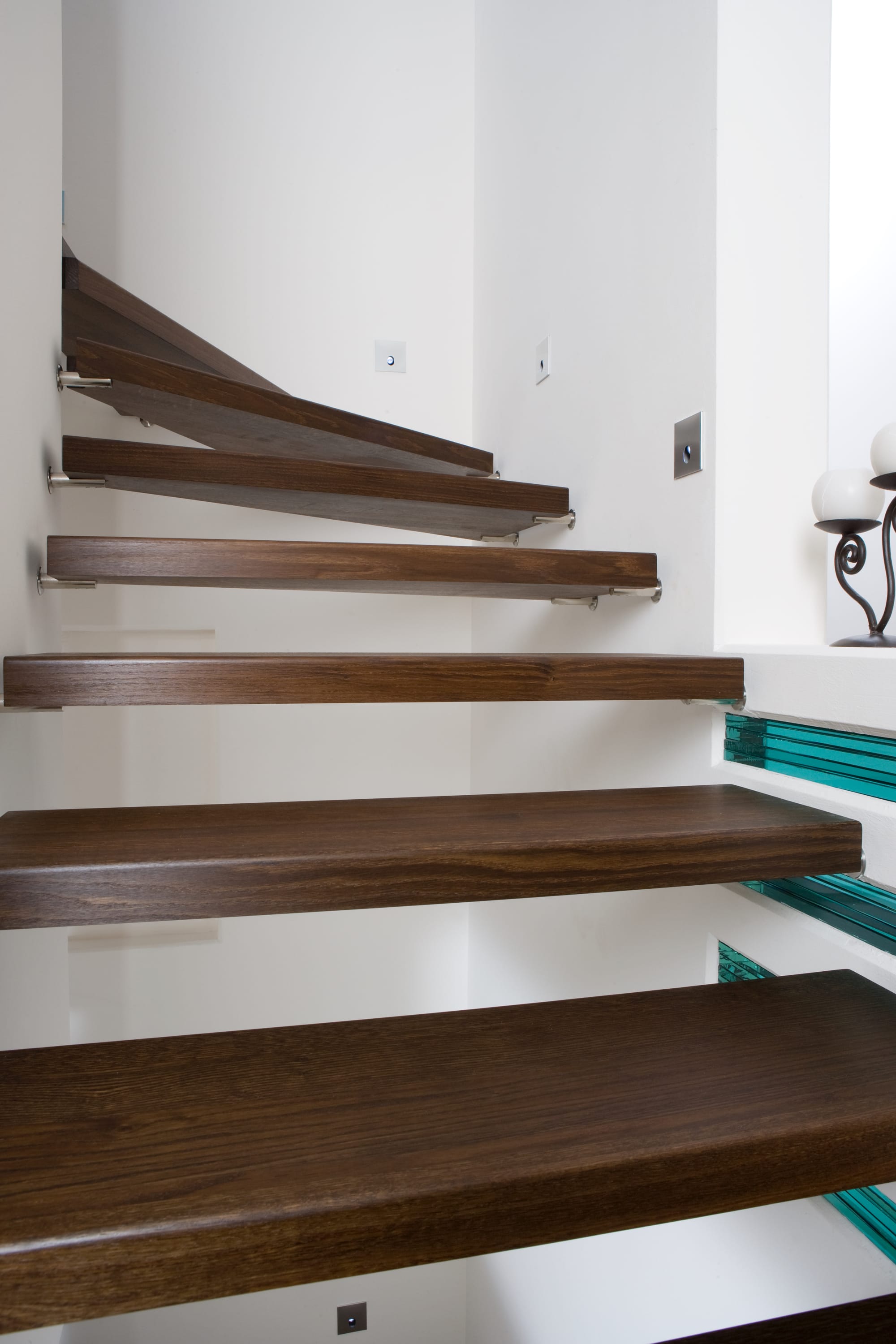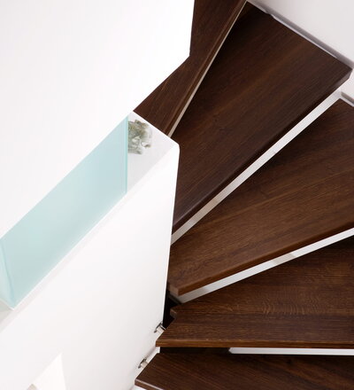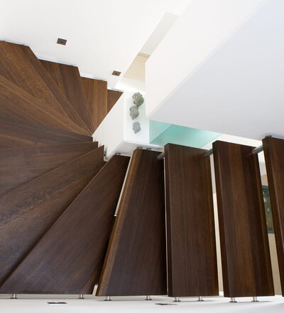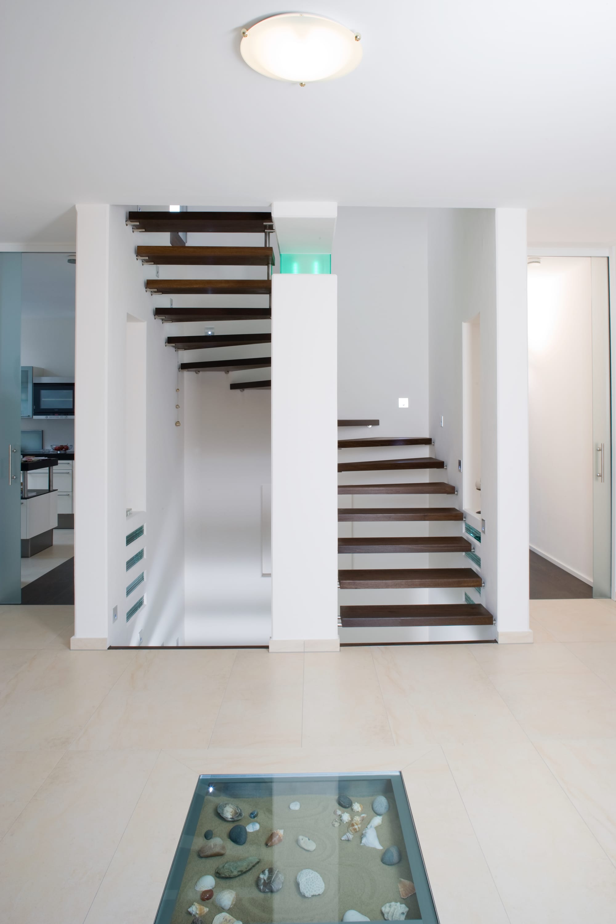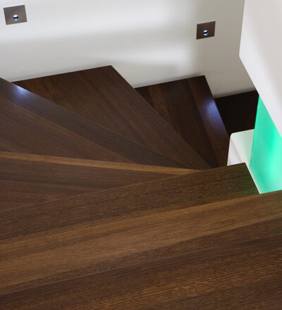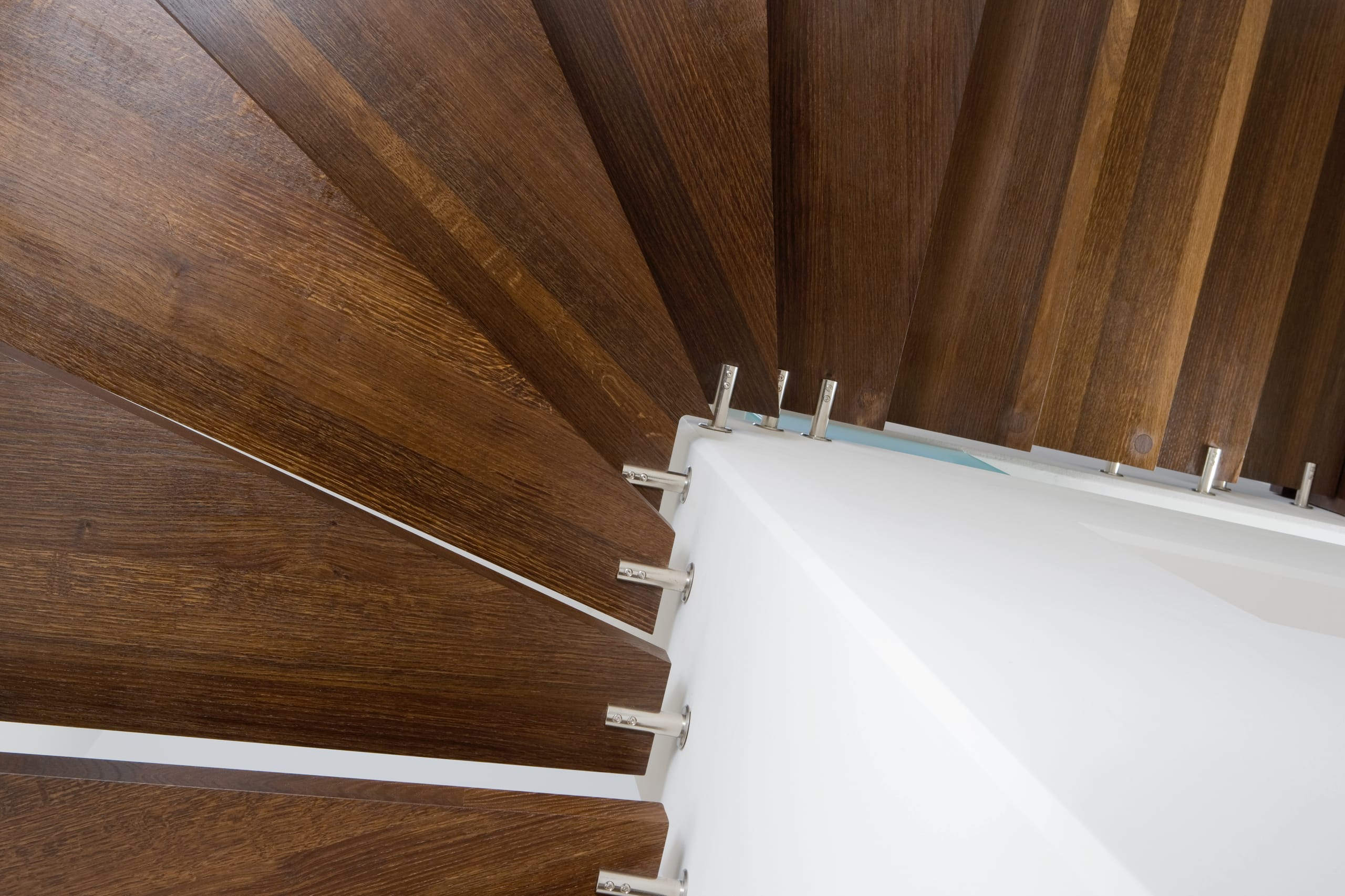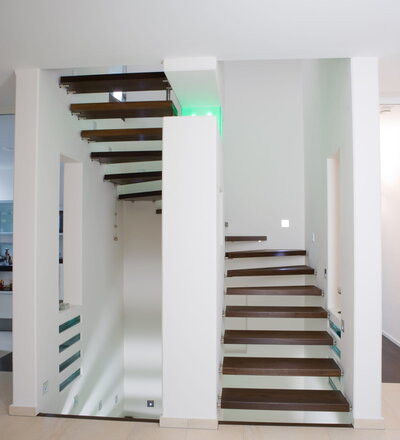 Trittstufen auf speziellen gummigelagerten Edelstahlbeschlägen, beidseitig in Massivwänden befestigt; Holzart Eiche geräuchert