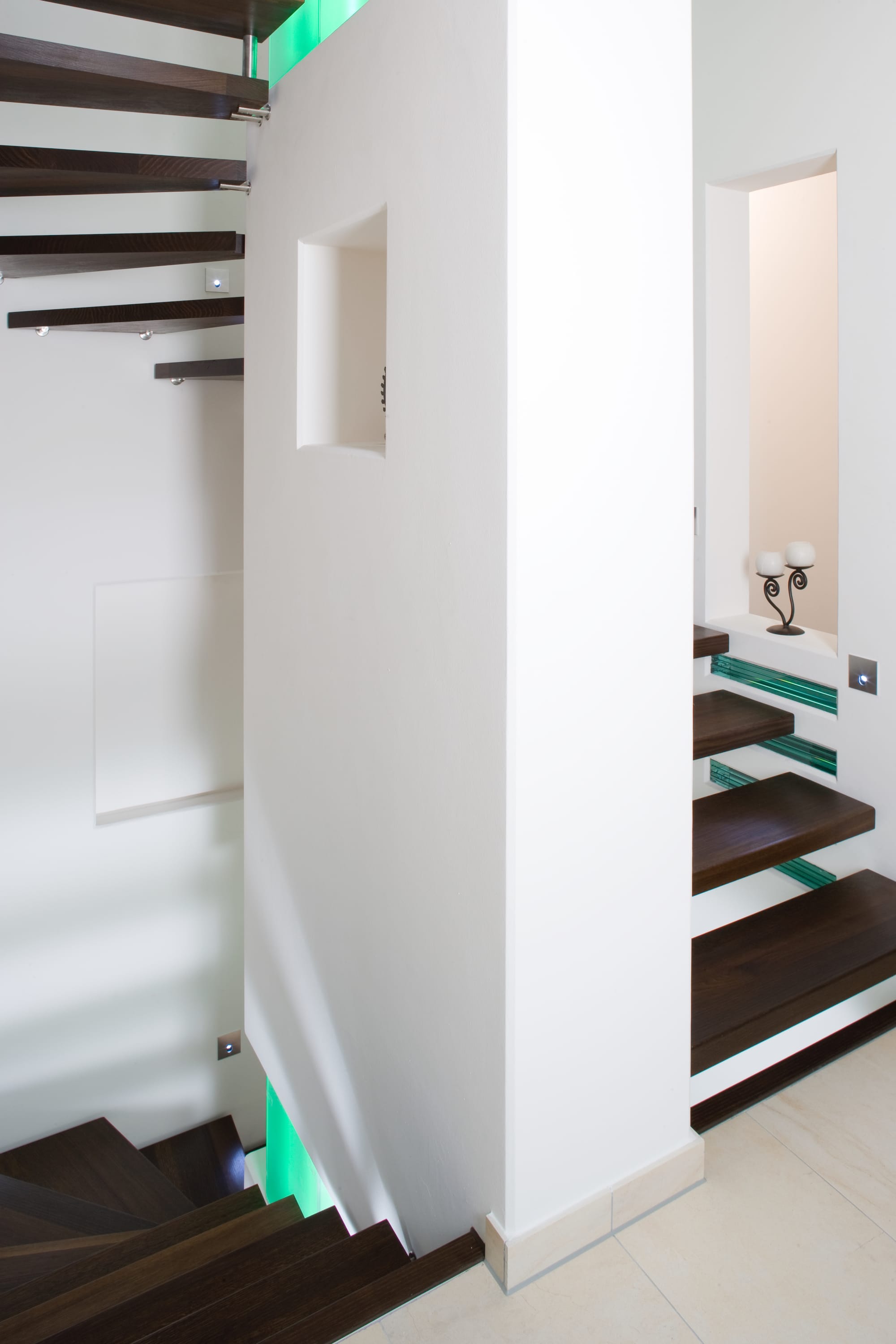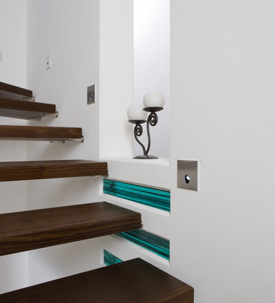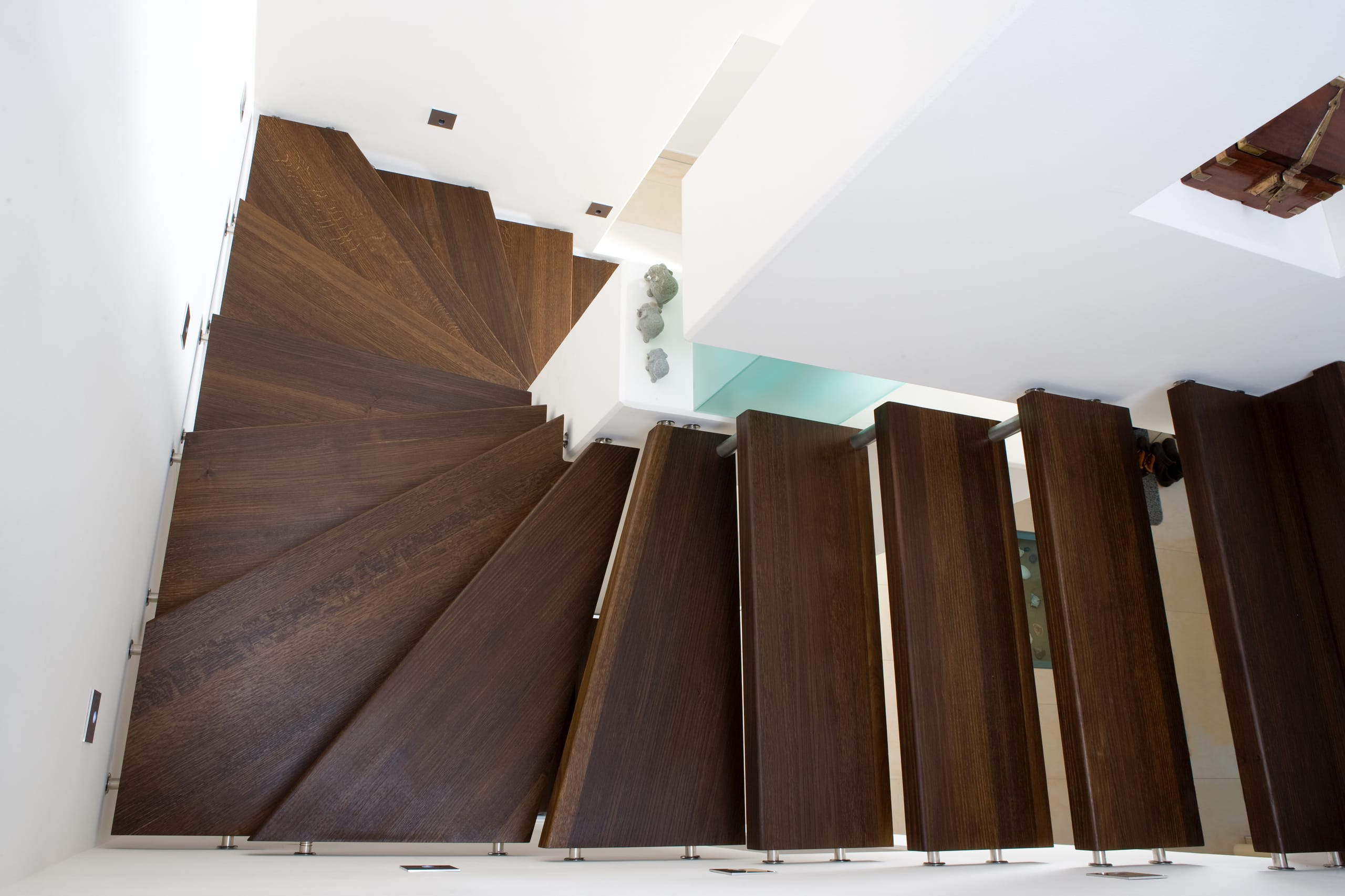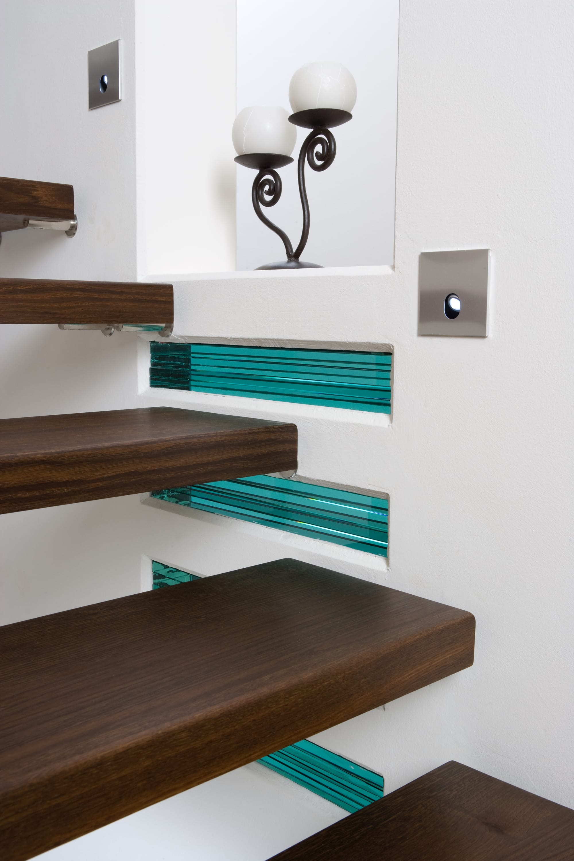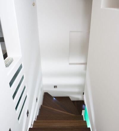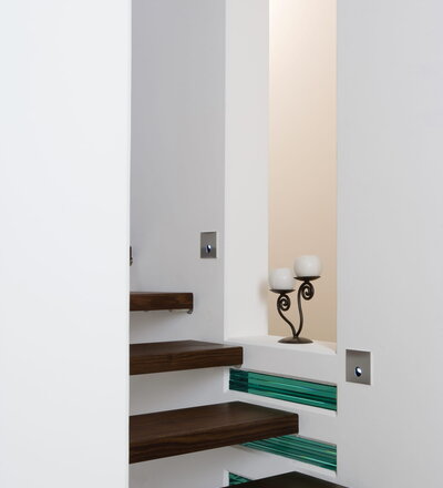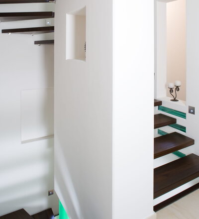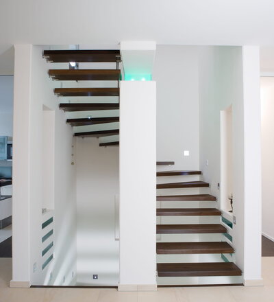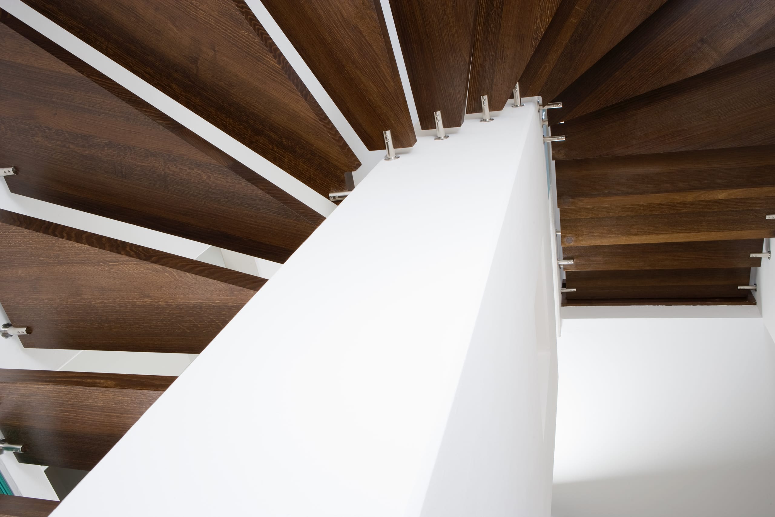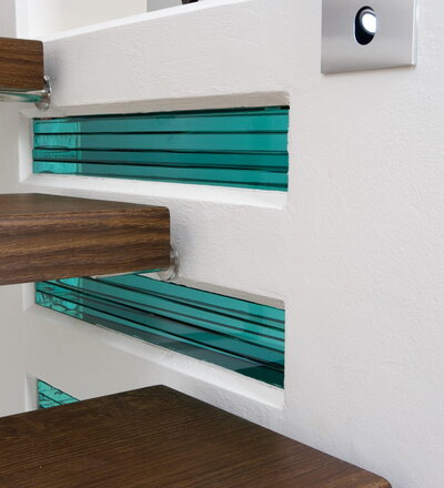 Trittstufen auf speziellen gummigelagerten Edelstahlbeschlägen, beidseitig in Massivwänden befestigt; Holzart Eiche geräuchert