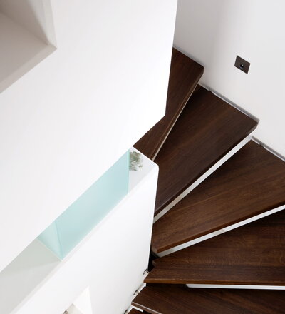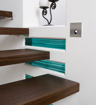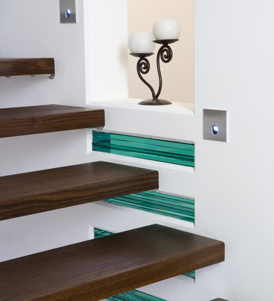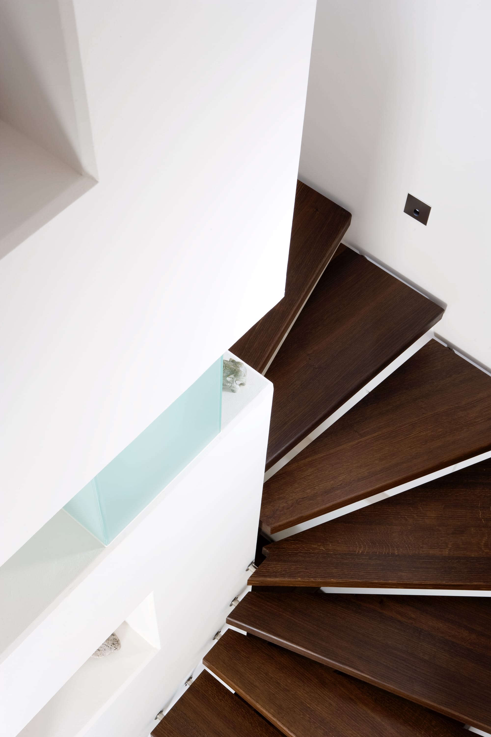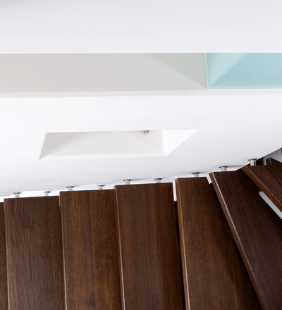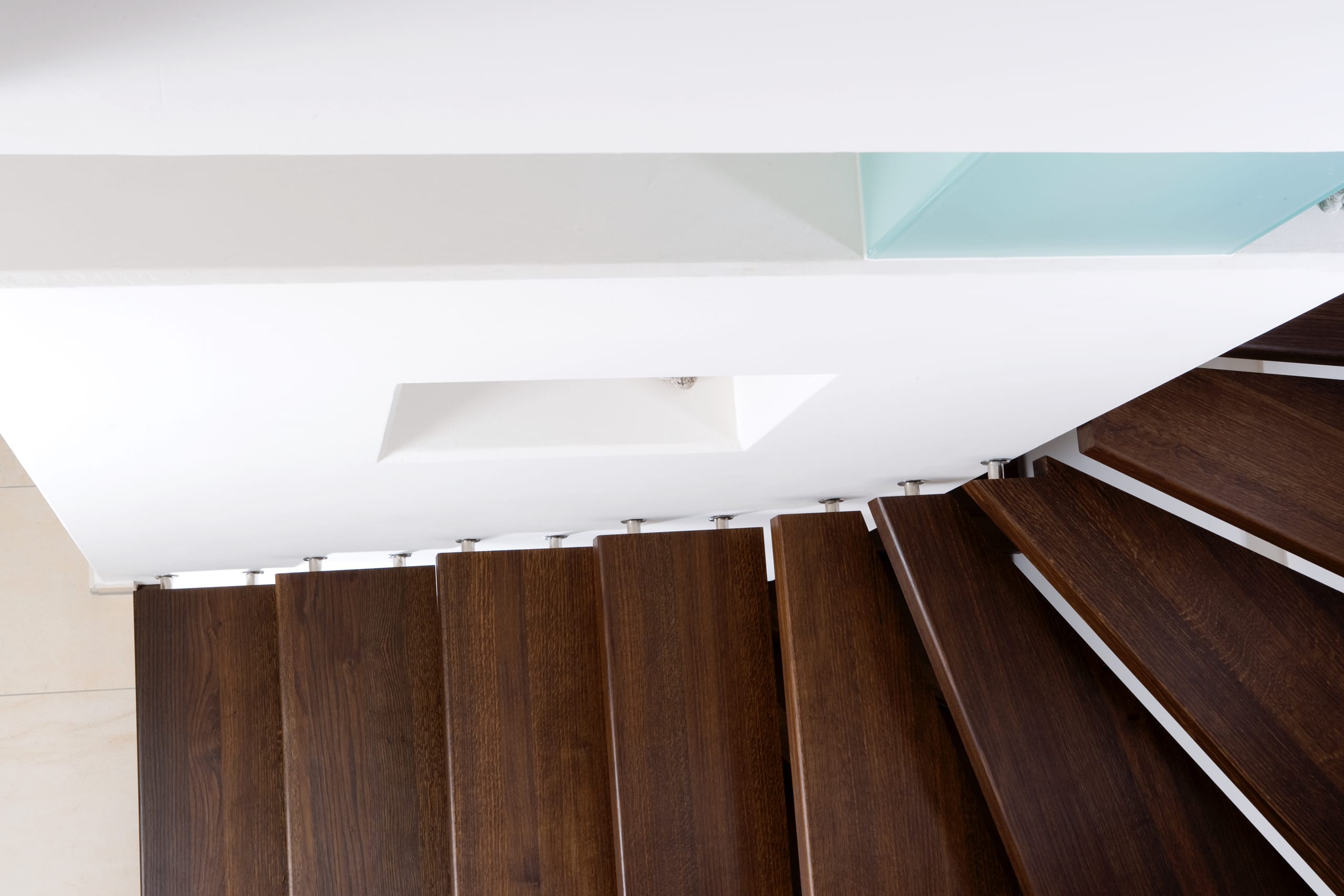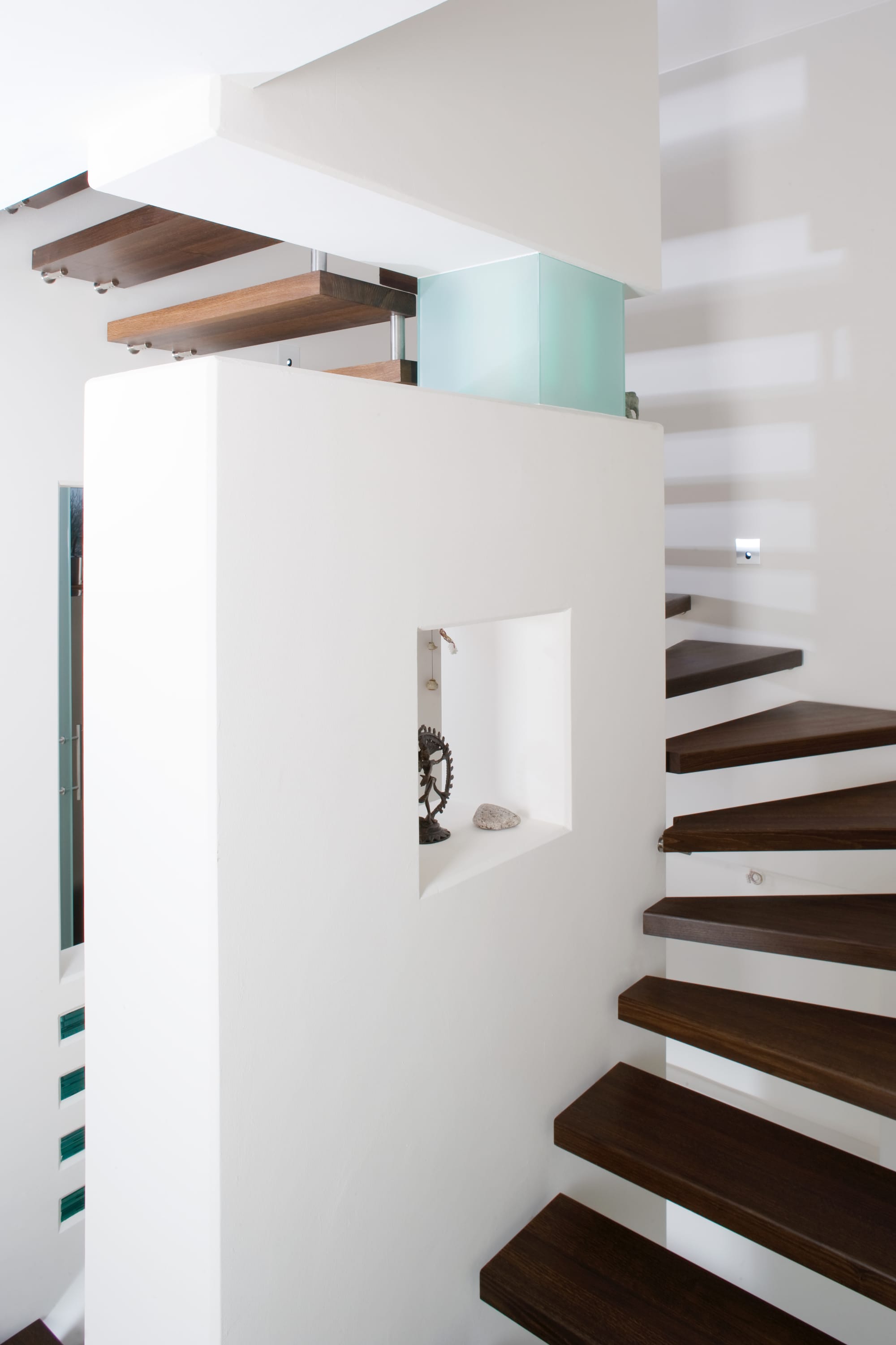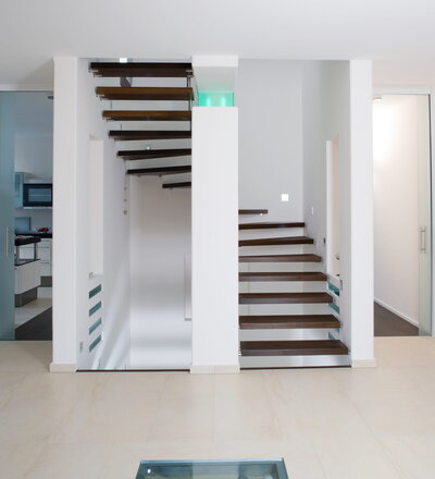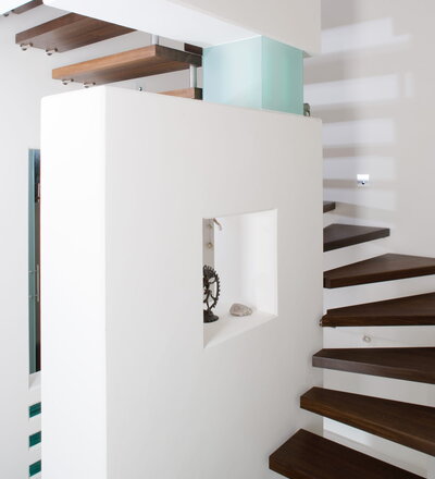 Trittstufen auf speziellen gummigelagerten Edelstahlbeschlägen, beidseitig in Massivwänden befestigt; Holzart Eiche geräuchert