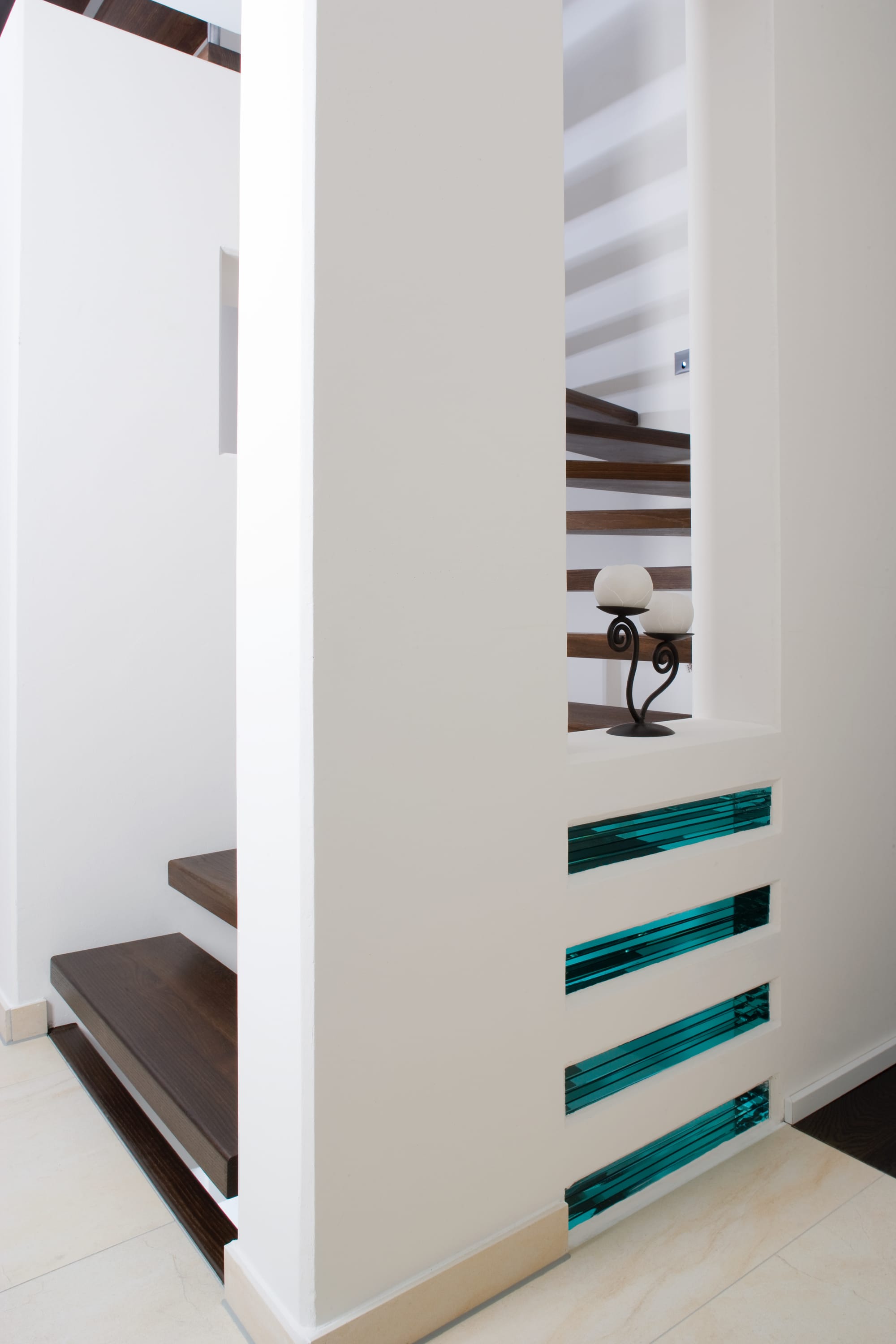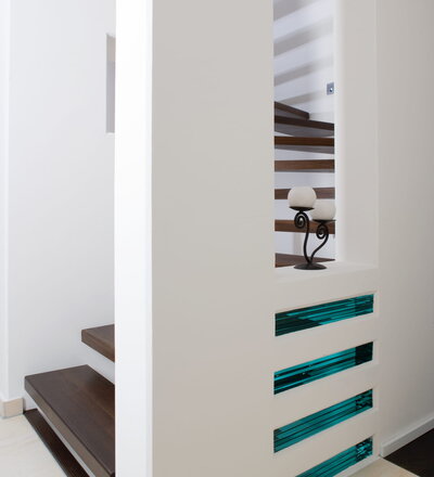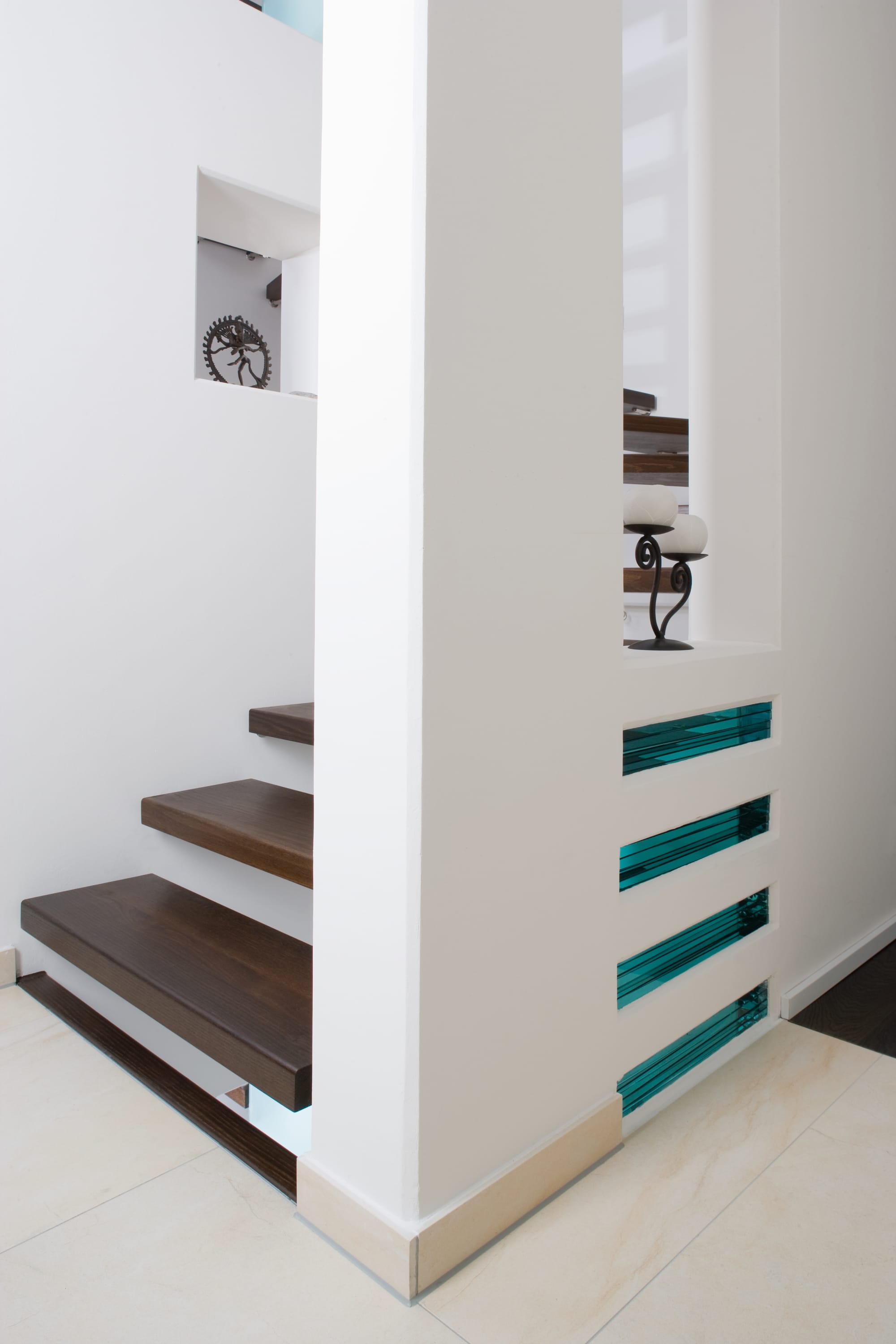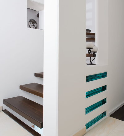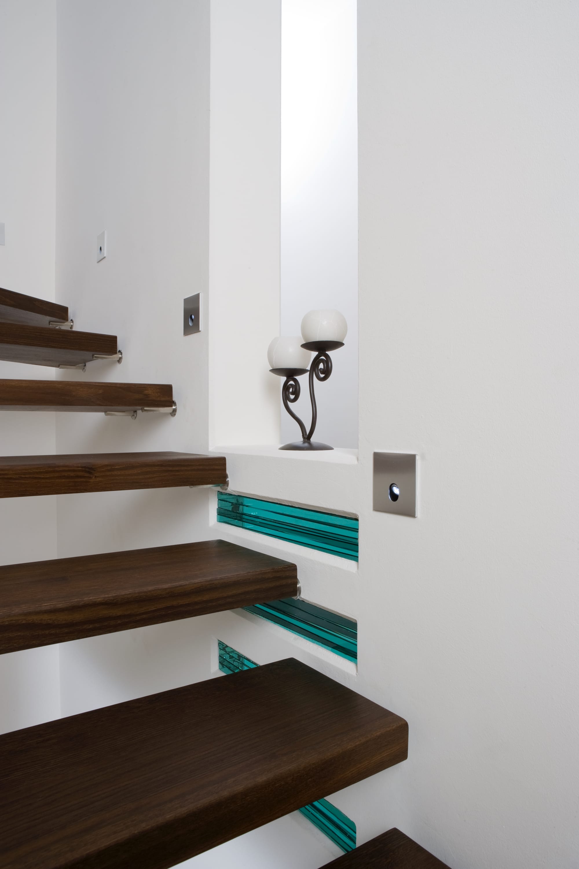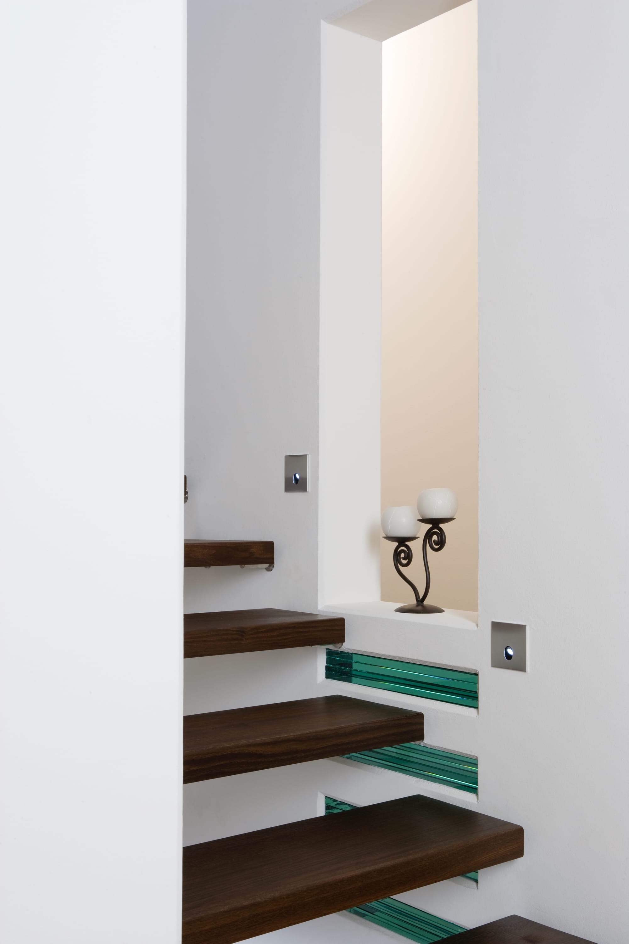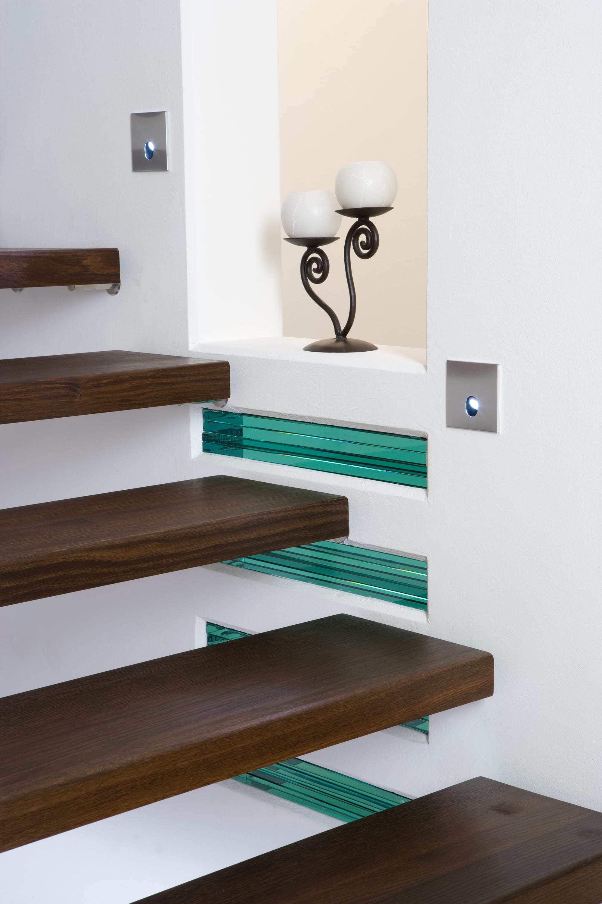 Trittstufen auf speziellen gummigelagerten Edelstahlbeschlägen, beidseitig in Massivwänden befestigt; Holzart Eiche geräuchert