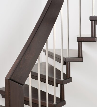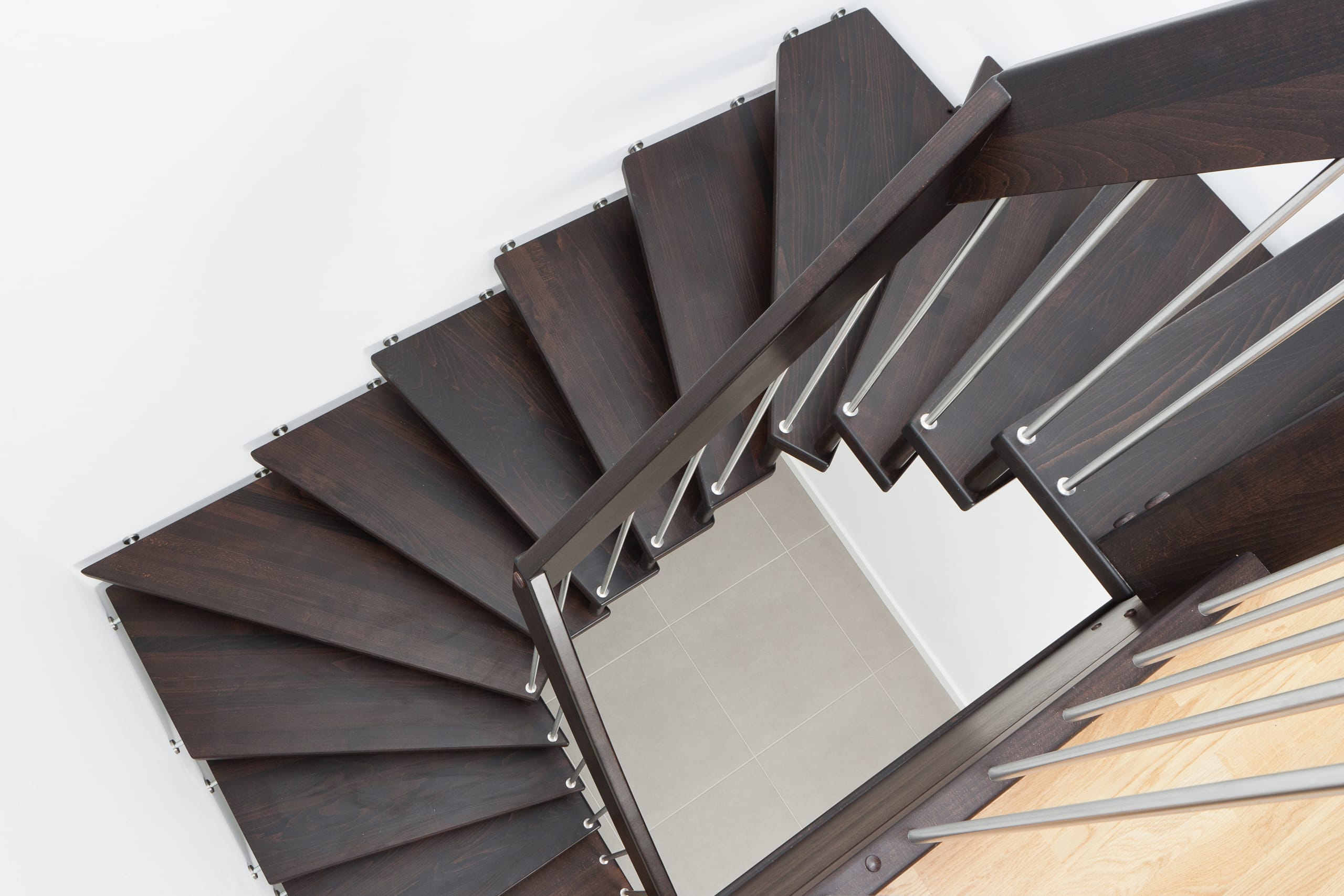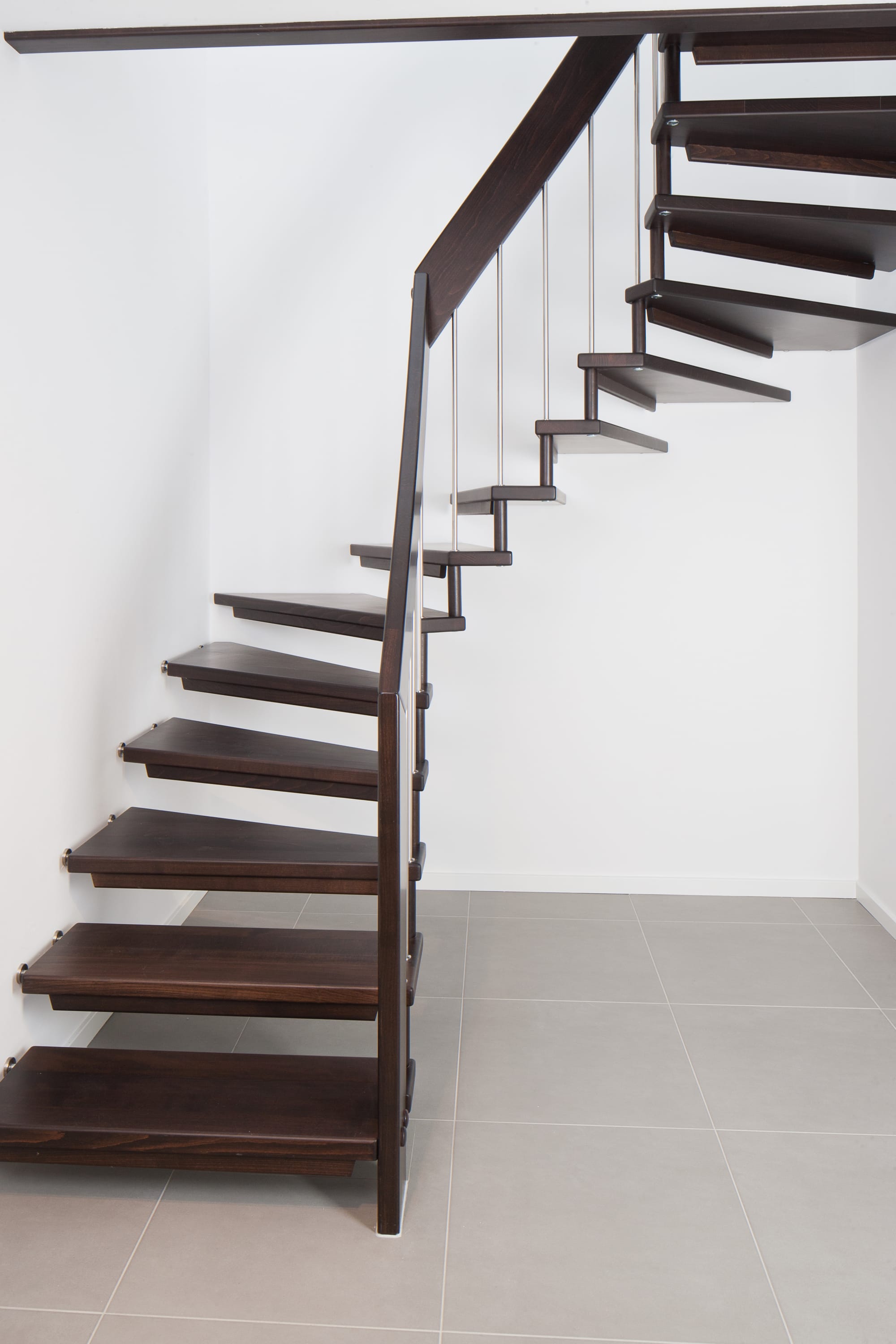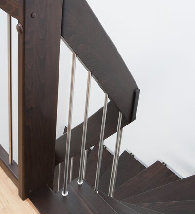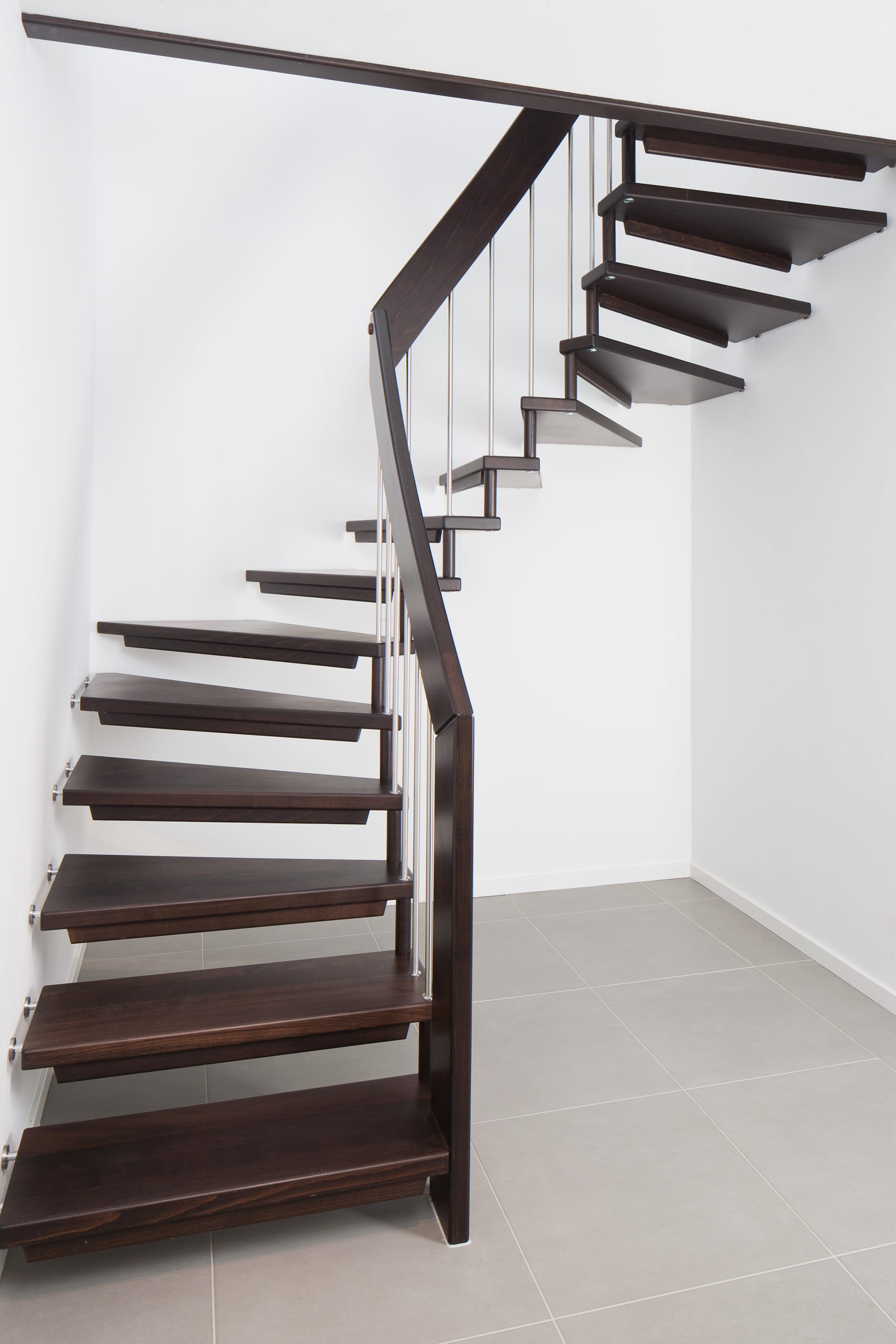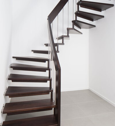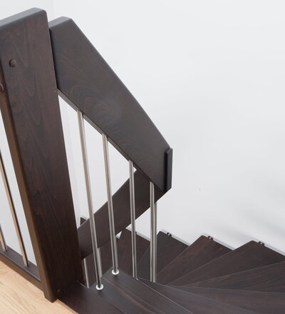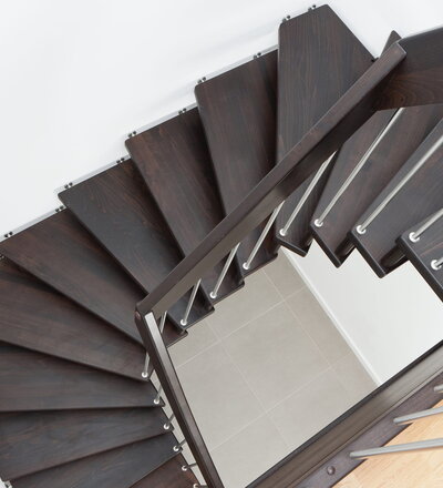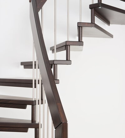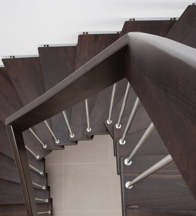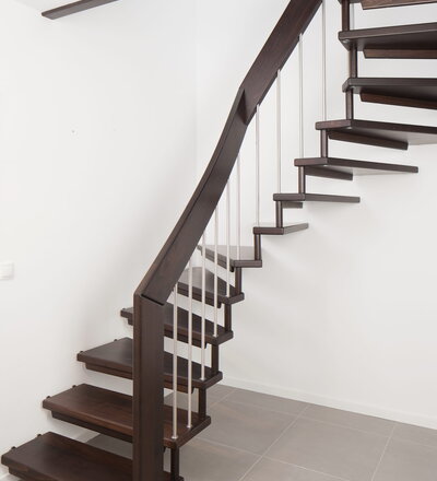 1/2 gewendelte freitragende Treppe, wandseitig gummigelagert; Holzart Buche auf Wenge gebeizt.