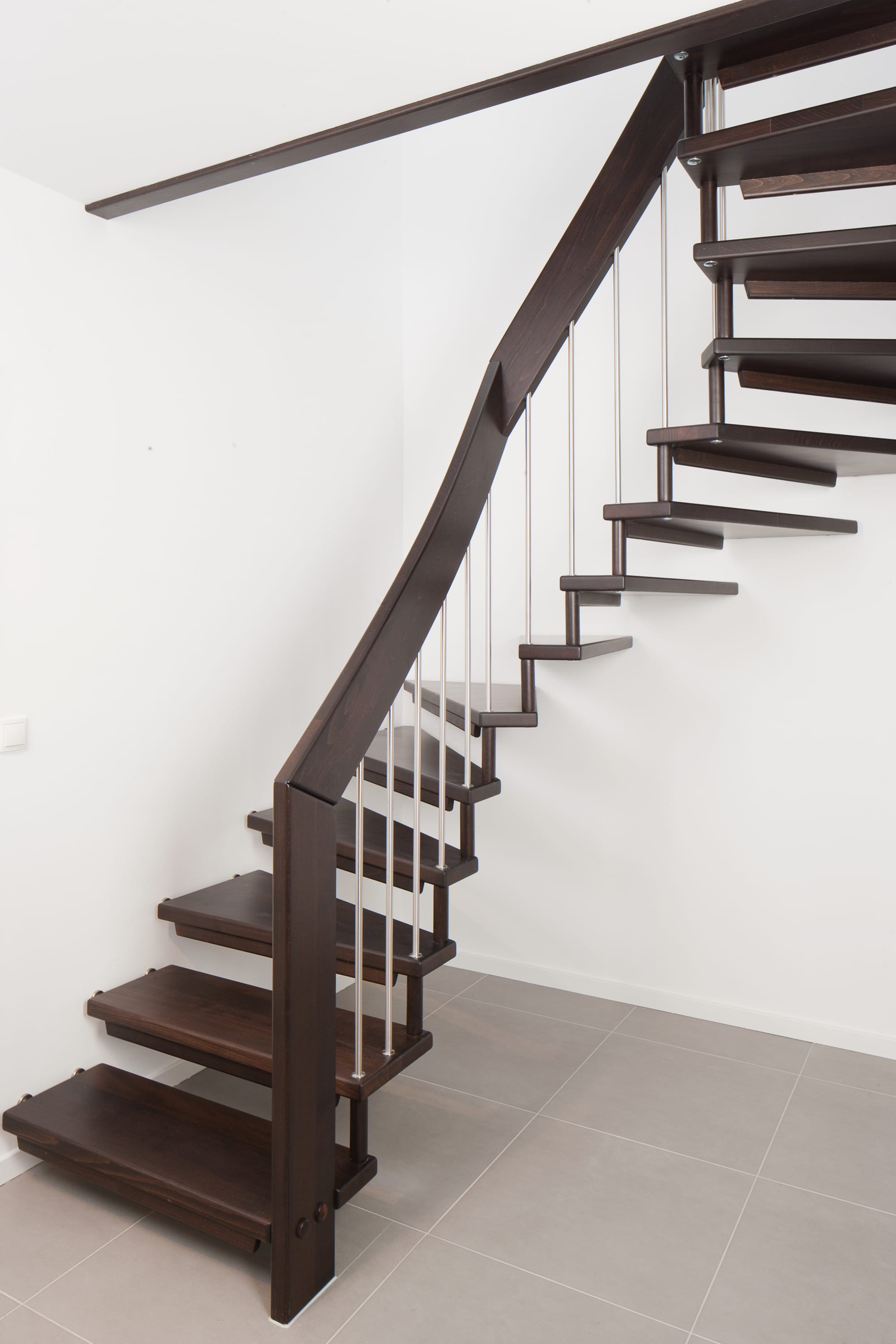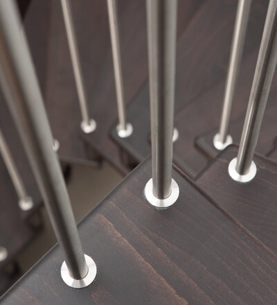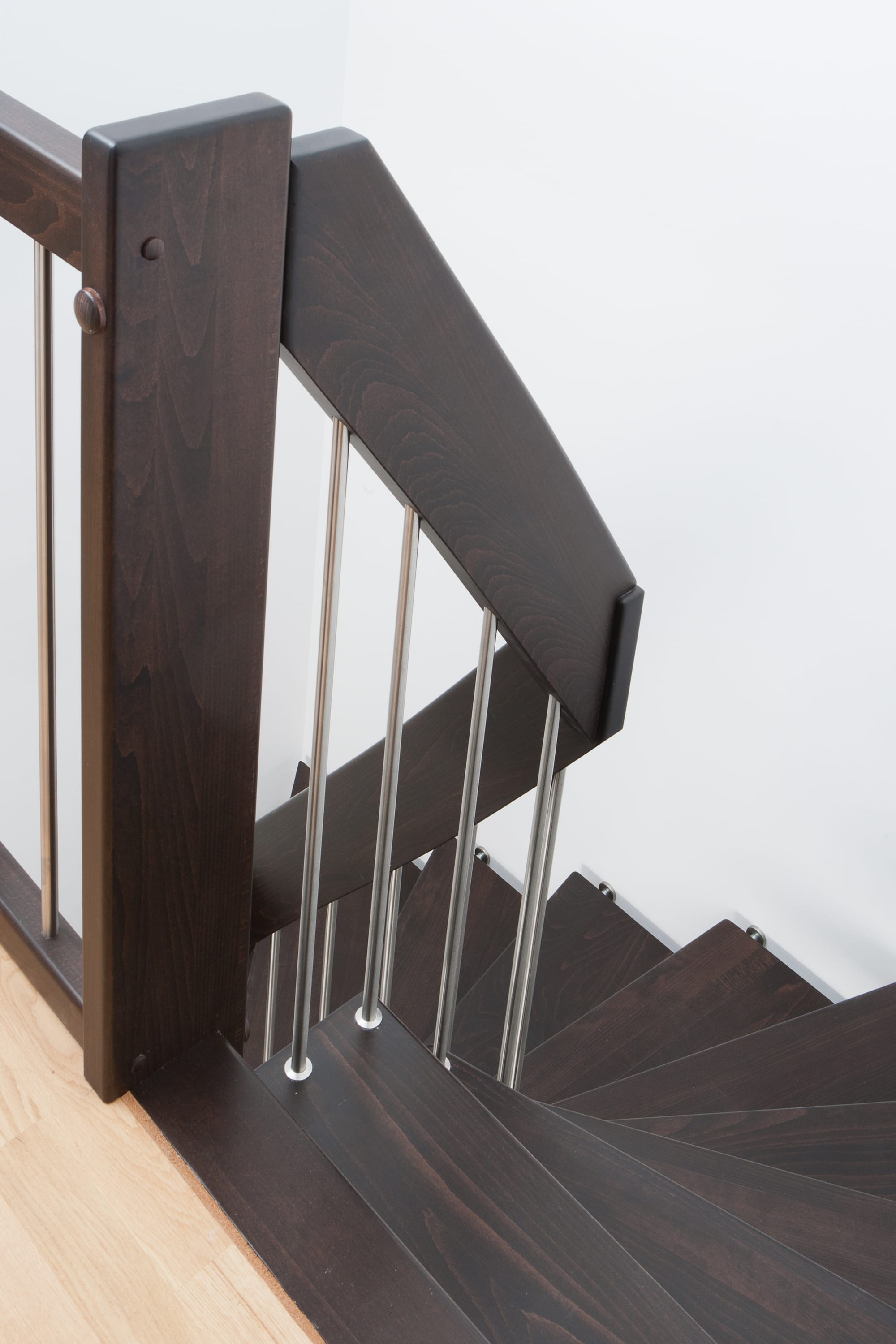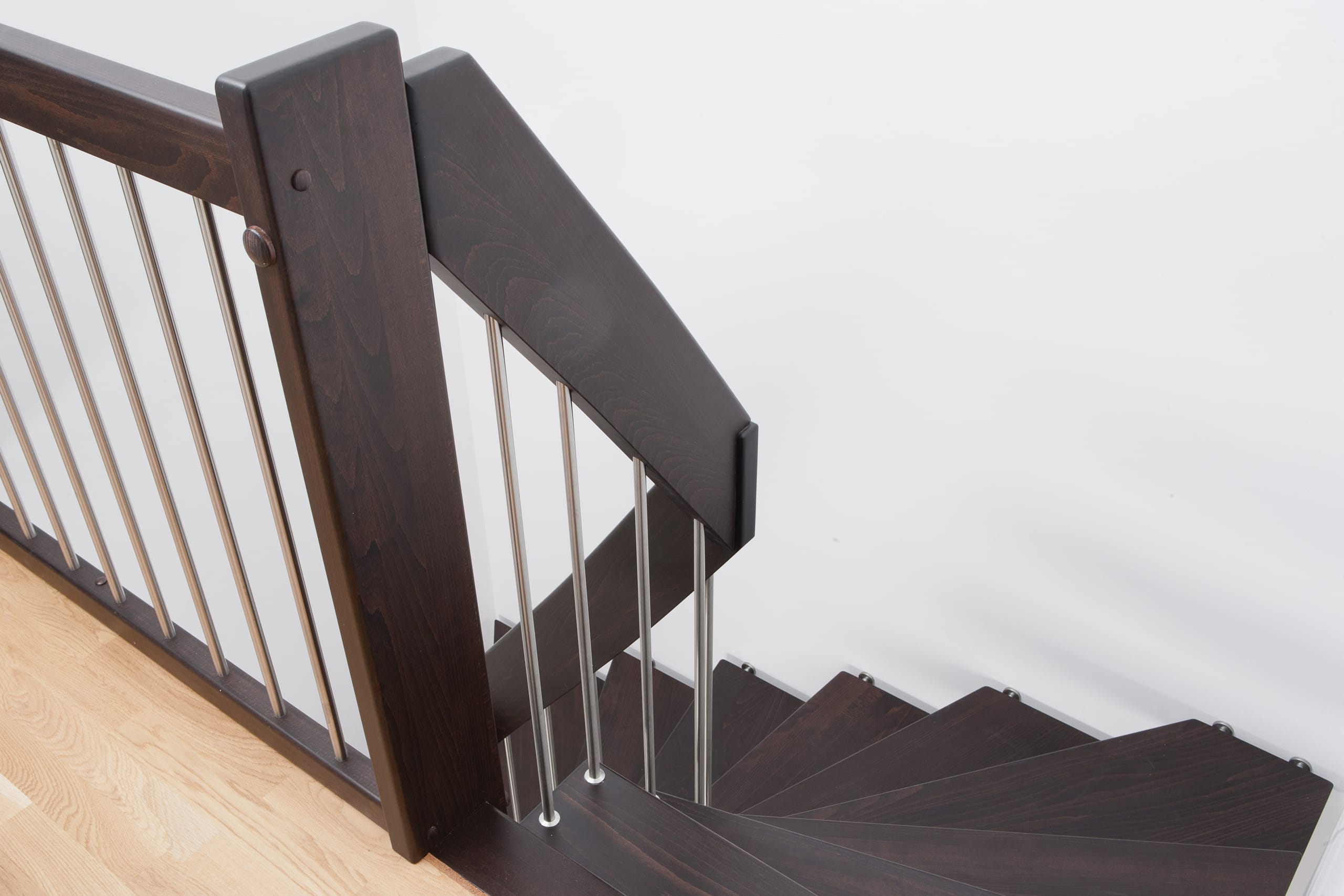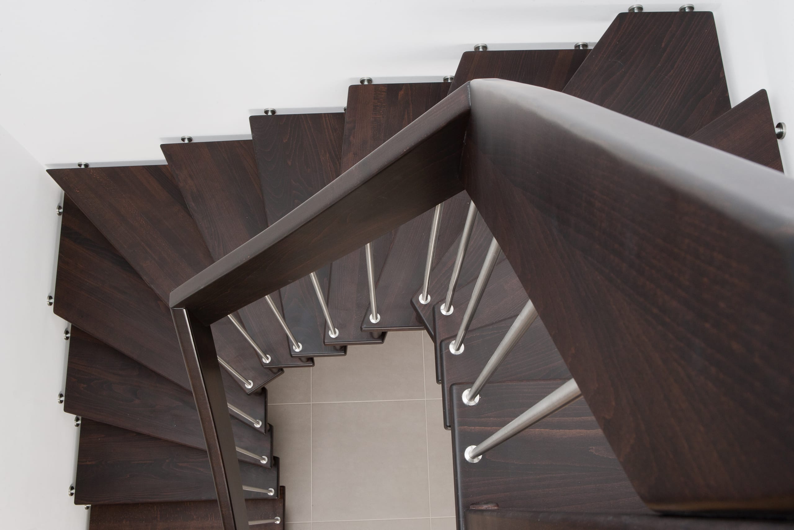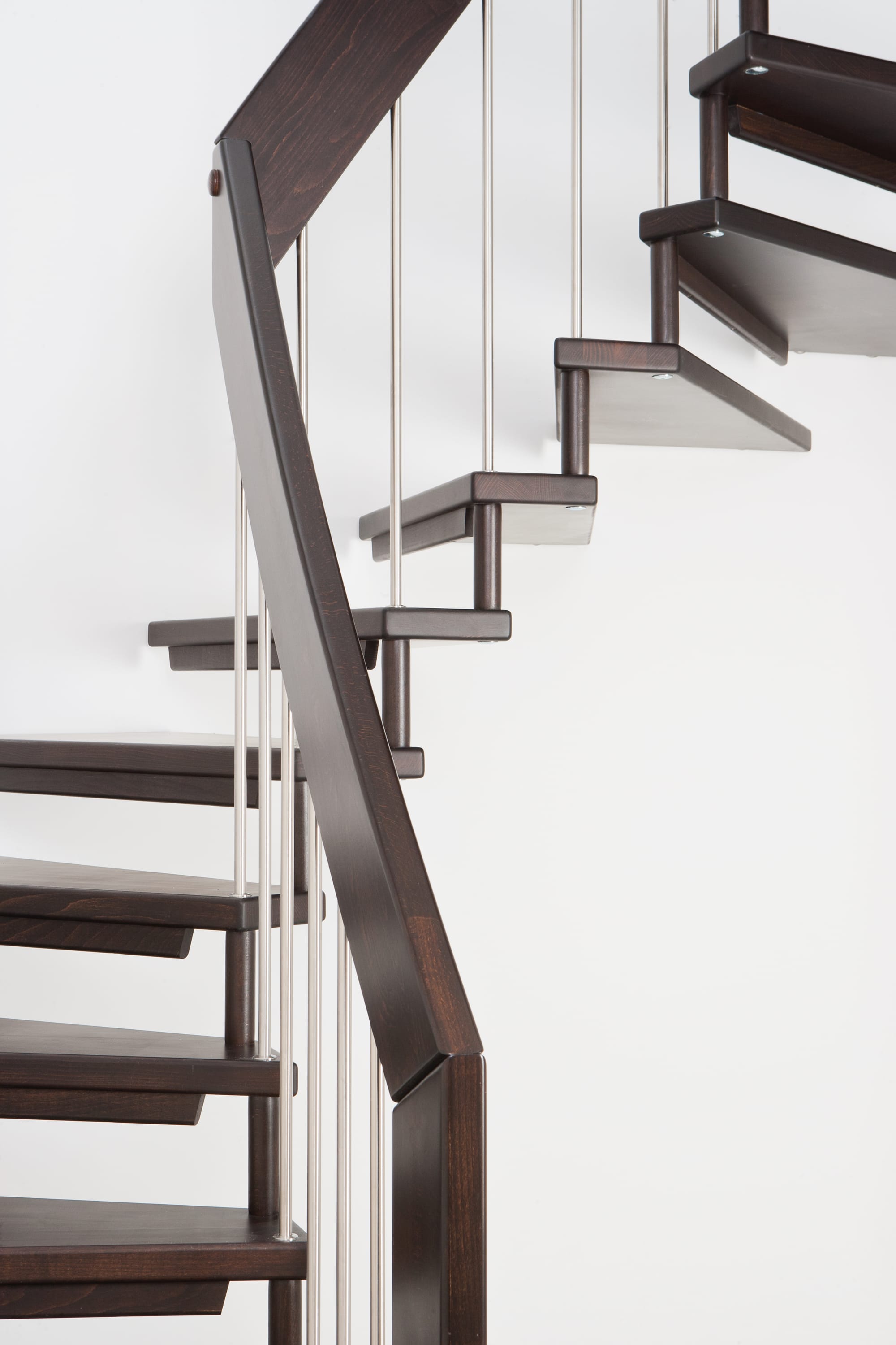 1/2 gewendelte freitragende Treppe, wandseitig gummigelagert; Holzart Buche auf Wenge gebeizt.