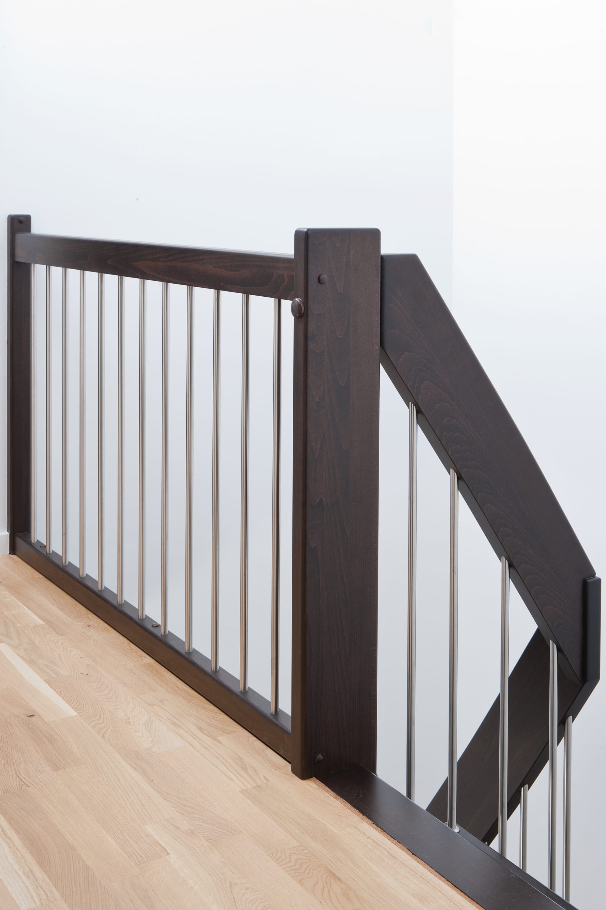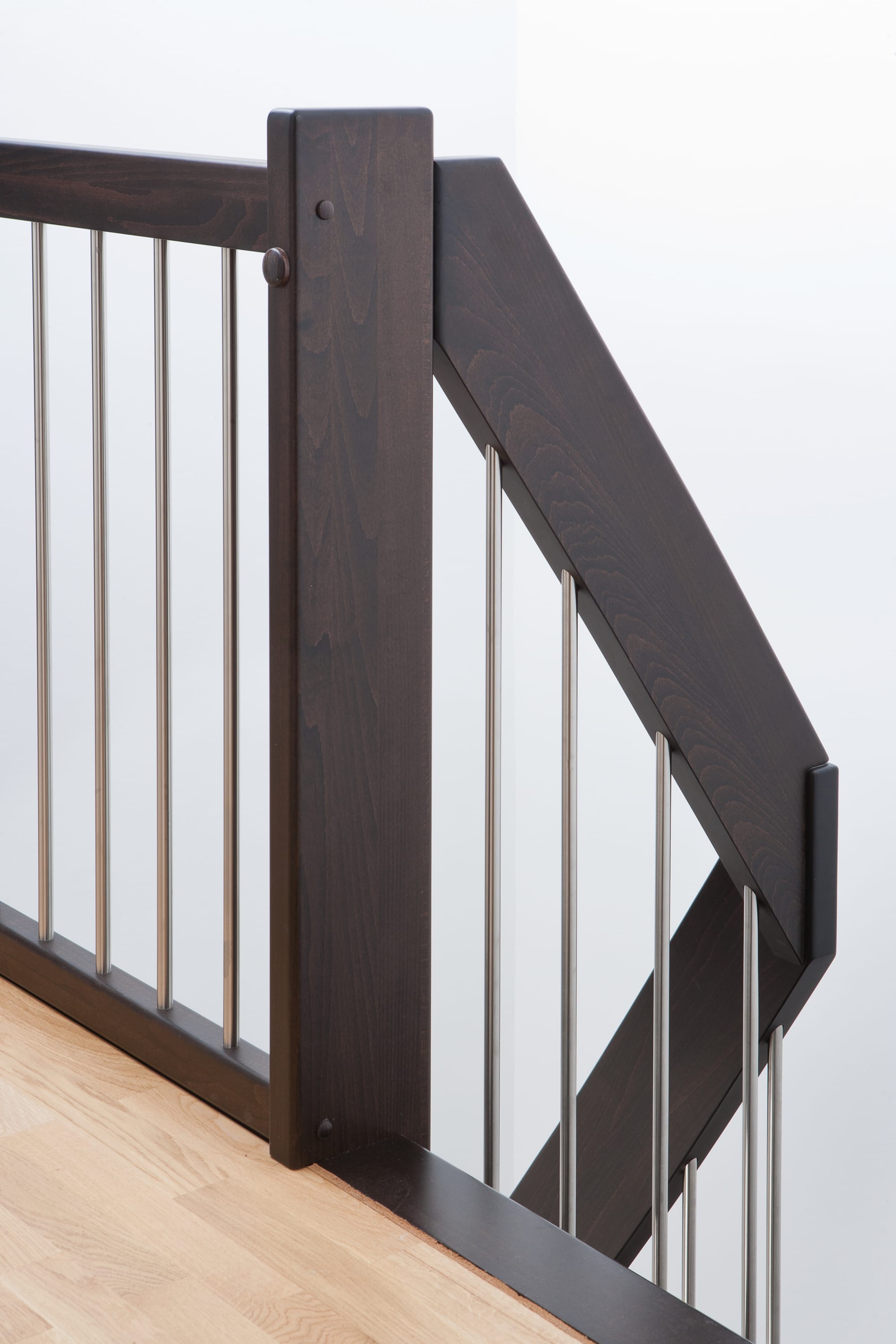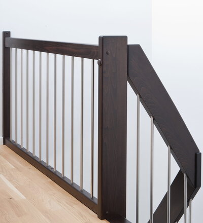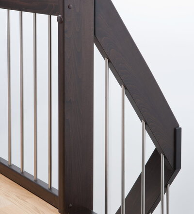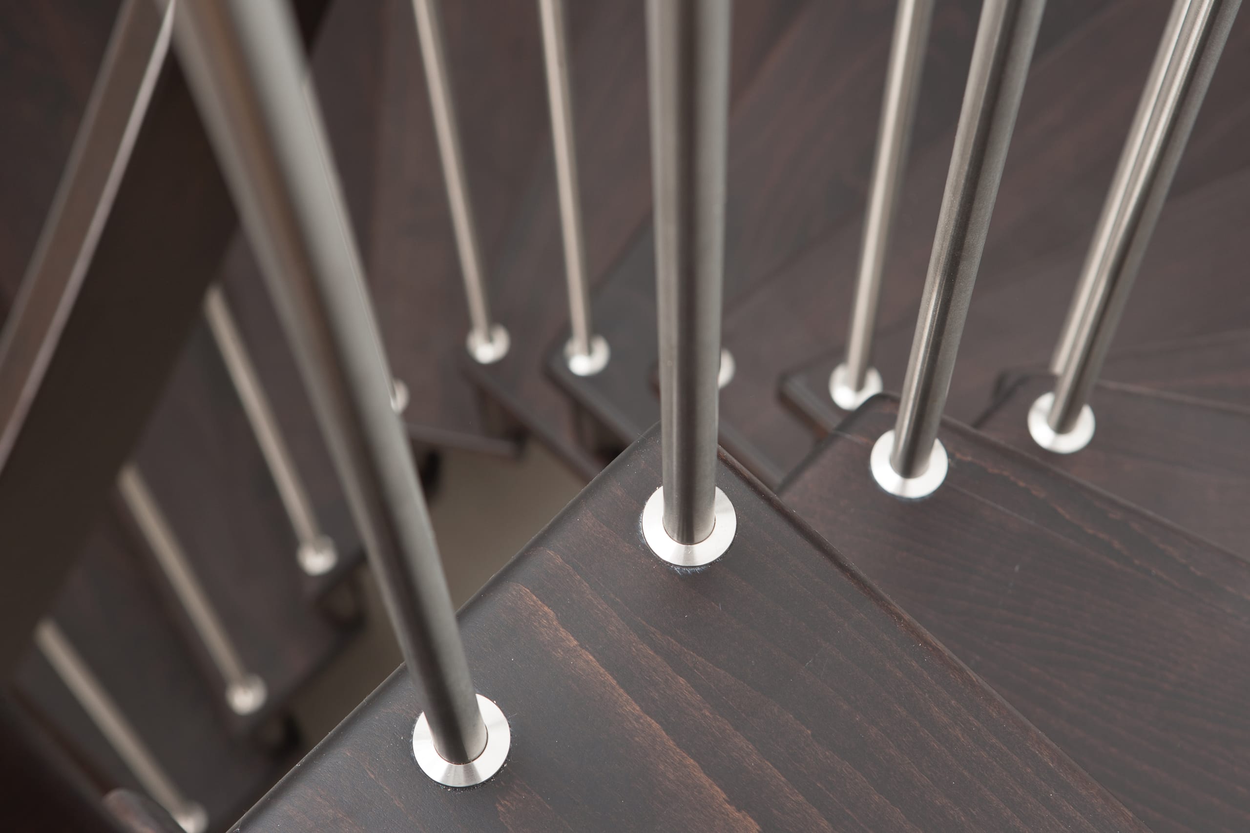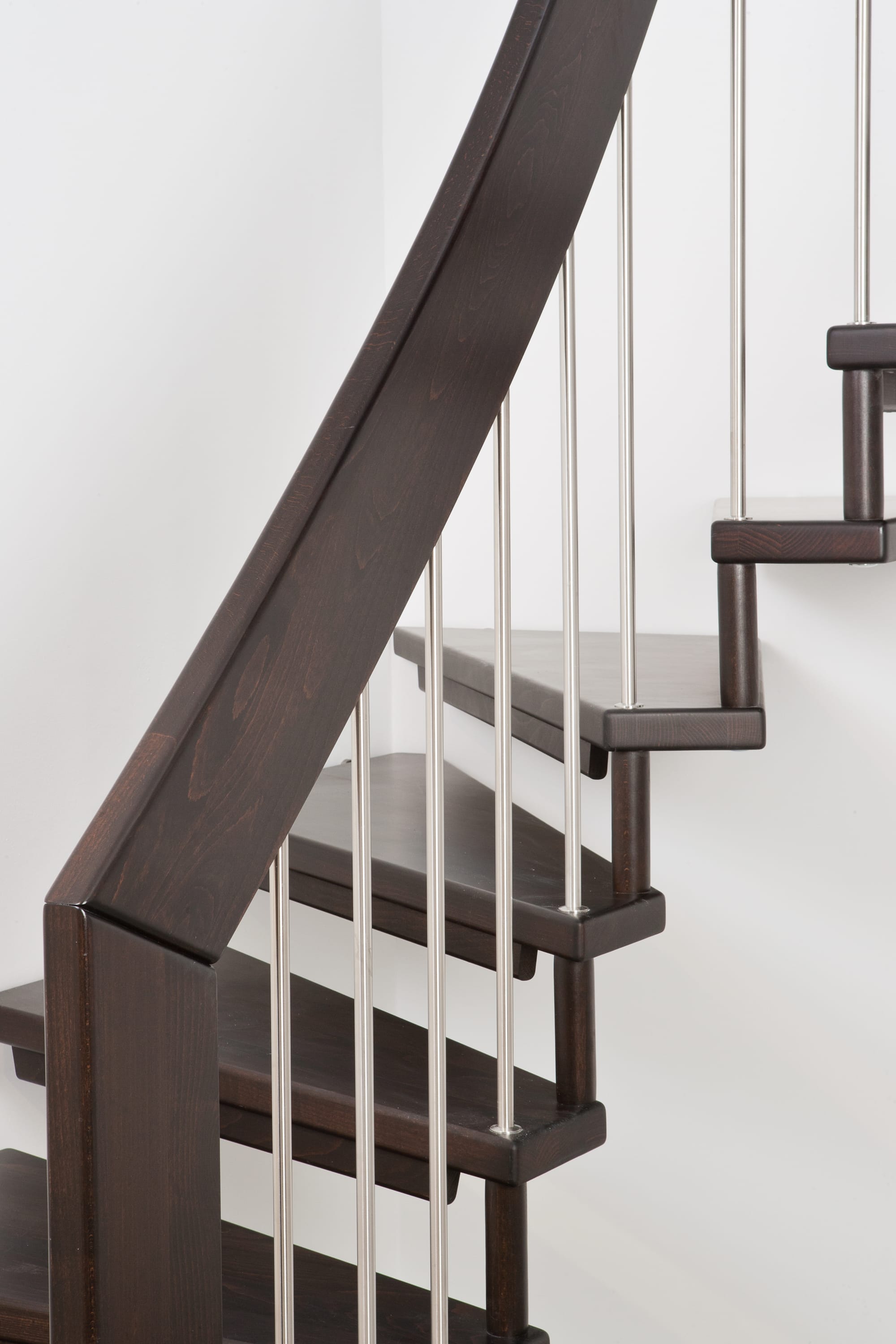 1/2 gewendelte freitragende Treppe, wandseitig gummigelagert; Holzart Buche auf Wenge gebeizt.
