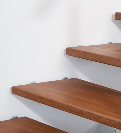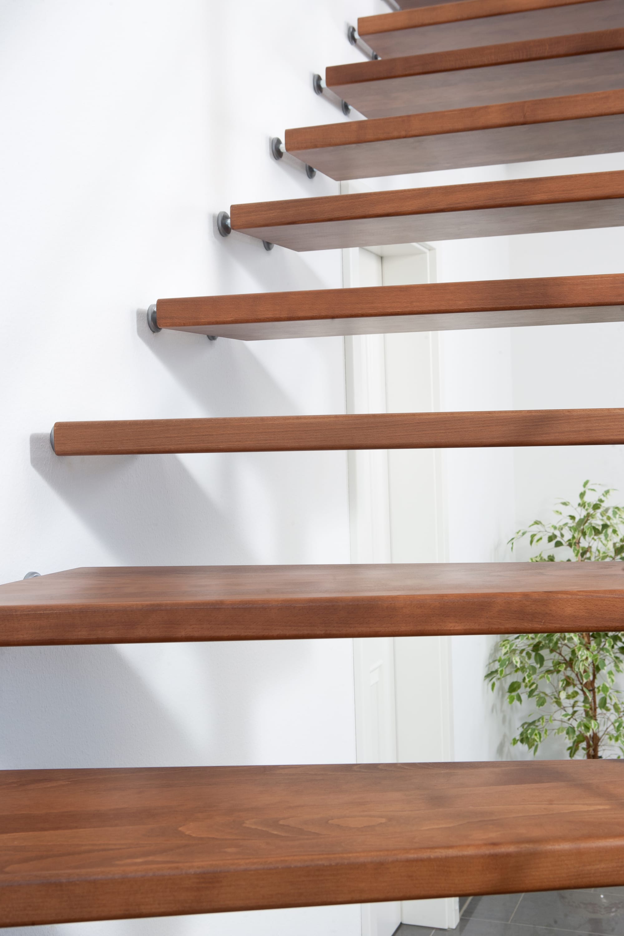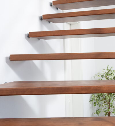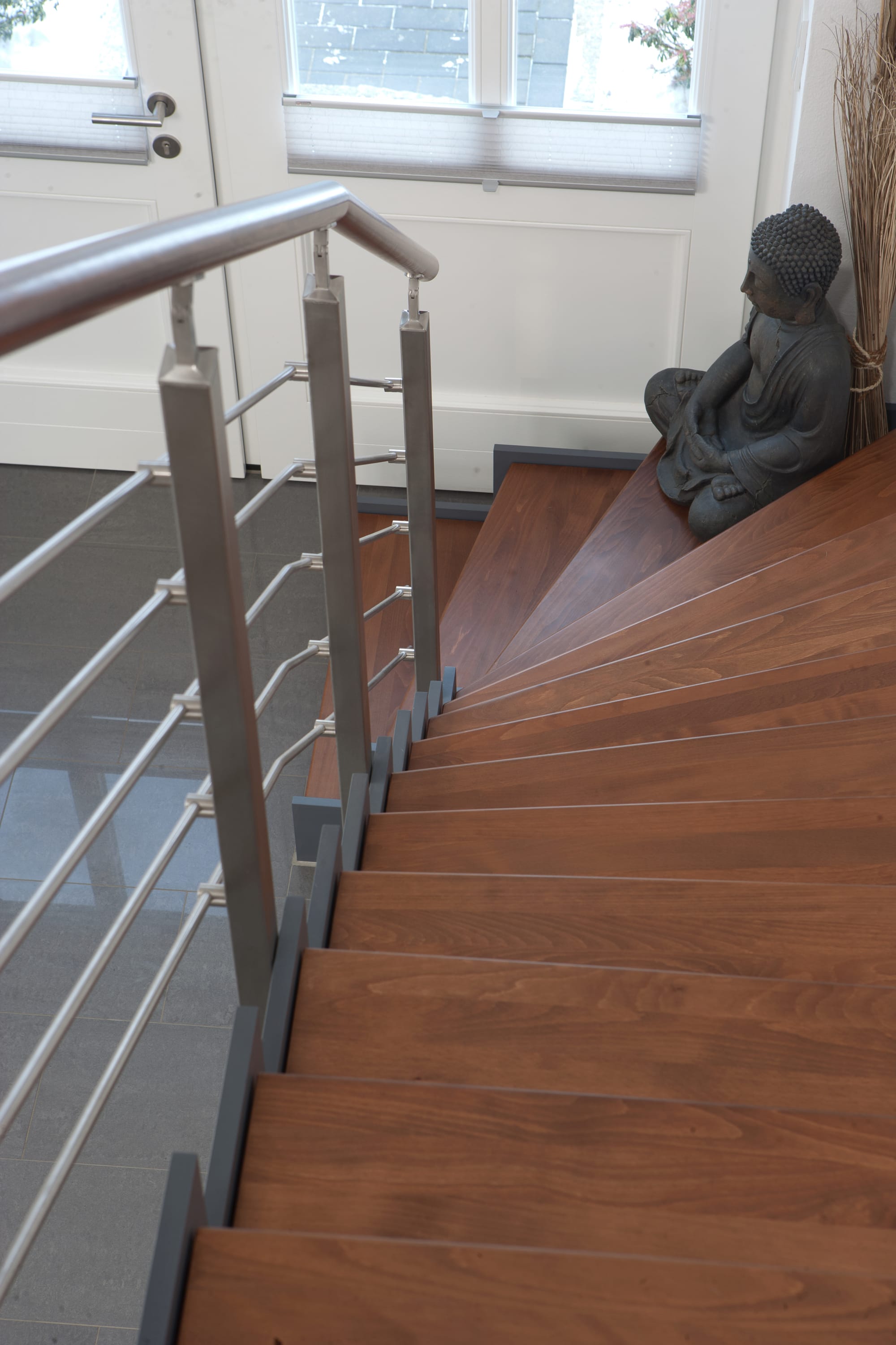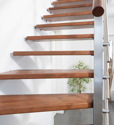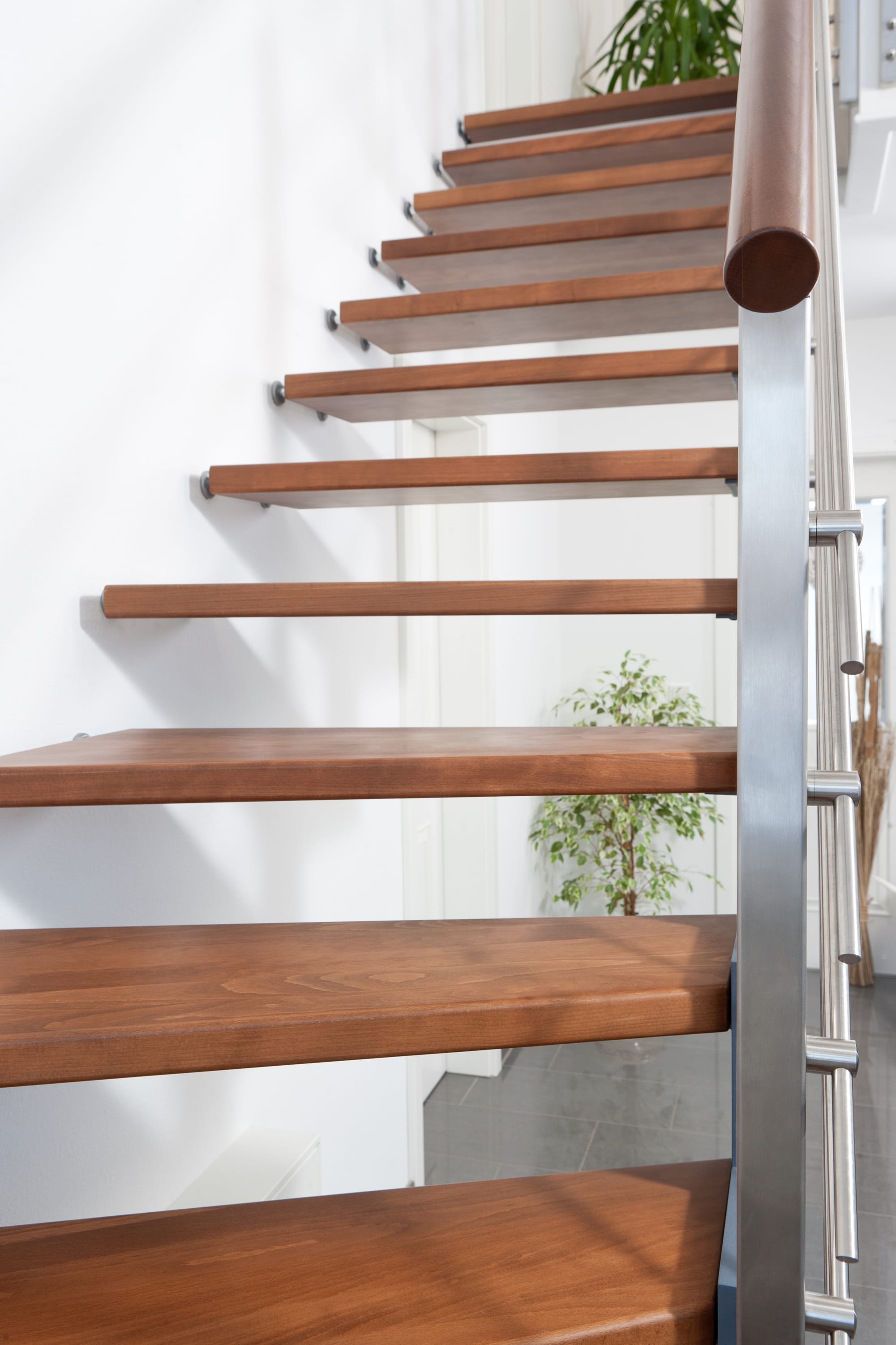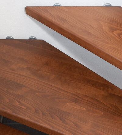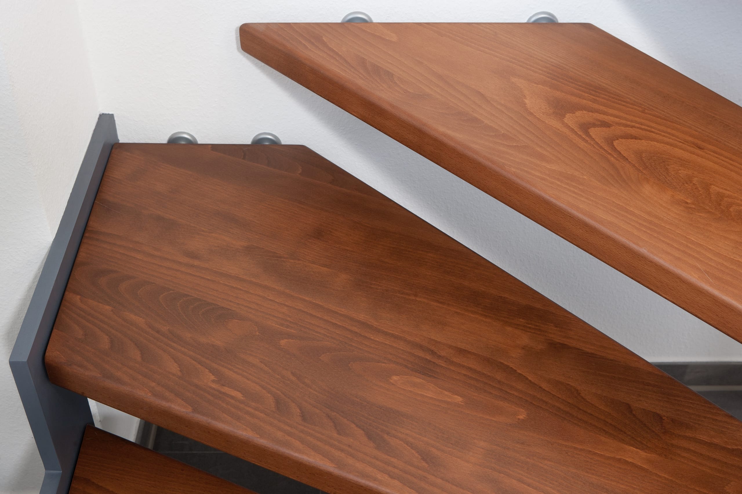 Freitragende Treppe mit abgetreppter Stahlwange, Stufen und Handlauf Holzart Buche gebeizt auf Nussbaum, Milano-Geländer.
