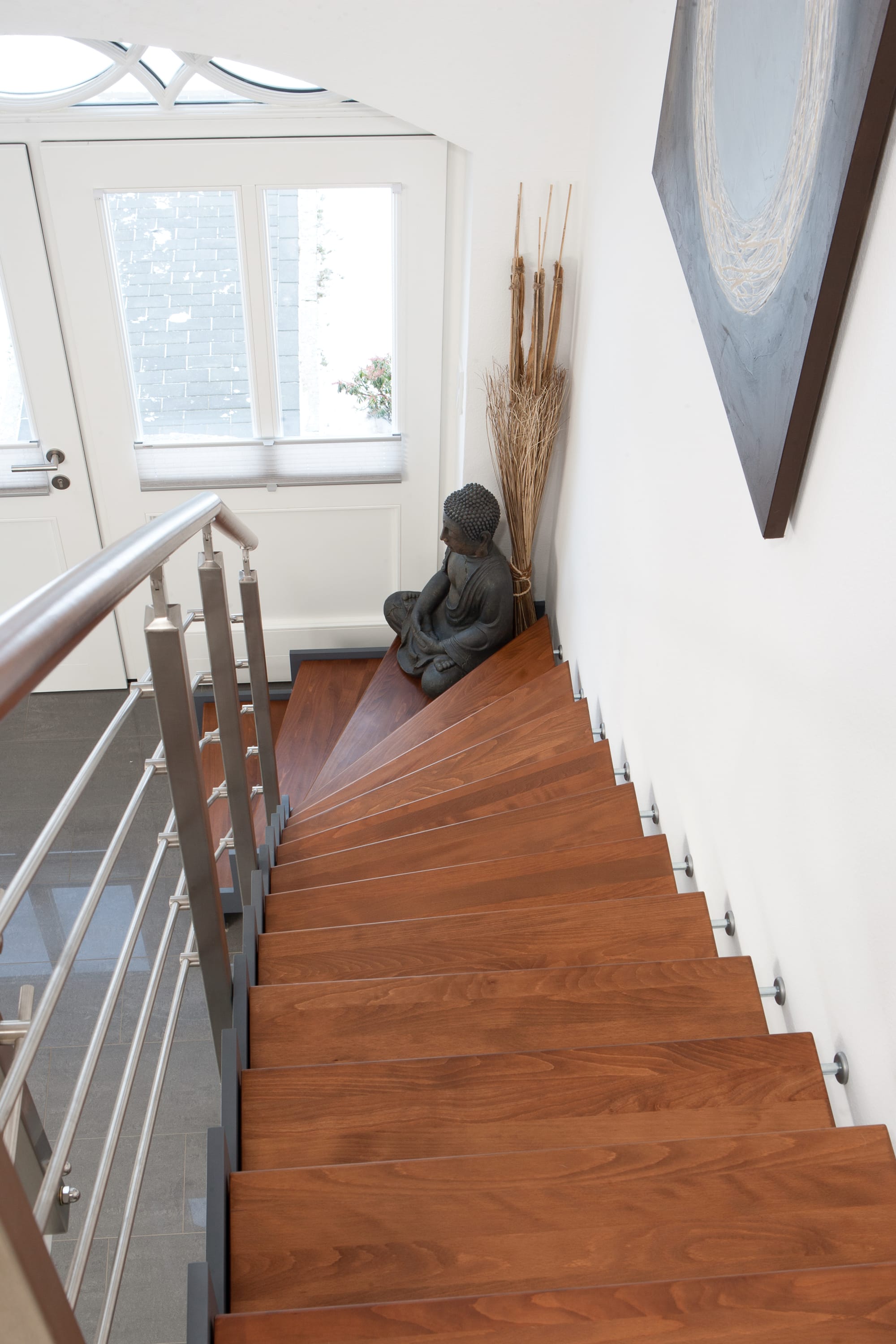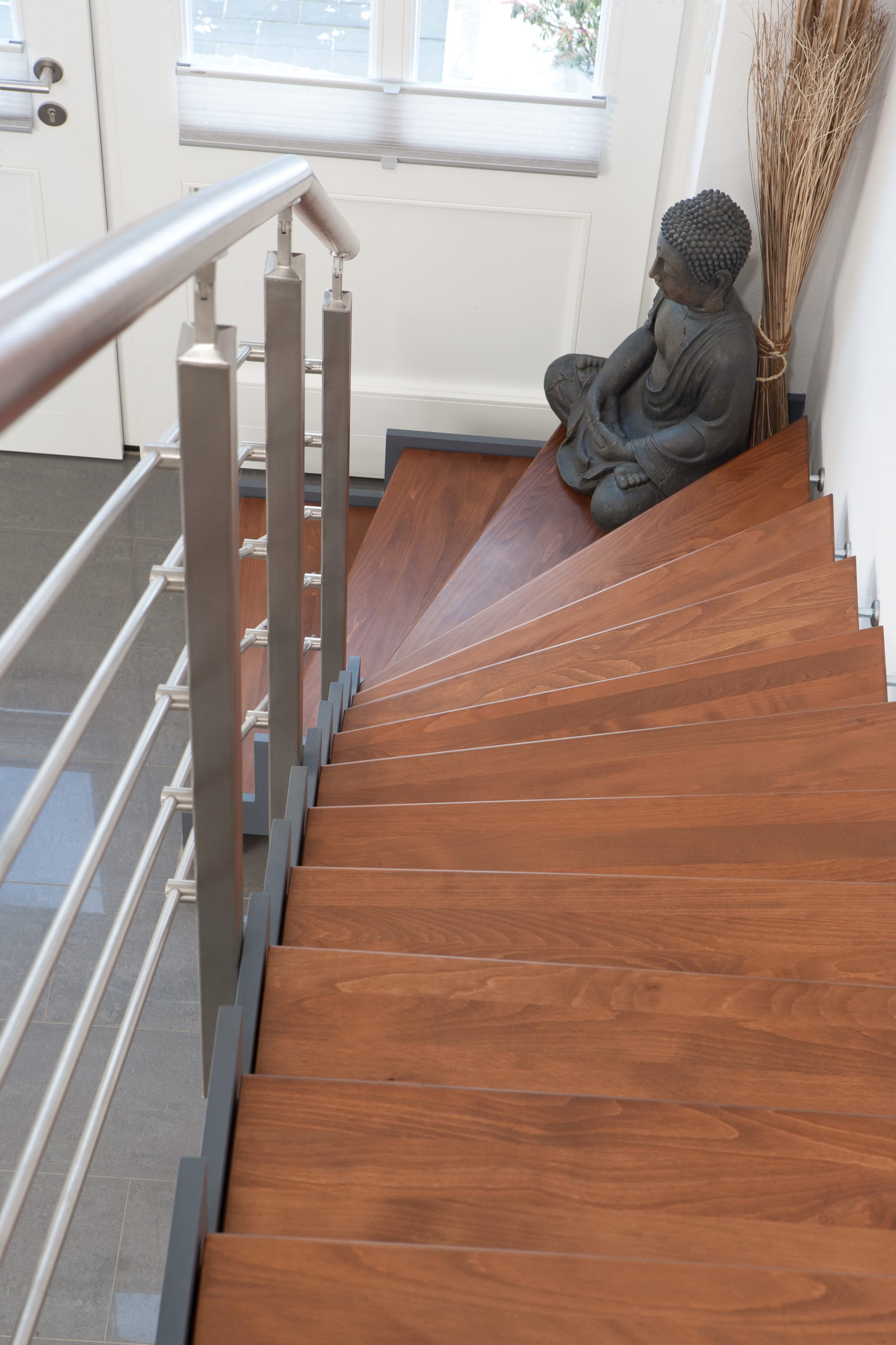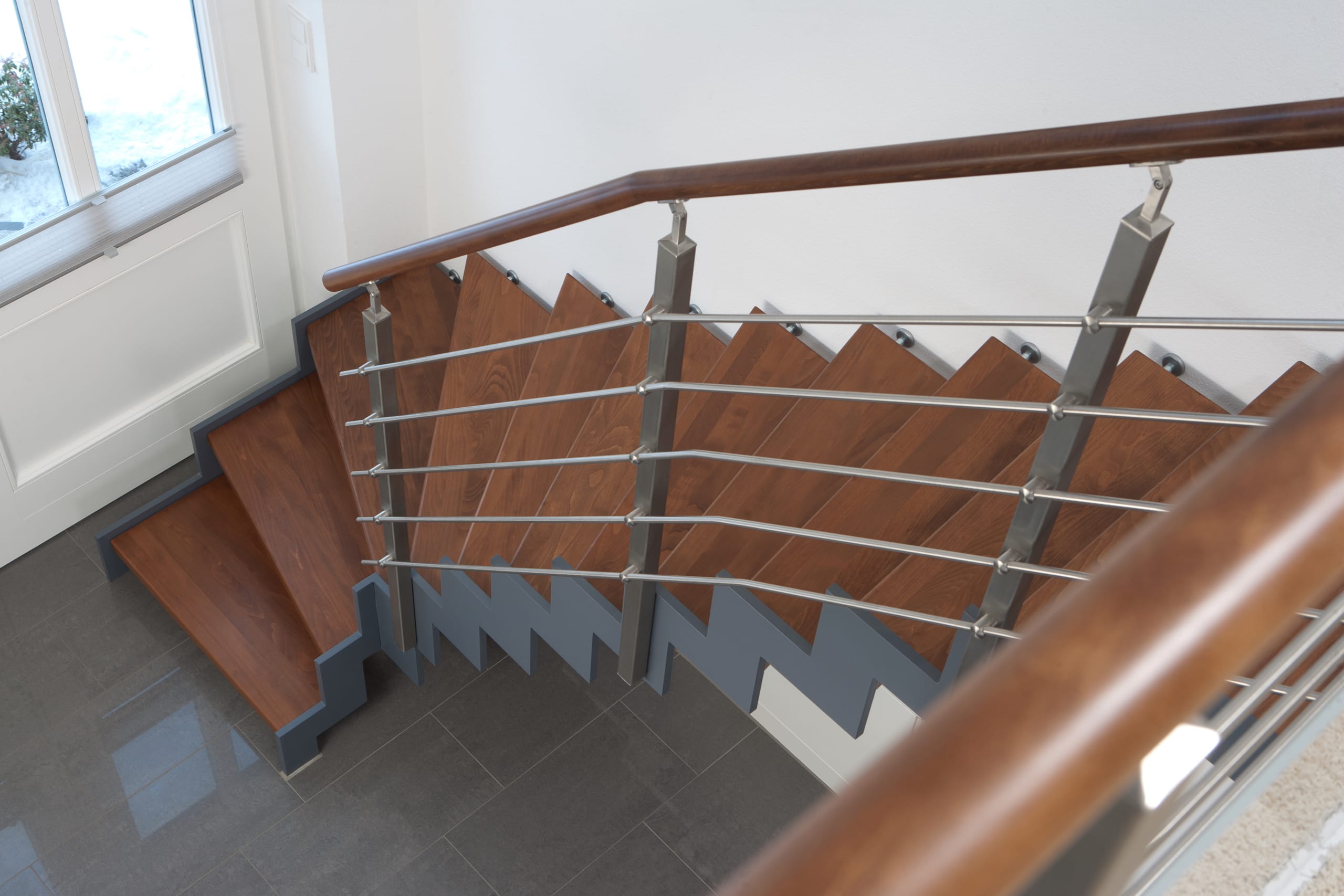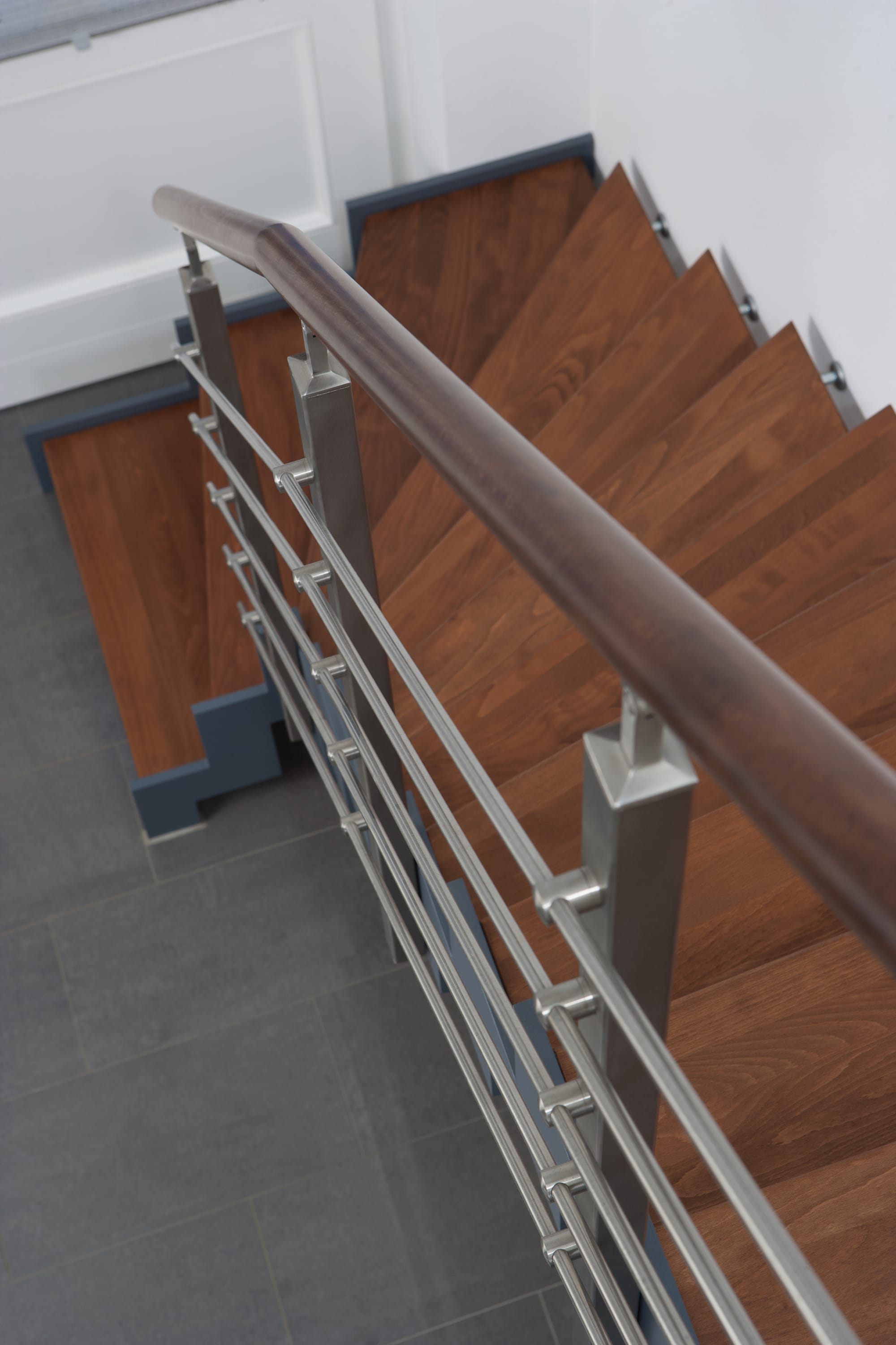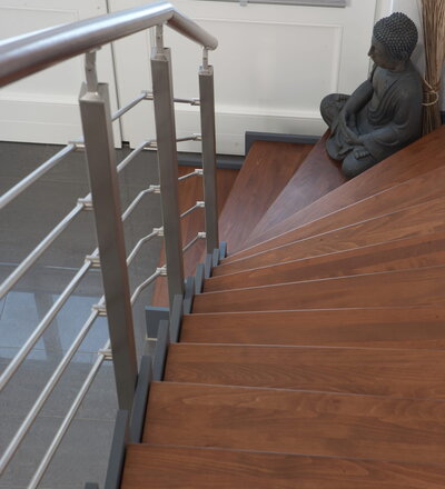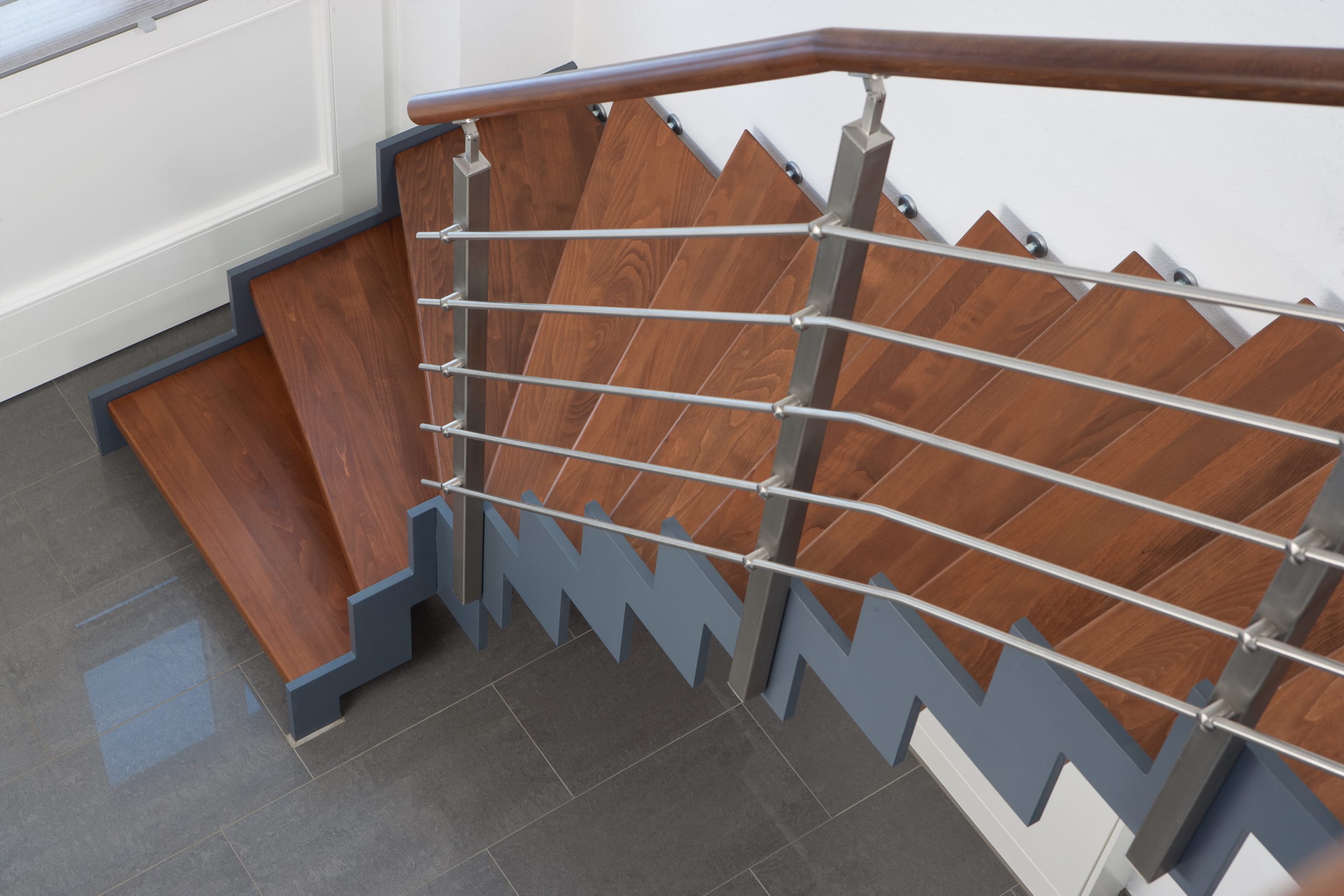 Freitragende Treppe mit abgetreppter Stahlwange, Stufen und Handlauf Holzart Buche gebeizt auf Nussbaum, Milano-Geländer.