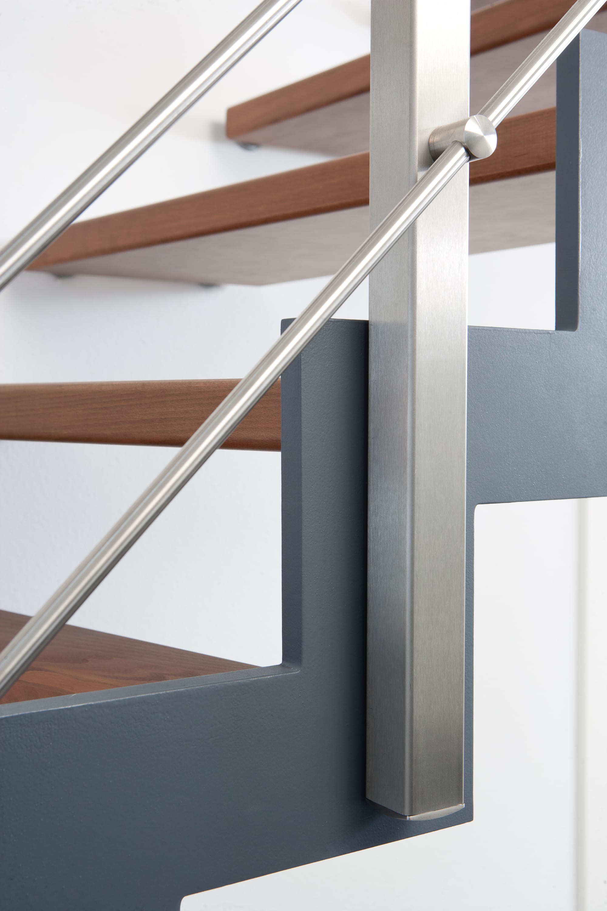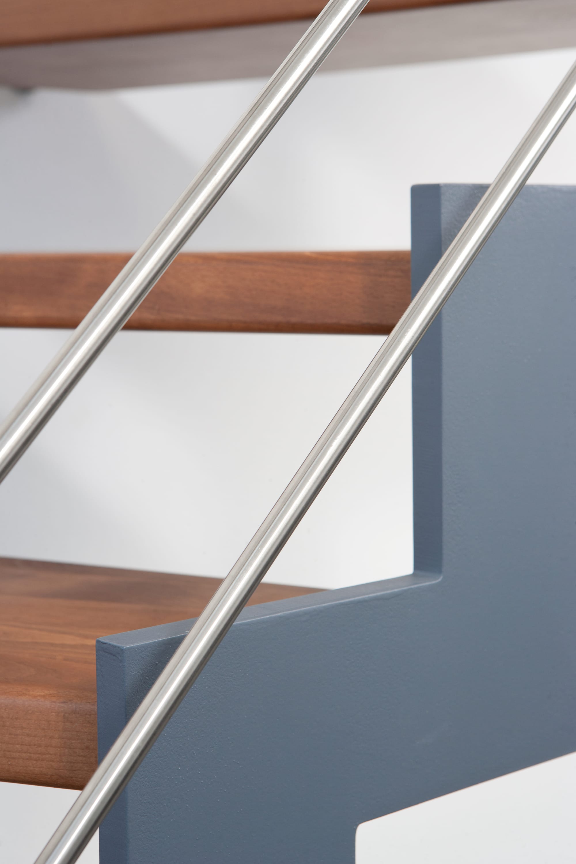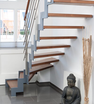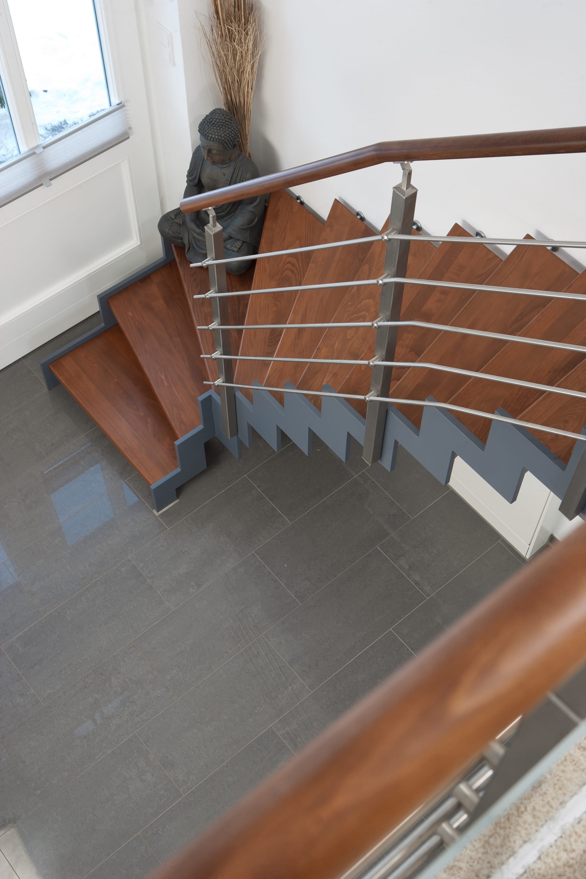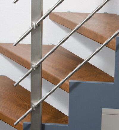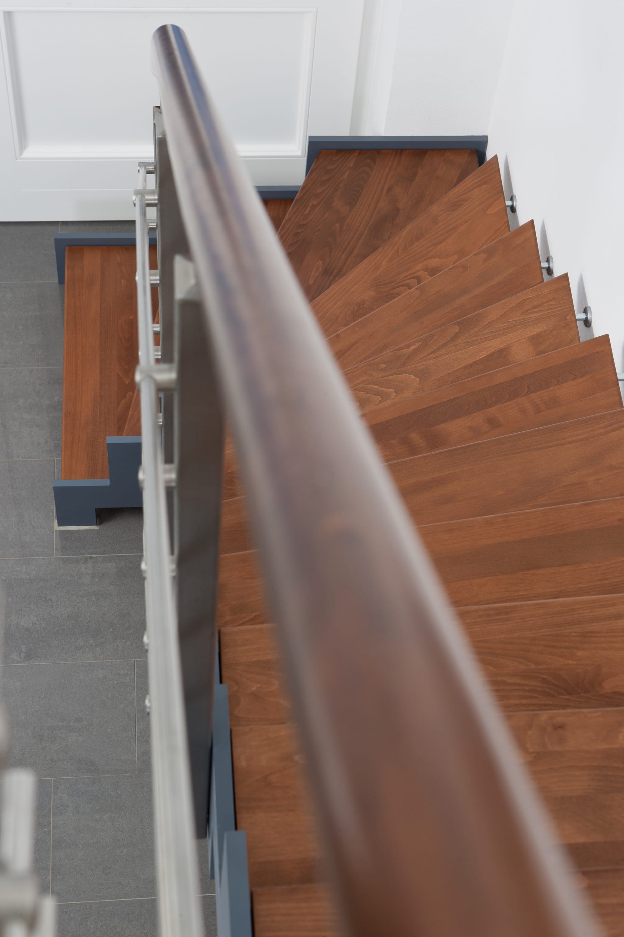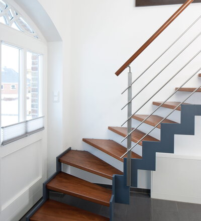 Freitragende Treppe mit abgetreppter Stahlwange, Stufen und Handlauf Holzart Buche gebeizt auf Nussbaum, Milano-Geländer.