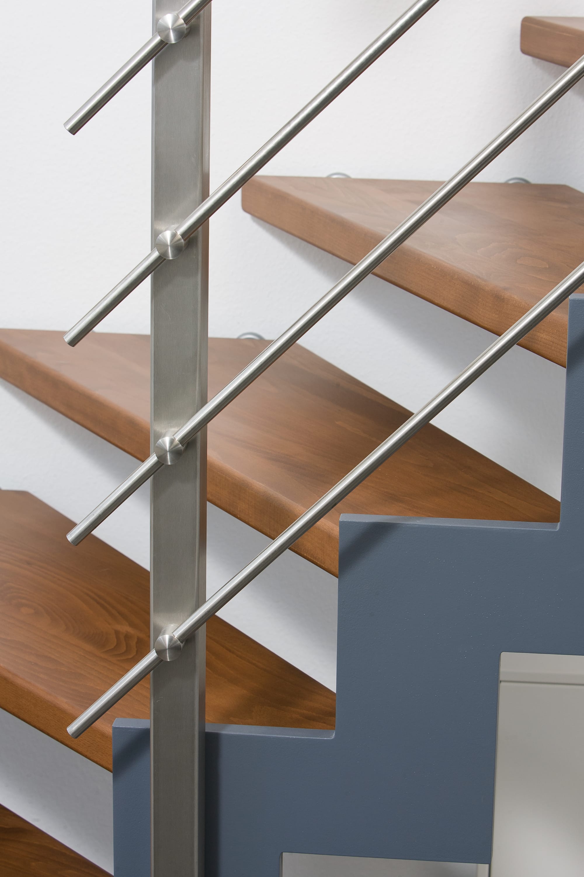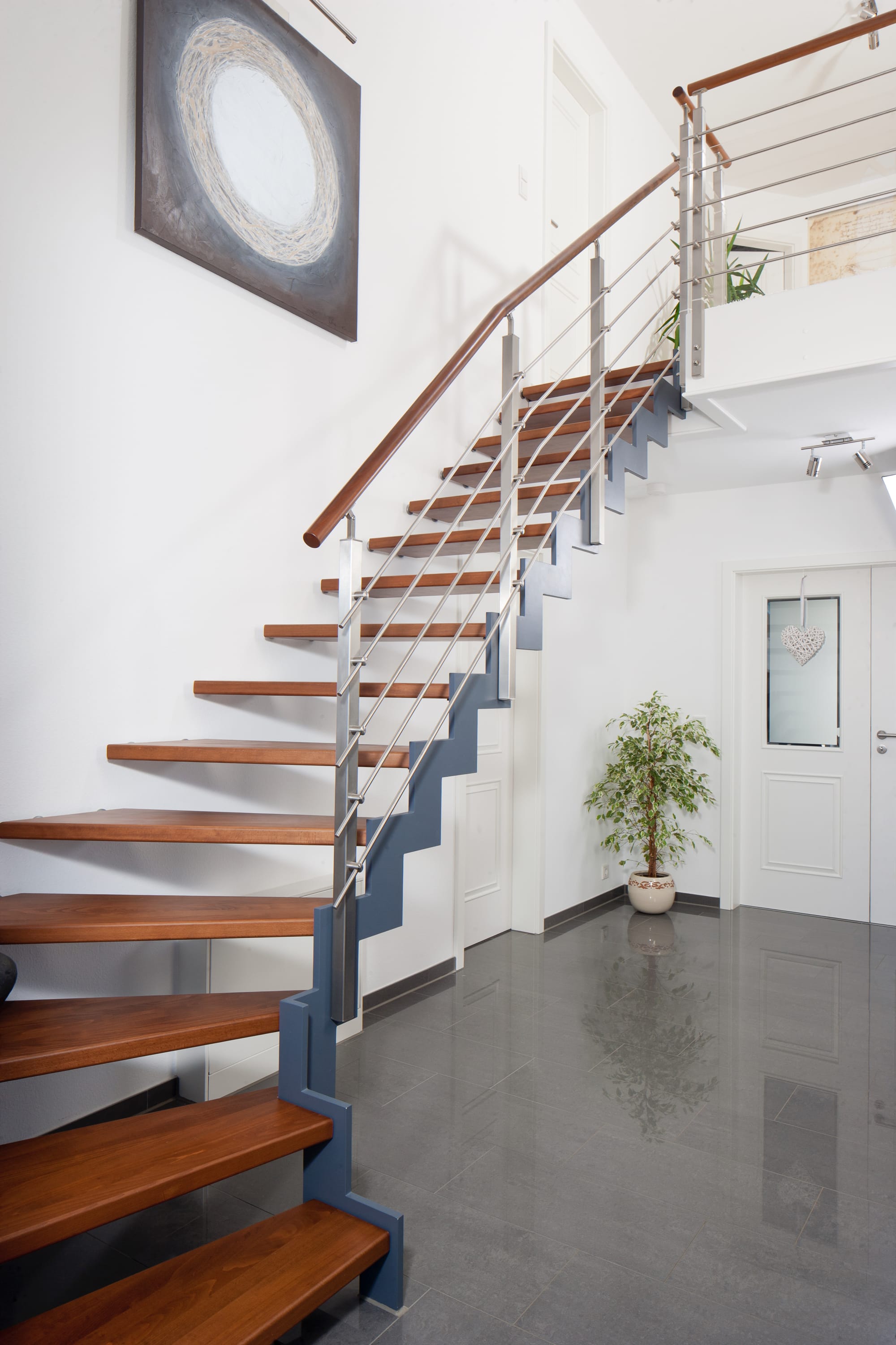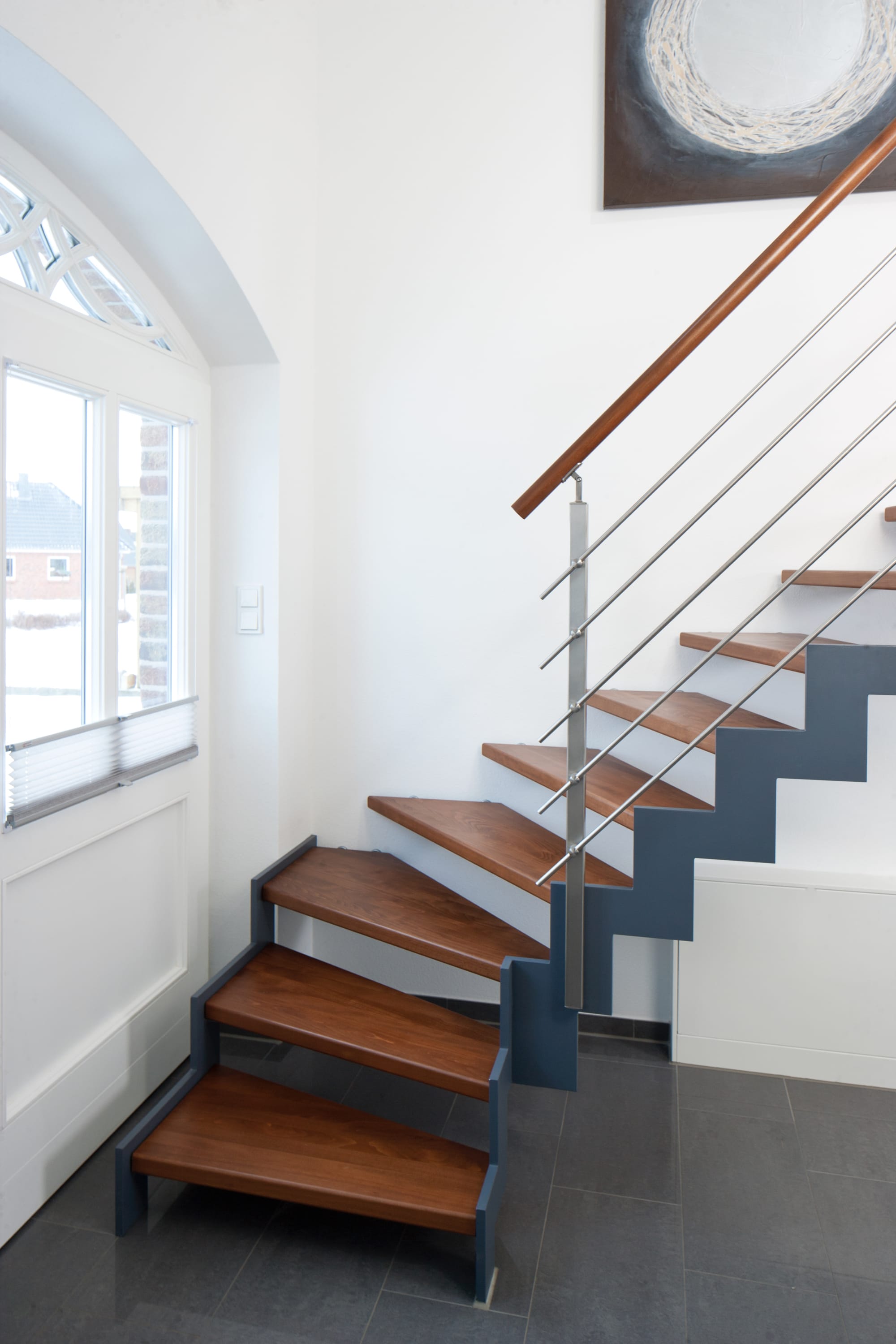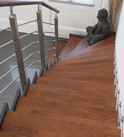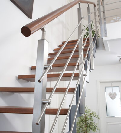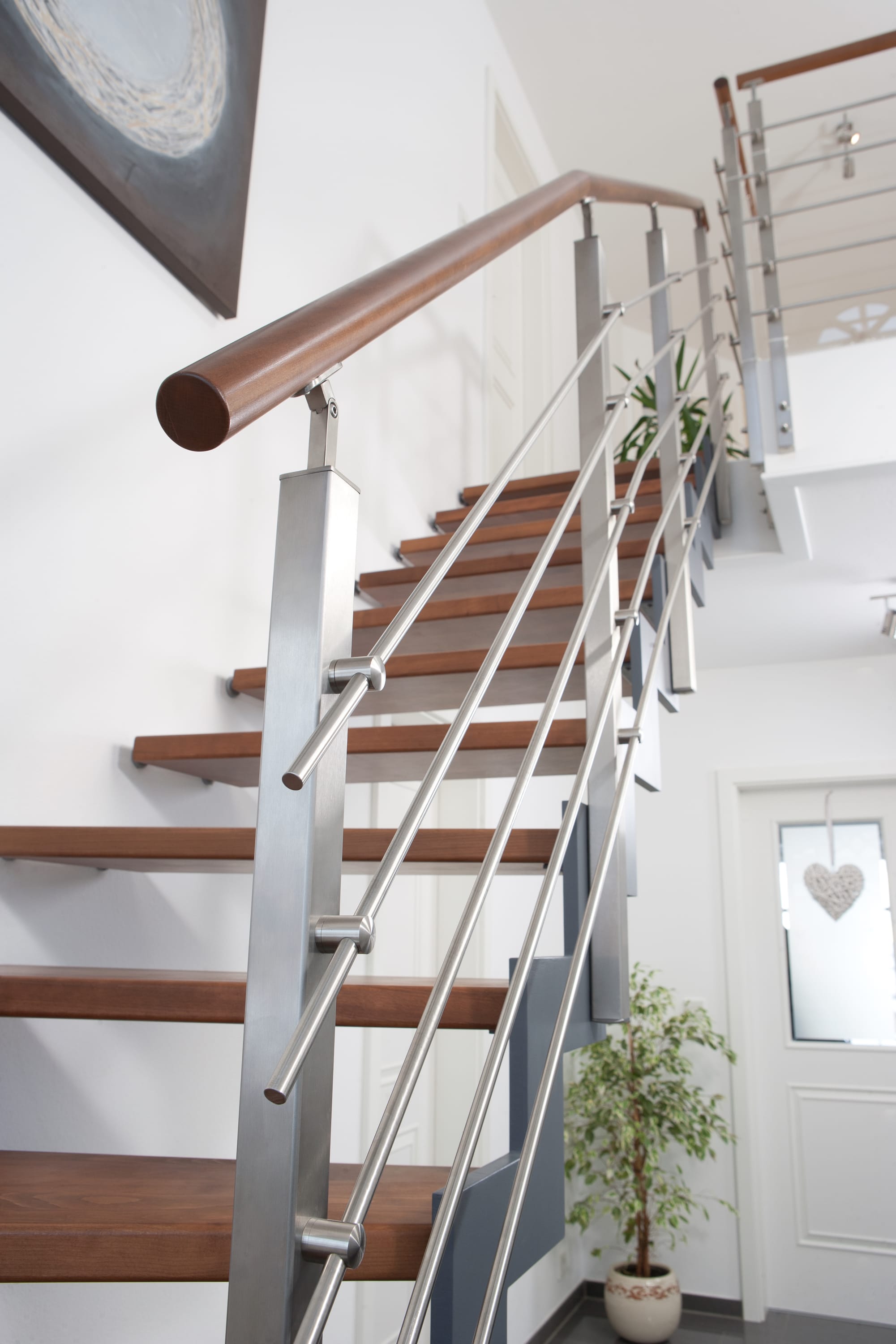 Freitragende Treppe mit abgetreppter Stahlwange, Stufen und Handlauf Holzart Buche gebeizt auf Nussbaum, Milano-Geländer.