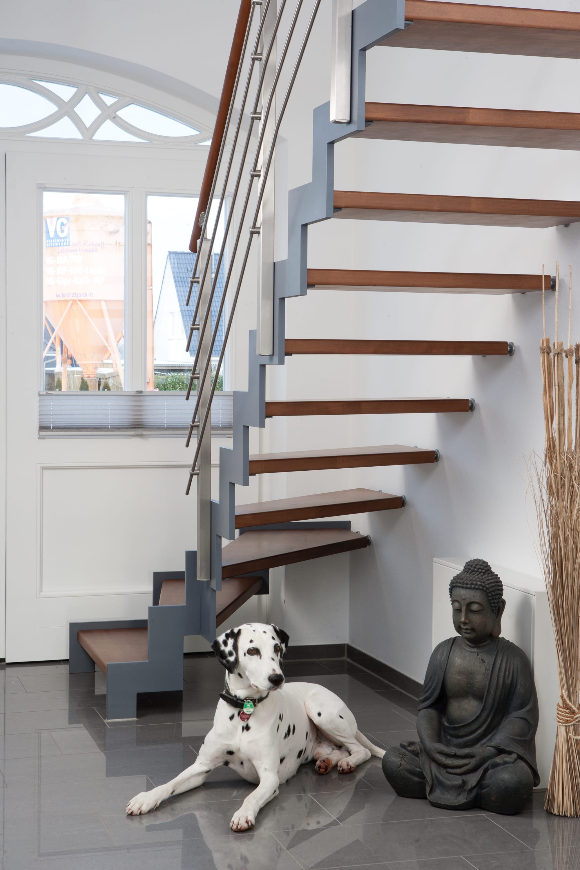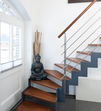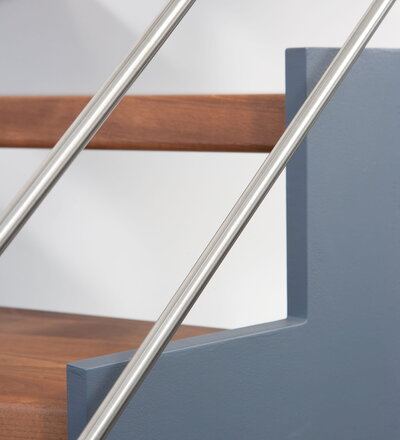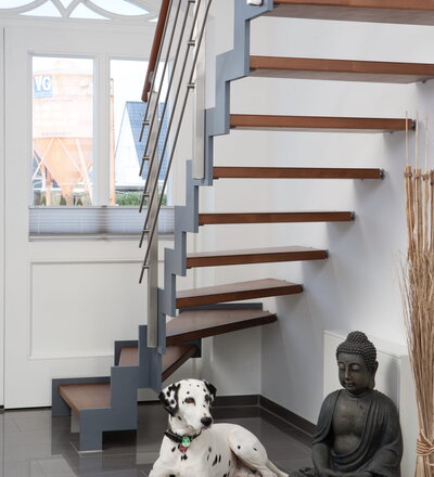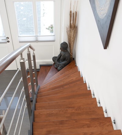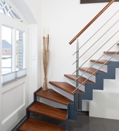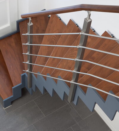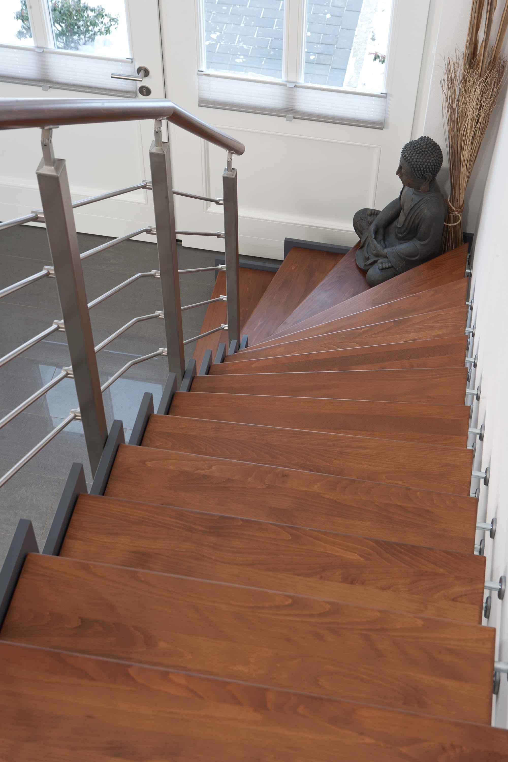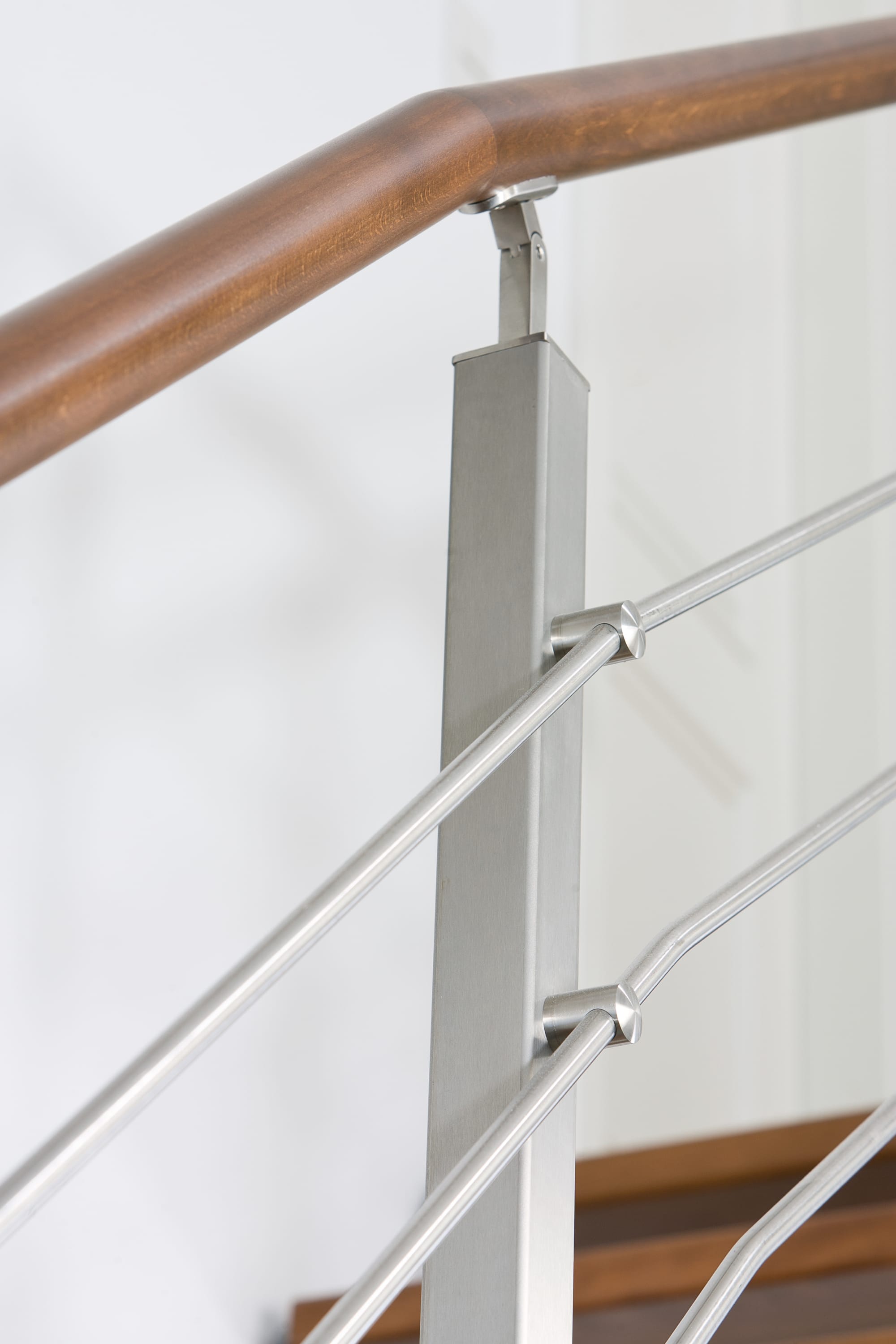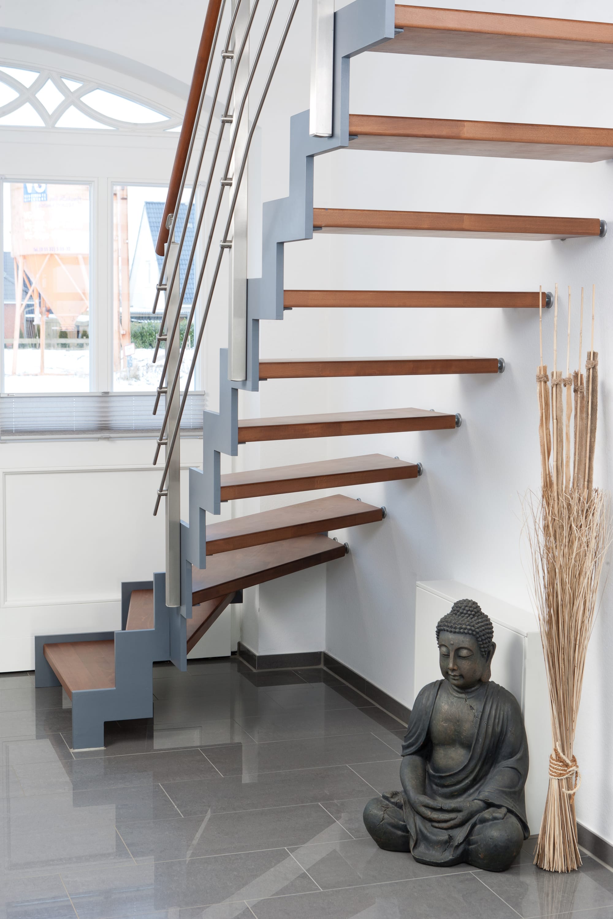 Freitragende Treppe mit abgetreppter Stahlwange, Stufen und Handlauf Holzart Buche gebeizt auf Nussbaum, Milano-Geländer.