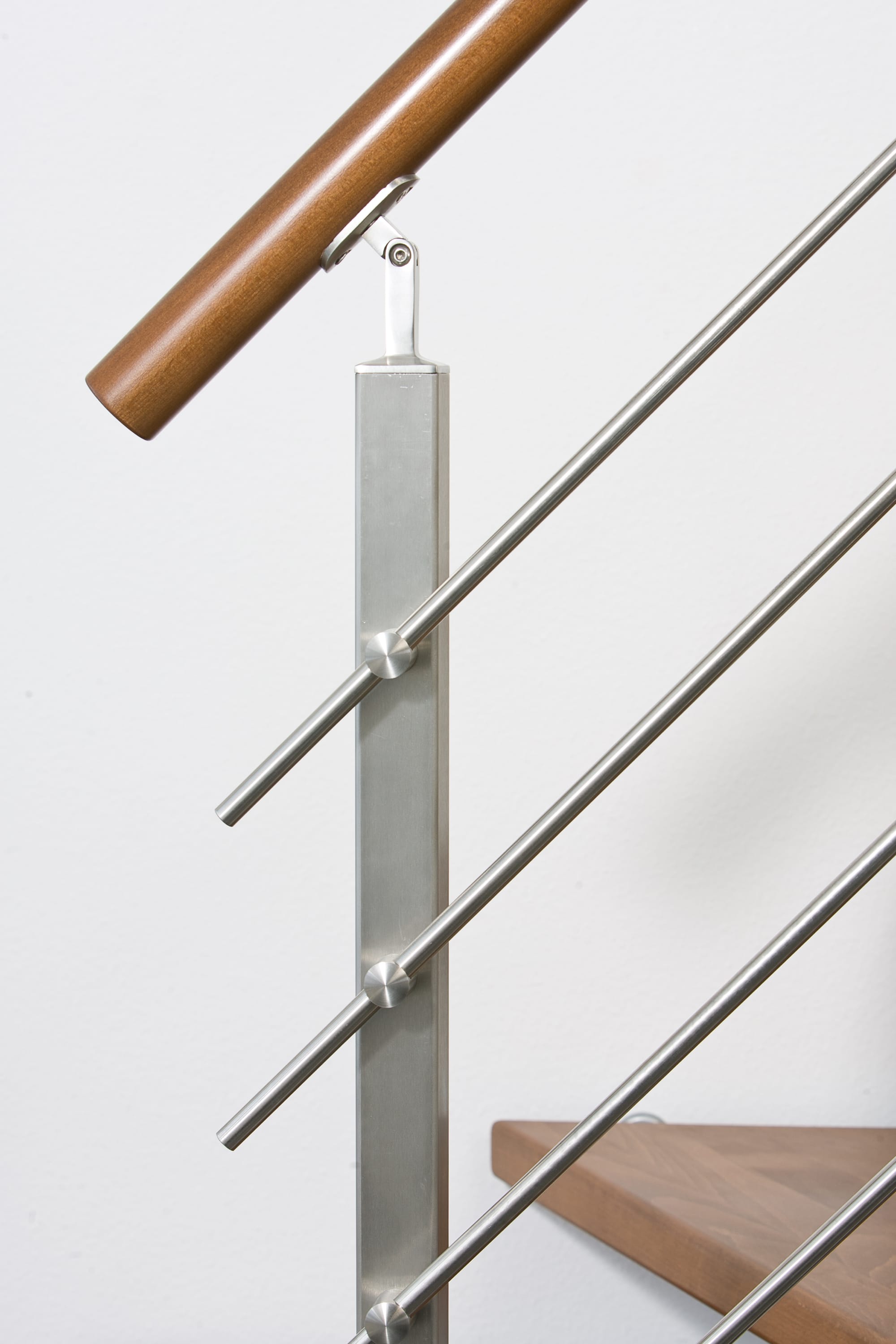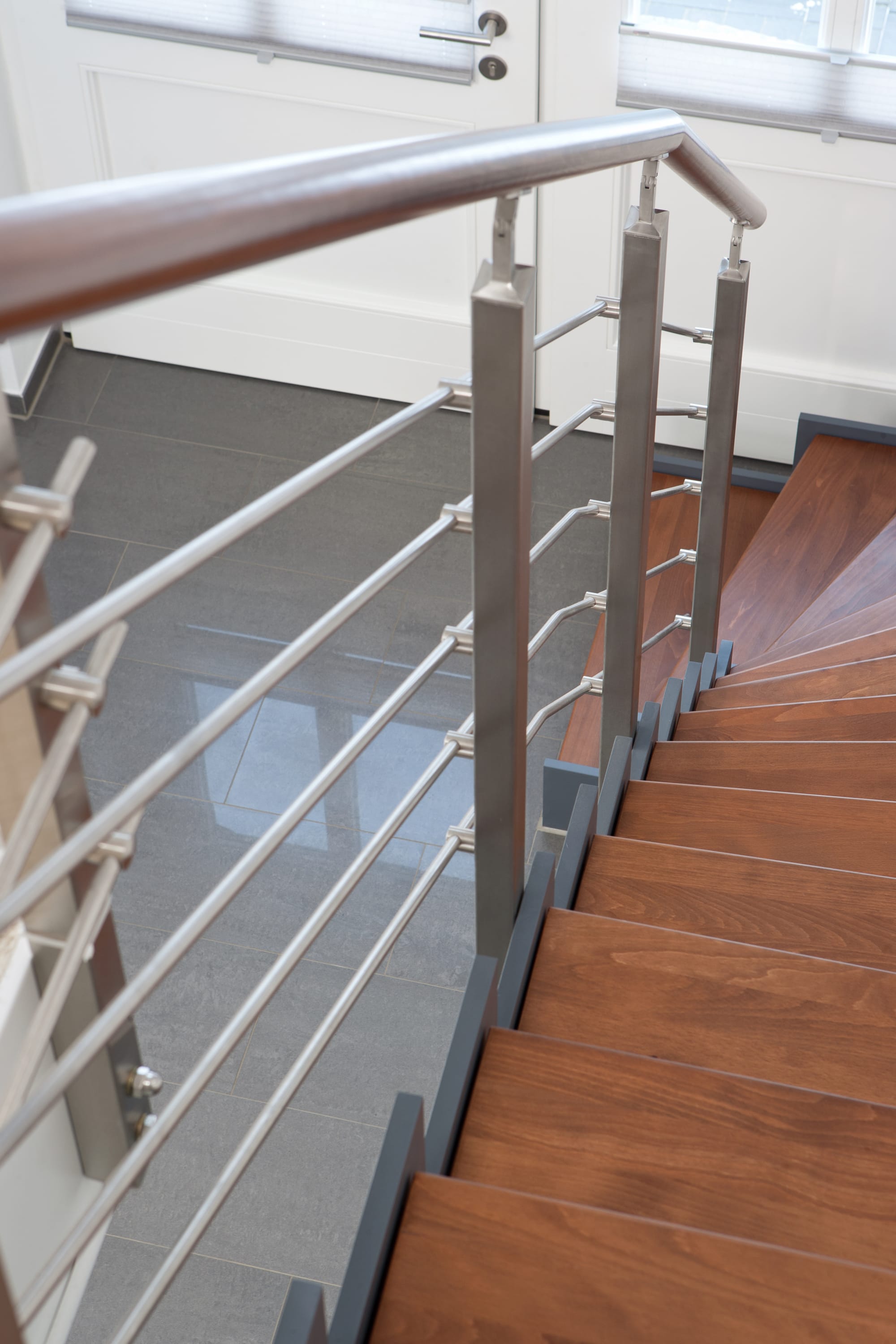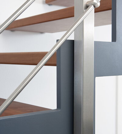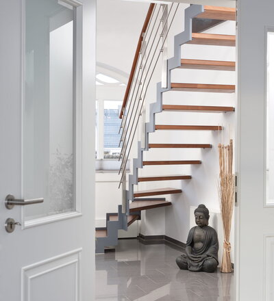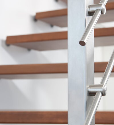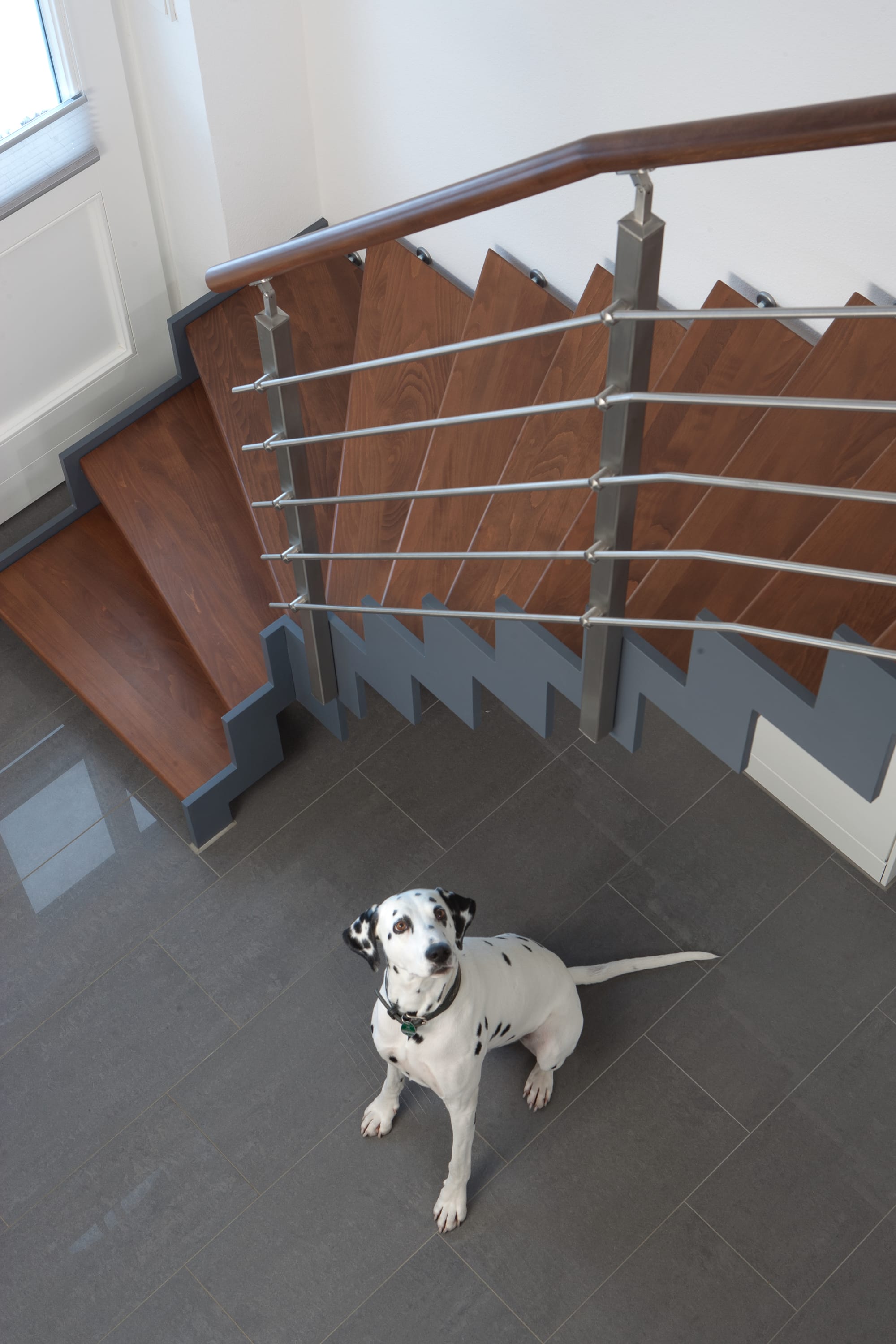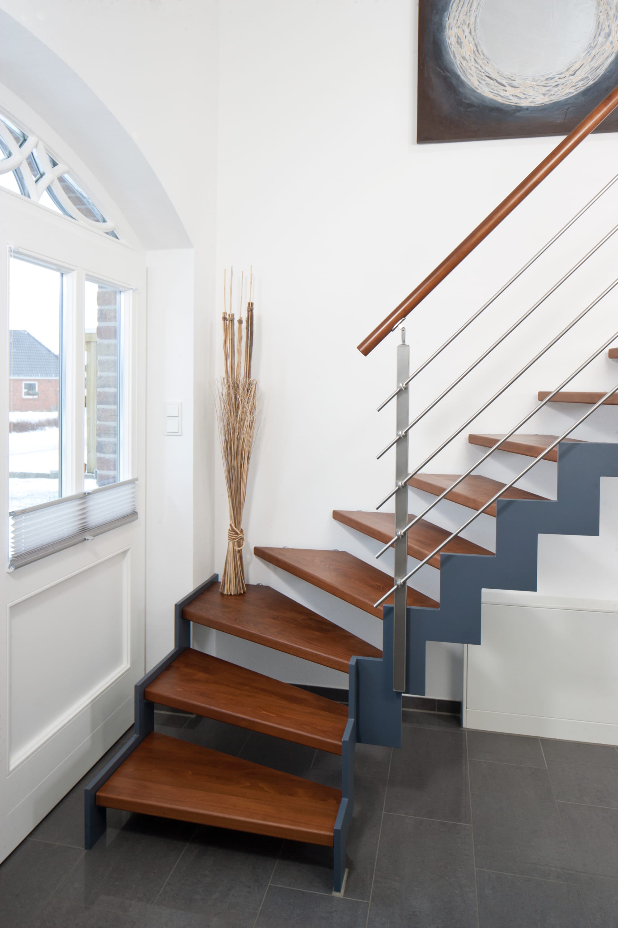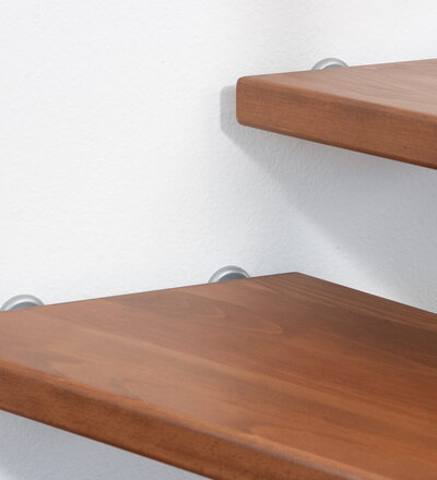 Freitragende Treppe mit abgetreppter Stahlwange, Stufen und Handlauf Holzart Buche gebeizt auf Nussbaum, Milano-Geländer.