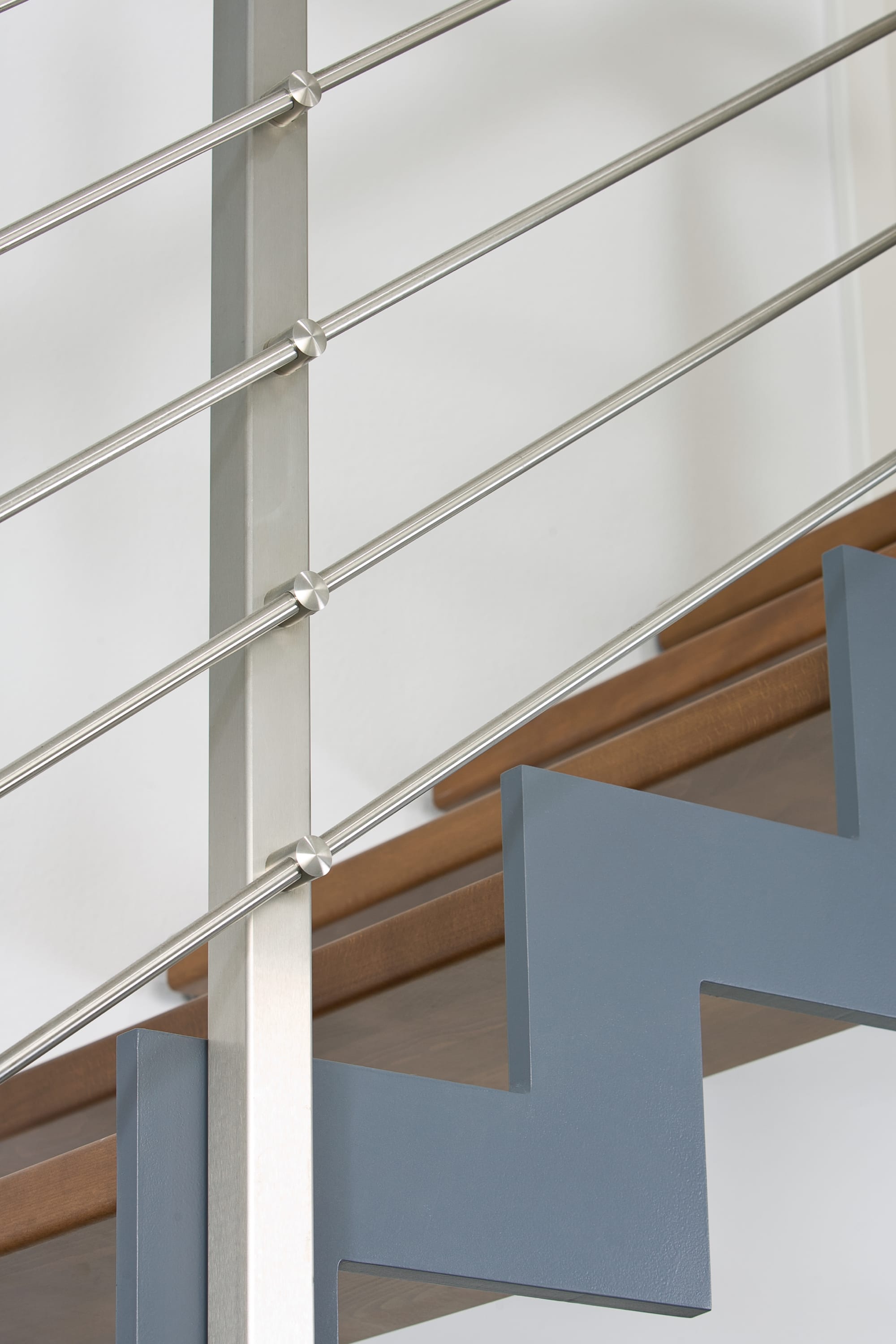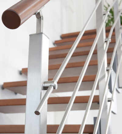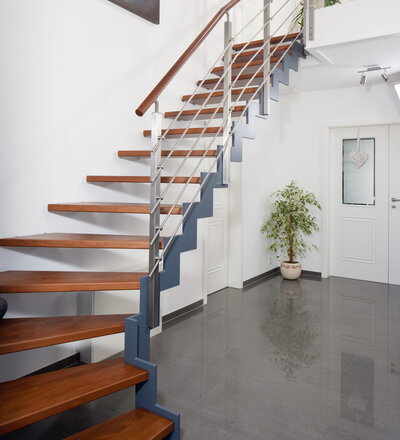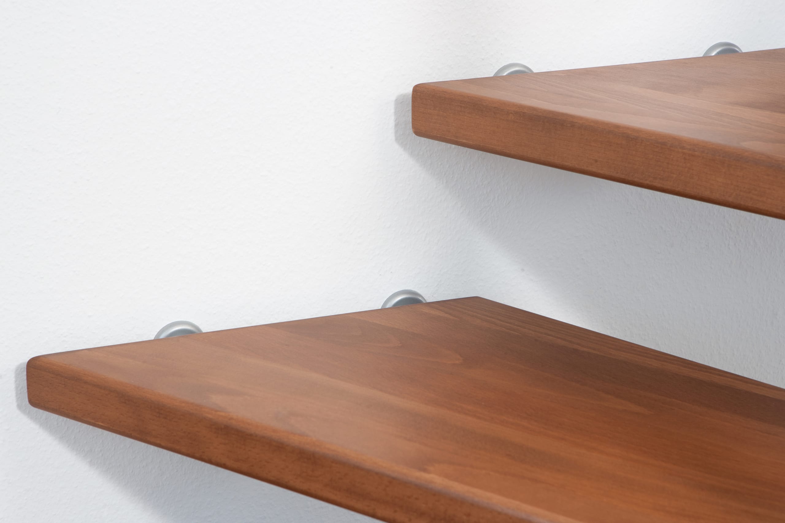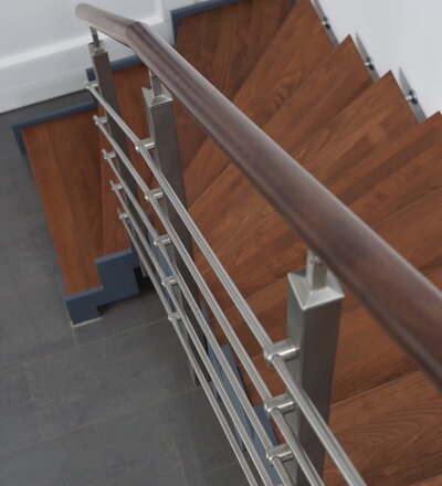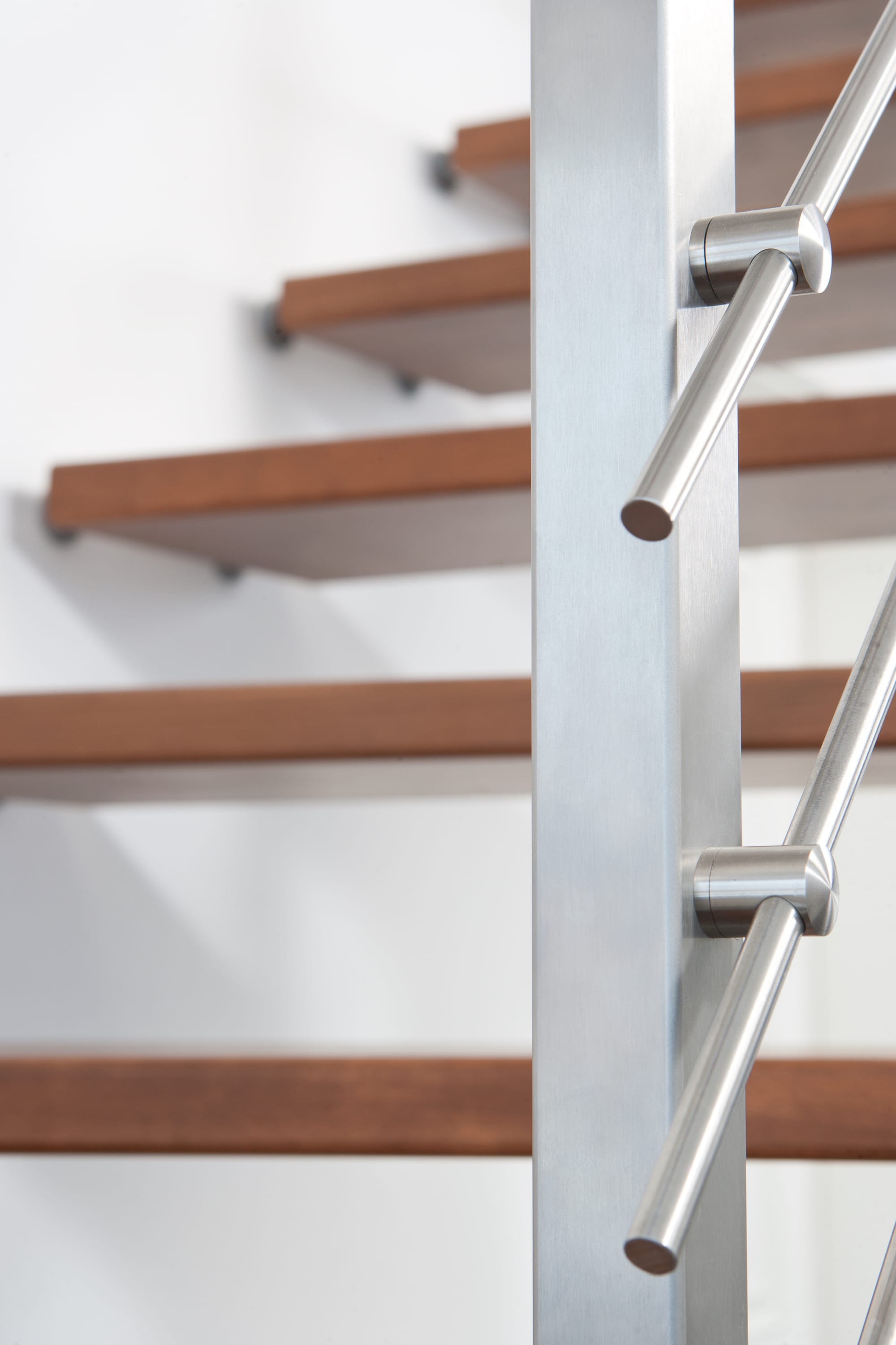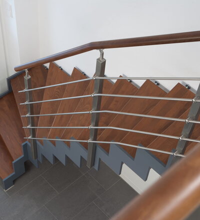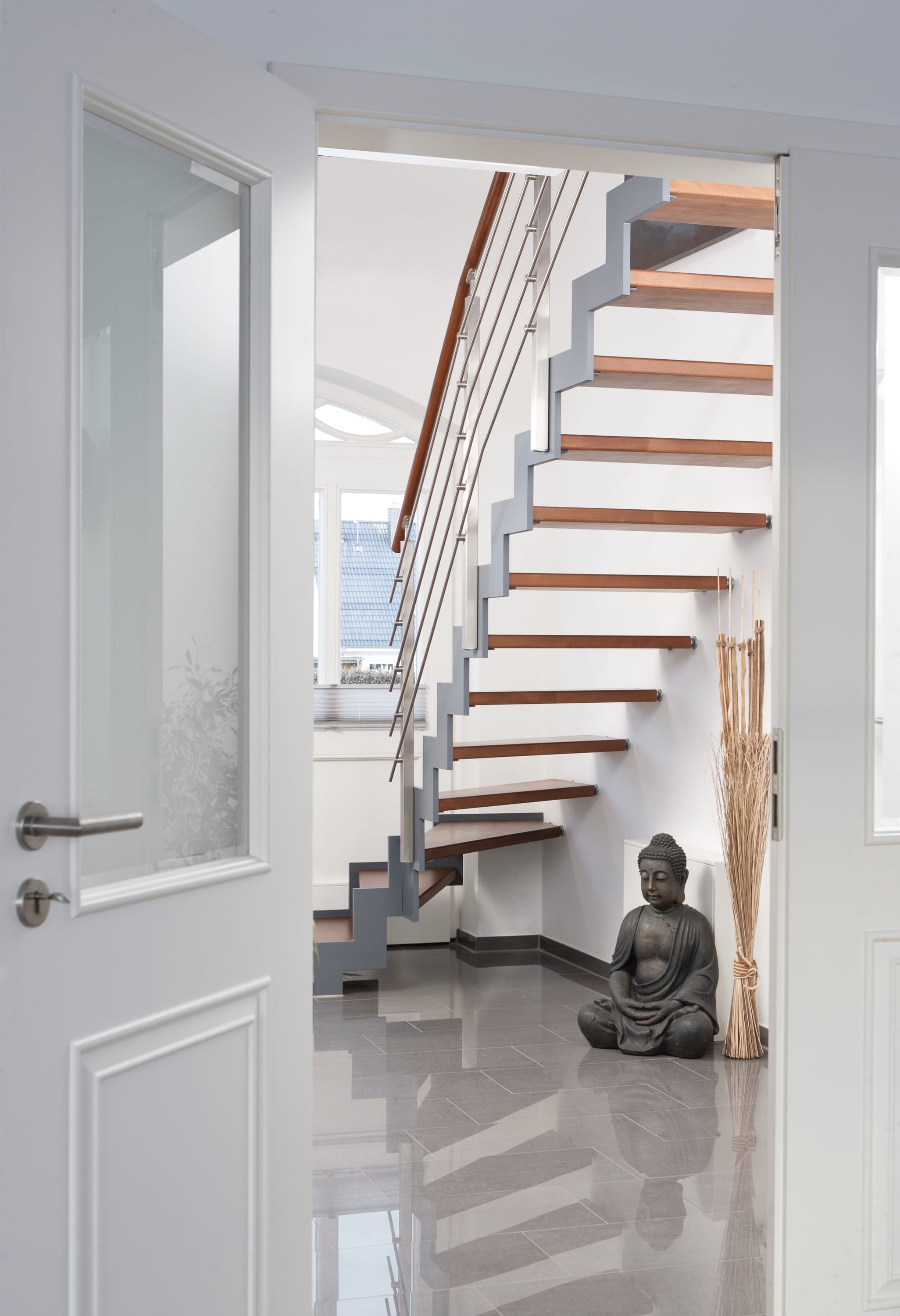 Freitragende Treppe mit abgetreppter Stahlwange, Stufen und Handlauf Holzart Buche gebeizt auf Nussbaum, Milano-Geländer.