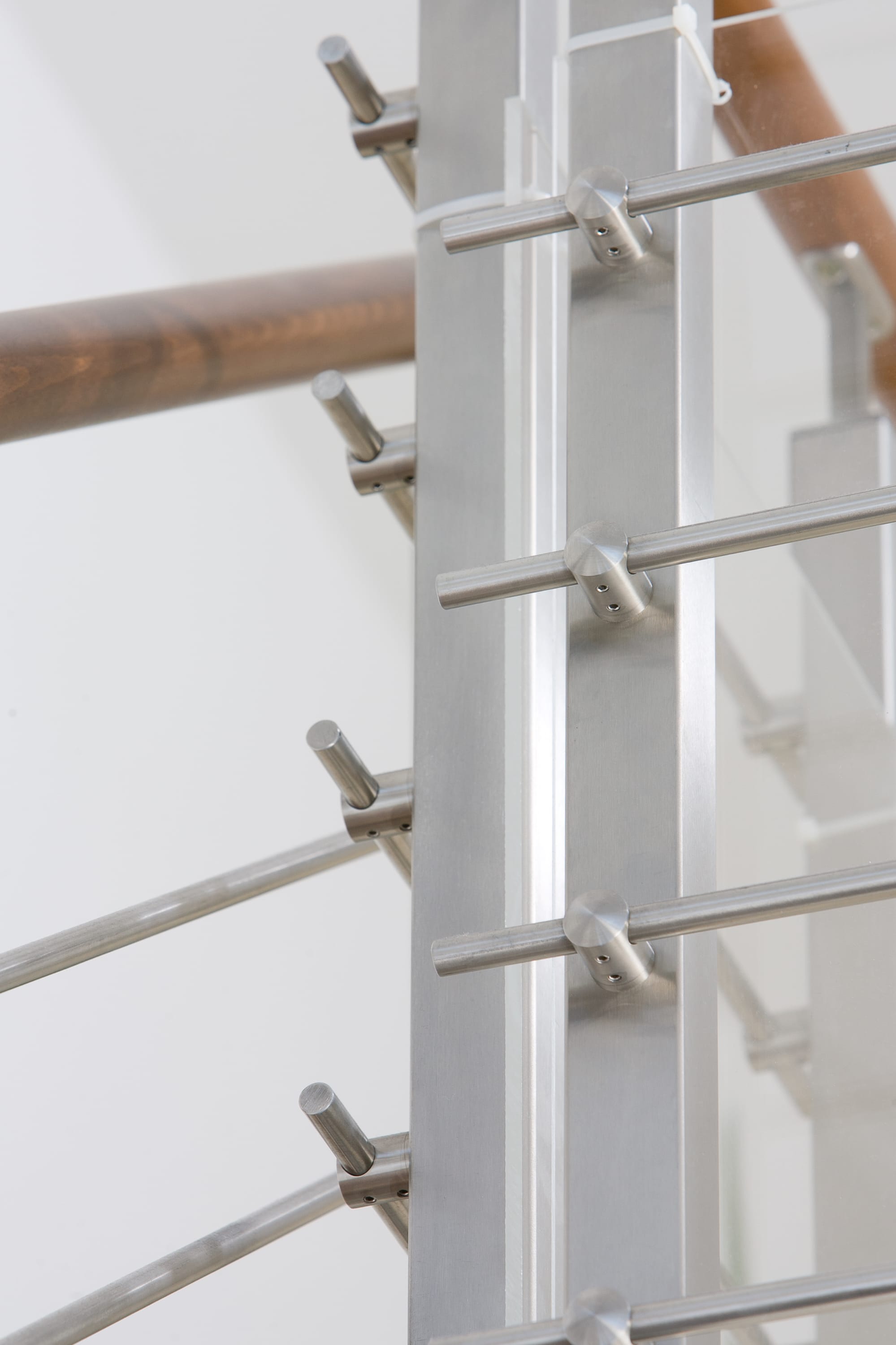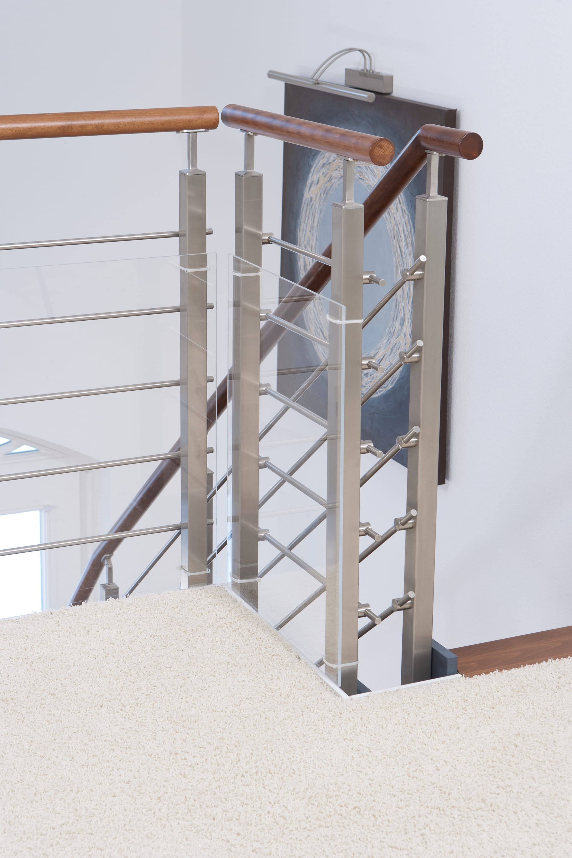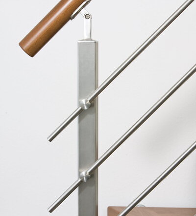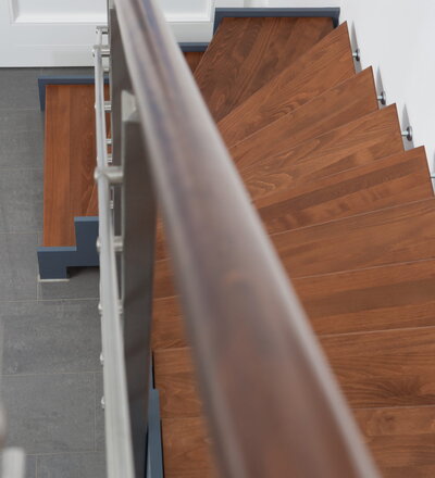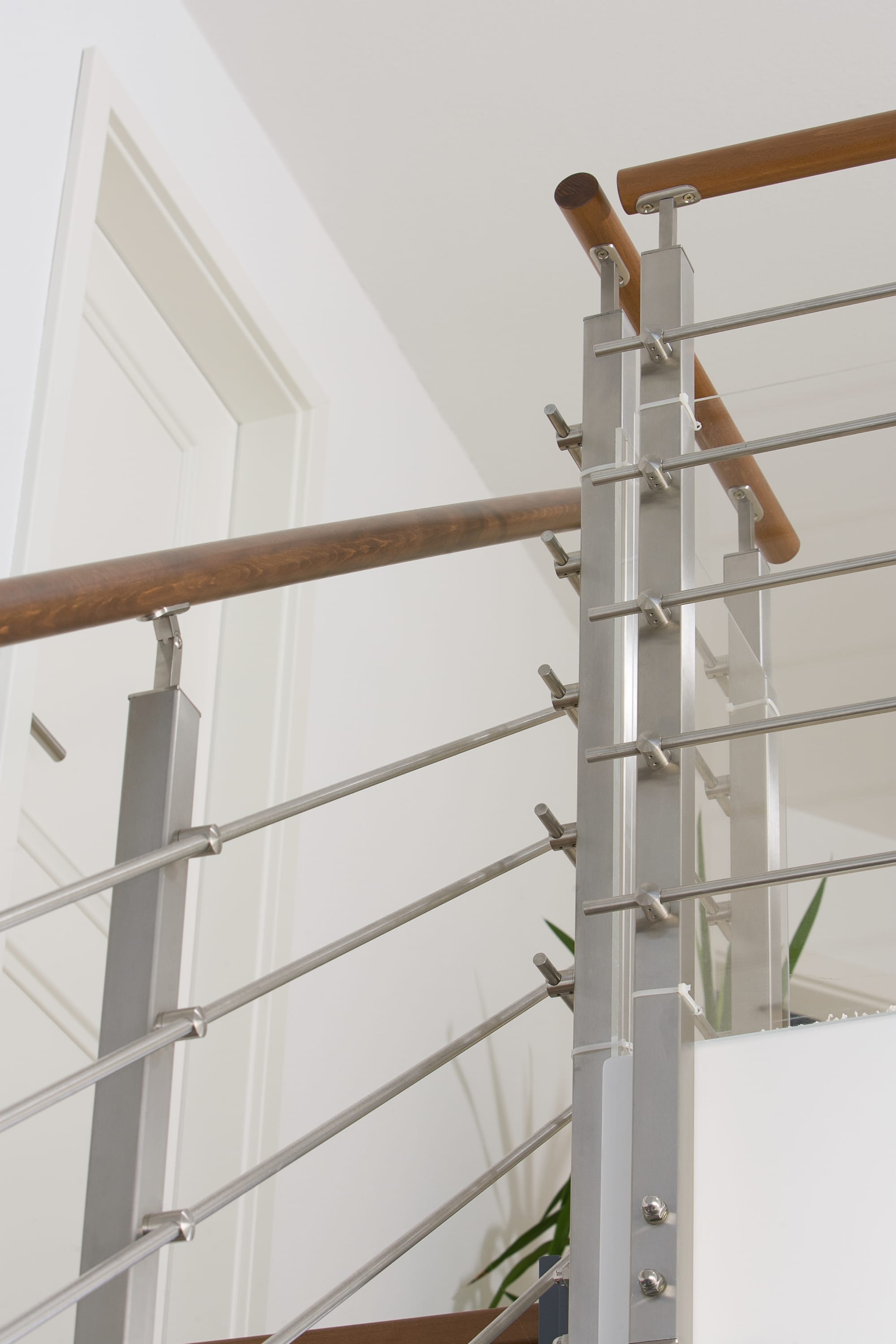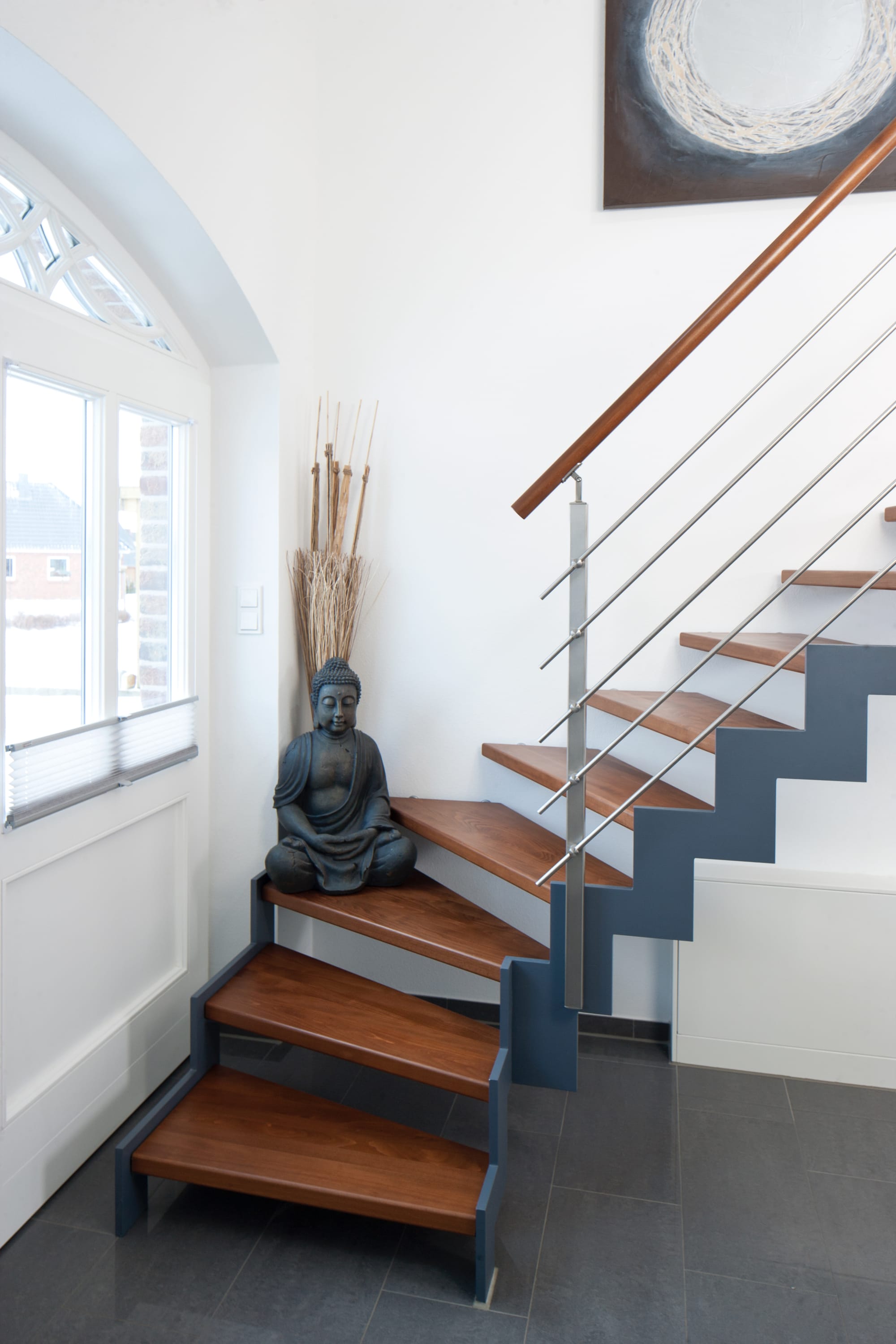 Freitragende Treppe mit abgetreppter Stahlwange, Stufen und Handlauf Holzart Buche gebeizt auf Nussbaum, Milano-Geländer.