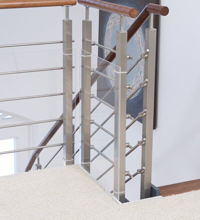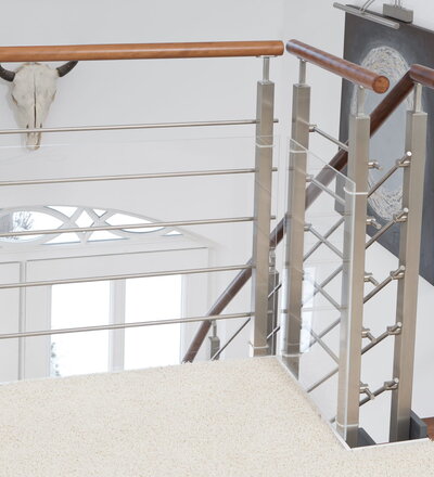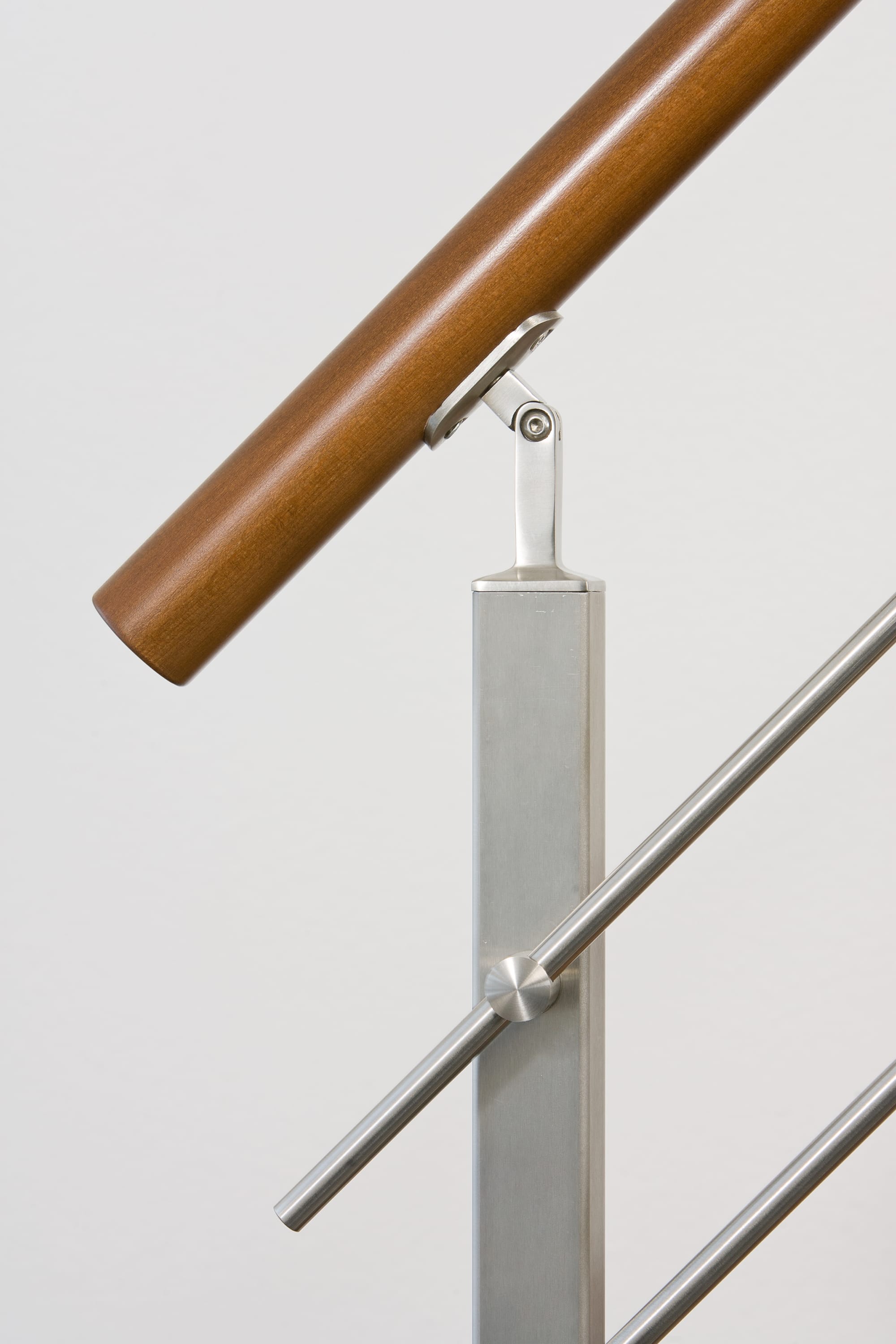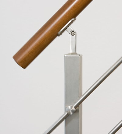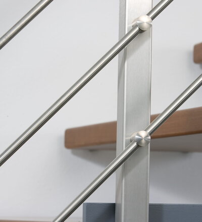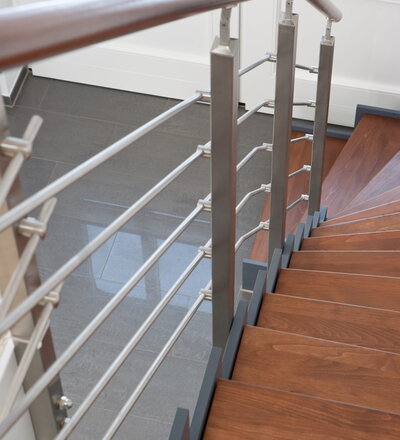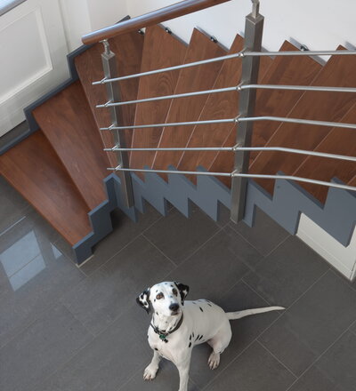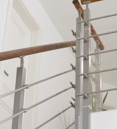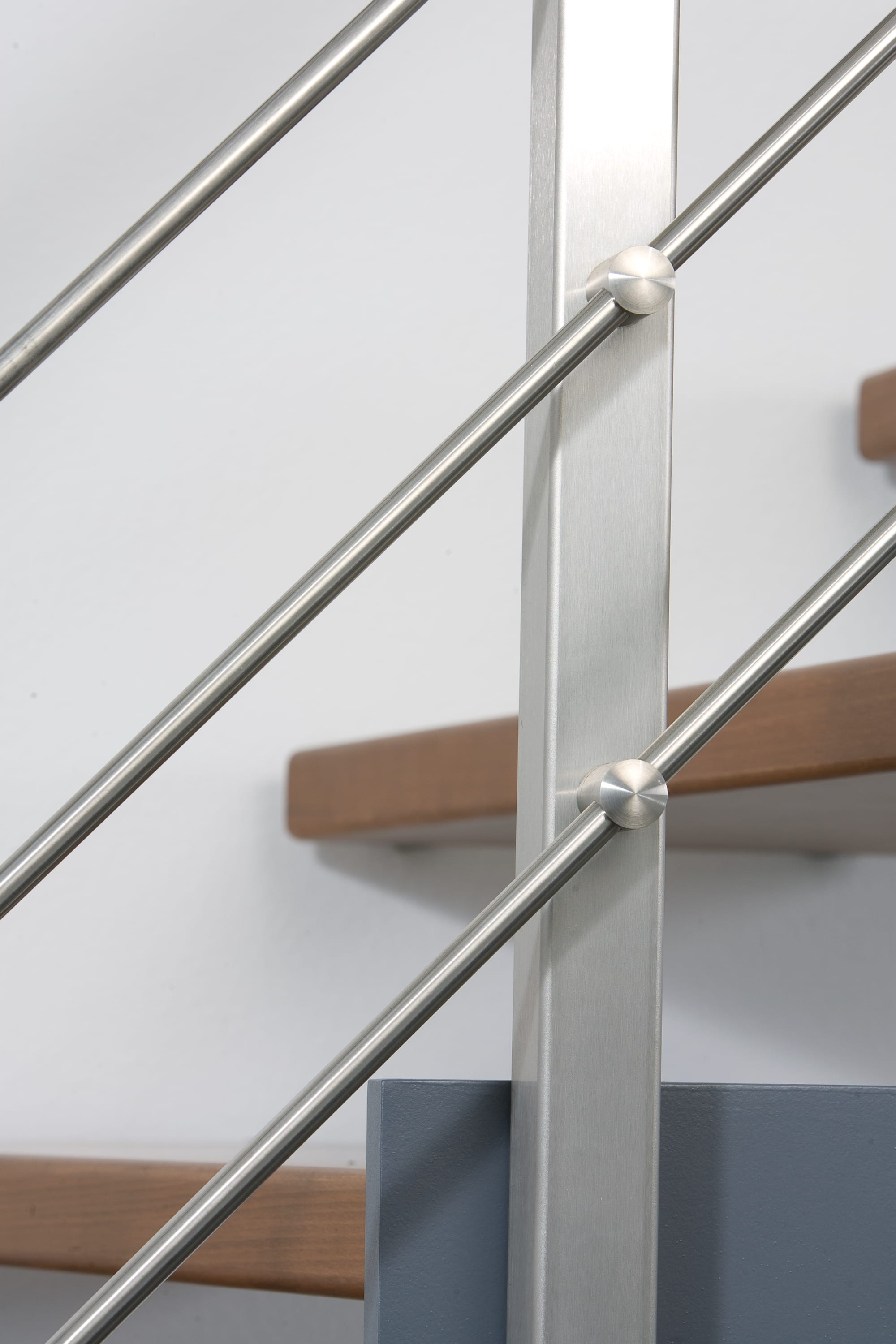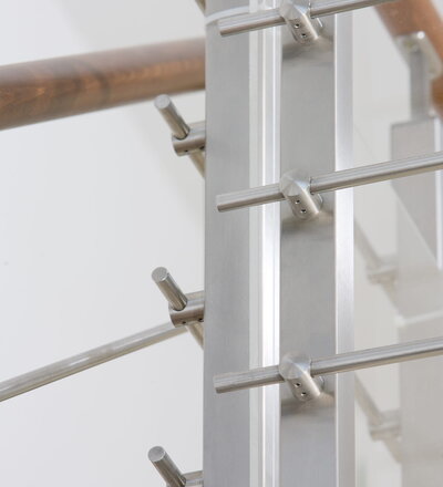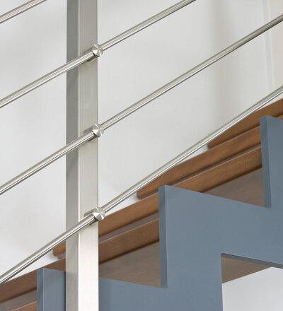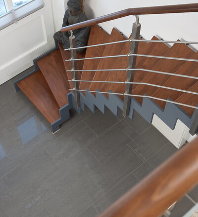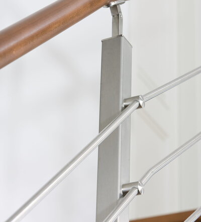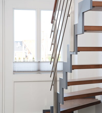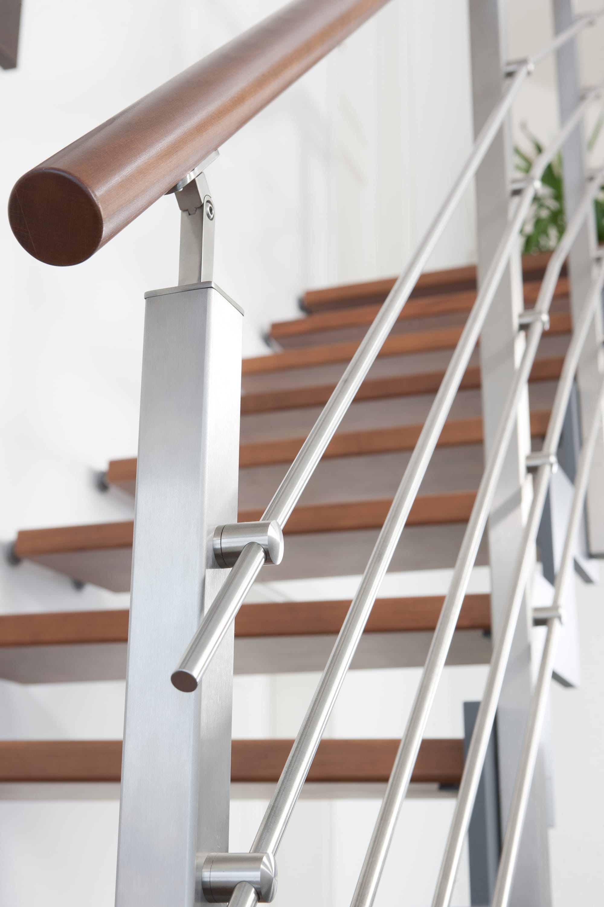Freitragende Treppe mit abgetreppter Stahlwange, Stufen und Handlauf Holzart Buche gebeizt auf Nussbaum, Milano-Geländer.