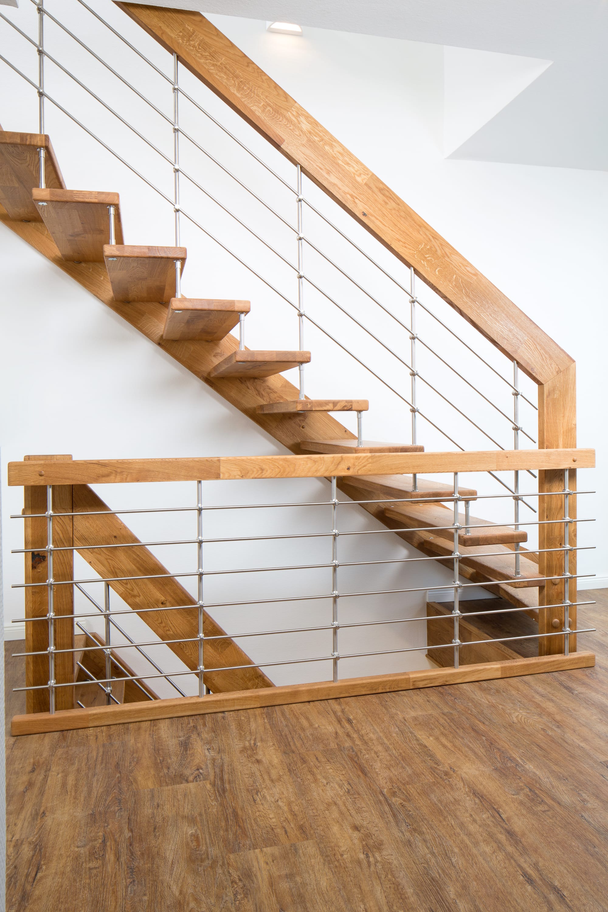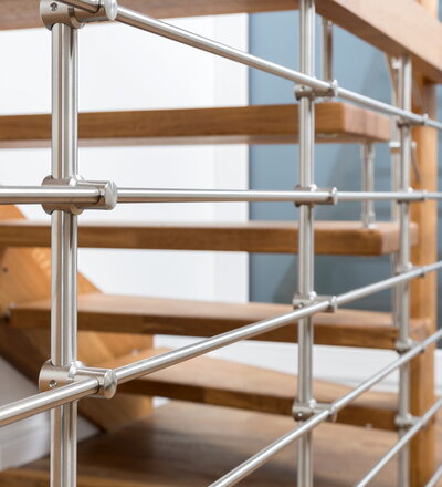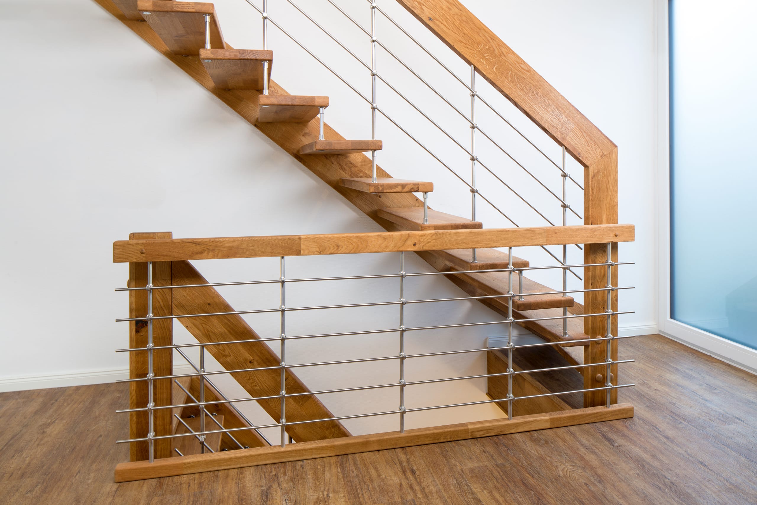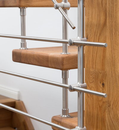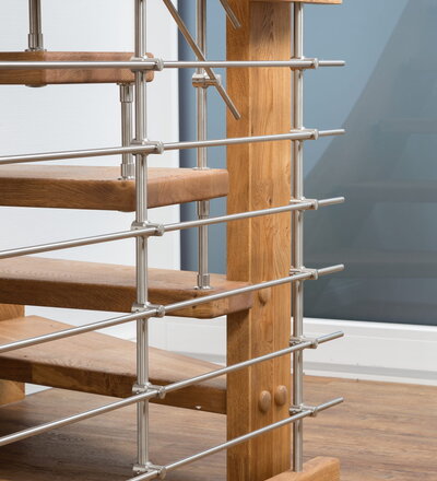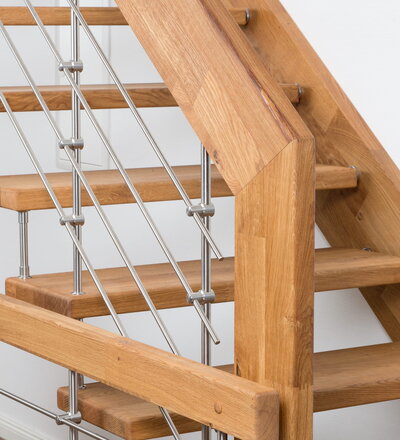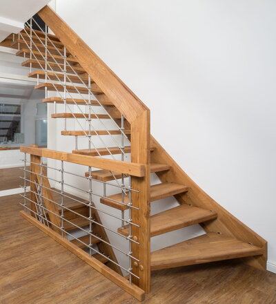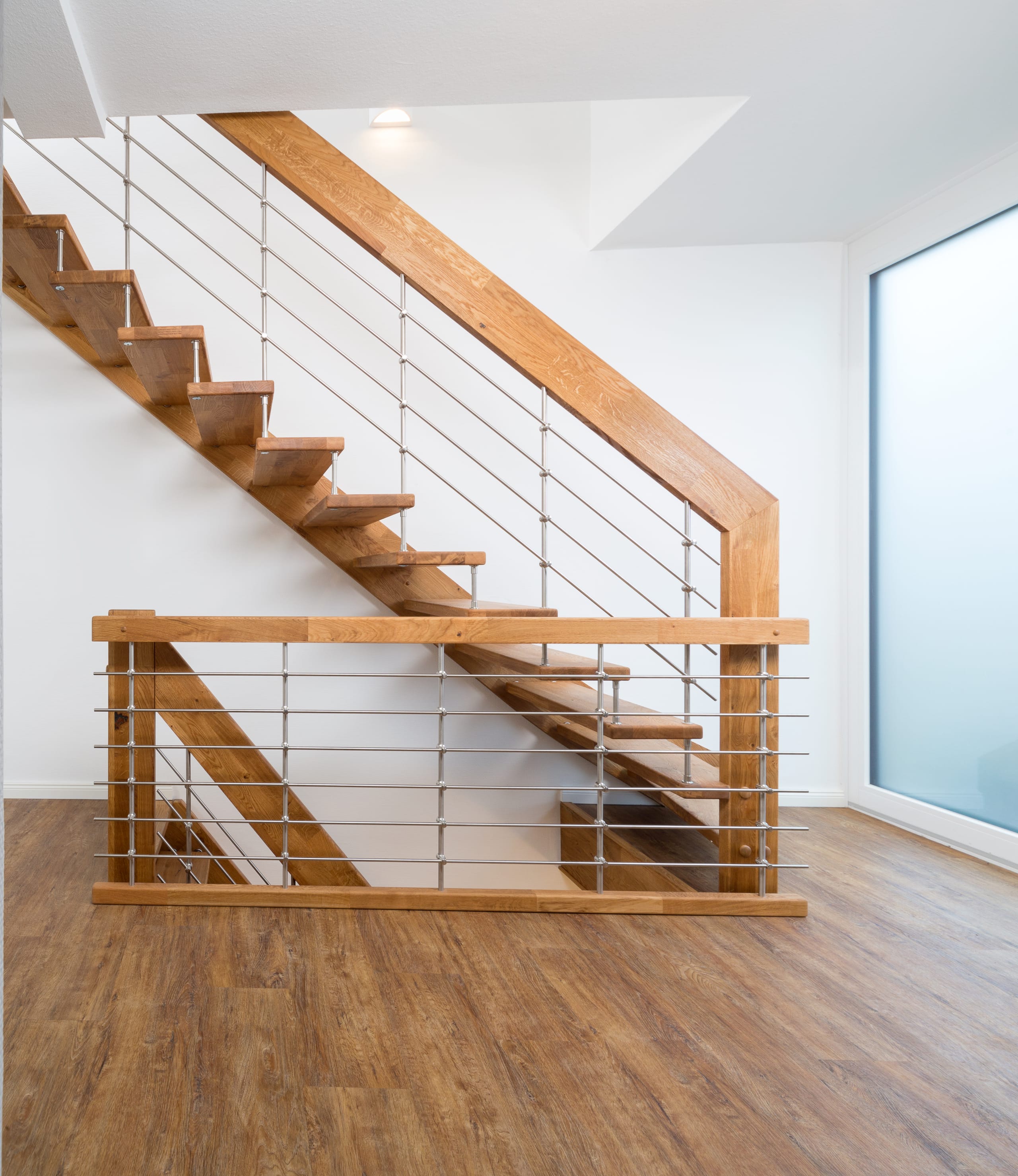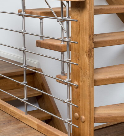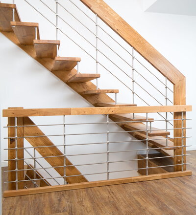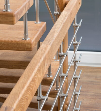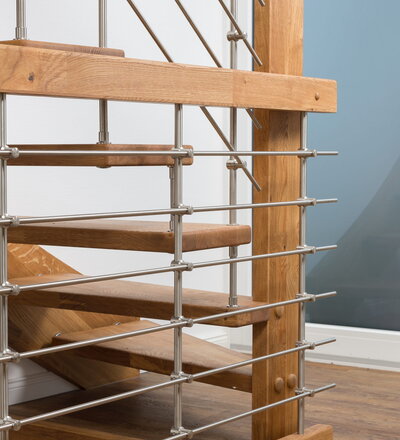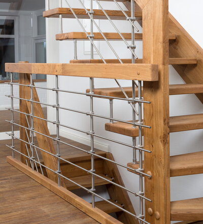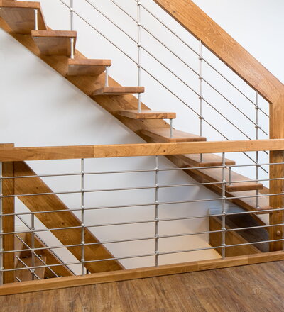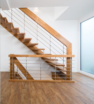 Freitragende Treppe in der Holzart Eiche mosaik geölt mit Reling-Geländer.