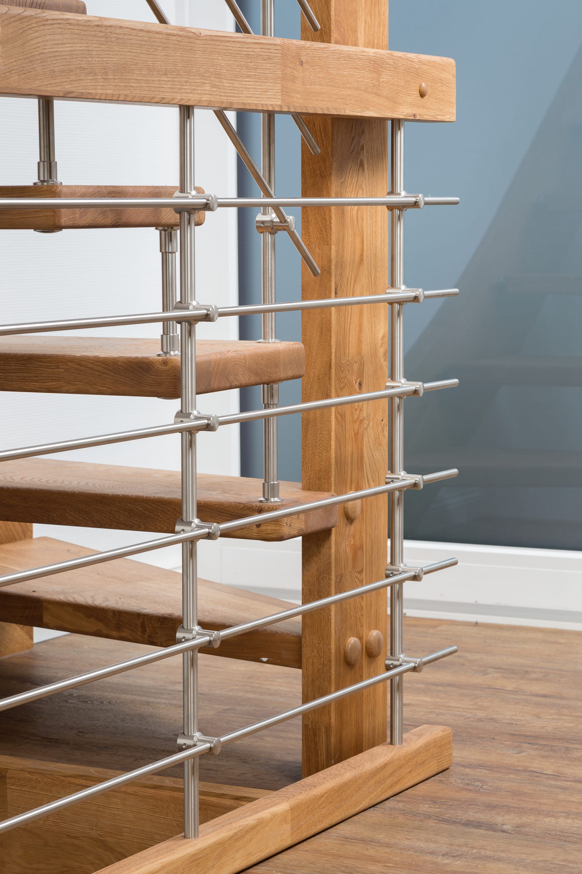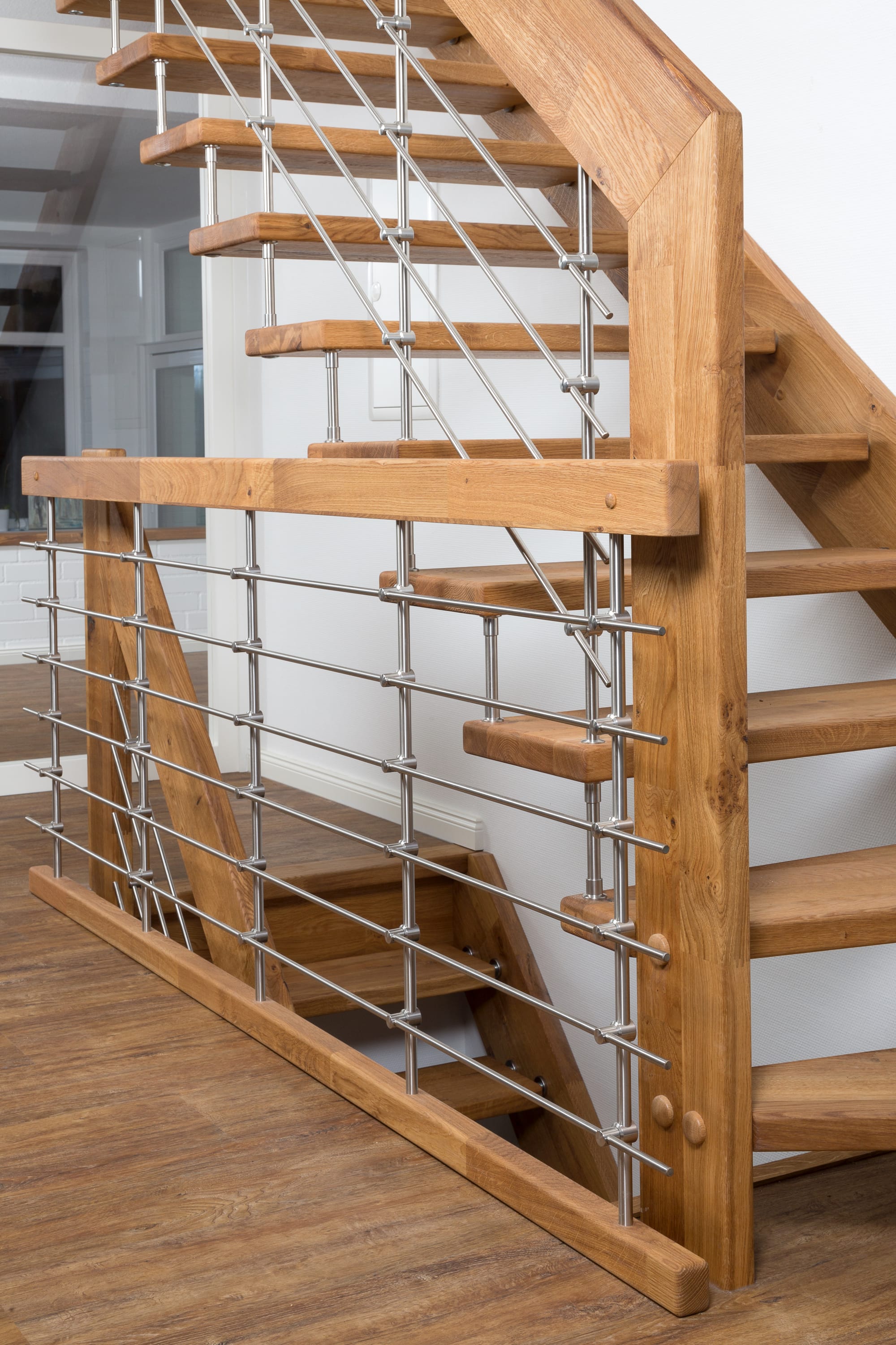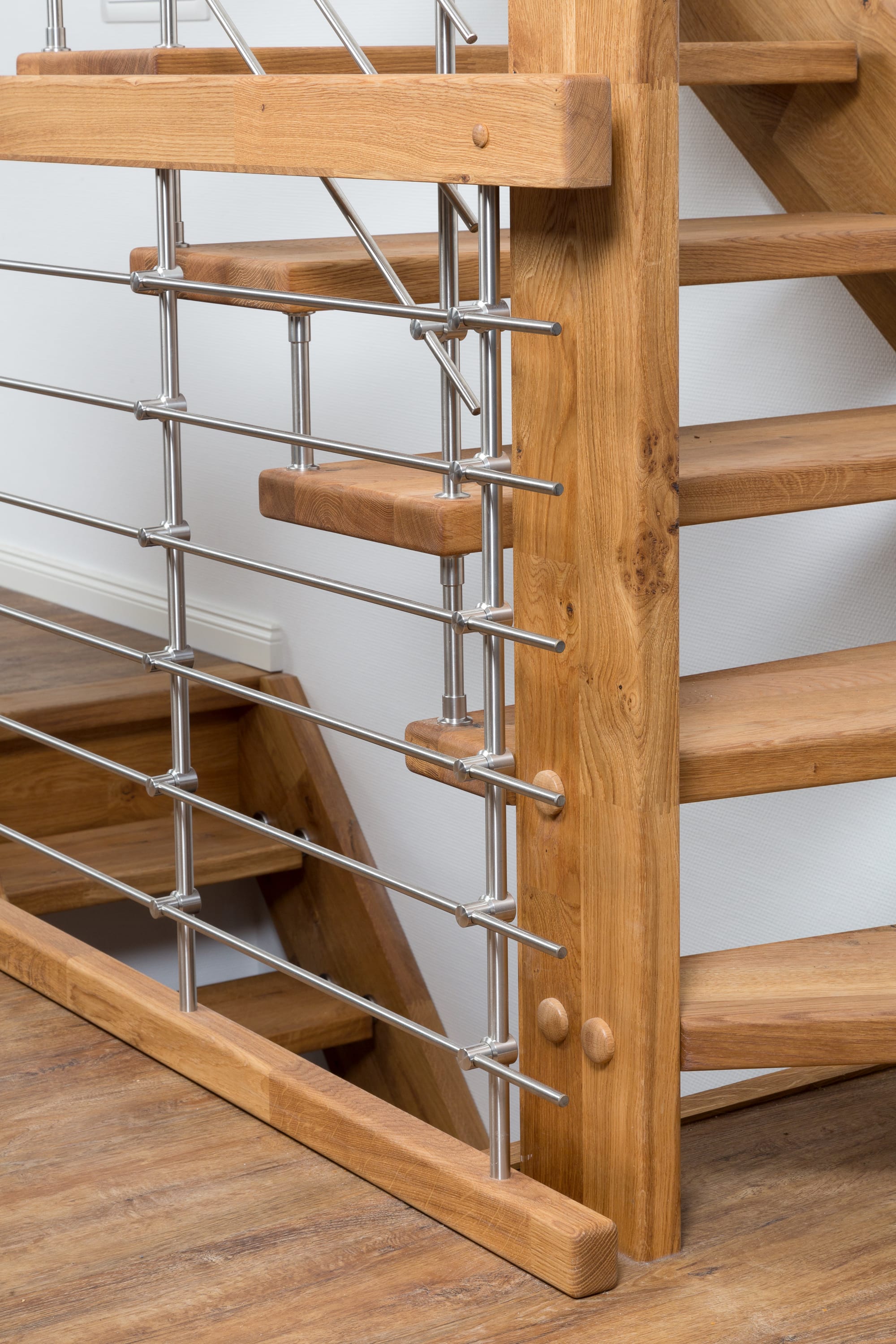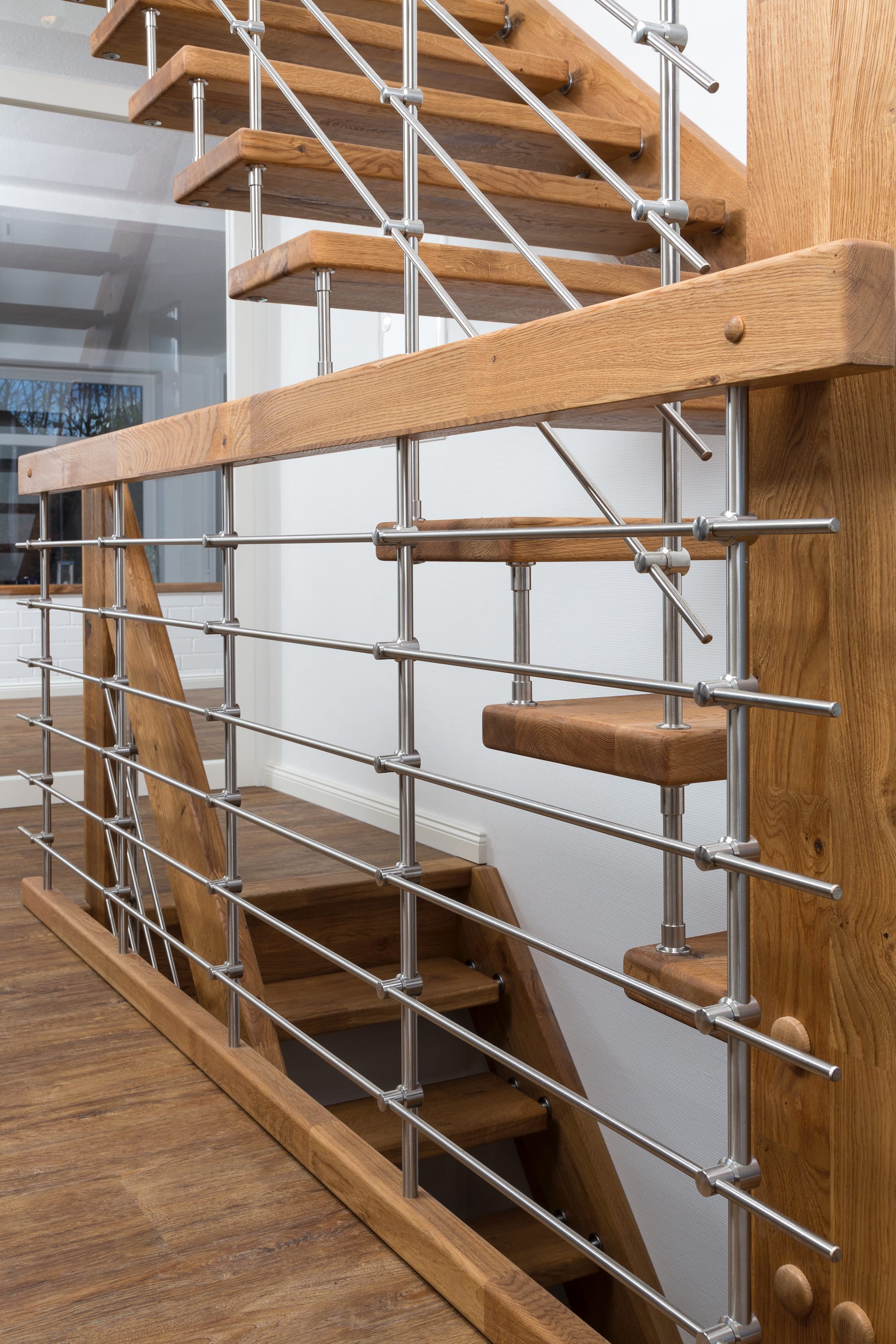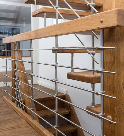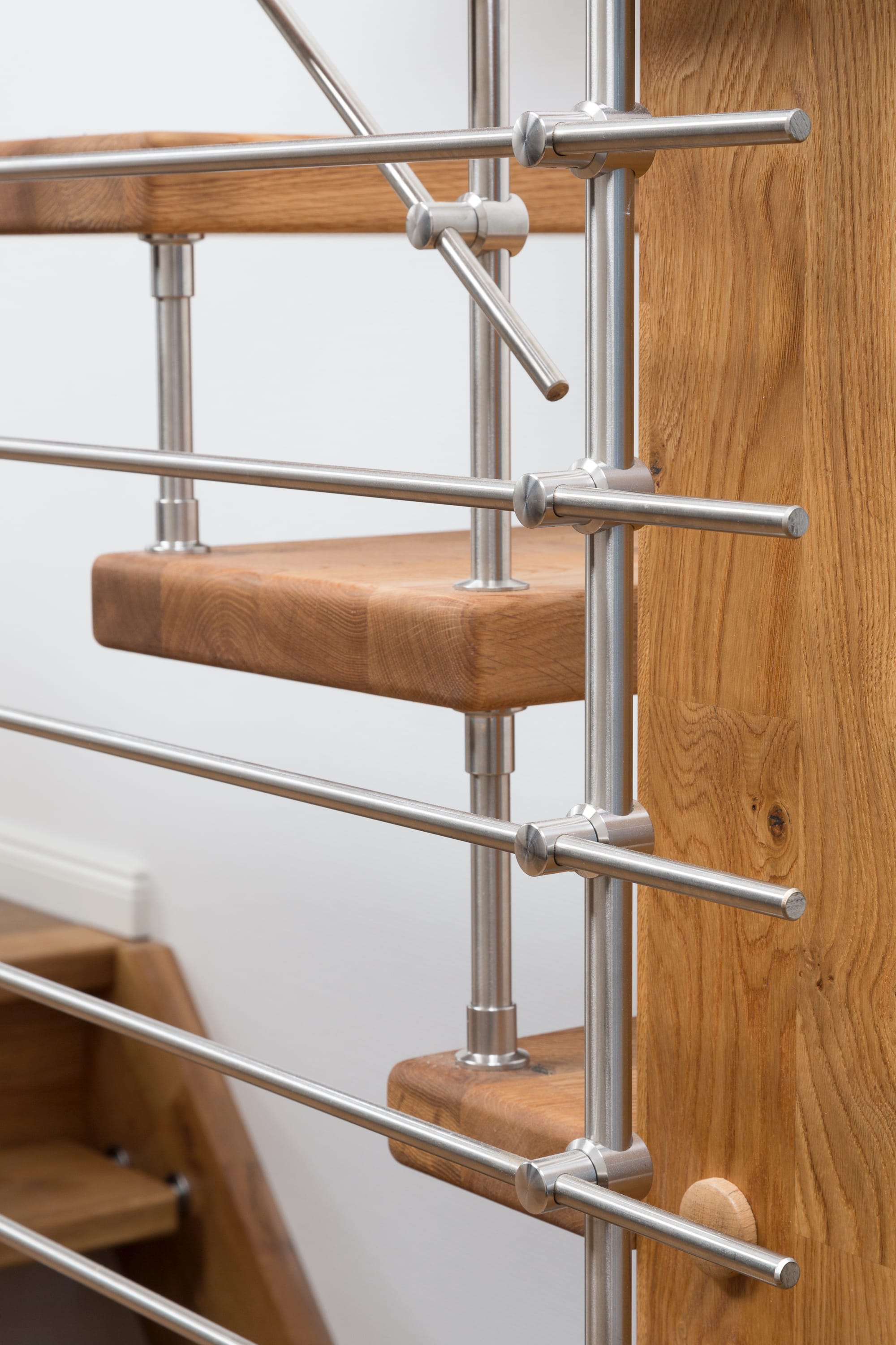 Freitragende Treppe in der Holzart Eiche mosaik geölt mit Reling-Geländer.