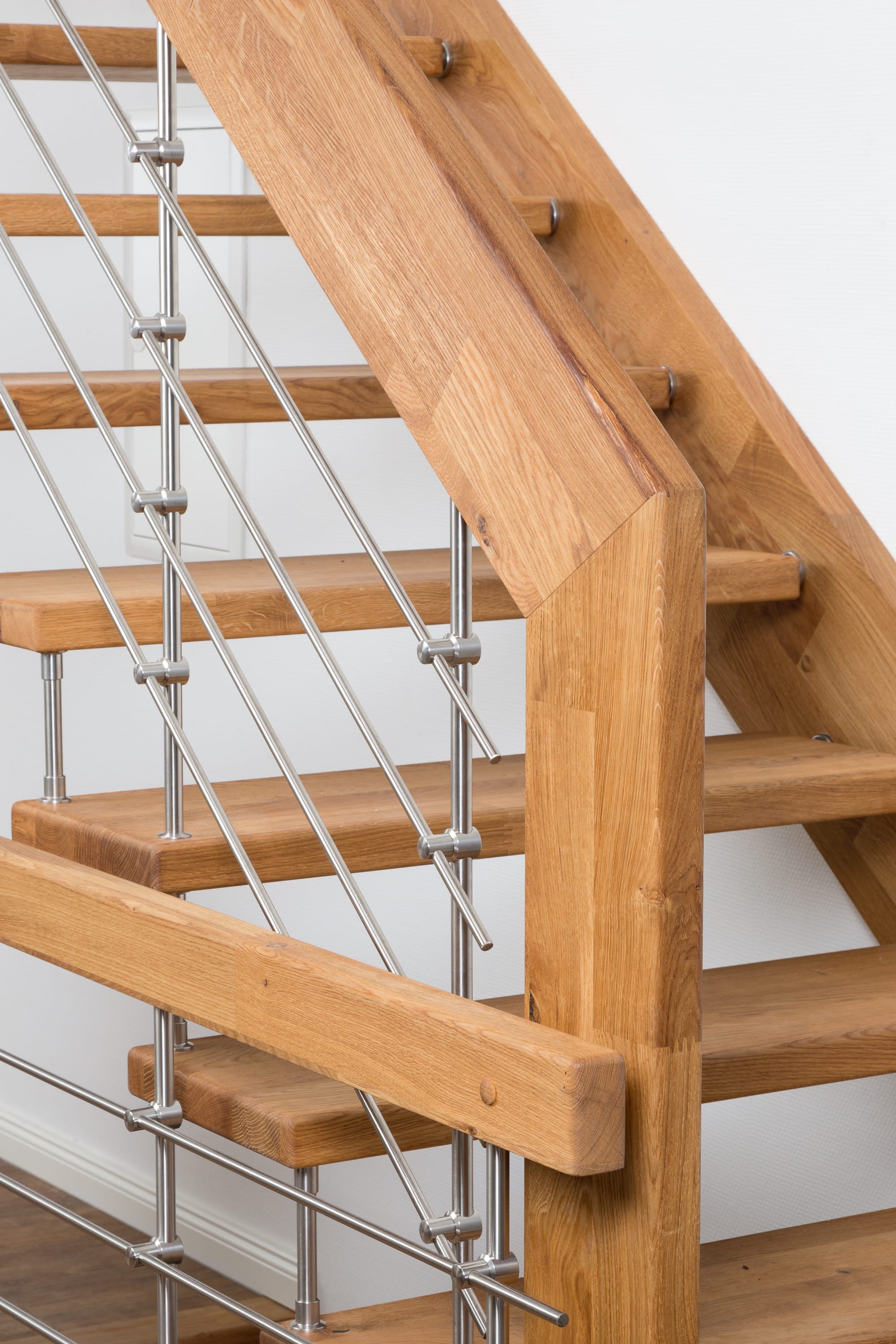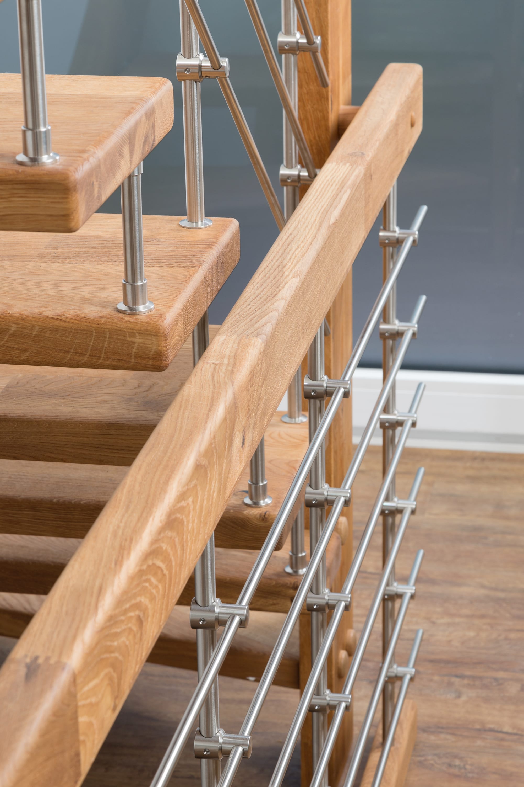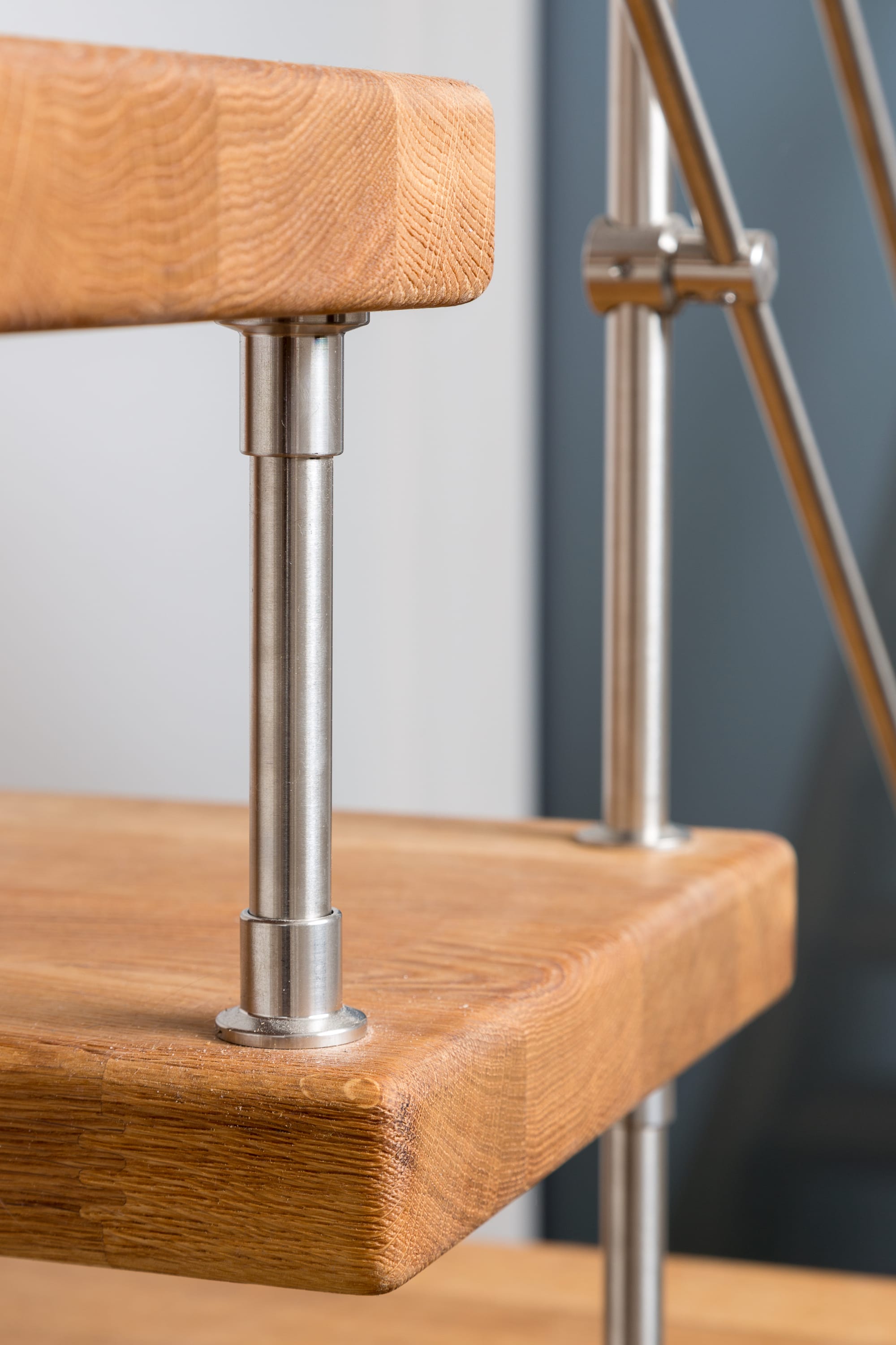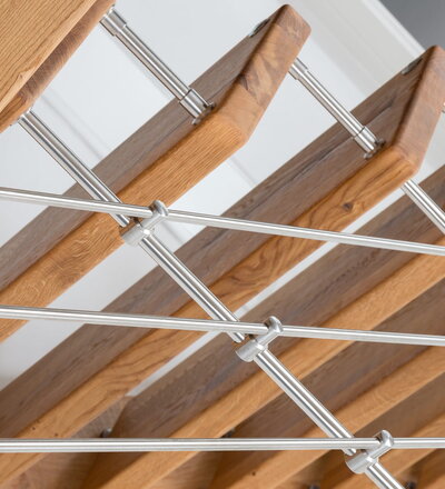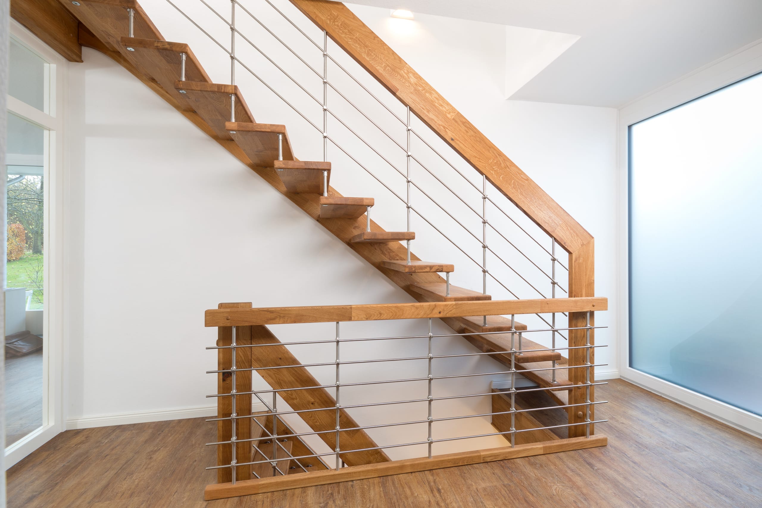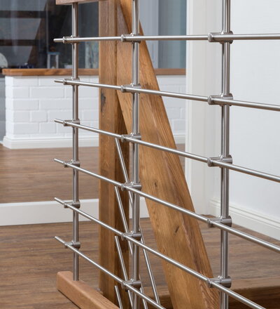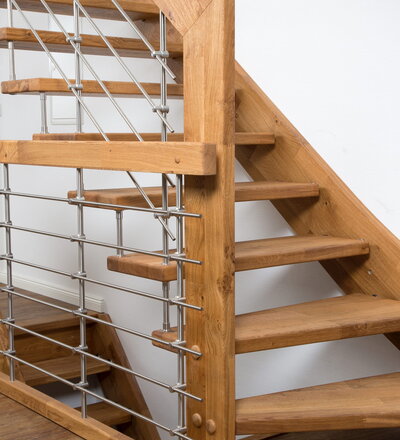 Freitragende Treppe in der Holzart Eiche mosaik geölt mit Reling-Geländer.