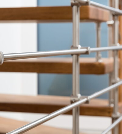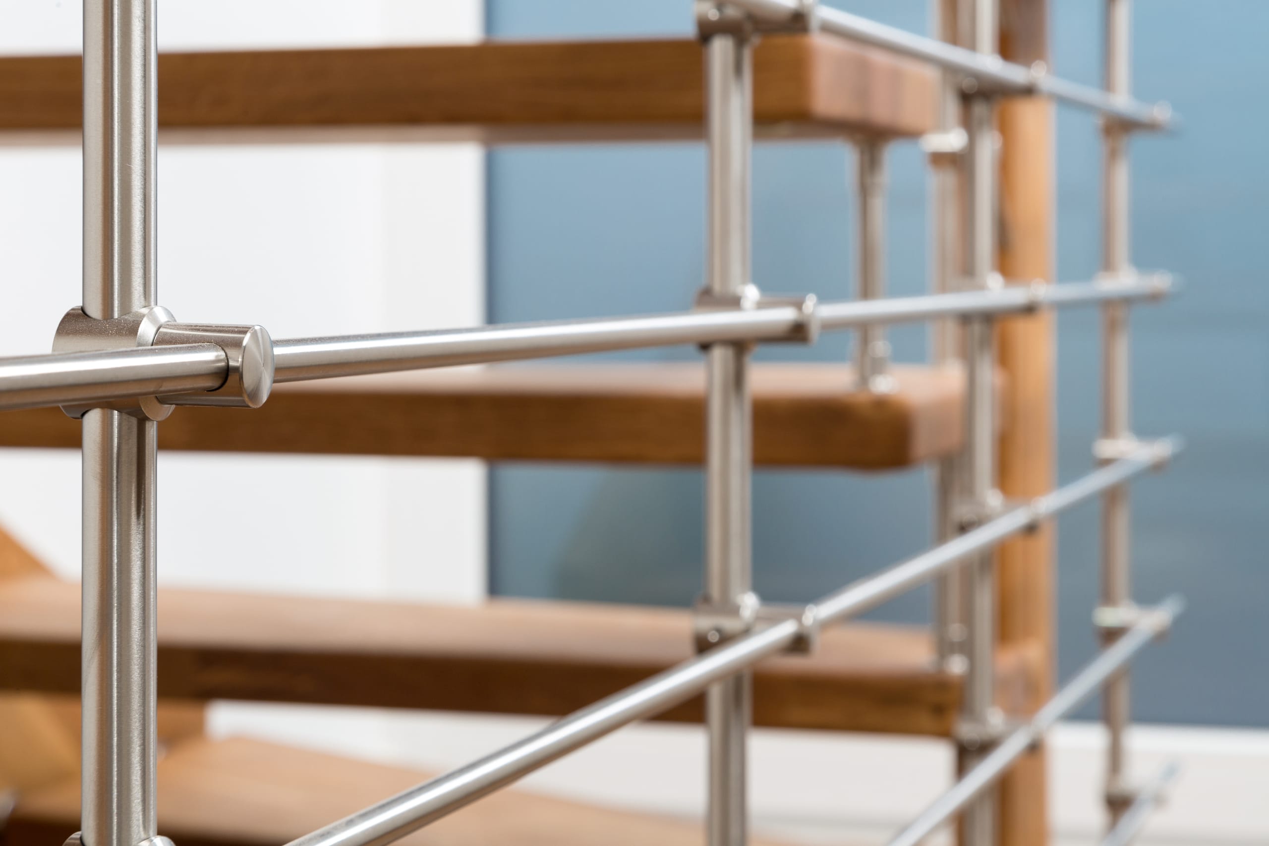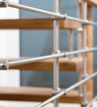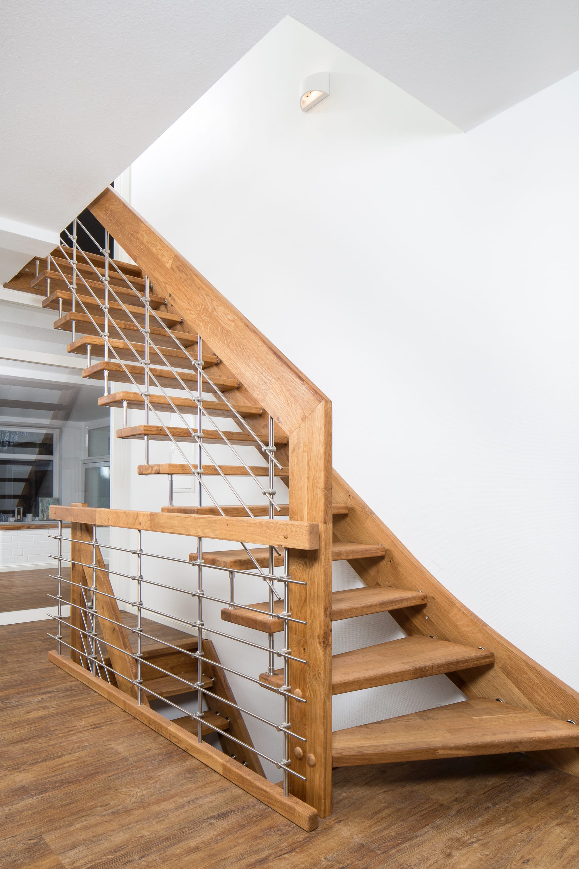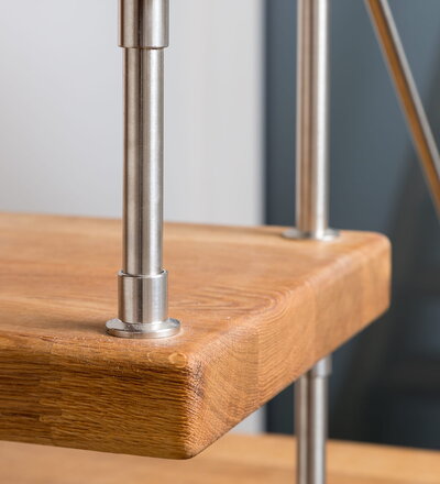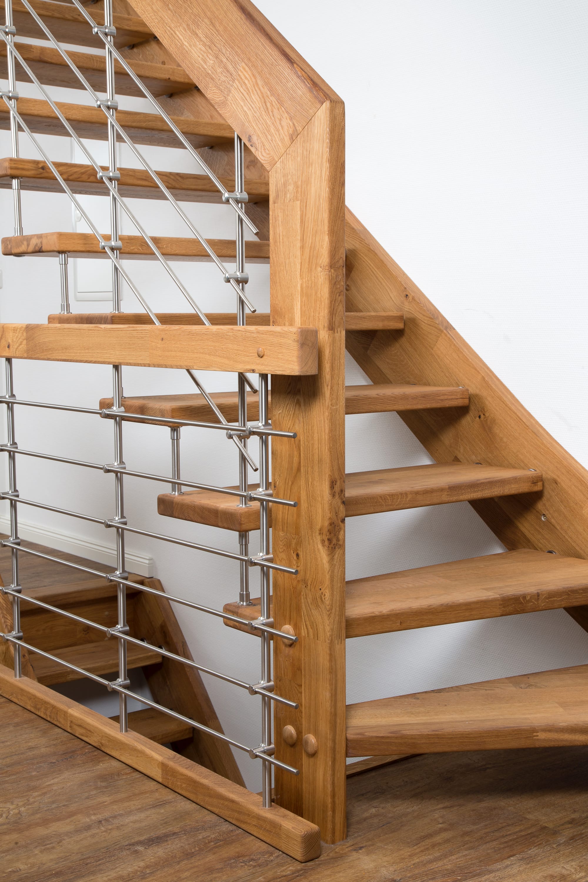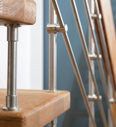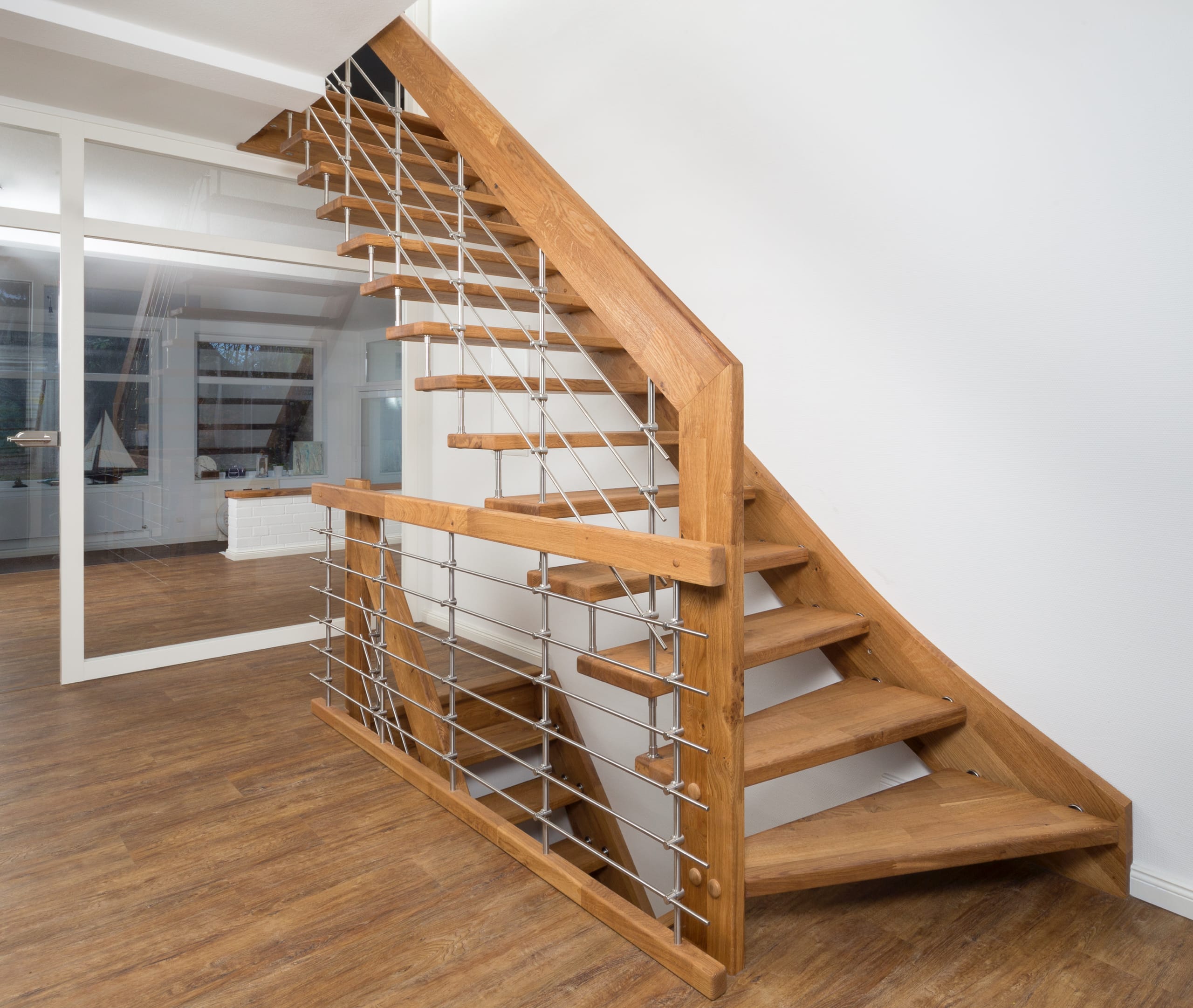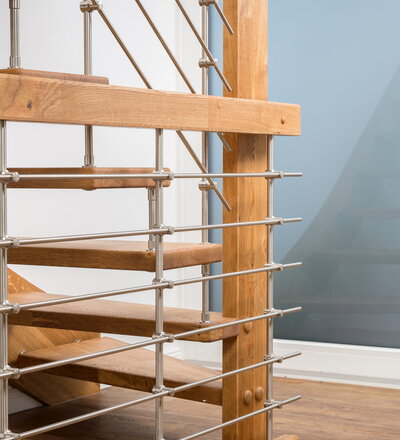 Freitragende Treppe in der Holzart Eiche mosaik geölt mit Reling-Geländer.