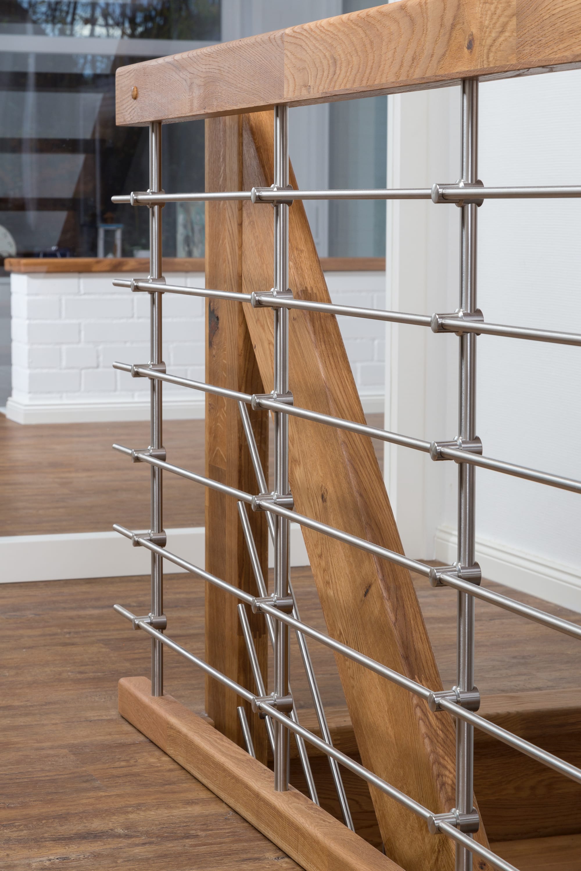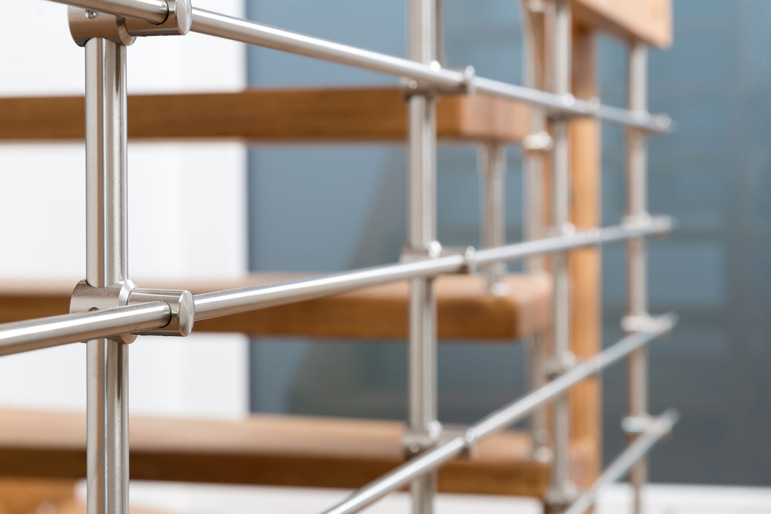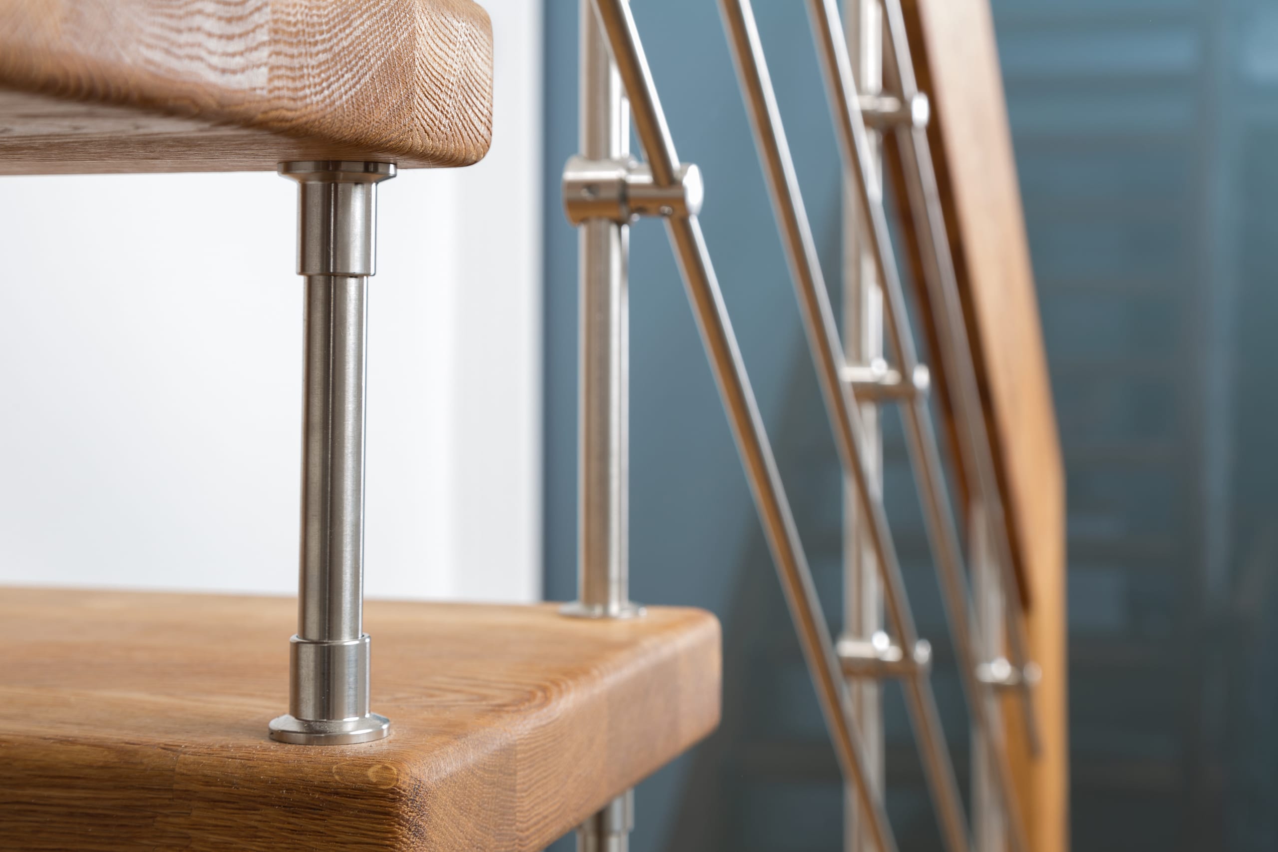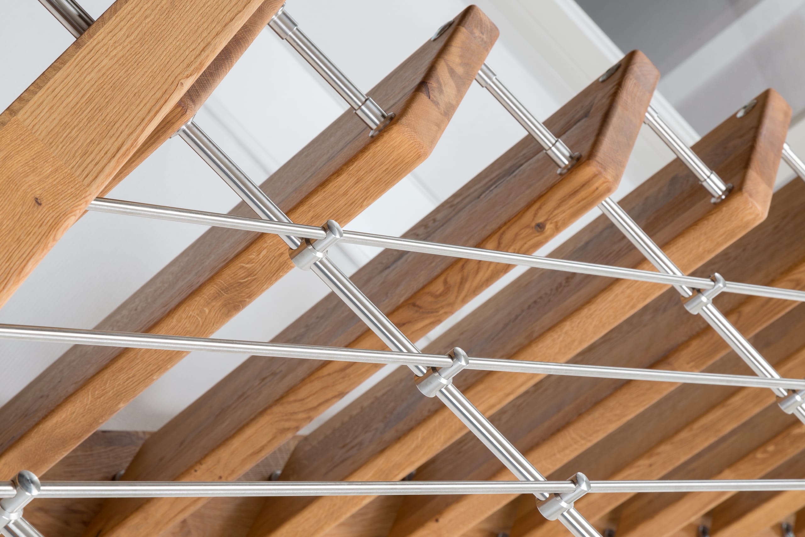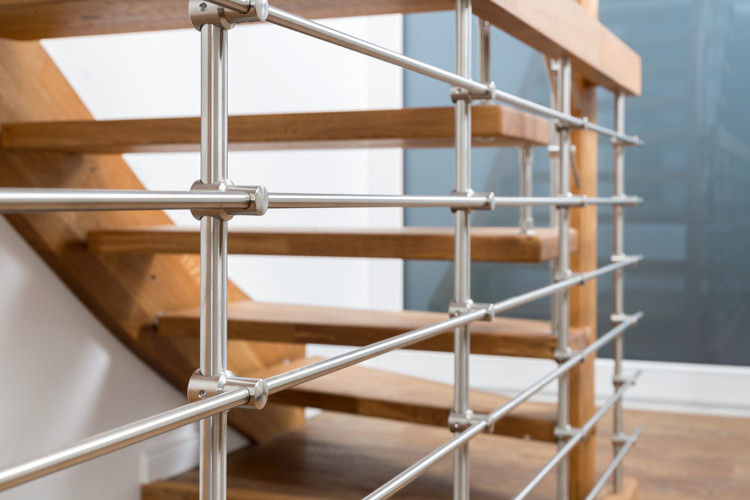 Freitragende Treppe in der Holzart Eiche mosaik geölt mit Reling-Geländer.