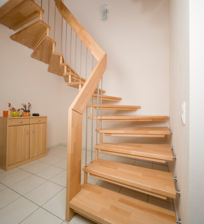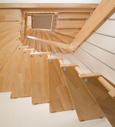 Viertel gewendelte freitragende Treppe in der Holzart Buche mosaik mit Edelstahlstäben und Distanzhaltern in der Holzart Buche mosaik.