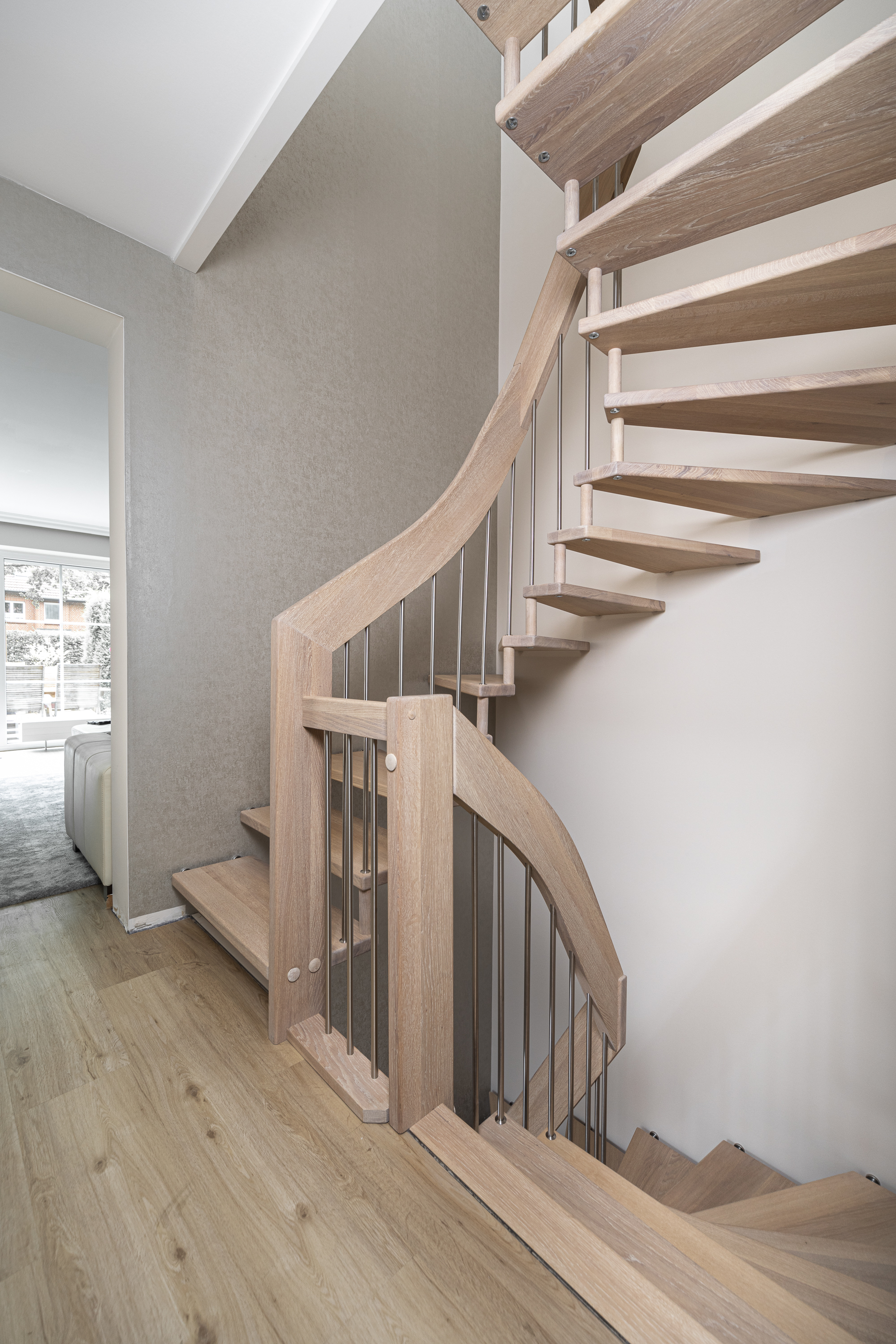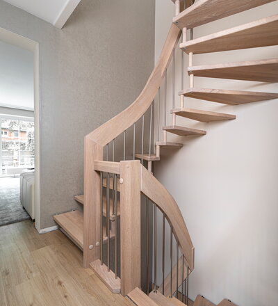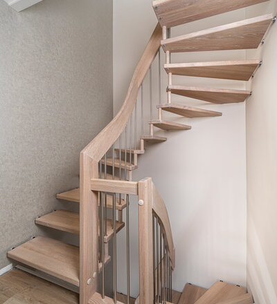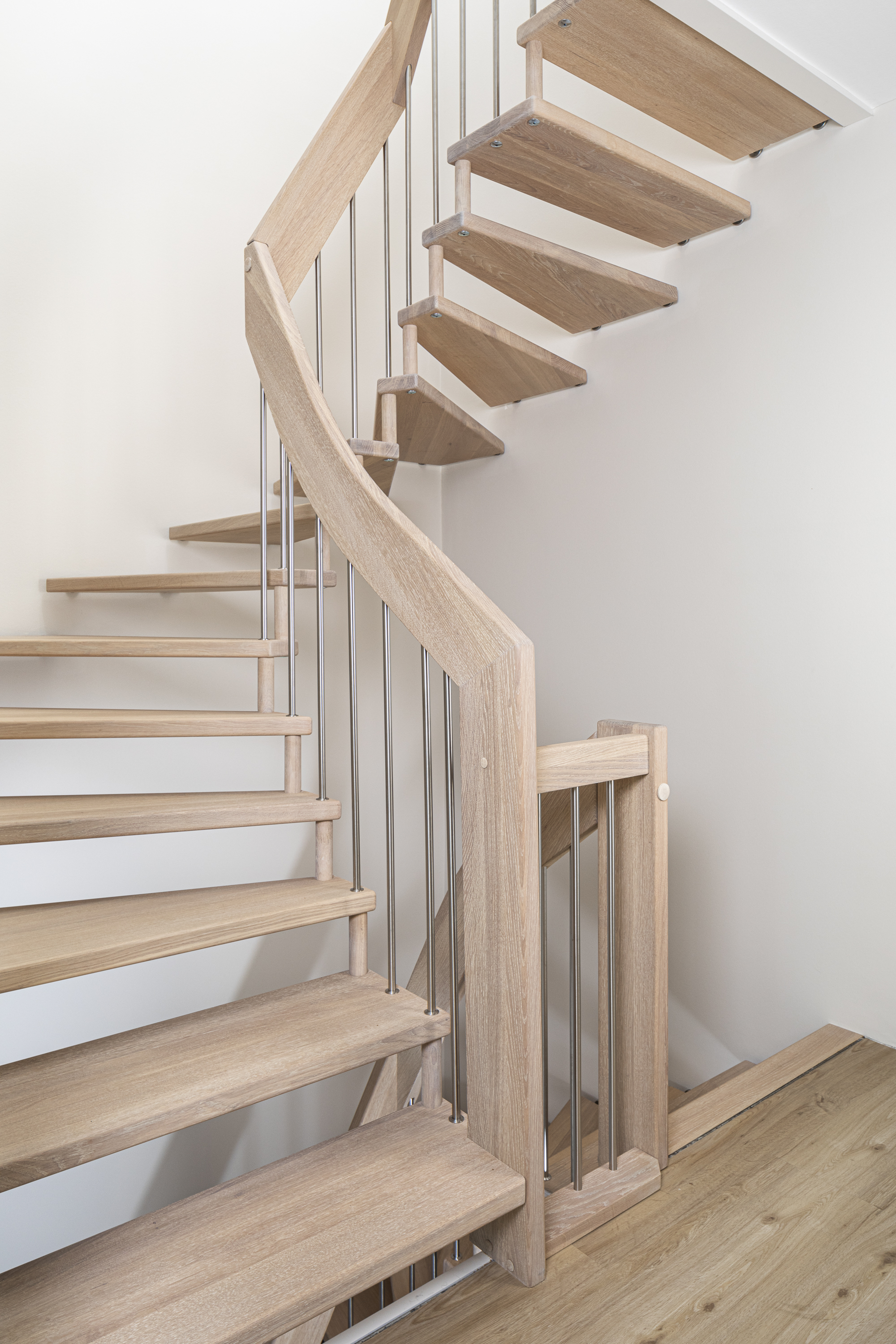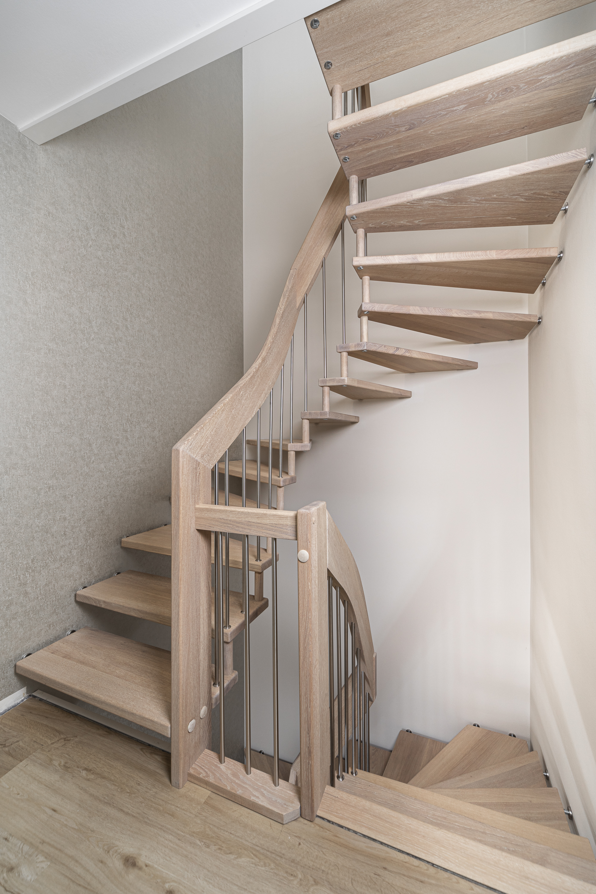 Halb gewendelte, freitragende Treppe in der Holzart Eiche weiß geölt mit Edelstahlstäben.