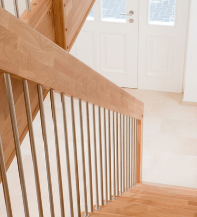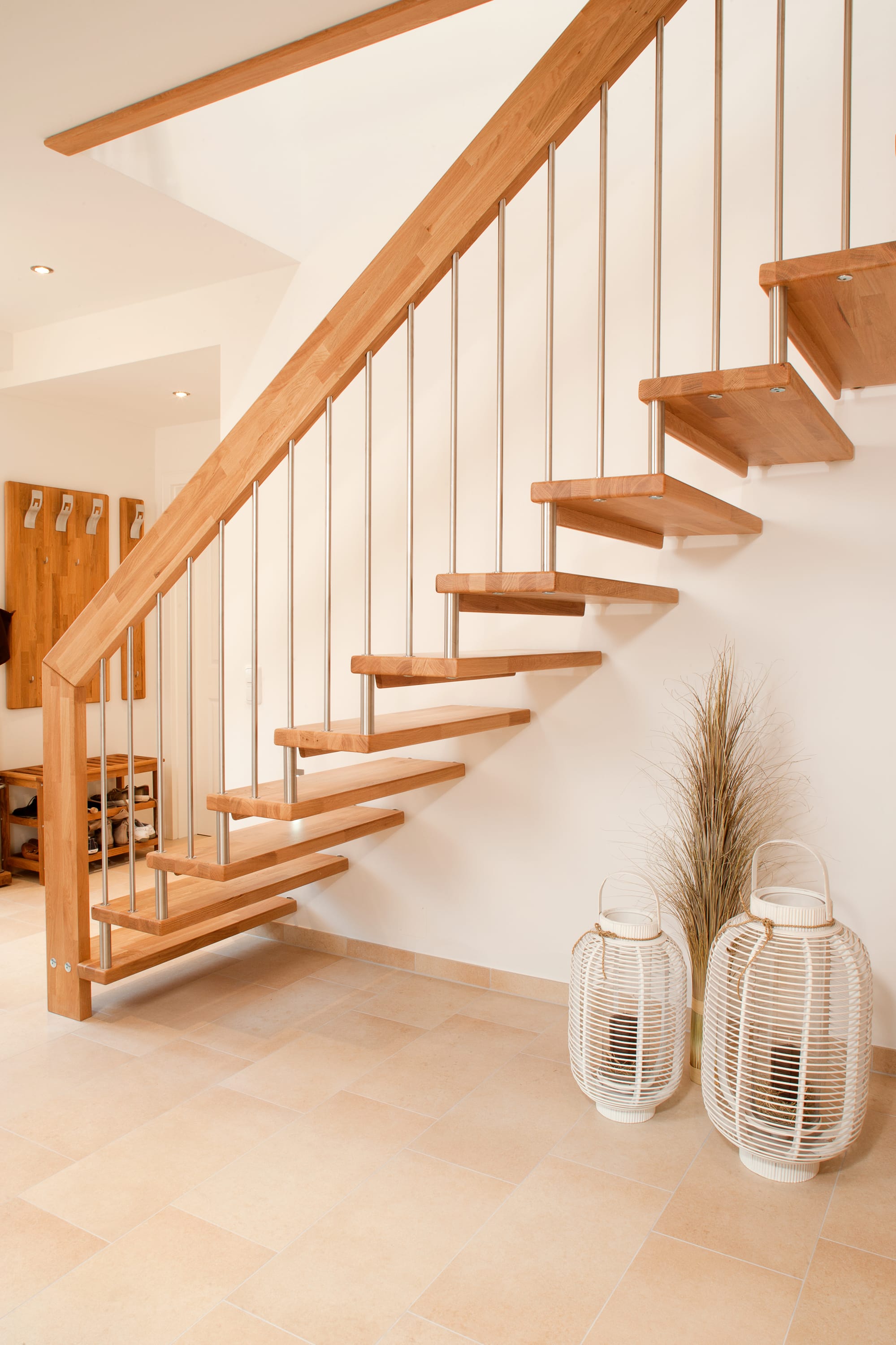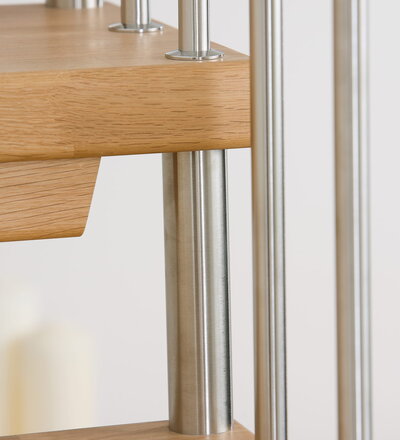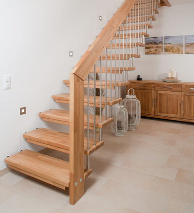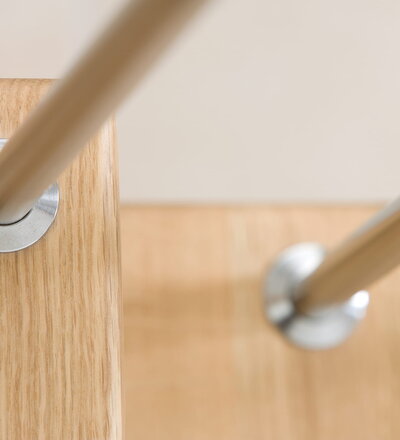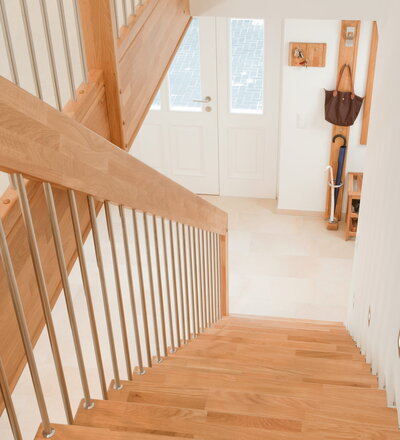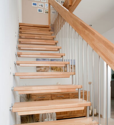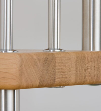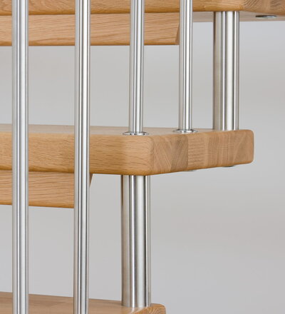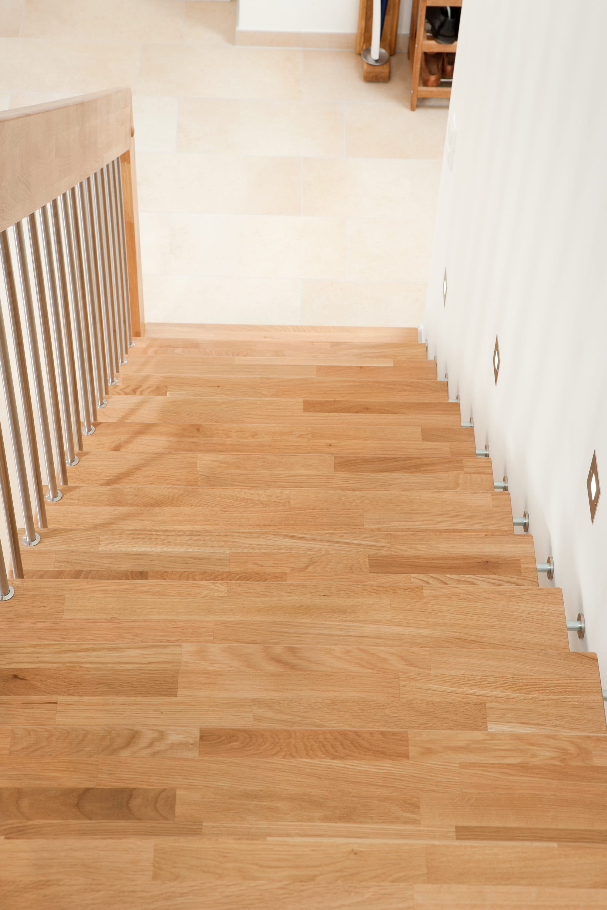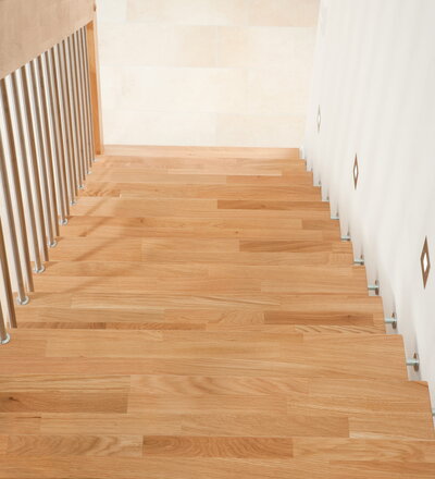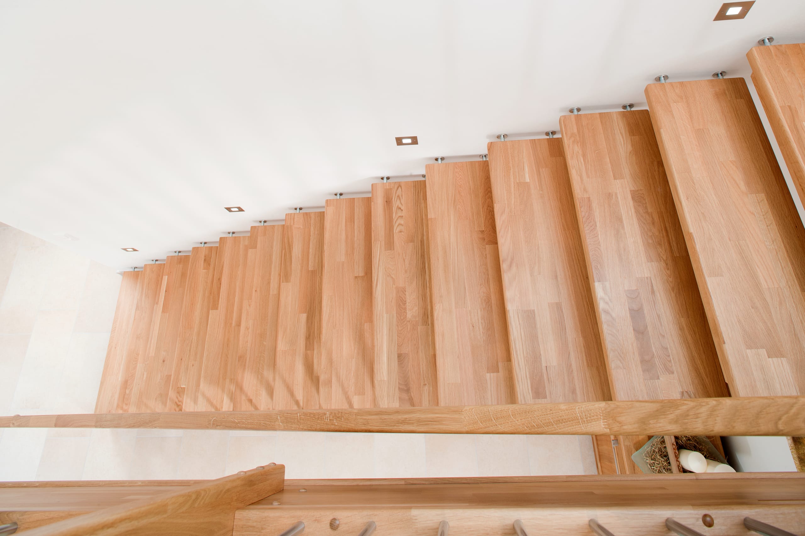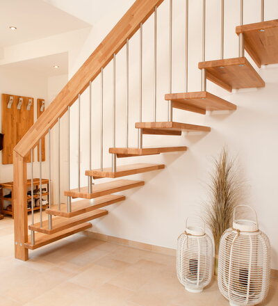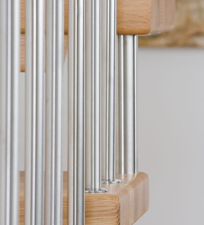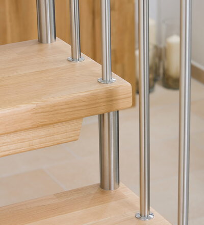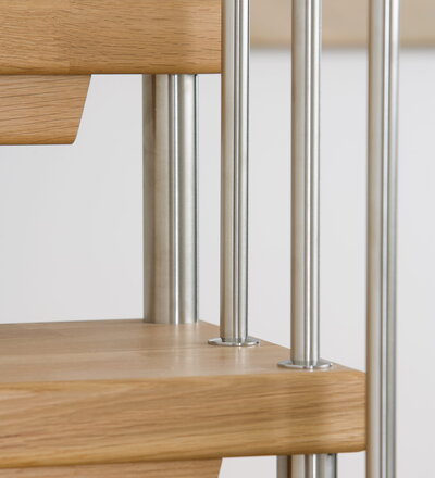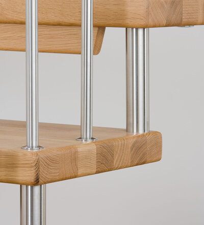 Freitragende Treppe mit Edelstahlstäben; Holzart Eiche mosaik