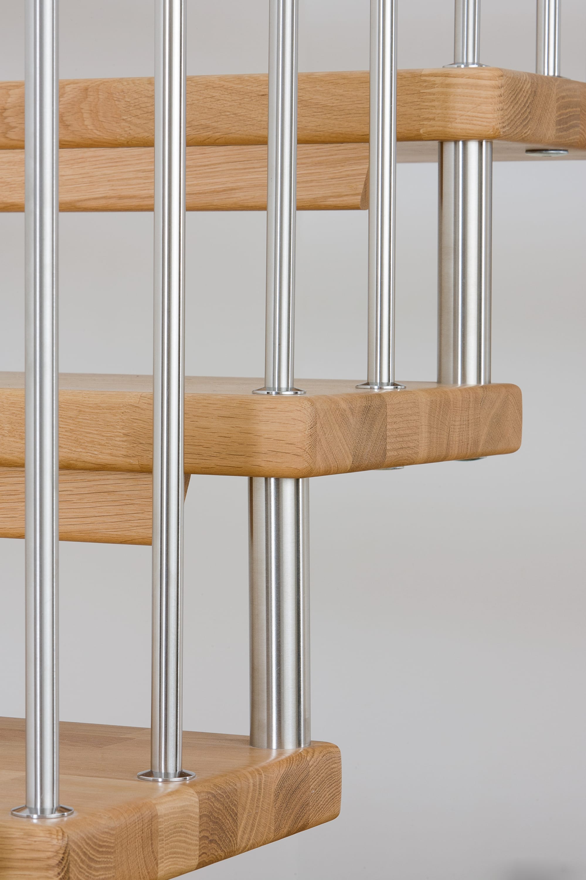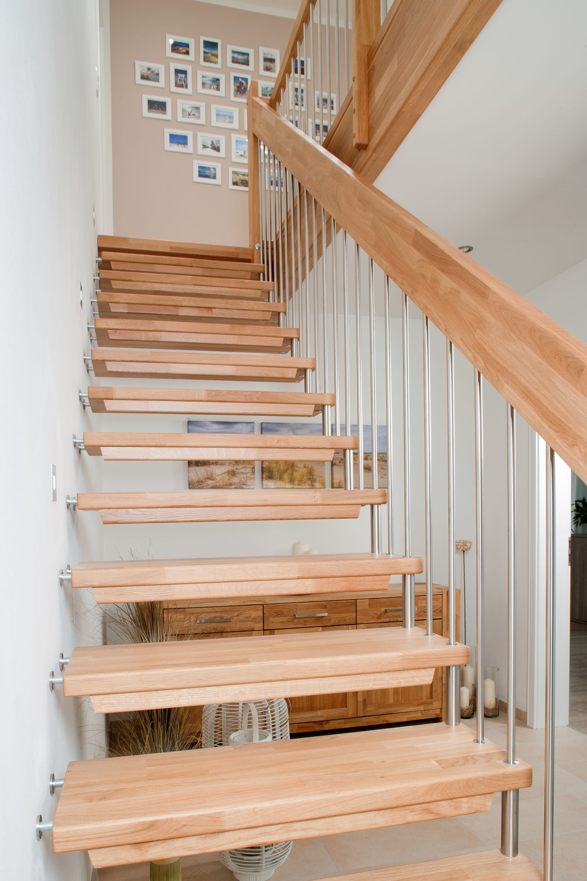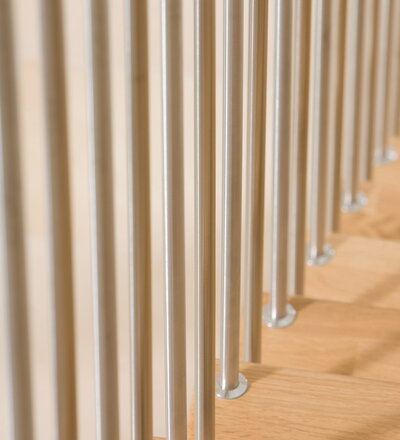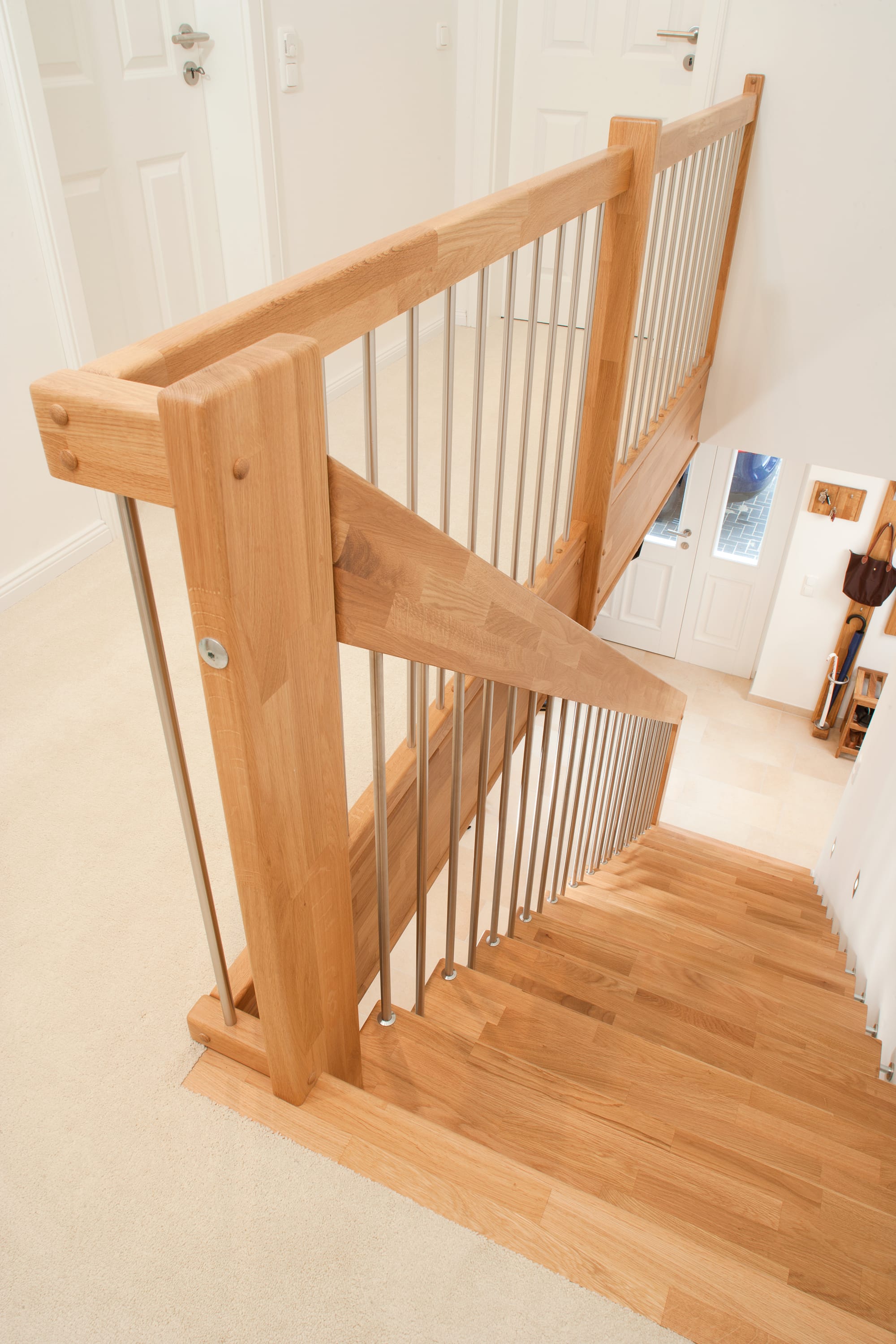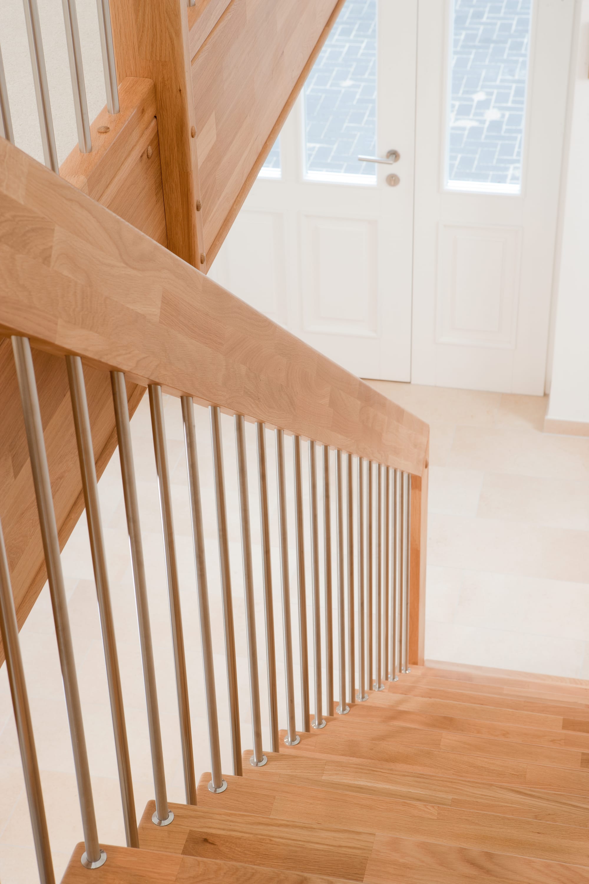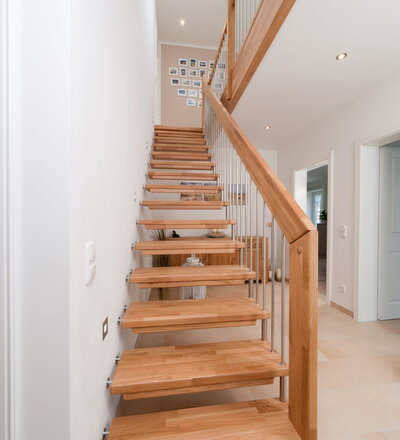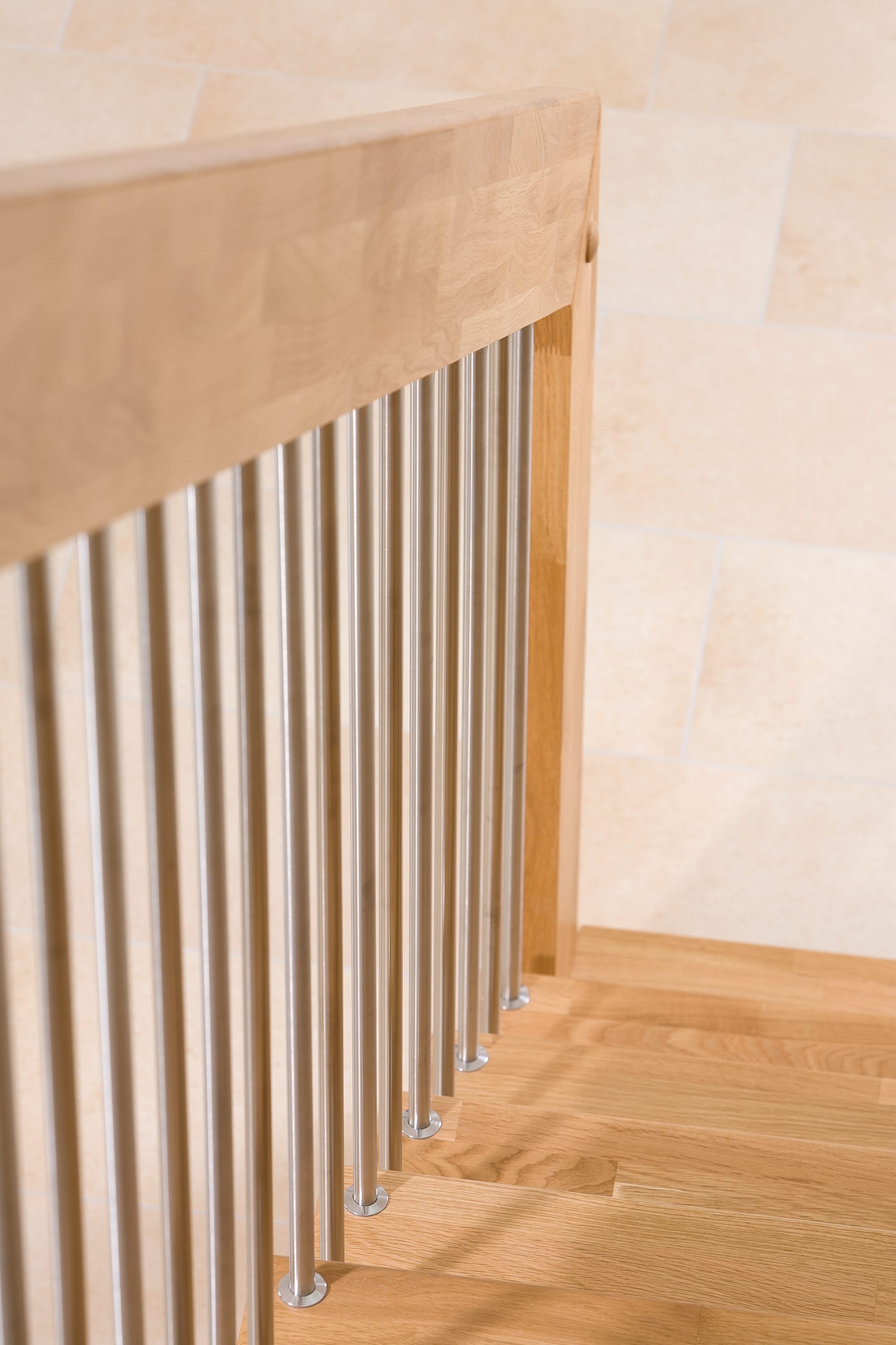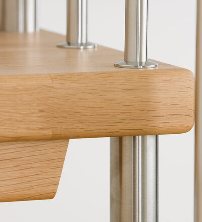 Freitragende Treppe mit Edelstahlstäben; Holzart Eiche mosaik