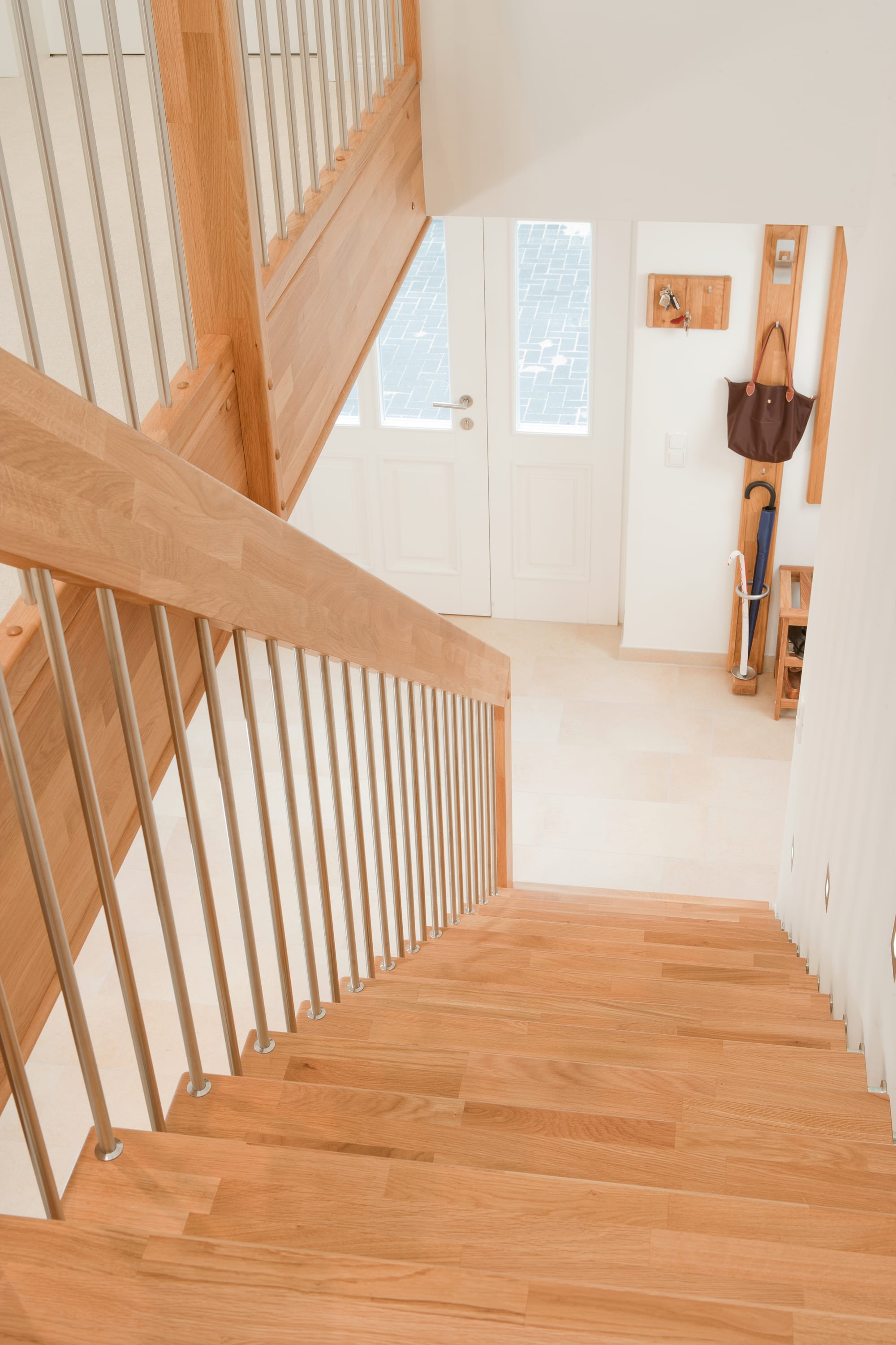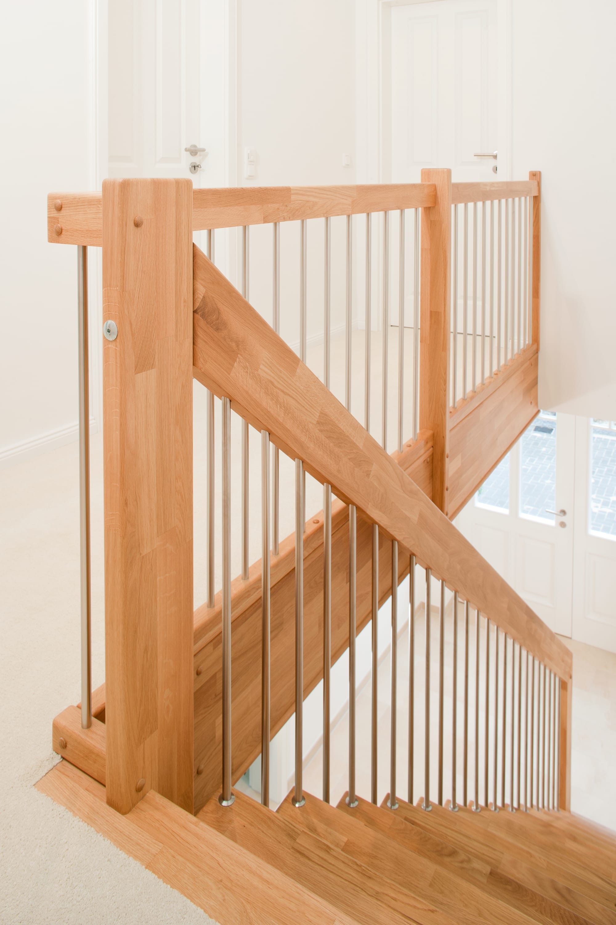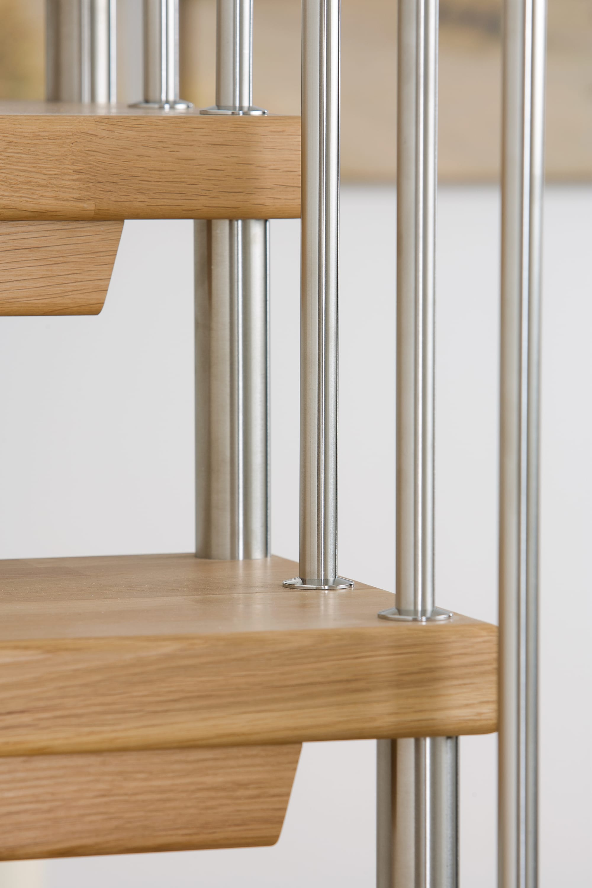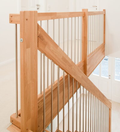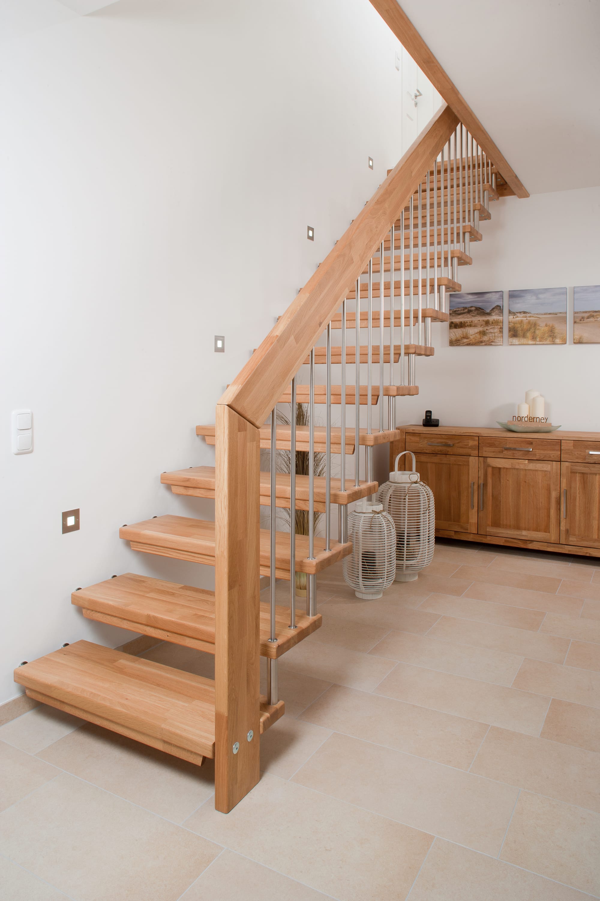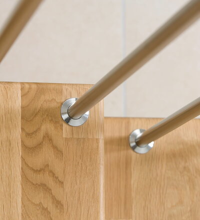 Freitragende Treppe mit Edelstahlstäben; Holzart Eiche mosaik