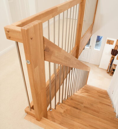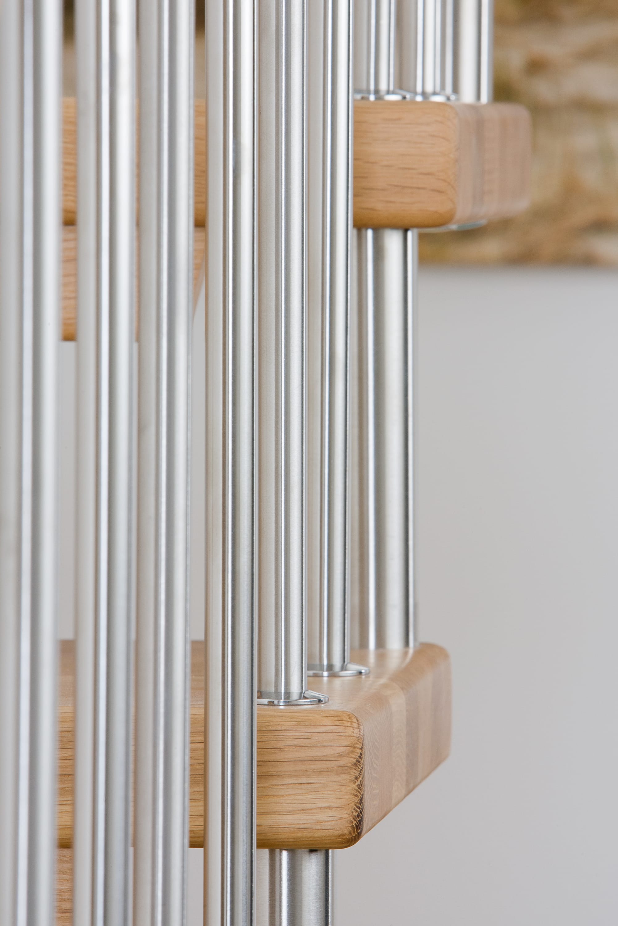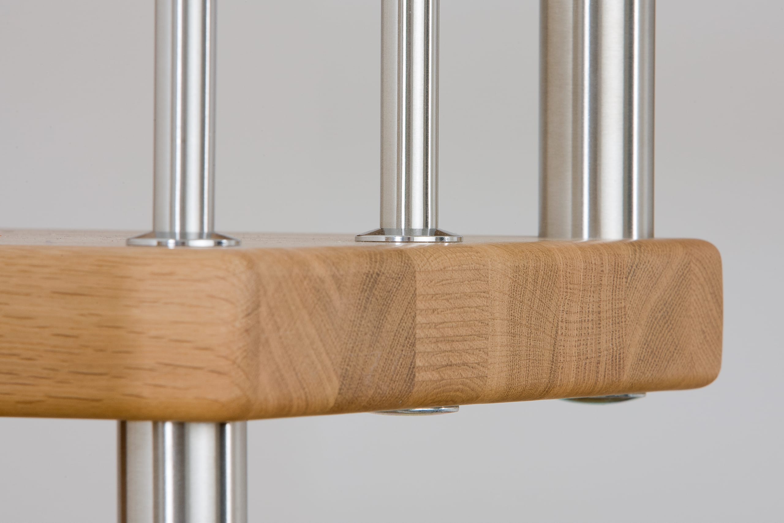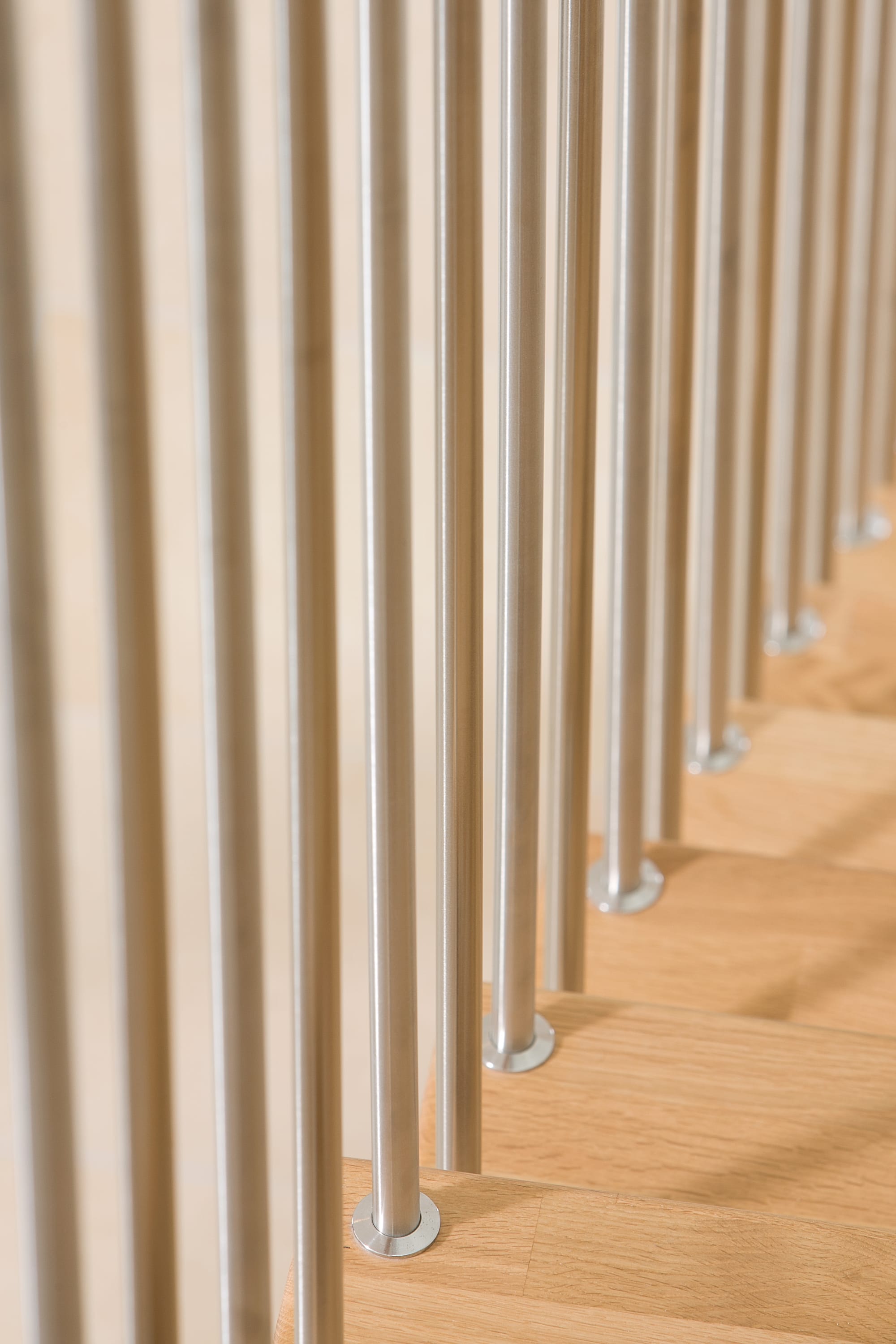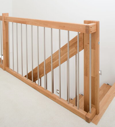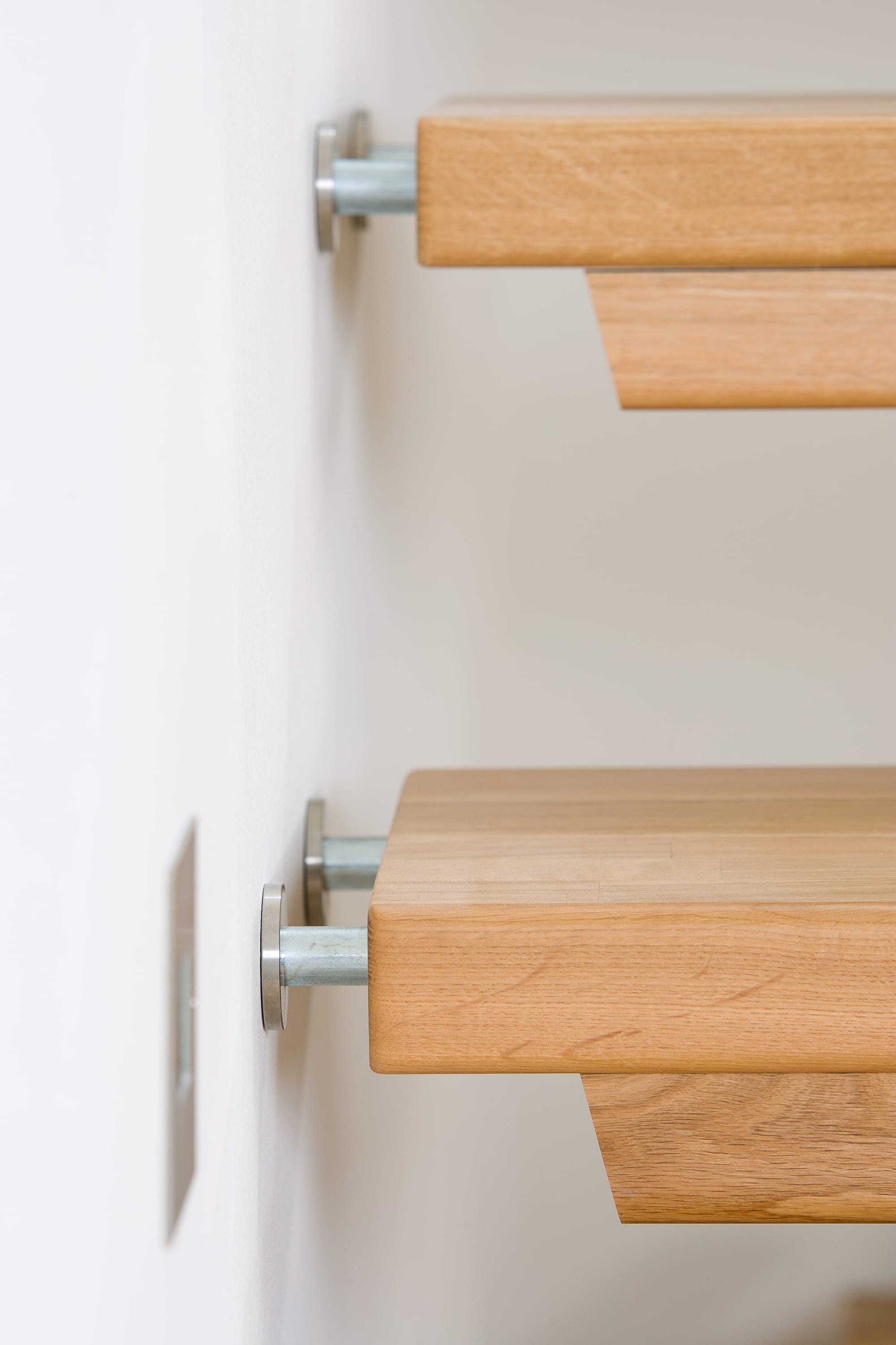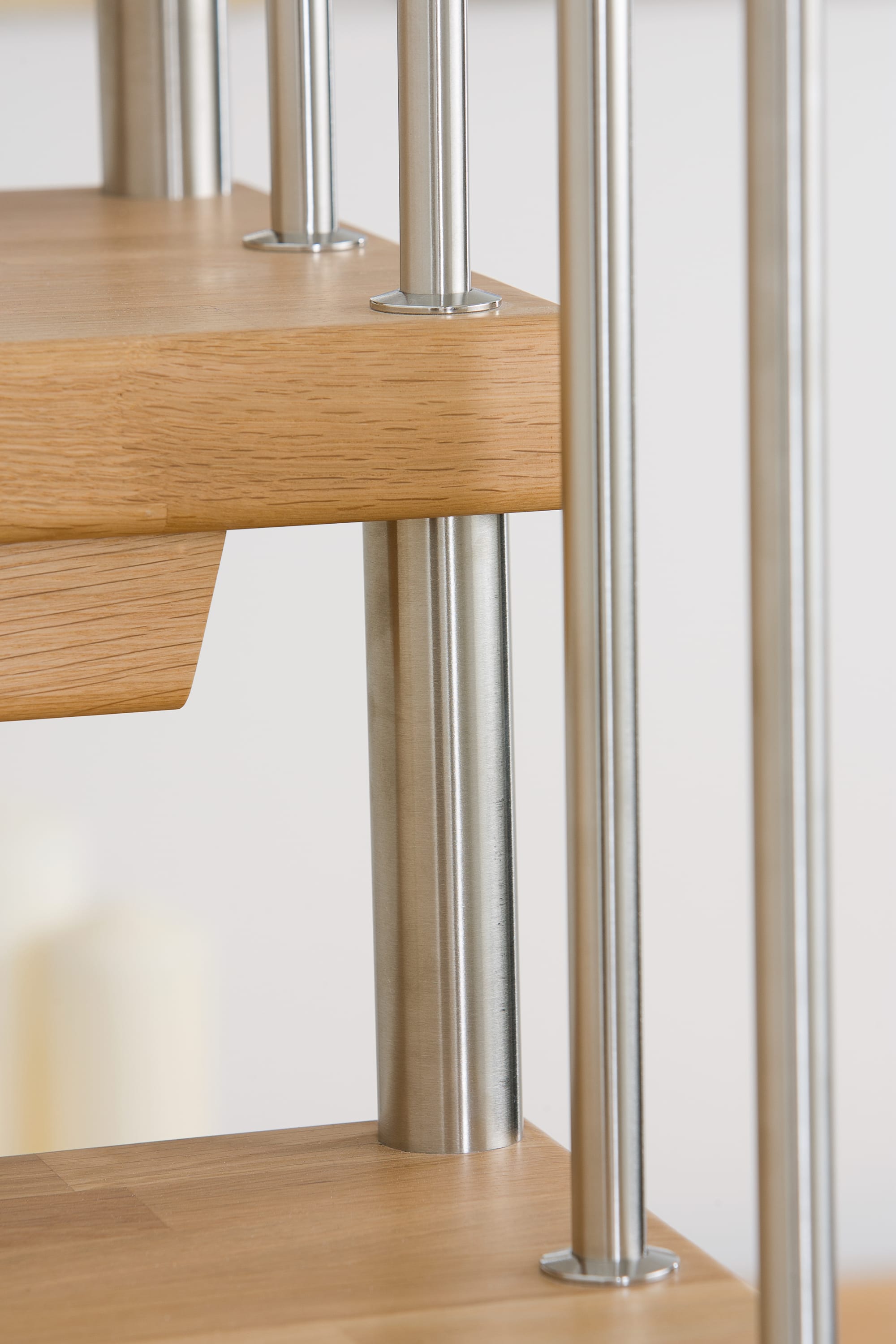 Freitragende Treppe mit Edelstahlstäben; Holzart Eiche mosaik
