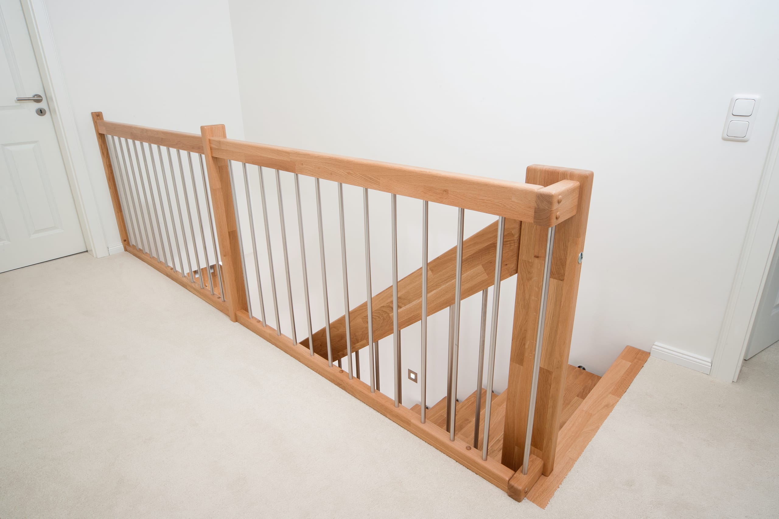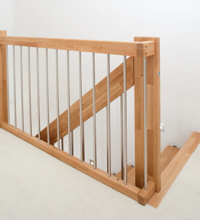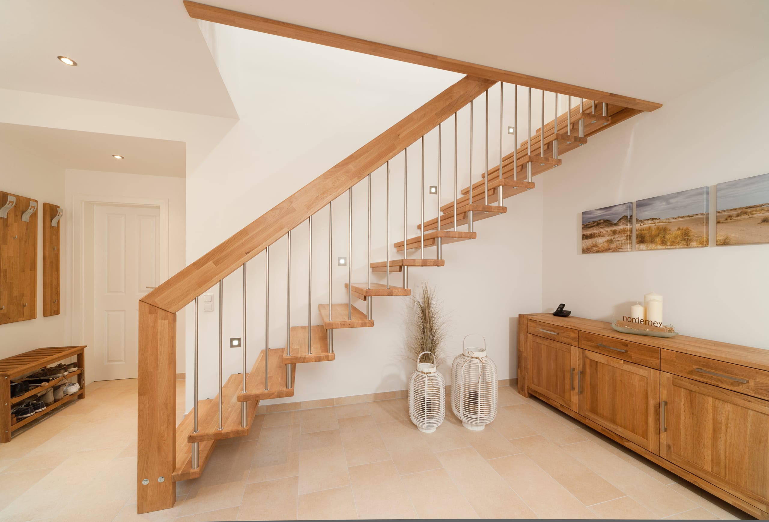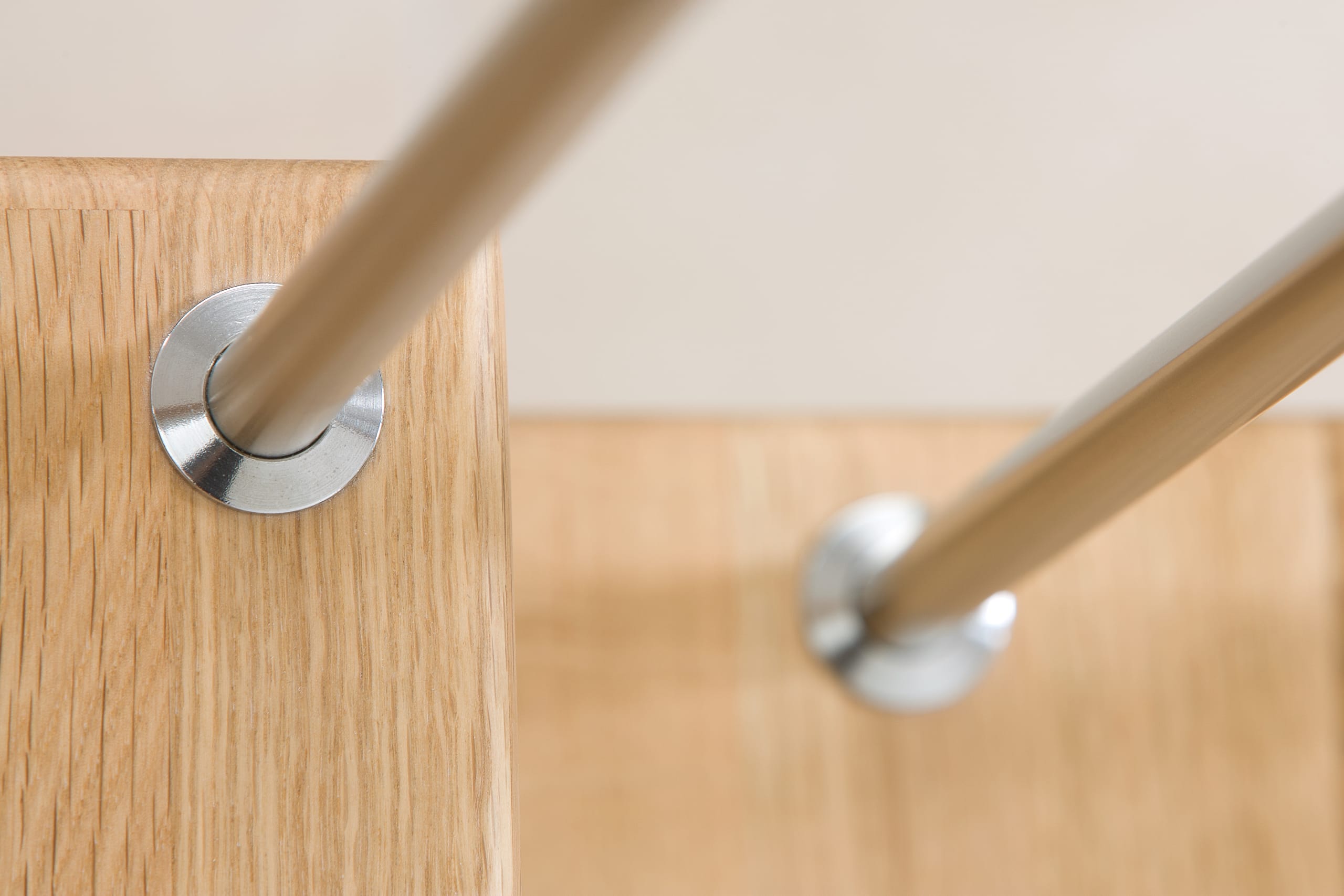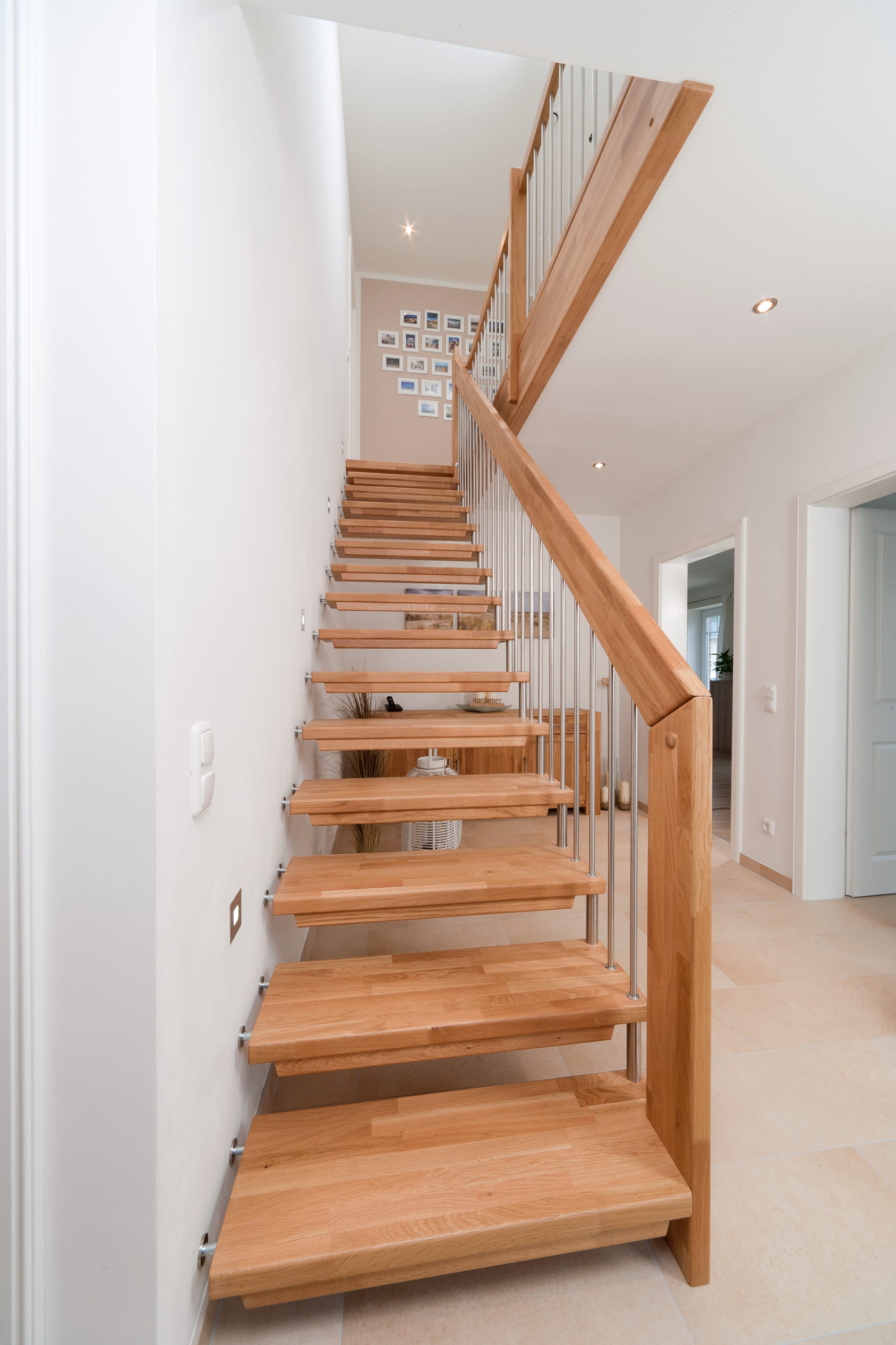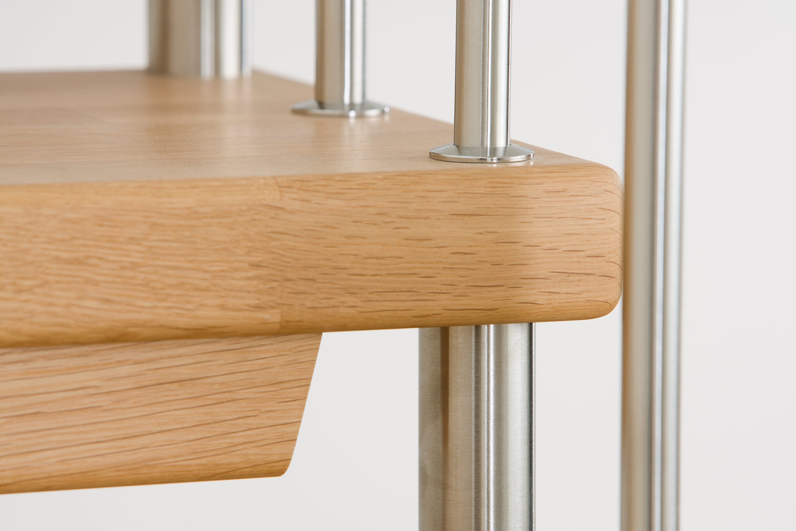 Freitragende Treppe mit Edelstahlstäben; Holzart Eiche mosaik